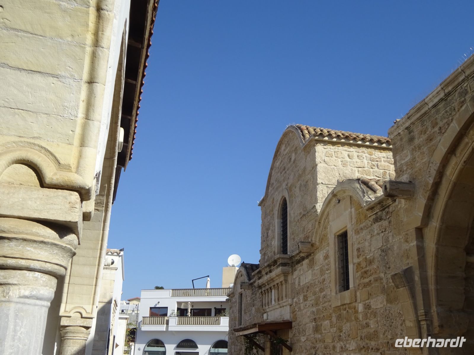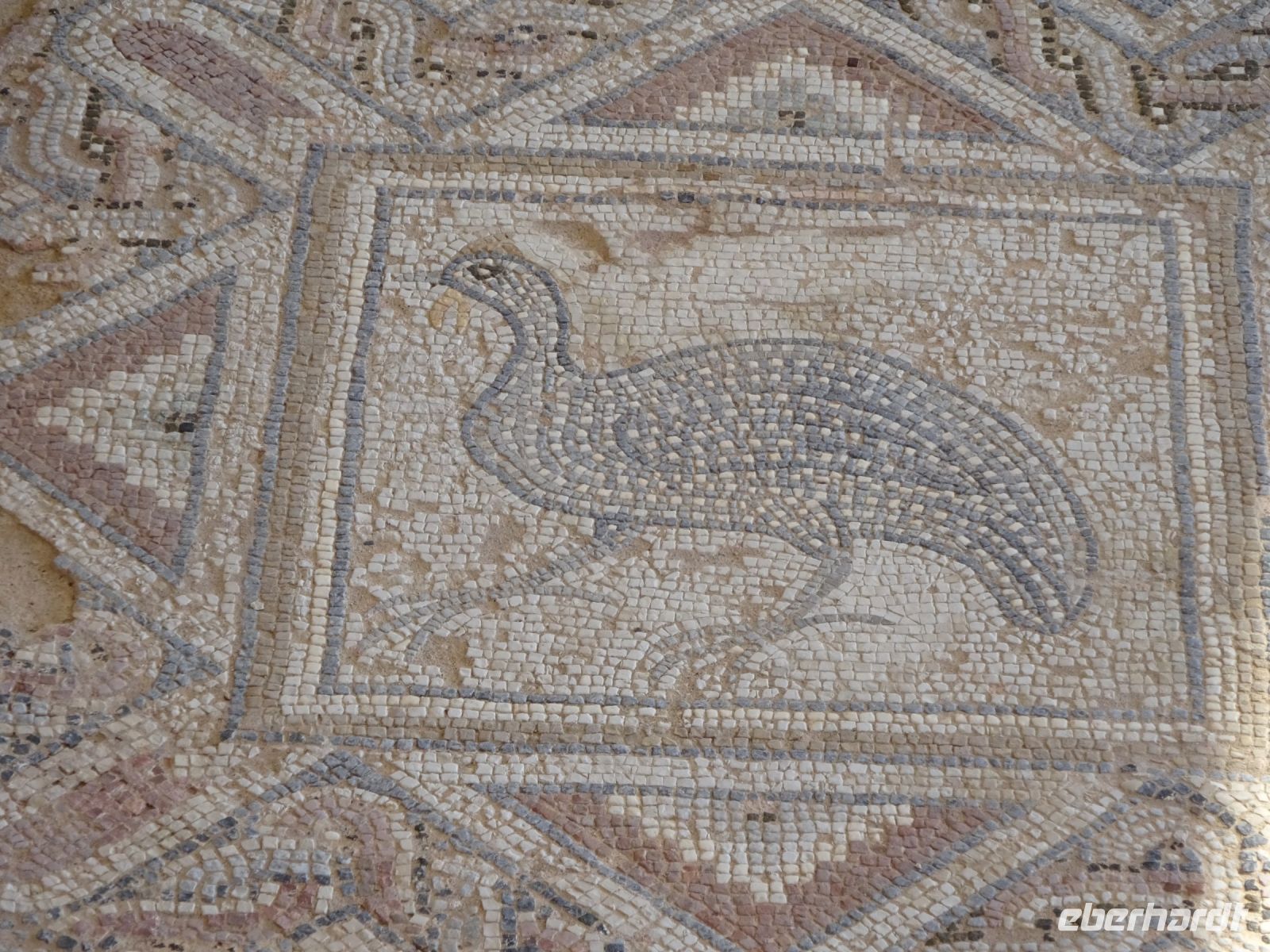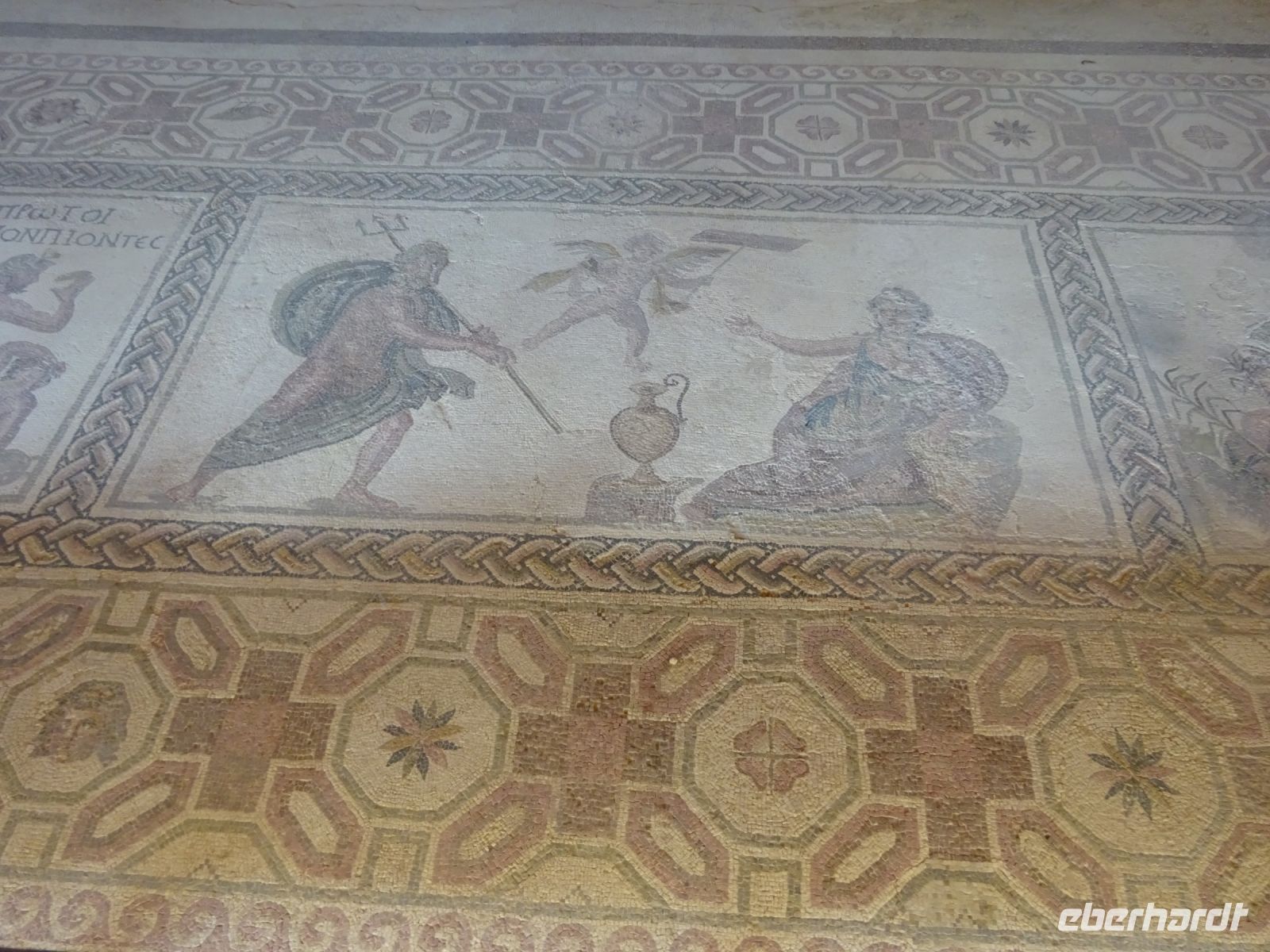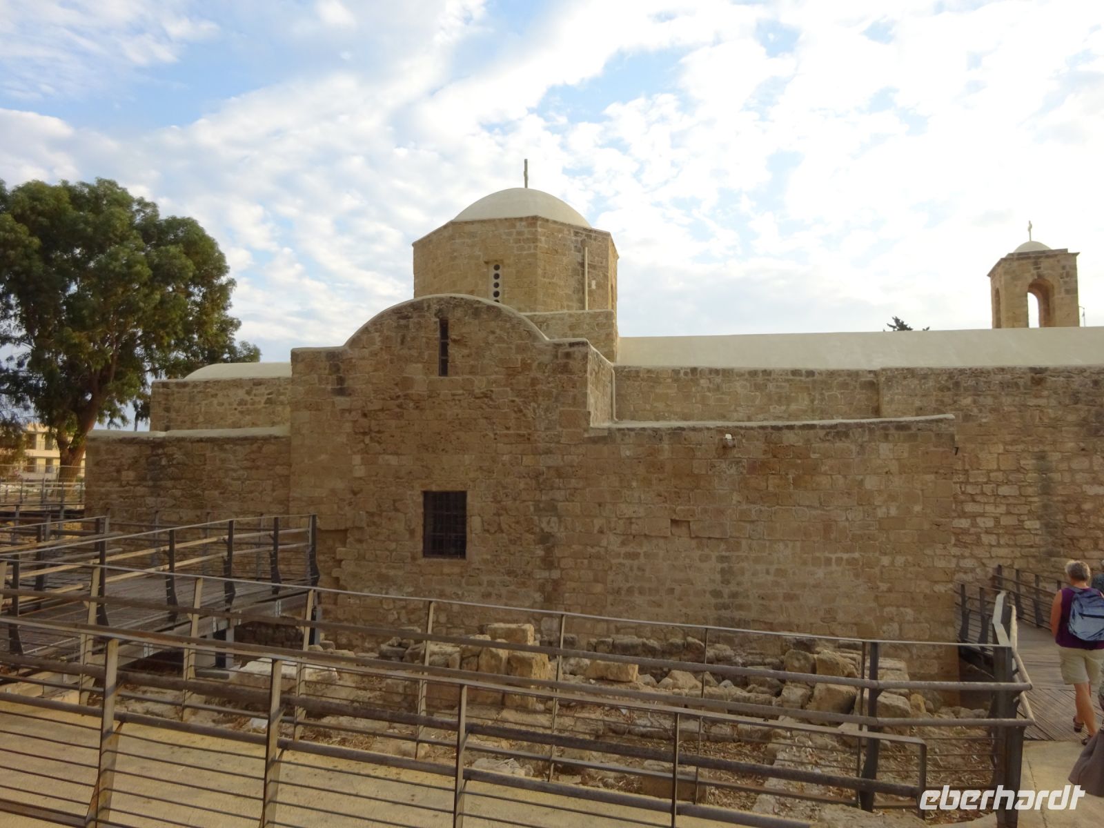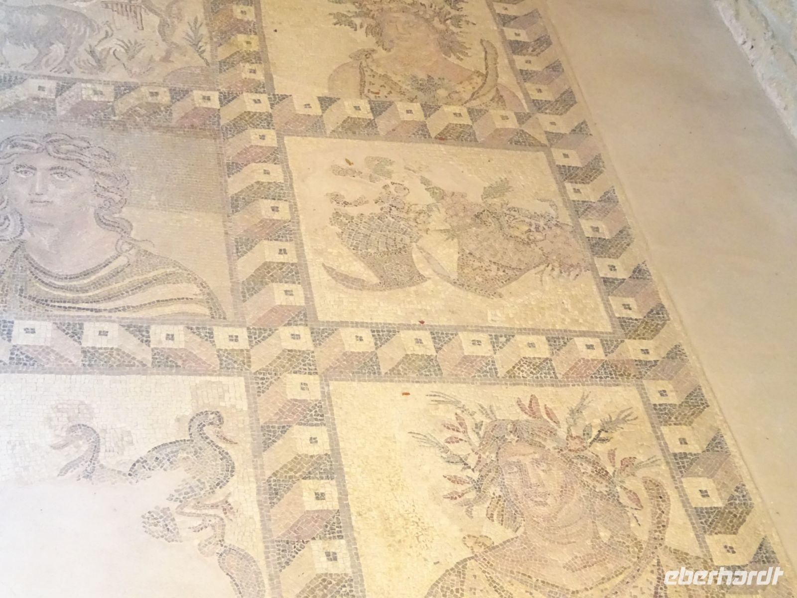 Heute gibt es eine wetterbedingte Programmänderung. Wegen ungünstiger Witterungsverhältnisse, können zur Zeit die Boote nicht, wie ursprünglich auch für uns geplant, hinaus in die Blaue Lagune fahren. So gingen wir diesmal von Paphos aus auf eine Bootsfahrt mit einer Bademöglichkeit im Meer und einem schönen Essen auf dem Schiff. Das fanden wir richtig gut. Der Großteil der Gruppe gönnte sich das einmalige Badeerlebnis. Zuvor hatten wir jedoch gleich am Morgen den Archäologischen Park der Stadt Paphos, der sich nur unweit des Hafens befindet, besucht. Dort steht das Haus des Dionysos mit seinen wertvollen Bodenmosaiken, geschützt von einem nachträglich errichteten Pavillon. Die Mosaike aus dem 2. Jahrhundert n. Chr. wurden 1962 entdeckt und anschließend in mühevoller Kleinarbeit freigelegt. Es ist immer wieder beeindruckend, mit welcher Präzision und ganz ohne moderne Hilfsmittel die Menschen damals diese einzigartigen Kunstwerke geschaffen haben. Seit dem Jahr 1980 gehören diese Mosaike zum UNESCO-Weltkulturerbe. Wir besuchten innerhalb des Archäologischen Parks auch noch das Haus des Aion, mit ähnlich beeindruckenden Kunstwerken. Und am Nachmittag, zurück von der entspannten Bootspartie, sahen wir die Chrysopolitissa-Kirche, konnten sogar hineingehen. Wieder gab es von Antonis ausführliche Erklärungen zu diesem geschichtsträchtigen Ort, an dem auch die Erinnerungssäule für den Apostel Paulus steht, der hier ausgepeitscht worden sein soll, bevor er im Hafen von Paphos aufbrach, um das Christentum zu verbreiten.