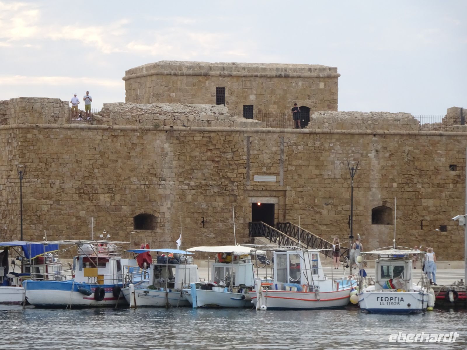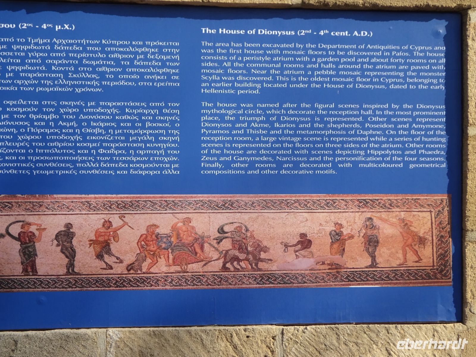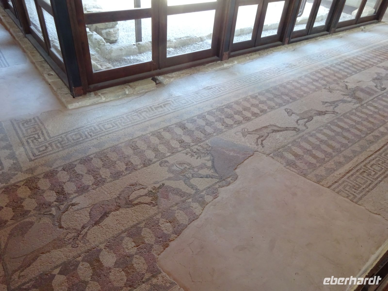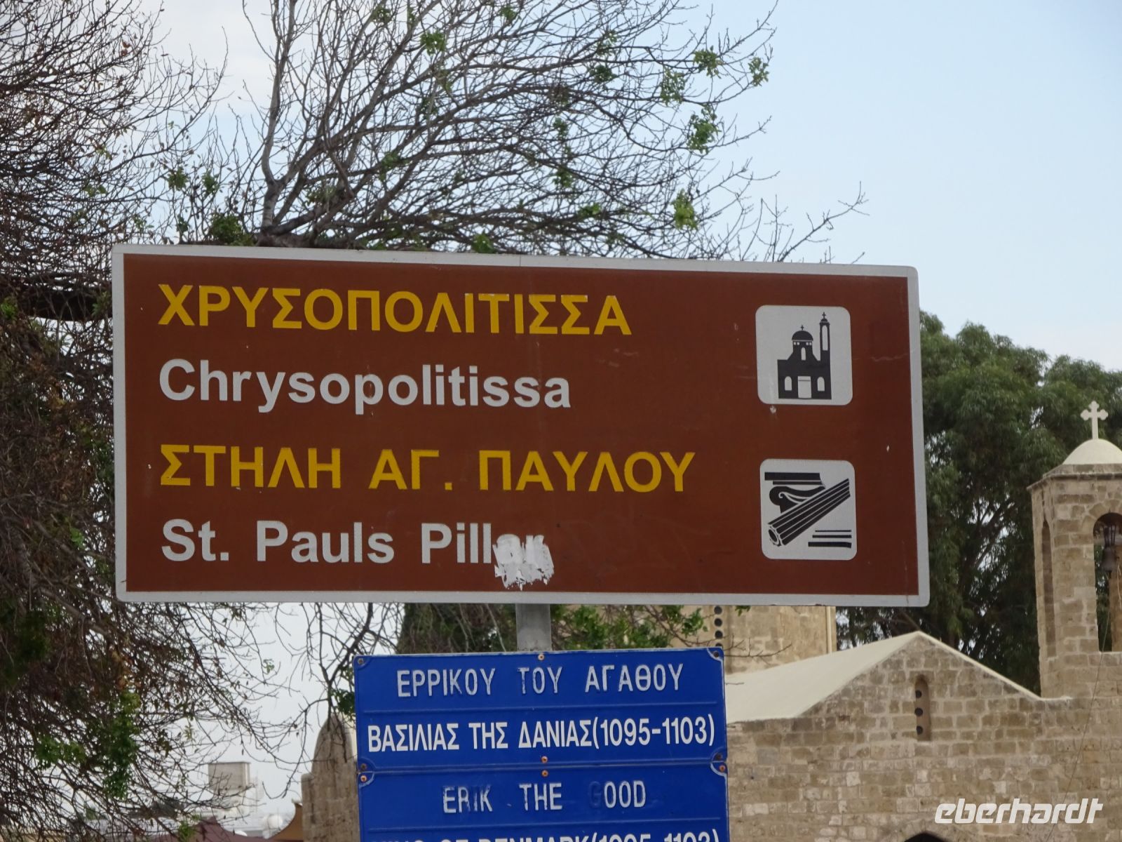 Heute gibt es eine wetterbedingte Programmänderung. Wegen ungünstiger Witterungsverhältnisse, können zur Zeit die Boote nicht, wie ursprünglich auch für uns geplant, hinaus in die Blaue Lagune fahren. So gingen wir diesmal von Paphos aus auf eine Bootsfahrt mit einer Bademöglichkeit im Meer und einem schönen Essen auf dem Schiff. Das fanden wir richtig gut. Der Großteil der Gruppe gönnte sich das einmalige Badeerlebnis. Zuvor hatten wir jedoch gleich am Morgen den Archäologischen Park der Stadt Paphos, der sich nur unweit des Hafens befindet, besucht. Dort steht das Haus des Dionysos mit seinen wertvollen Bodenmosaiken, geschützt von einem nachträglich errichteten Pavillon. Die Mosaike aus dem 2. Jahrhundert n. Chr. wurden 1962 entdeckt und anschließend in mühevoller Kleinarbeit freigelegt. Es ist immer wieder beeindruckend, mit welcher Präzision und ganz ohne moderne Hilfsmittel die Menschen damals diese einzigartigen Kunstwerke geschaffen haben. Seit dem Jahr 1980 gehören diese Mosaike zum UNESCO-Weltkulturerbe. Wir besuchten innerhalb des Archäologischen Parks auch noch das Haus des Aion, mit ähnlich beeindruckenden Kunstwerken. Und am Nachmittag, zurück von der entspannten Bootspartie, sahen wir die Chrysopolitissa-Kirche, konnten sogar hineingehen. Wieder gab es von Antonis ausführliche Erklärungen zu diesem geschichtsträchtigen Ort, an dem auch die Erinnerungssäule für den Apostel Paulus steht, der hier ausgepeitscht worden sein soll, bevor er im Hafen von Paphos aufbrach, um das Christentum zu verbreiten.