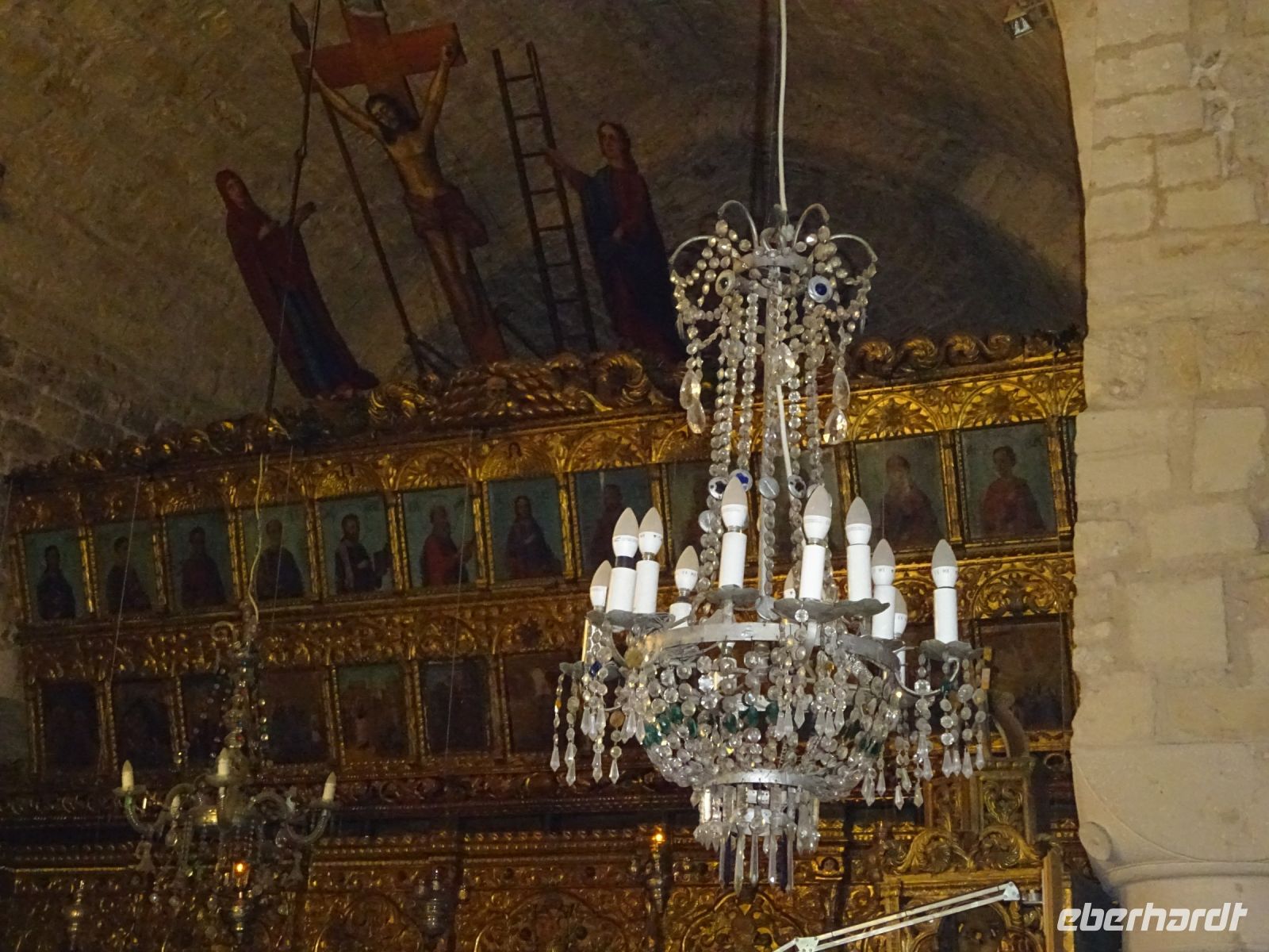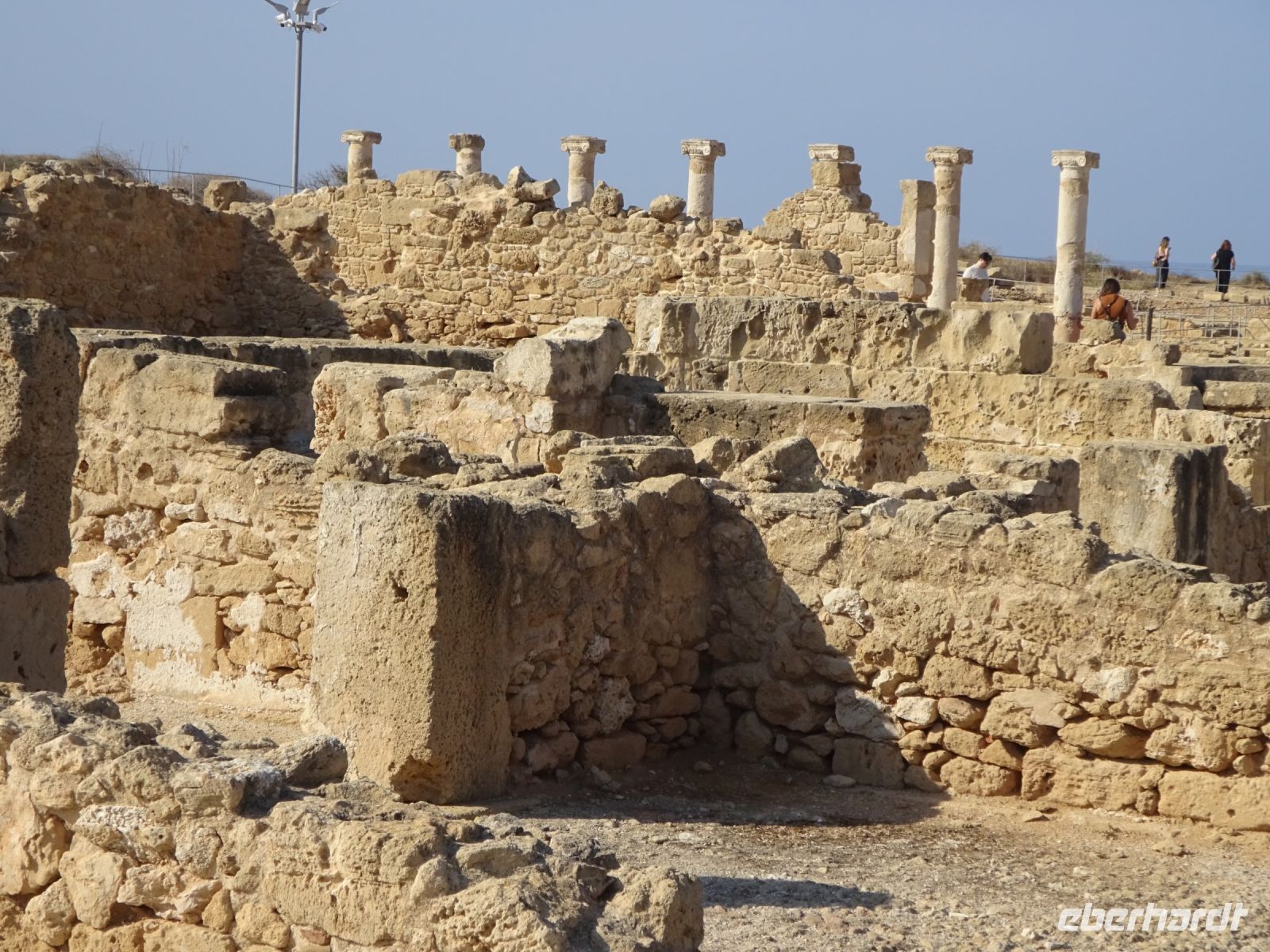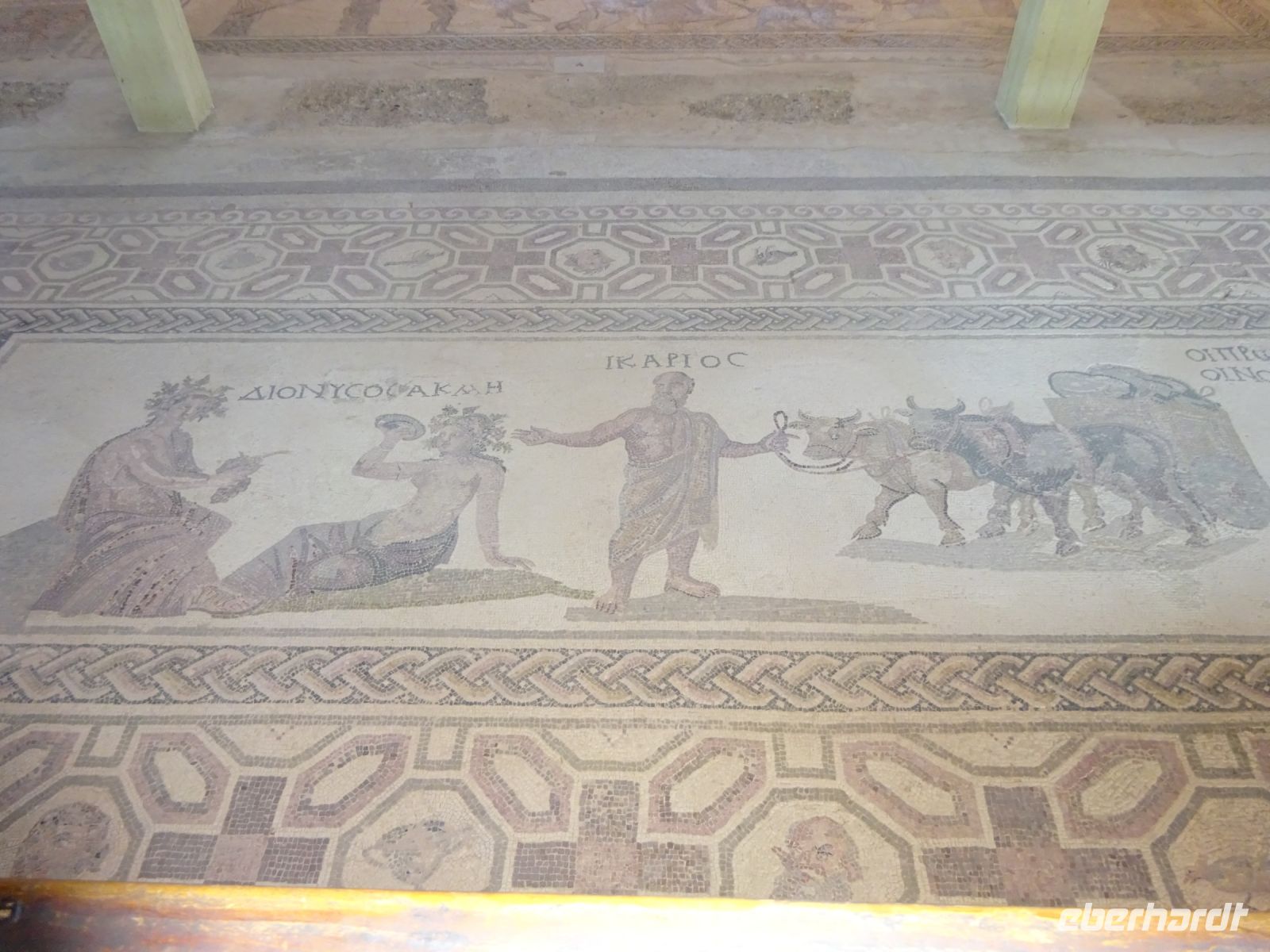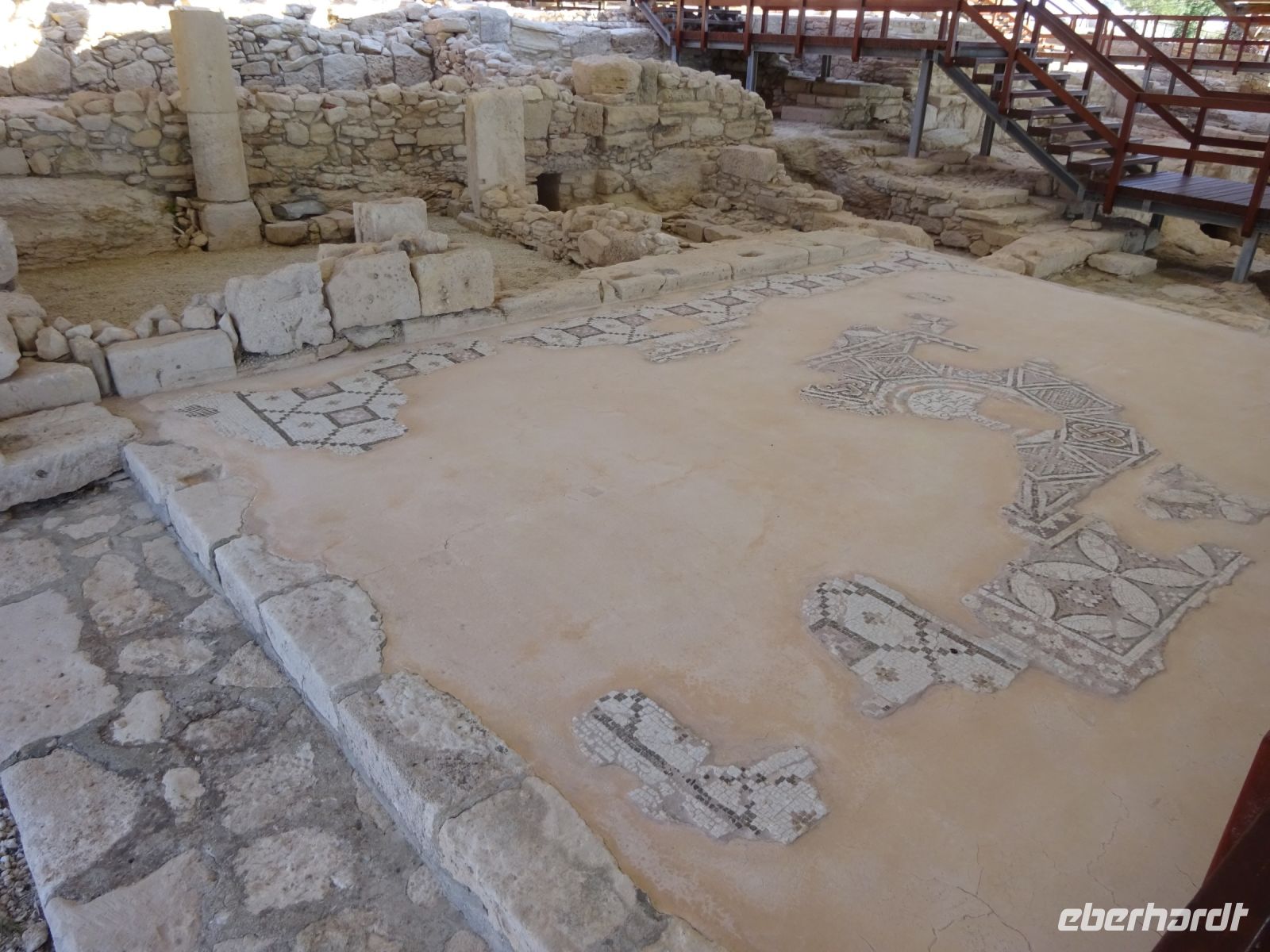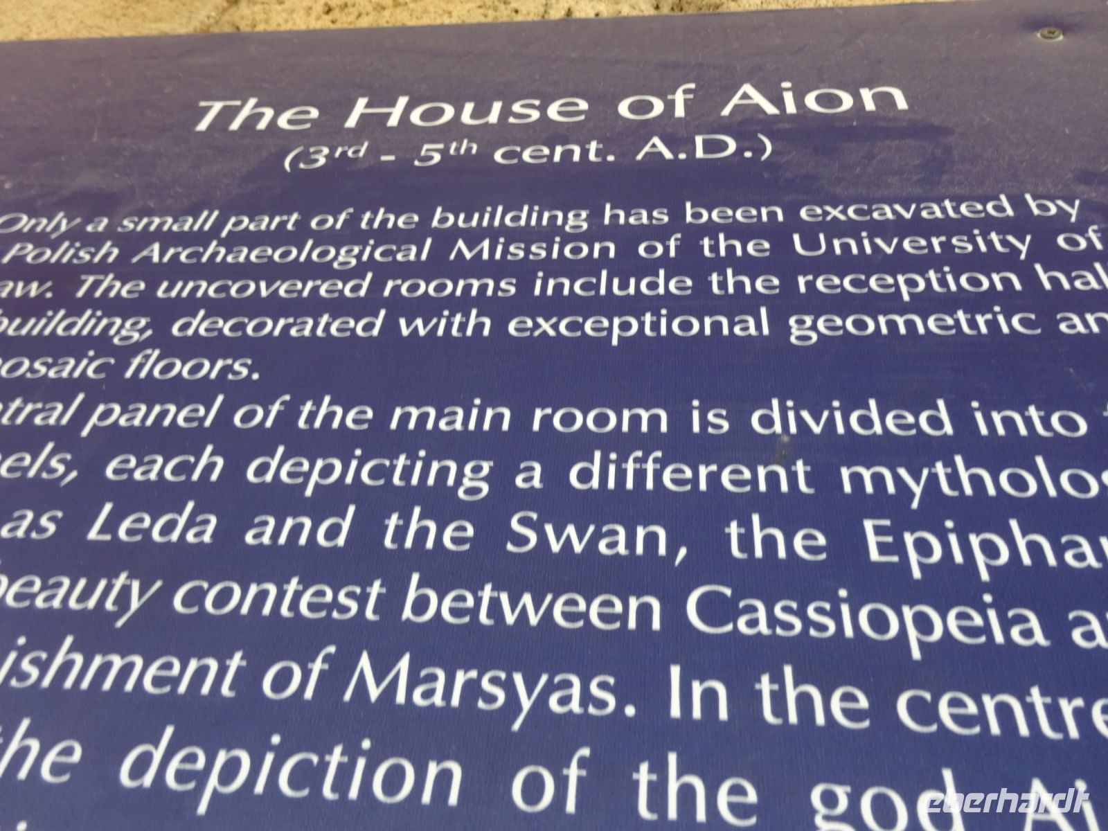 Heute gibt es eine wetterbedingte Programmänderung. Wegen ungünstiger Witterungsverhältnisse, können zur Zeit die Boote nicht, wie ursprünglich auch für uns geplant, hinaus in die Blaue Lagune fahren. So gingen wir diesmal von Paphos aus auf eine Bootsfahrt mit einer Bademöglichkeit im Meer und einem schönen Essen auf dem Schiff. Das fanden wir richtig gut. Der Großteil der Gruppe gönnte sich das einmalige Badeerlebnis. Zuvor hatten wir jedoch gleich am Morgen den Archäologischen Park der Stadt Paphos, der sich nur unweit des Hafens befindet, besucht. Dort steht das Haus des Dionysos mit seinen wertvollen Bodenmosaiken, geschützt von einem nachträglich errichteten Pavillon. Die Mosaike aus dem 2. Jahrhundert n. Chr. wurden 1962 entdeckt und anschließend in mühevoller Kleinarbeit freigelegt. Es ist immer wieder beeindruckend, mit welcher Präzision und ganz ohne moderne Hilfsmittel die Menschen damals diese einzigartigen Kunstwerke geschaffen haben. Seit dem Jahr 1980 gehören diese Mosaike zum UNESCO-Weltkulturerbe. Wir besuchten innerhalb des Archäologischen Parks auch noch das Haus des Aion, mit ähnlich beeindruckenden Kunstwerken. Und am Nachmittag, zurück von der entspannten Bootspartie, sahen wir die Chrysopolitissa-Kirche, konnten sogar hineingehen. Wieder gab es von Antonis ausführliche Erklärungen zu diesem geschichtsträchtigen Ort, an dem auch die Erinnerungssäule für den Apostel Paulus steht, der hier ausgepeitscht worden sein soll, bevor er im Hafen von Paphos aufbrach, um das Christentum zu verbreiten.