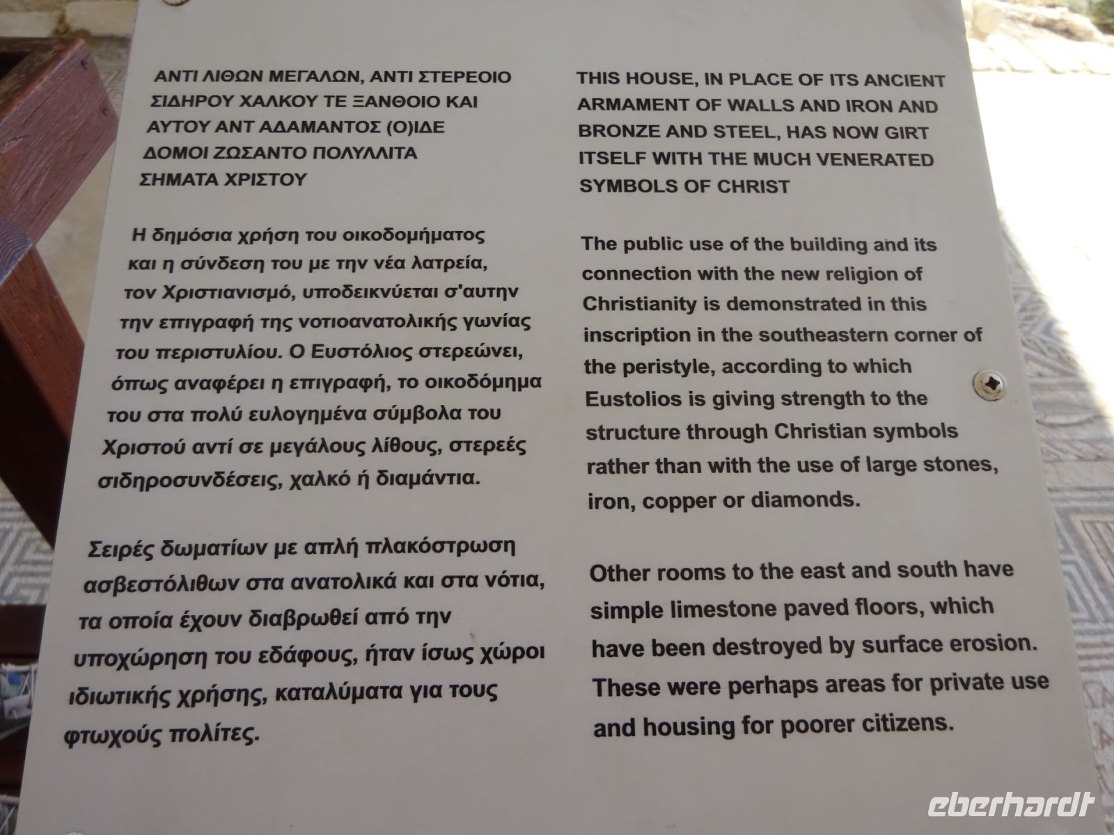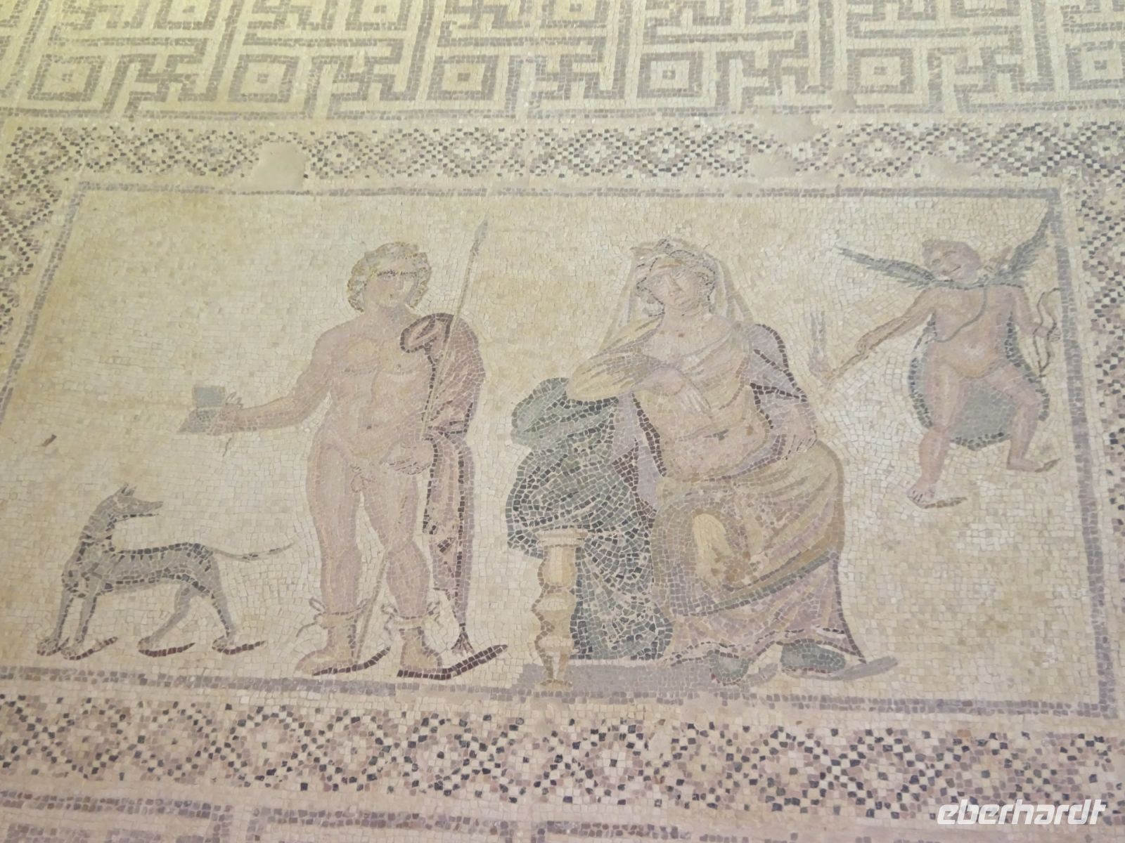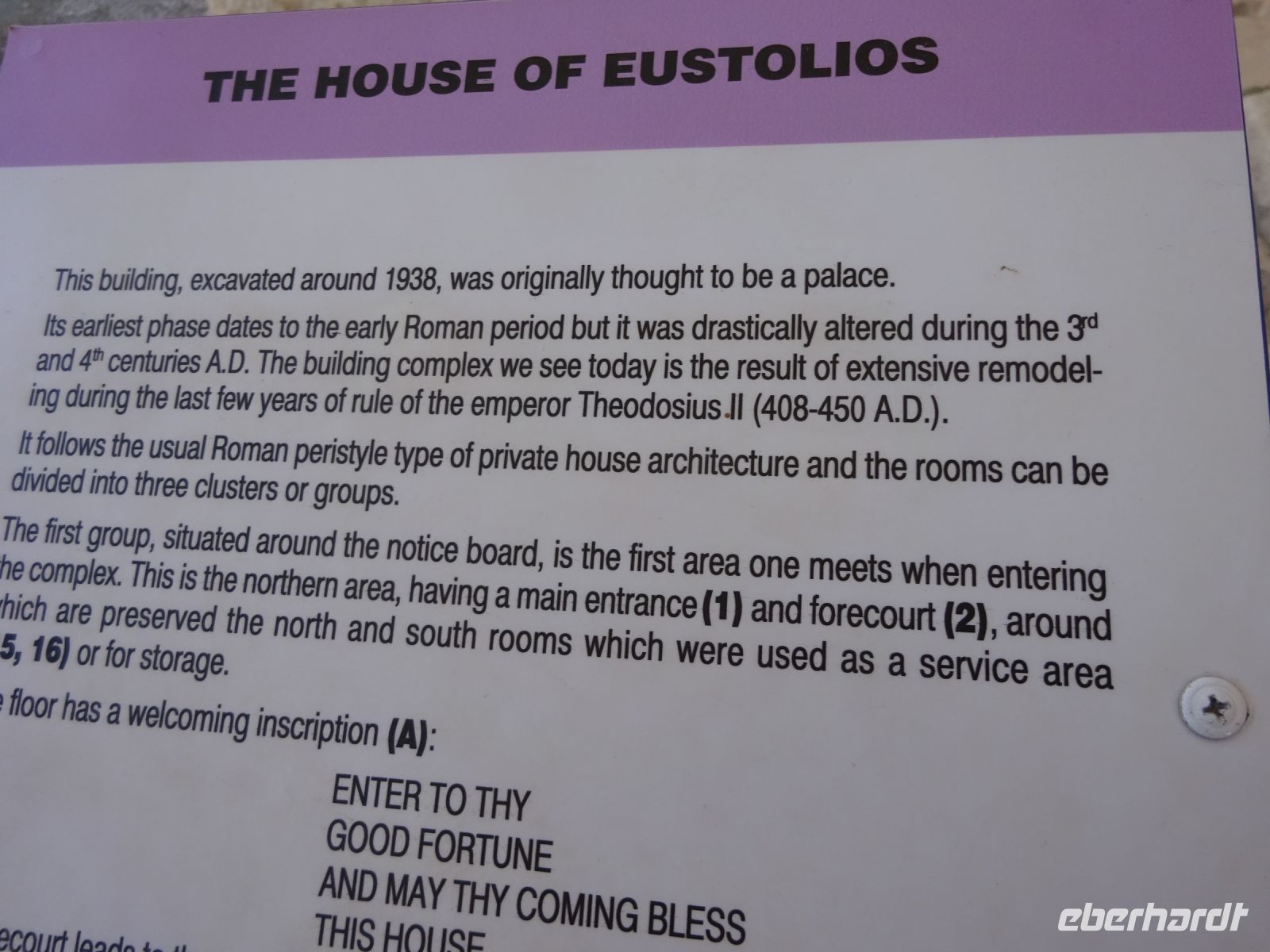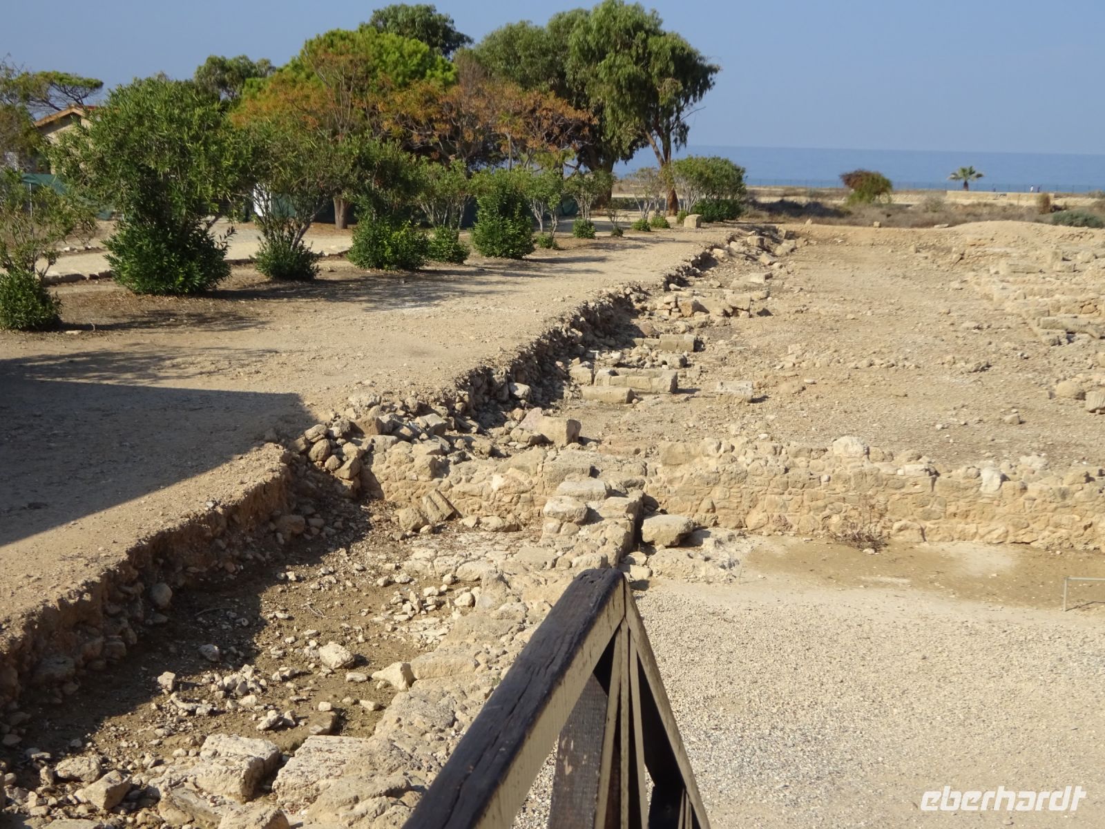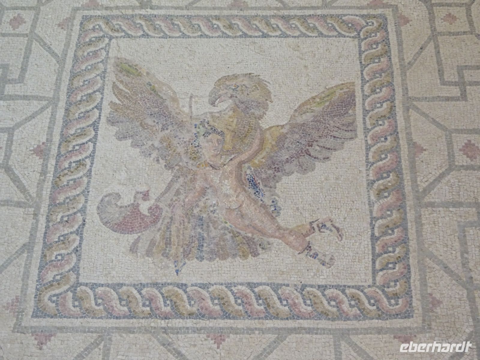 Heute gibt es eine wetterbedingte Programmänderung. Wegen ungünstiger Witterungsverhältnisse, können zur Zeit die Boote nicht, wie ursprünglich auch für uns geplant, hinaus in die Blaue Lagune fahren. So gingen wir diesmal von Paphos aus auf eine Bootsfahrt mit einer Bademöglichkeit im Meer und einem schönen Essen auf dem Schiff. Das fanden wir richtig gut. Der Großteil der Gruppe gönnte sich das einmalige Badeerlebnis. Zuvor hatten wir jedoch gleich am Morgen den Archäologischen Park der Stadt Paphos, der sich nur unweit des Hafens befindet, besucht. Dort steht das Haus des Dionysos mit seinen wertvollen Bodenmosaiken, geschützt von einem nachträglich errichteten Pavillon. Die Mosaike aus dem 2. Jahrhundert n. Chr. wurden 1962 entdeckt und anschließend in mühevoller Kleinarbeit freigelegt. Es ist immer wieder beeindruckend, mit welcher Präzision und ganz ohne moderne Hilfsmittel die Menschen damals diese einzigartigen Kunstwerke geschaffen haben. Seit dem Jahr 1980 gehören diese Mosaike zum UNESCO-Weltkulturerbe. Wir besuchten innerhalb des Archäologischen Parks auch noch das Haus des Aion, mit ähnlich beeindruckenden Kunstwerken. Und am Nachmittag, zurück von der entspannten Bootspartie, sahen wir die Chrysopolitissa-Kirche, konnten sogar hineingehen. Wieder gab es von Antonis ausführliche Erklärungen zu diesem geschichtsträchtigen Ort, an dem auch die Erinnerungssäule für den Apostel Paulus steht, der hier ausgepeitscht worden sein soll, bevor er im Hafen von Paphos aufbrach, um das Christentum zu verbreiten.
