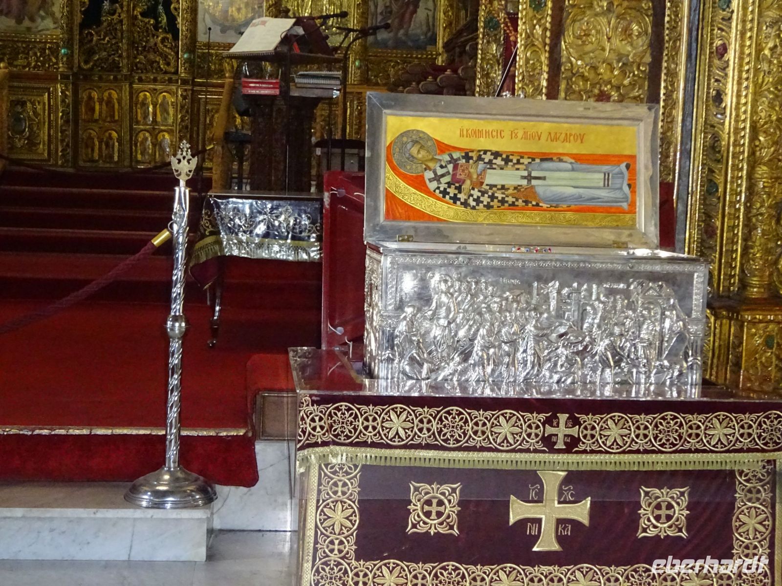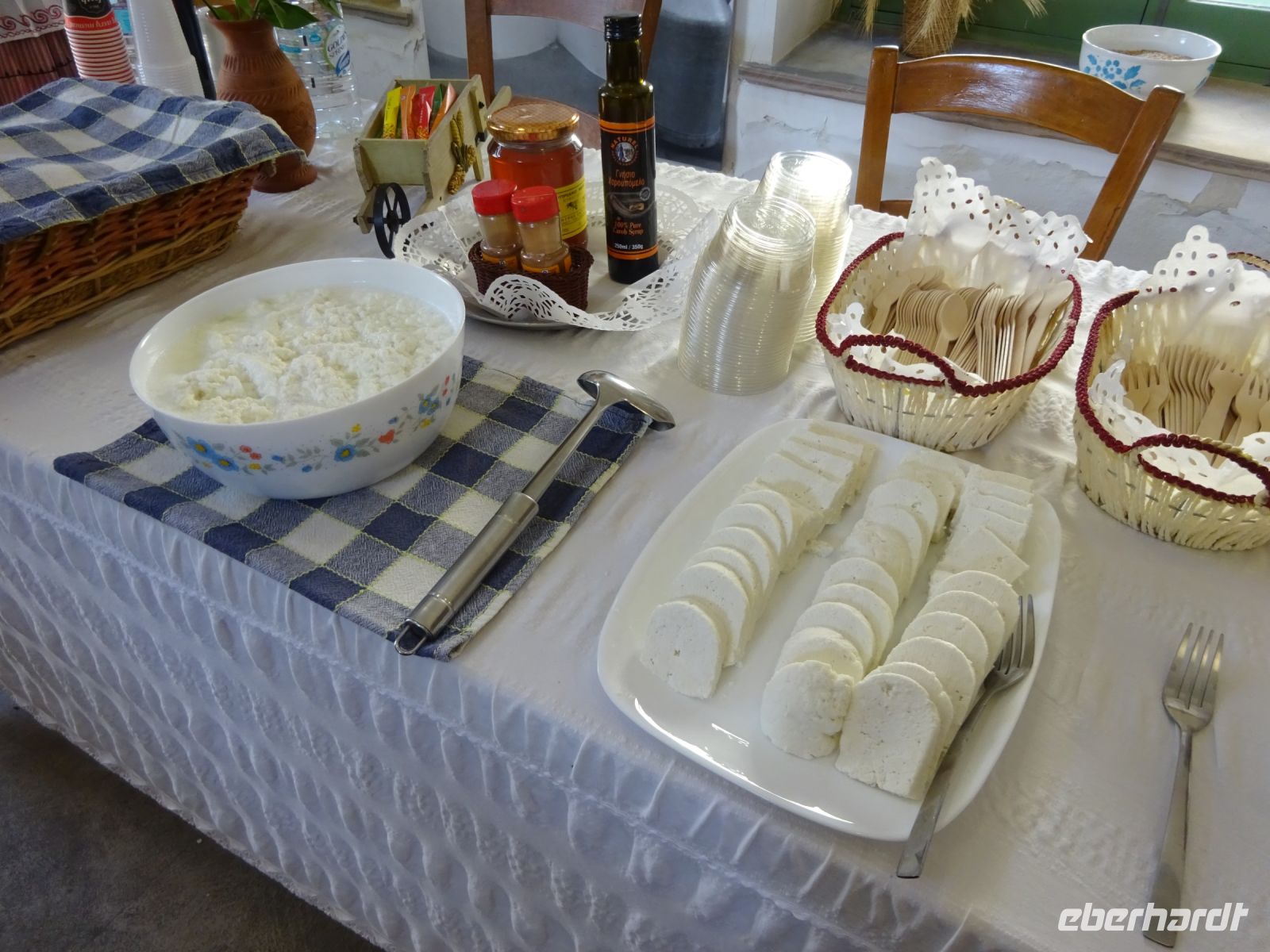 Auch heute hatten wir wieder ein abwechslungsreiches Programm vor uns. Zunächst besuchten wir nach einem kleinen Spaziergang entlang der palmengesäumten Hafenpromenade von Larnaka die Lazarus-Kirche, ein bedeutendes religiöses Wahrzeichen der Stadt aus dem 9. Jahrhundert, erbaut auf der Grabstätte des Heiligen Lazarus. Weiter fuhren wir nach Athienou, wo sich das Volkskundemuseum im neu erbauten Rathaus befindet. Das Dorf hat eine lange Geschichte, die bis in die Jungsteinzeit zurückreicht. Wir erhielten Einblicke in die Traditionen und in die Geschichte, auch in die beeindruckende Ikonenmalerei. Nun führte uns Antonis weiter durch den Ort, der gleichzeitig sein Heimatort ist. Unser Ziel war eine Käserei, in der aus Milch von Kühen, Ziegen oder Schafen Halloumi hergestellt wird, den wir nach der Führung gleich verkosten konnten. Dazu gab es lokalen Kirschwein (Ayia Nektaria) und einheimische Erdnüsse. Vorbei an einer Getreidemühle, gab es auf Einladung von Antonis Schwester, die hier im Ort lebt, im Café noch einen Kaffee. Schnell kamen wir dabei ins Gespräch. Nur ein kurzes Stück Weges, und schon waren wir in der Taverne des Ortes, wo ein schmackhaftes zypriotisches Abschluss-Mittagessen auf uns wartete. Wir nutzten dort gleich die Gelegenheit, uns von unserem versierten Busfahrer und auch von unserem örtlichen Reiseleiter Antonis zu verabschieden. Es war eine wunderbare Zeit, die wir zusammen verbracht haben. Den Rest des Nachmittags wollten alle am Strand unserer schönen Hotelanlage verbringen. Der Abschied vom Meer wird uns morgen garantiert nicht leicht fallen, aber da wir einen späteren Heimflug haben, können wir auch den morgigen Vormittag noch gut zum Schwimmen nutzen.