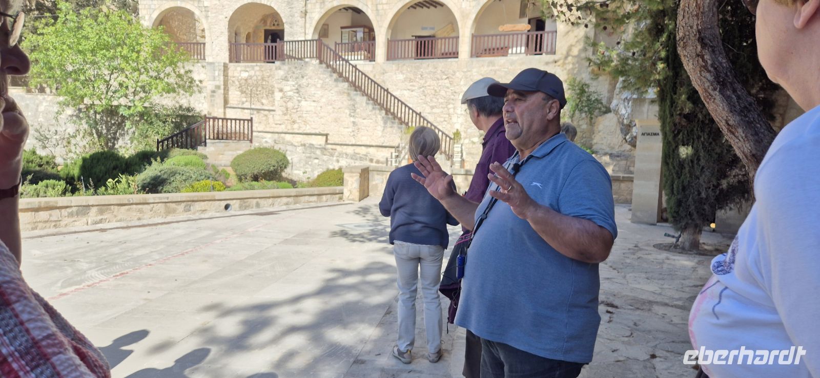 Nach einer erholsamen Nacht starteten wir am nächsten Morgen mit dem Bus, um einige Highlights rund um Paphos zu entdecken. Unser erster Stopp war das Kloster des heiligen Neophytos bei Mesogi. Über ein paar Stufen gelangten wir zur Eremitenhöhle und der kleinen Höhlenkapelle, die der heilige Neophytos im 12. Jahrhundert selbst erbaut hatte und wo er über 50 Jahre lebte. In der Nähe wurde später zu seinen Ehren das gleichnamige Kloster gegründet, dessen Kirche wir mit ihren zahlreichen Ikonen besichtigten.
