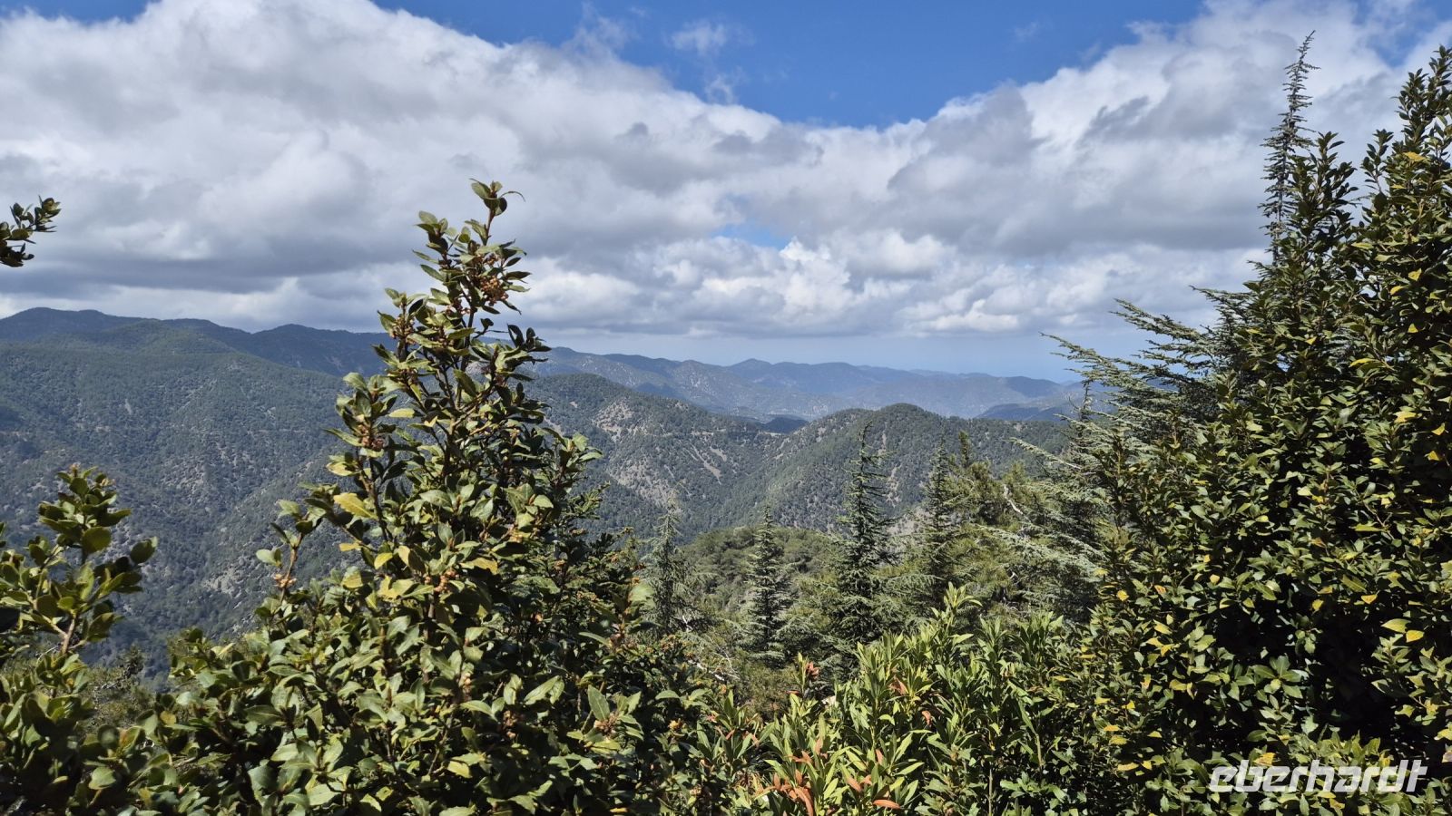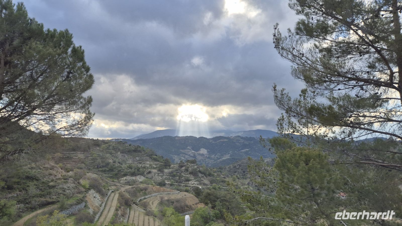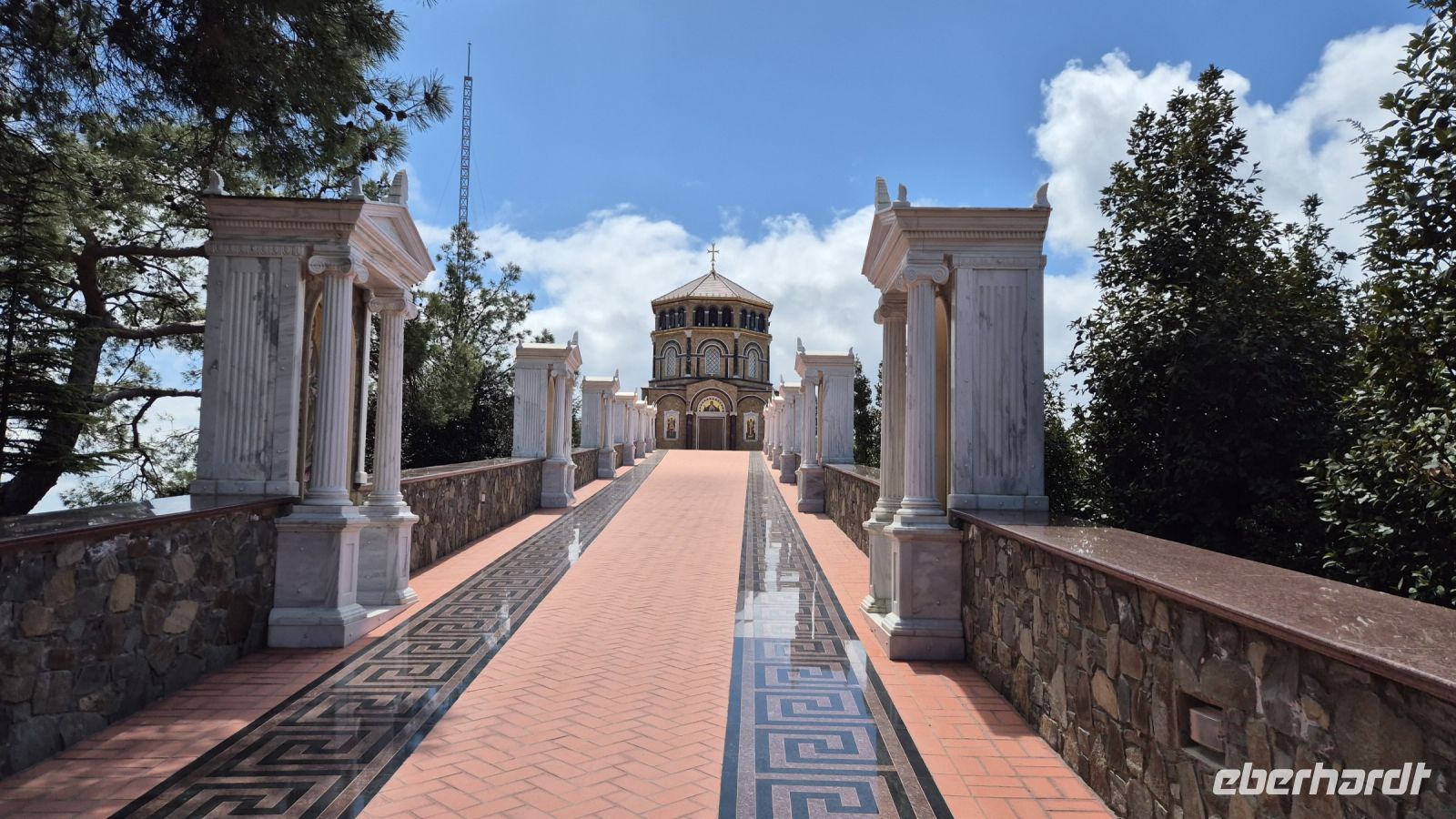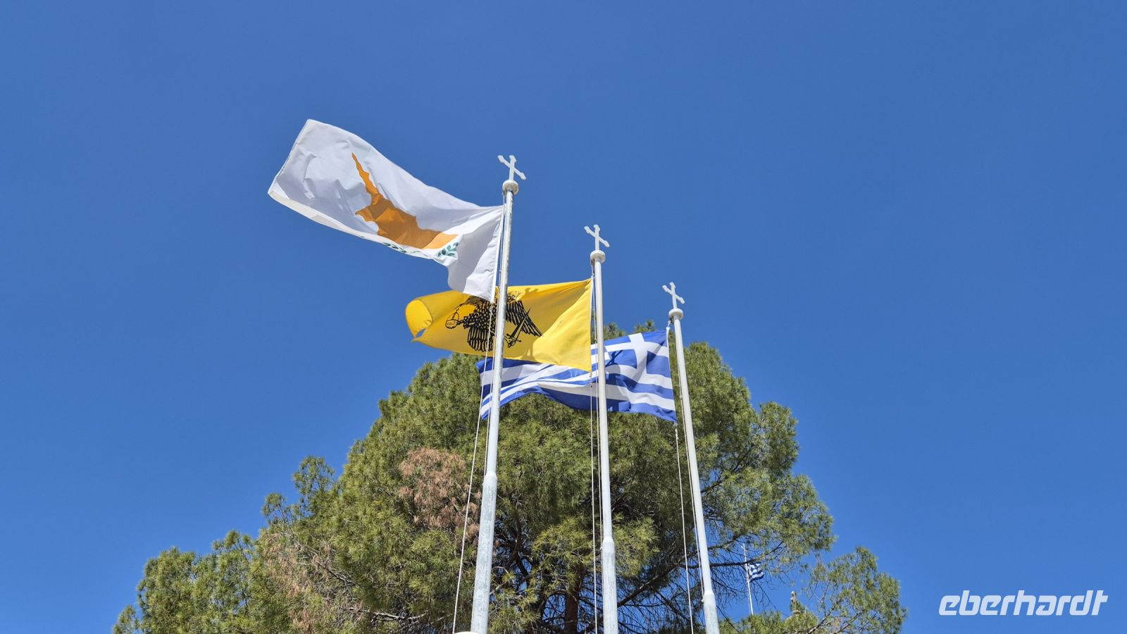 Nur wenige hundert Meter oberhalb des Klosters befindet sich die Grabstätte des Erzbischofs Makarios, die von einer Ehrenwache bewacht wird. Auch diesen Ort besuchten wir und genossen von dort aus einen atemberaubenden Blick über die dichten Zedernwälder hinweg bis hinunter zur Küste und nach Nordzypern.