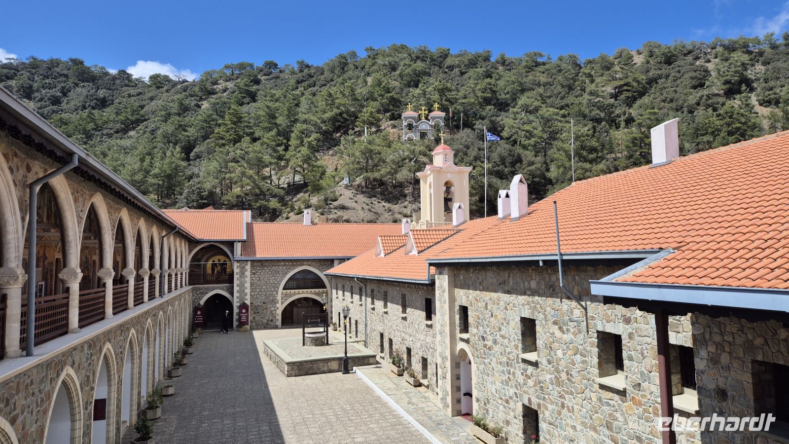 Nach diesem kulturellen Auftakt setzten wir unsere Fahrt durch das grüne, bergige Troodos fort. Entlang kleiner, verschlafener Dörfer schlängelten wir uns durch die Landschaft und legten zur Mittagszeit eine gemütliche Kaffeepause ein. Kurz darauf erreichten wir das berühmte Kykkos-Kloster, das als das einflussreichste und bedeutendste Kloster Zyperns gilt. Die kunstvollen Mosaiken, die fast den gesamten Innenhof schmücken, beeindruckten uns sehr – besonders das berühmte Bildnis der Gottesmutter Maria zog viele Blicke auf sich.