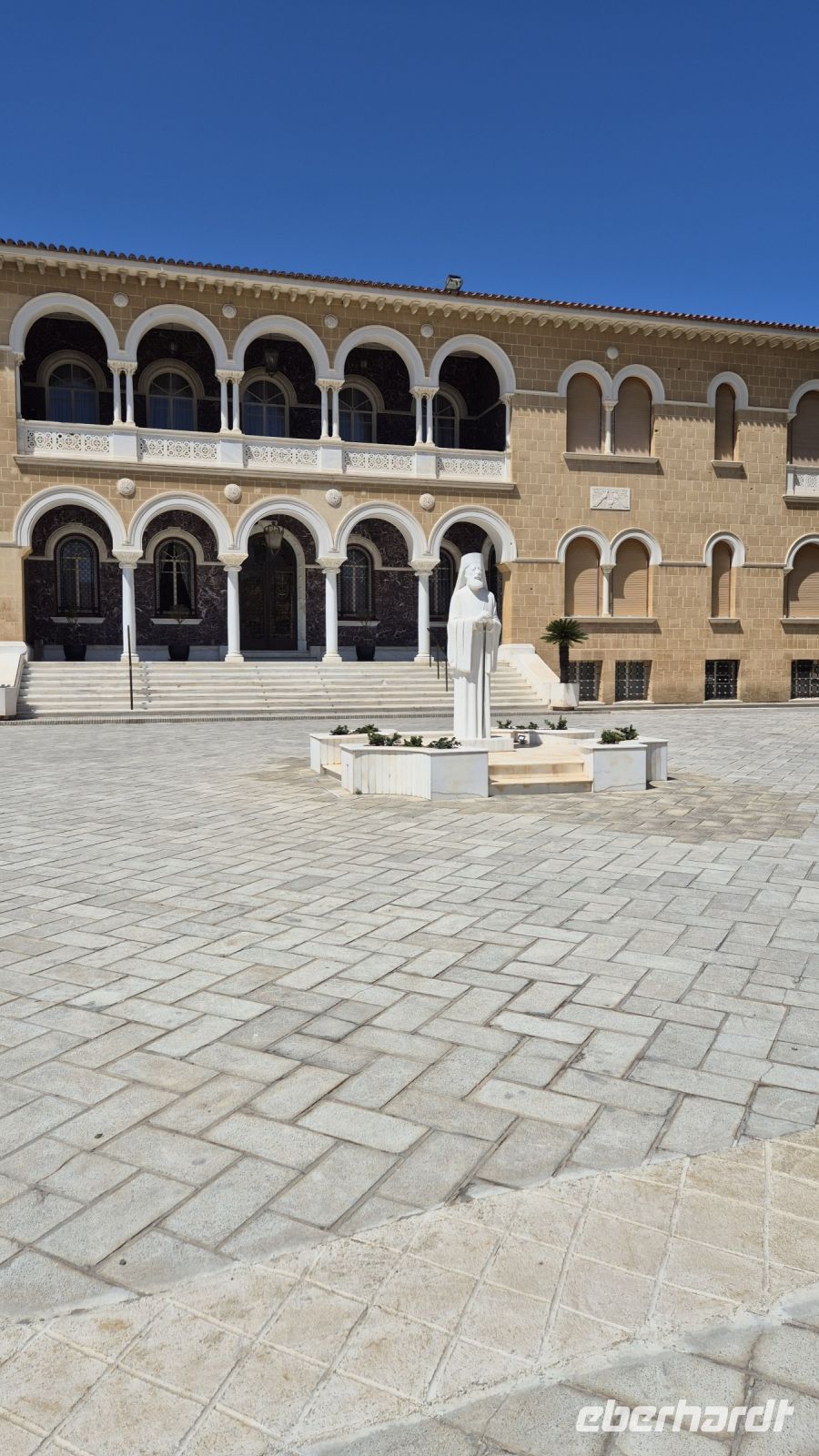Anschließend setzten wir unsere Erkundungstour fort und fuhren zum Freiheitsdenkmal im Zentrum der Stadt. Dieses Monument wurde 1970 errichtet und erinnert an das Ende der britischen Kolonialherrschaft auf Zypern. Nicht weit entfernt steht der Palast des Erzbischofs, vor dem die imposante Statue von Makarios thront – dem ehemaligen Erzbischof und späteren Staatspräsidenten. Zu seinen Ehren wurde das Denkmal errichtet. Auf dem Gelände bewunderten wir außerdem eine gläserne Garage, in der zwei Staatskarossen ausgestellt sind – Geschenke von Willy Brandt und John F. Kennedy an Makarios.