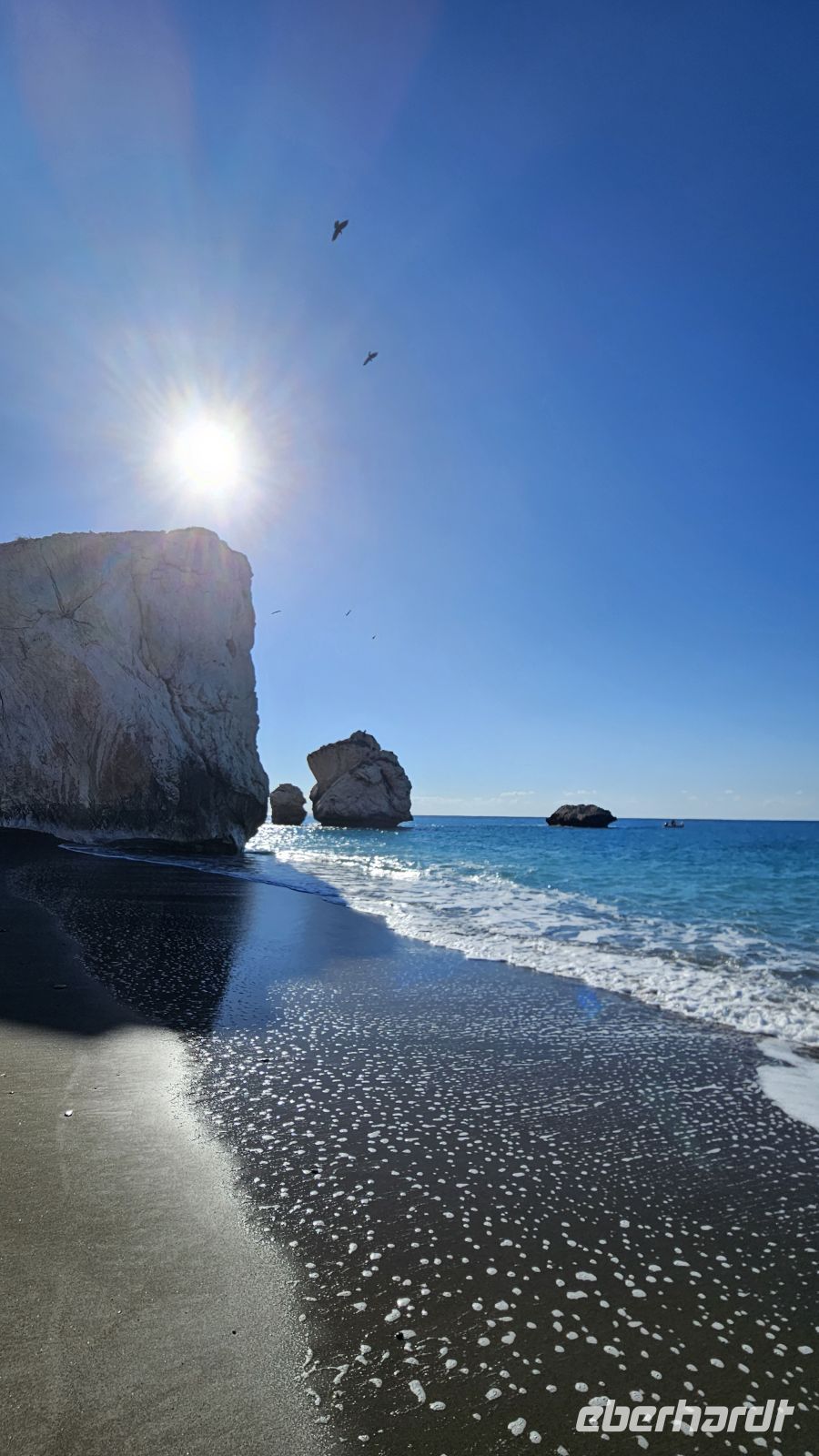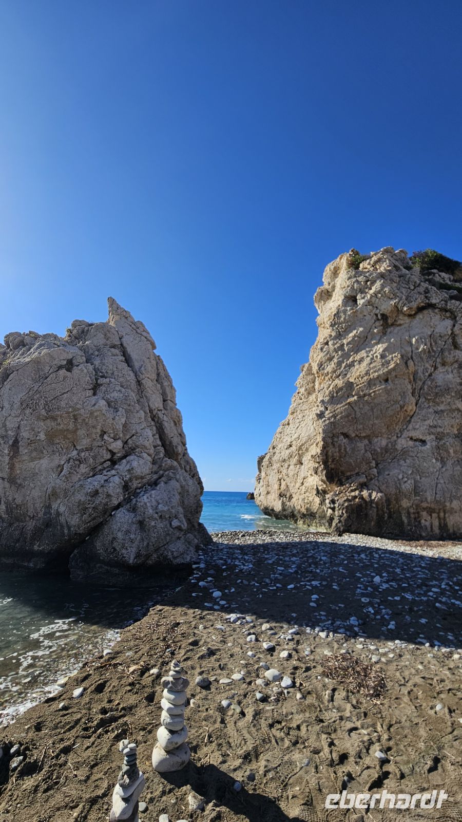 Am heutigen Morgen stand unsere Weiterreise zum nächsten Hotel bevor, sodass wir gemeinsam auscheckten, bevor wir gemeinsam zur Abfahrt bereitstanden. Antonis war an diesem Tag zunächst bei einer anderen Unterkunft eingesetzt und wurde unterwegs von uns aufgenommen. Gegen Vormittag erreichten wir den legendären Felsen der Aphrodite, der als mythologischer Geburtsort der Liebesgöttin gilt. Hier las ich einen vorbereiteten Auszug aus einem literarischen Werk über die Entstehung der Göttin vor, was die besondere Atmosphäre des Ortes zusätzlich unterstrich. Anschließend hatten wir noch etwas Zeit für eigene Eindrücke und Fotografien am malerischen Küstenabschnitt.