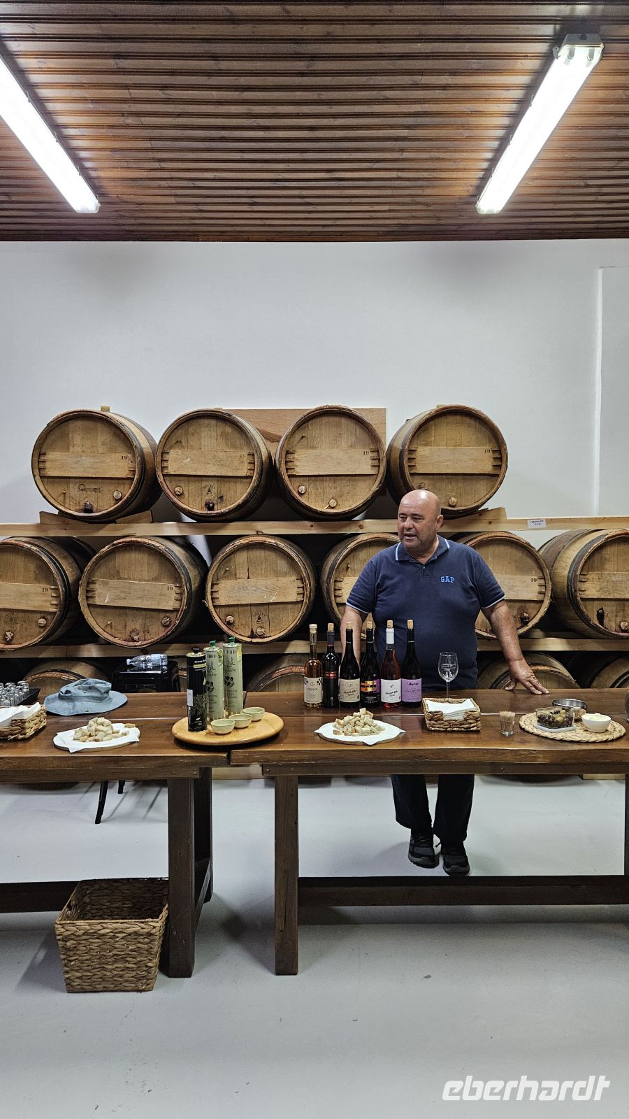 Ein Besuch des lokalen Volkskundemuseums verdeutlichte die Alltagskultur vergangener Generationen und präsentierte anschaulich Gegenstände des ländlichen Lebens, von Handwerksgeräten bis zu traditionellen Wohnsituationen. Anschließend erreichten wir ein Weingut, dessen Atmosphäre gemütlich und einladend war. In einem stimmungsvollen Weinkeller mit alten Fässern stellte Antonis zunächst die ersten Weine vor, bevor der Winzer persönlich übernahm.