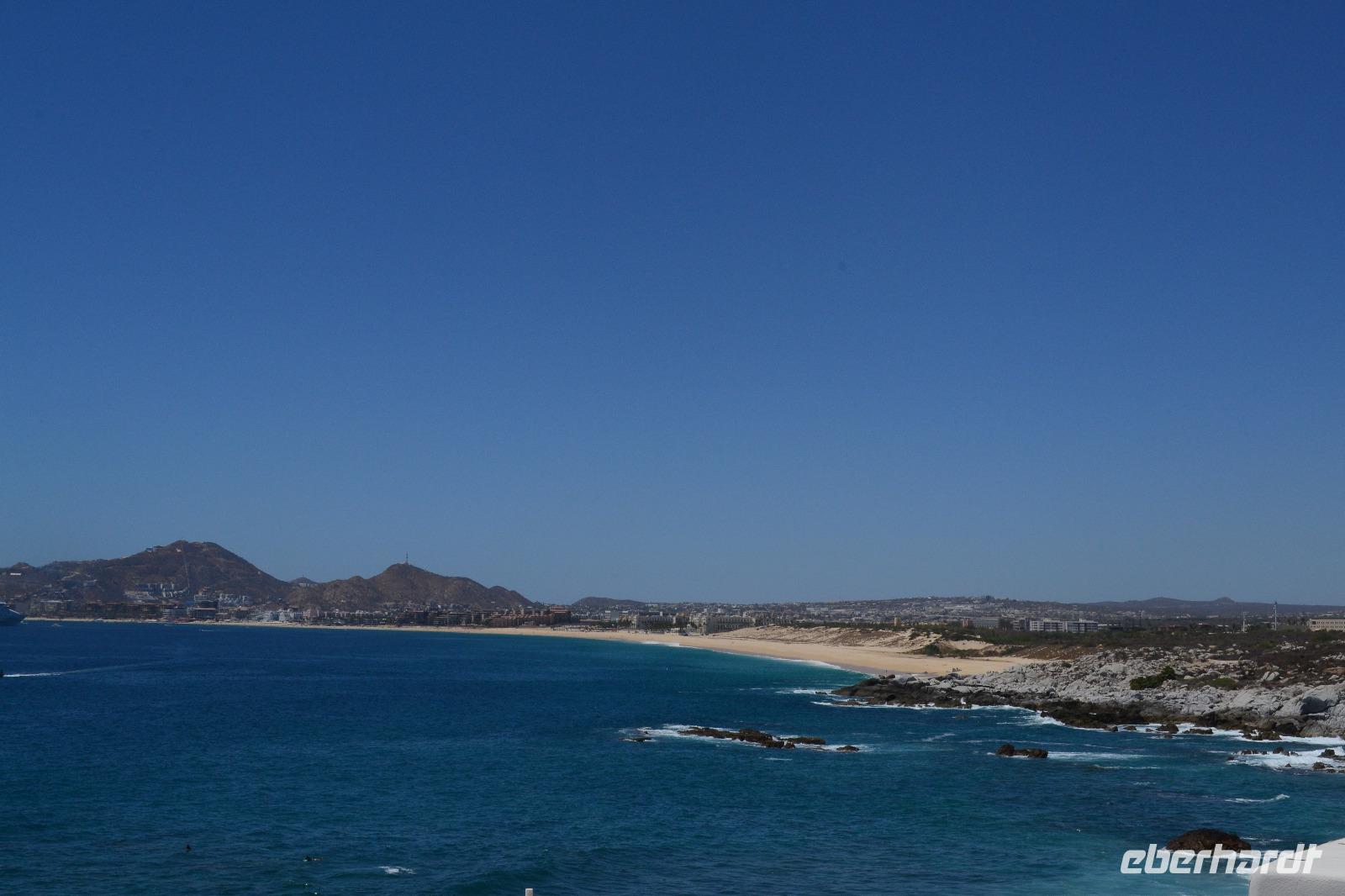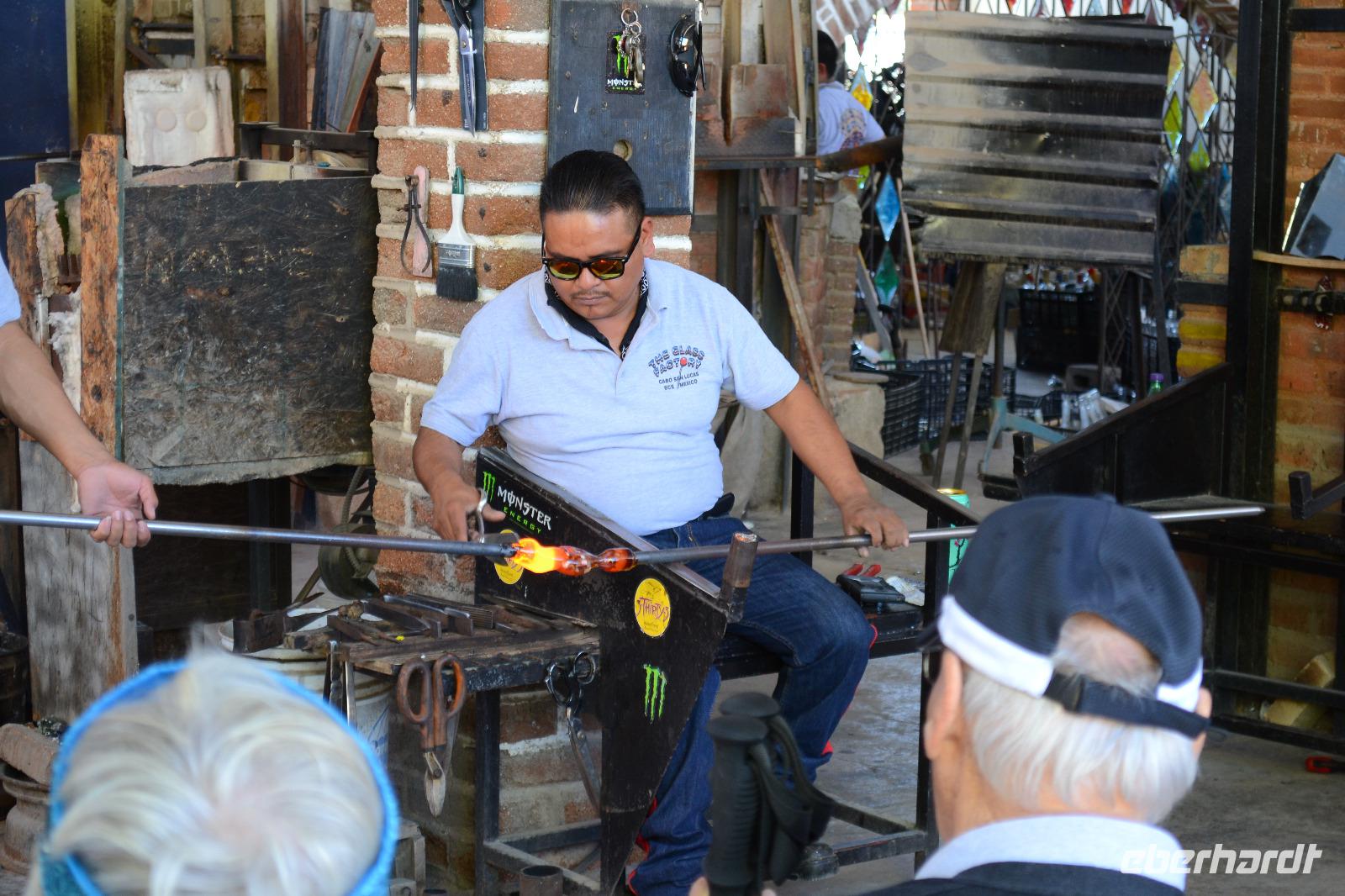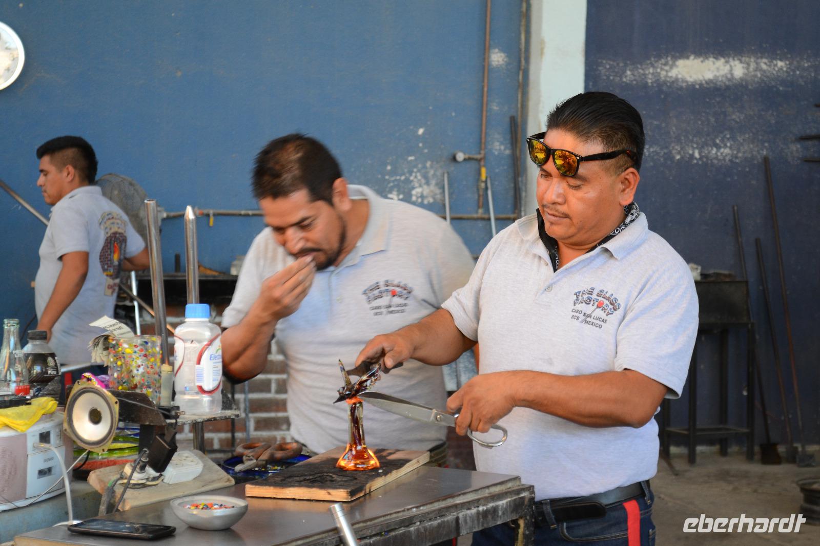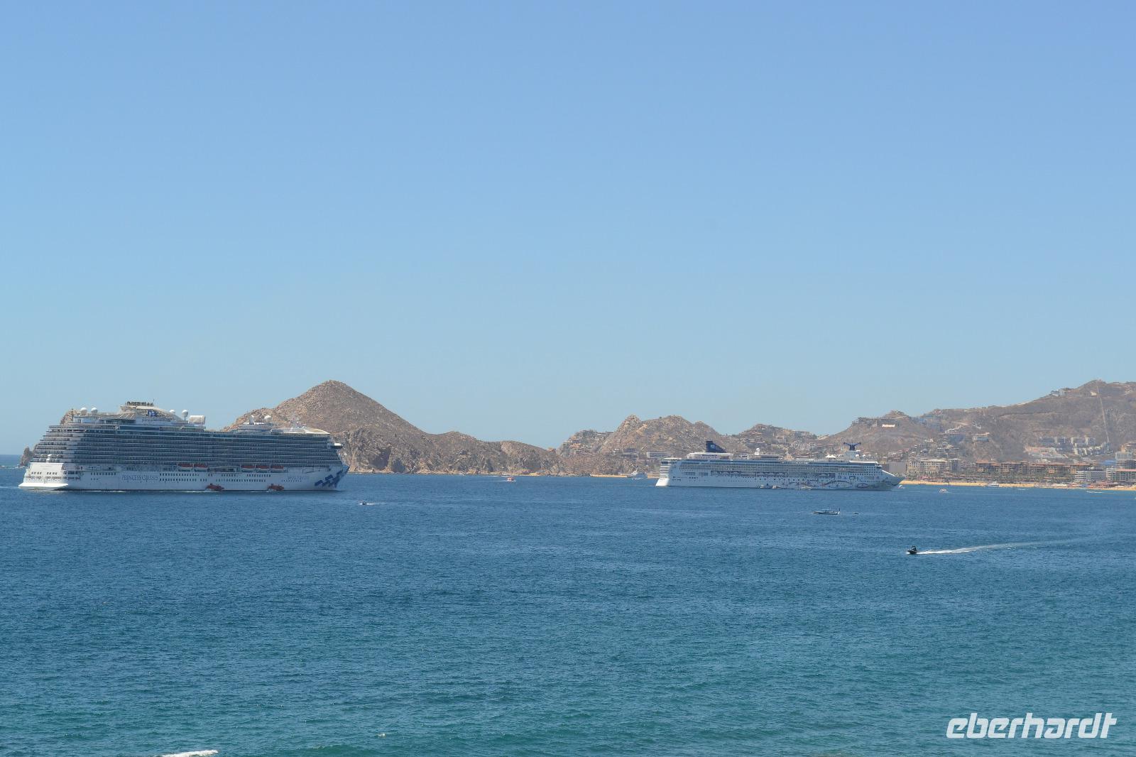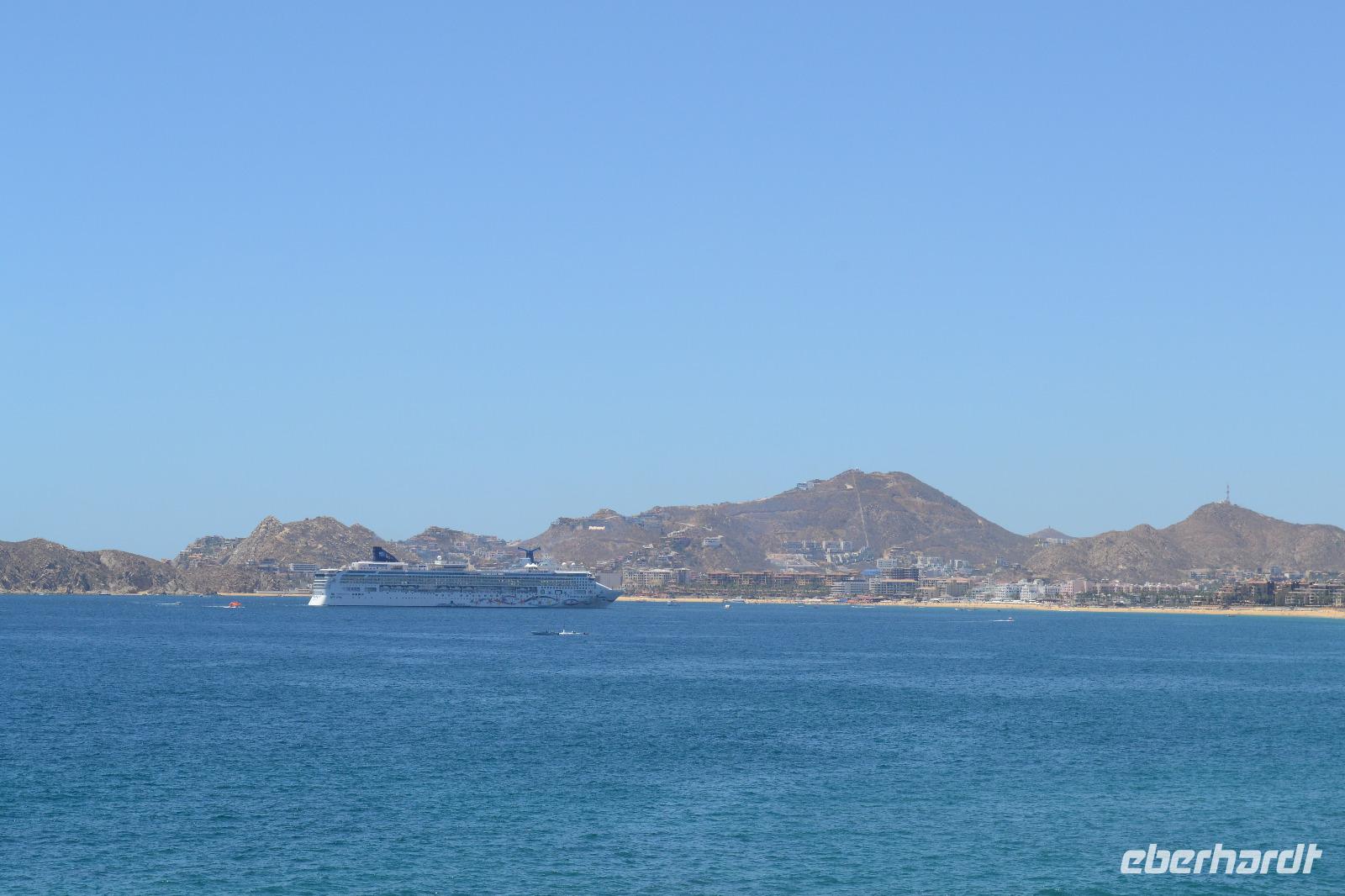 Der erste Tenderhafen wurde heute in Cabo San Lucas angelaufen. Der kleine Ort liegt an der Südspitze der Baja California Halbinsel Mexikos. Es lagen zwei weitere Schiffe auf Reede neben uns. Wir trafen uns mit Laura an der Rezeption und gingen gemeinsam zu den Tenderbooten auf Deck 4, welche uns innerhalb von 10 Minuten an Land brachten. Ein Teil der Gruppe bummelte auf eigenen Faust entlang der Hafenpromenade und genoss ein Bad im Meer. Der andere Teil unternahm einen Ausflug zu den Baja Highlights. Unser deutsch sprachiger Reiseleiter Memo führte uns zunächst in eine Glasbläserei. Dort erhielten wir eine Vorführung in die Kunst des Glases. Wir bestaunten die schnelle, jedoch präzise Arbeit und das kreieren einer Glasfigur. Weiter ging die Busfahrt zu einem Hotel mit traumhaften Blick auf die Bucht von Cabo San Lucas. Zur Erfrischung wurde uns ein kühles Getränk gereicht. Die Halbinsel verfügt über die schönsten Buchten und paradiesische Strände. Der letzte Stopp mit einer kleinen Freizeit führte uns nach San José del Cabo. Ein typisches Künstler Örtchen mit vielen Kunsthändlern und kleinen romantischen Cafés. Am Nachmittag tenderten alle Gäste zurück zum Schiff.