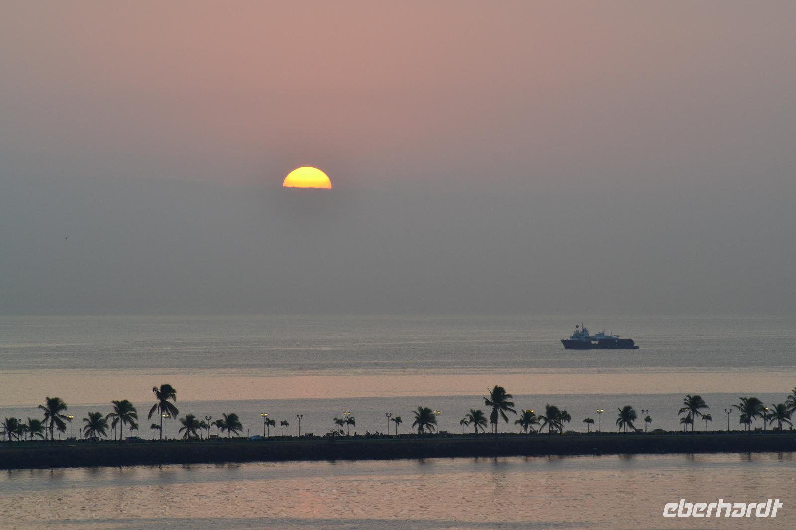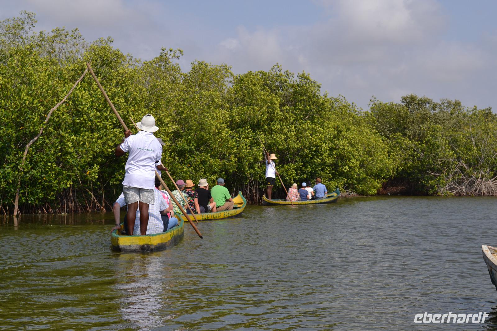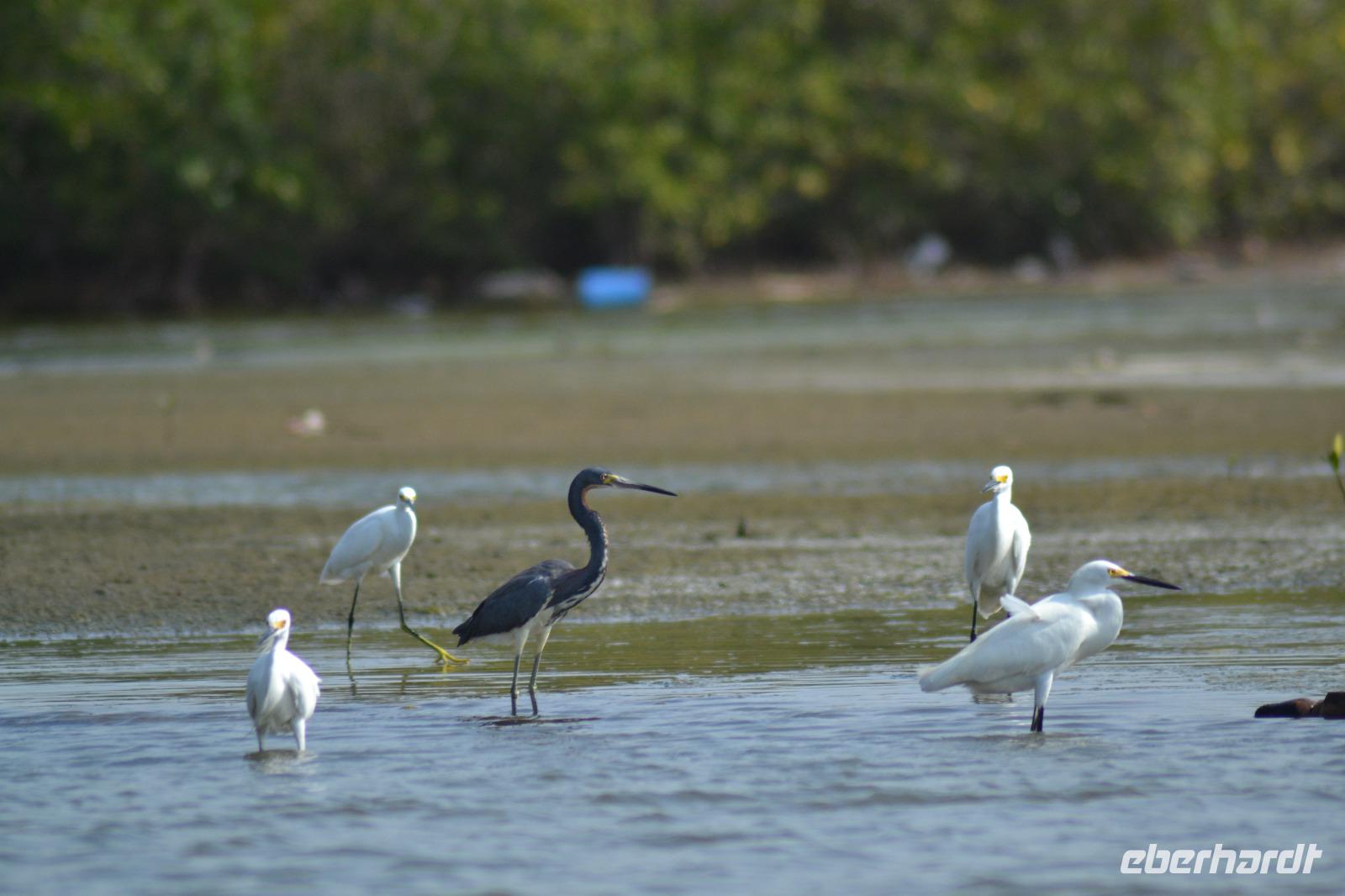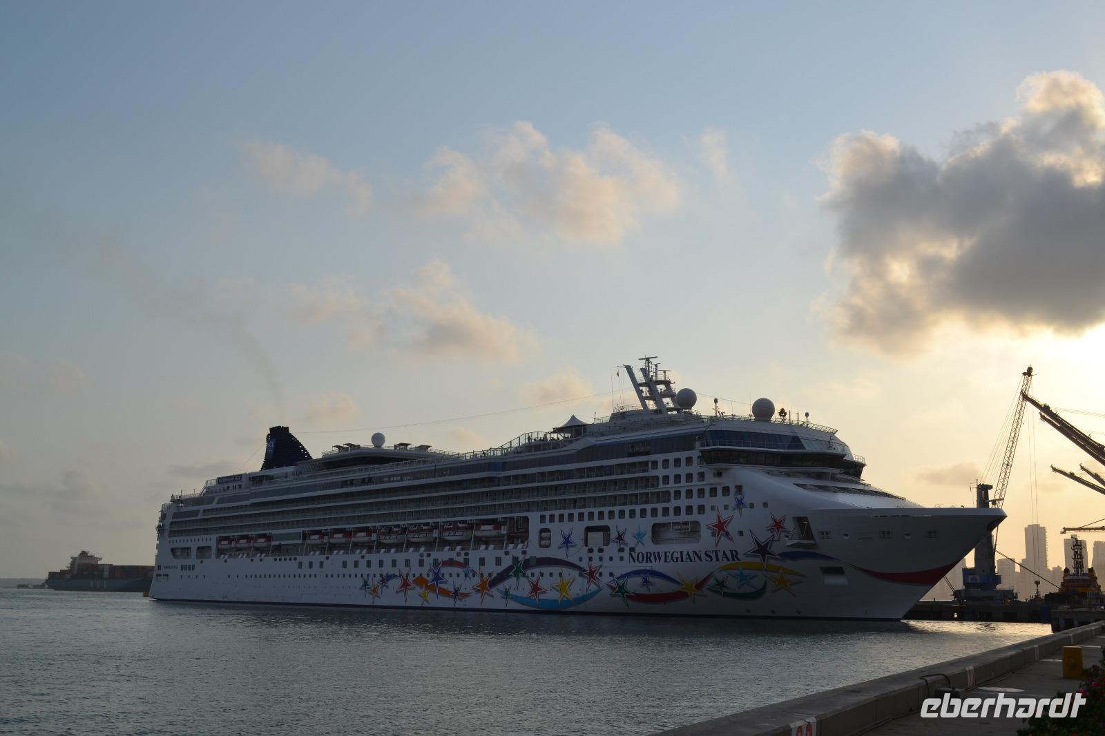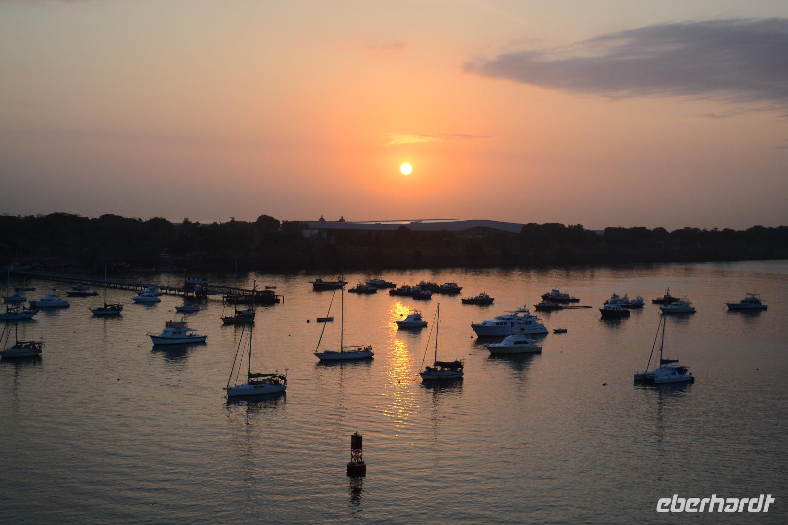 Unser letzter Hafen bevor wir in Miami einlaufen würden. Wir trafen uns am gewohnten Treffpunkt um 10 Uhr und verließen gemeinsam das Schiff. Schnell stellten wir fest, dass es heute wohl der heißeste Tag der Kreuzfahrt werden würde. Beim Verlassen des Hafenterminals durchquerten wir eine tolle kleine Zooanlage, welche uns Laura bereits an den Tagen zuvor ankündigte. Wir hießen unsere heutigen Reiseleiter Markus Willkommen. Der erste Besichtigungspunkt des Tages war das Castillo de San Felipe de Barajas. Oberhalb von Cartagena thront die beeindruckende Festung. Sie wurde bereits kurz nach der Gründung der Stadt gebaut und sollte die neue Kolonialhafenstadt, auf Grund des Gold- und Silberreichtums vor Angriffen der Piraten und Freibeuter schützen. Der höchste Punkt ragt stolze 41 Meter über den Meeresspiegel hinaus. Wir deckten uns mit ausreichend Wasser ein und erklommen die relativ steilen Wege. Markus erläuterte uns die verschiedenen Verteidigungsstrategien und Maßnahmen und zeigte uns das Tunnelsystem der Anlage. Diese dienten einerseits zum Schutz der Soldaten bei einem plötzlichen auftauchen und anderseits bildeten sie ein unterirdisches Labyrinth, in dem sich Eindringlinge verirren sollten. Von dem Bauwerk aus hatte man eine tolle Sicht auf die Altstadt, Stadtmauer und die neue Bürohäuser der Stadt. Anschließend fuhren wir weiter zu einem Altstadtspaziergang. Zunächst verkosteten wir an einem kleinen Obststand an der Straße ein paar typische Früchte wie kleine Pflaumenartige Cirudella. Weiter ging es zum Blumenmarkt der Stadt, wobei man untypischerweise mehr Kunstblumen als frische erstehen konnte. Doch das liegt an den Temperaturen und der Haltbarkeit in der Region. Wir erfrischten uns bei einem gepressten Lulu-Saft in mitten der Einheimischen und staunten nicht schlecht über die Männer mit Ihren Schreibmaschinen am Straßenrand. Da eine Vielzahl der Bürger von Cartagena nie erlernten ein offizielles Dokument zu schreiben übernehmen die Männer diese Arbeit gegen eine kleine Bezahlung. Nach kurzer Zeit erreichten wir das Eingangstor mit Uhrturm, sowie den Plaza de la Coaches. Bevor wir unser heutiges Restaurant für das Mittagessen erreichten, verteilte Markus ein paar typische Süßigkeiten und Gebäcke Kolumbiens. Die Altstadt bezauberte uns durch die zahlreichen kleinen Gassen und hübschen Häusern geschmückt mit Holzbalkonen und Blumen. Die Portionen und lokalen Beilagen wie Kochbananen trafen nicht alle Geschmäcker. Doch die Abkühlung, Ruhepause und Stärkung tat uns gut und wir schlenderten weiter zu unserem Bus. Dabei passierten wir die wunderschöne Santa Catalina Kathedrale und einen kleinen Park. Der Bus fuhr uns über eine Sandstraße entlang der Küste zu dem kleinen Fischerdorf la Boquilla. Nach einer kurzen Einweisung bestiegen wir unsere 6 Kanus und wurden von jeweils einem jungen Mann auf dem Kanu durch die dichten Mangroven Tunnel und Landschaften gefahren. In diesem Teil leben hauptsächlich afrikanisch Stämmige Einwohner. Entlang der Gewässer sahen wir die 3 unterschiedlichen Mangrovenarten rot, weiß und grün mit Austern am Stamm kleben. In der Natur leben eine Vielzahl an Vogelarten unter anderem der Graue und weiße Raijer. Auf dem Rückweg demonstrierte uns ein Fischer seine Technik zum Fang von Krebsen. Einen erwischte er beim ersten Versuch und seine restlichen Fänge präsentierte er uns in einer Drahtbox. Da derzeit Trockenzeit in Kolumbien herrscht sind nur wenige Teile der Gewässer für die Kanus befahrbar. Die Einheimischen verabschiedeten uns mit einer frischen Kokosnuss. Pünktlich 17 Uhr kehrten wir zum Hafen zurück und verabschiedeten uns von Markus. Es verblieben noch ein paar letzte Minuten in der kolumbianischen Hafenstadt zum Fotografieren der Tiere im kleinen Zoogelände vor dem Hafen. Hätten wir zu diesem Zeitpunkt geahnt, dass das Schiff fast eine Stunde später ablegen würde, hätten wir uns mehr Zeit gelassen. Jedoch wollten wir die anschließenden zwei Seetage und Fahrt nach Miami nicht verpassen.