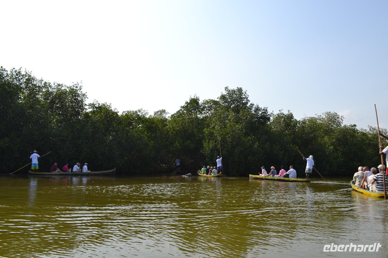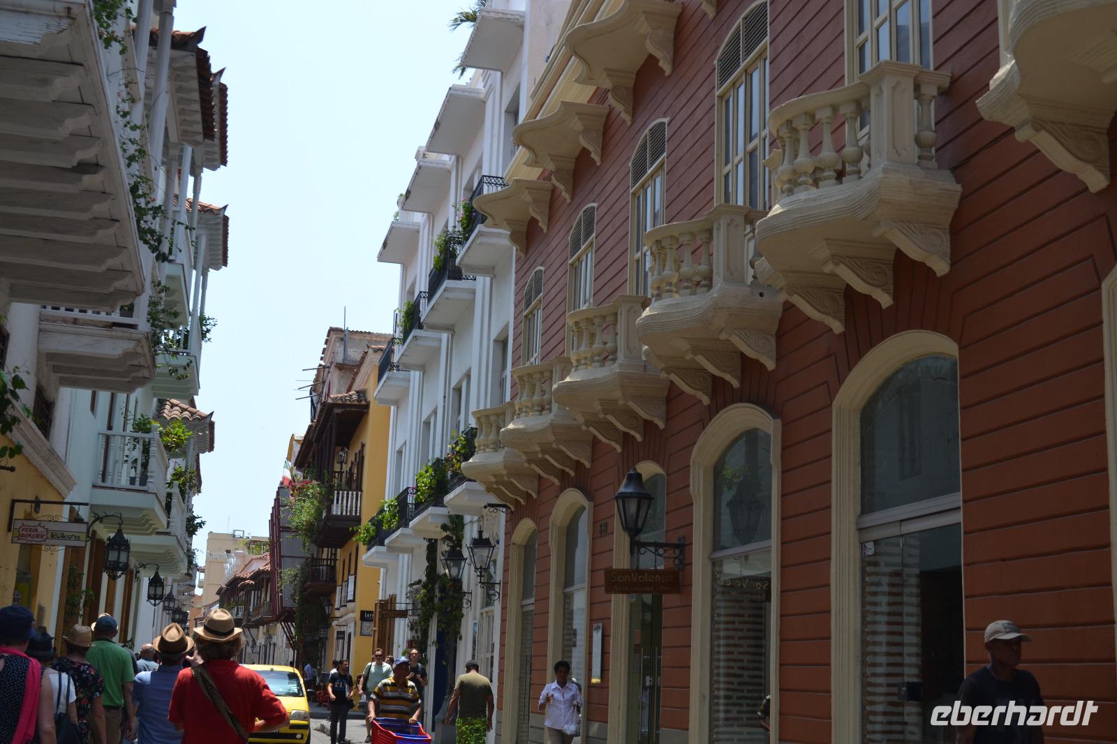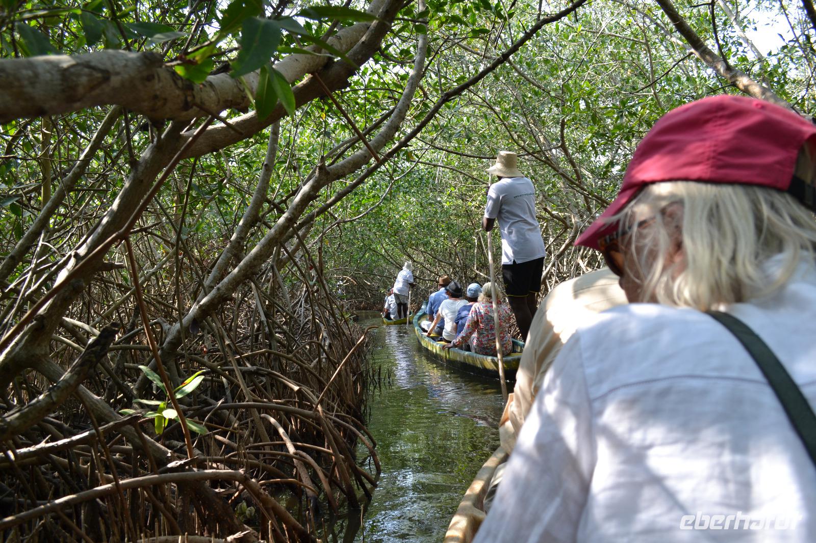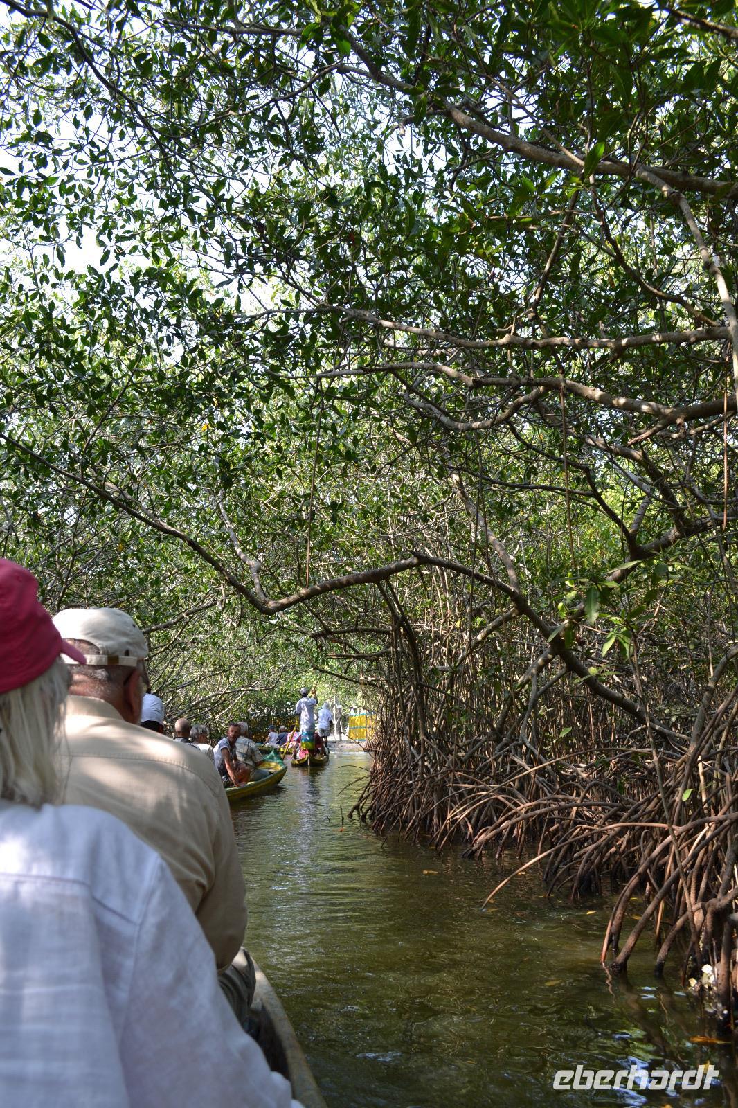 Unser letzter Hafen bevor wir in Miami einlaufen würden. Wir trafen uns am gewohnten Treffpunkt um 10 Uhr und verließen gemeinsam das Schiff. Schnell stellten wir fest, dass es heute wohl der heißeste Tag der Kreuzfahrt werden würde. Beim Verlassen des Hafenterminals durchquerten wir eine tolle kleine Zooanlage, welche uns Laura bereits an den Tagen zuvor ankündigte. Wir hießen unsere heutigen Reiseleiter Markus Willkommen. Der erste Besichtigungspunkt des Tages war das Castillo de San Felipe de Barajas. Oberhalb von Cartagena thront die beeindruckende Festung. Sie wurde bereits kurz nach der Gründung der Stadt gebaut und sollte die neue Kolonialhafenstadt, auf Grund des Gold- und Silberreichtums vor Angriffen der Piraten und Freibeuter schützen. Der höchste Punkt ragt stolze 41 Meter über den Meeresspiegel hinaus. Wir deckten uns mit ausreichend Wasser ein und erklommen die relativ steilen Wege. Markus erläuterte uns die verschiedenen Verteidigungsstrategien und Maßnahmen und zeigte uns das Tunnelsystem der Anlage. Diese dienten einerseits zum Schutz der Soldaten bei einem plötzlichen auftauchen und anderseits bildeten sie ein unterirdisches Labyrinth, in dem sich Eindringlinge verirren sollten. Von dem Bauwerk aus hatte man eine tolle Sicht auf die Altstadt, Stadtmauer und die neue Bürohäuser der Stadt. Anschließend fuhren wir weiter zu einem Altstadtspaziergang. Zunächst verkosteten wir an einem kleinen Obststand an der Straße ein paar typische Früchte wie kleine Pflaumenartige Cirudella. Weiter ging es zum Blumenmarkt der Stadt, wobei man untypischerweise mehr Kunstblumen als frische erstehen konnte. Doch das liegt an den Temperaturen und der Haltbarkeit in der Region. Wir erfrischten uns bei einem gepressten Lulu-Saft in mitten der Einheimischen und staunten nicht schlecht über die Männer mit Ihren Schreibmaschinen am Straßenrand. Da eine Vielzahl der Bürger von Cartagena nie erlernten ein offizielles Dokument zu schreiben übernehmen die Männer diese Arbeit gegen eine kleine Bezahlung. Nach kurzer Zeit erreichten wir das Eingangstor mit Uhrturm, sowie den Plaza de la Coaches. Bevor wir unser heutiges Restaurant für das Mittagessen erreichten, verteilte Markus ein paar typische Süßigkeiten und Gebäcke Kolumbiens. Die Altstadt bezauberte uns durch die zahlreichen kleinen Gassen und hübschen Häusern geschmückt mit Holzbalkonen und Blumen. Die Portionen und lokalen Beilagen wie Kochbananen trafen nicht alle Geschmäcker. Doch die Abkühlung, Ruhepause und Stärkung tat uns gut und wir schlenderten weiter zu unserem Bus. Dabei passierten wir die wunderschöne Santa Catalina Kathedrale und einen kleinen Park. Der Bus fuhr uns über eine Sandstraße entlang der Küste zu dem kleinen Fischerdorf la Boquilla. Nach einer kurzen Einweisung bestiegen wir unsere 6 Kanus und wurden von jeweils einem jungen Mann auf dem Kanu durch die dichten Mangroven Tunnel und Landschaften gefahren. In diesem Teil leben hauptsächlich afrikanisch Stämmige Einwohner. Entlang der Gewässer sahen wir die 3 unterschiedlichen Mangrovenarten rot, weiß und grün mit Austern am Stamm kleben. In der Natur leben eine Vielzahl an Vogelarten unter anderem der Graue und weiße Raijer. Auf dem Rückweg demonstrierte uns ein Fischer seine Technik zum Fang von Krebsen. Einen erwischte er beim ersten Versuch und seine restlichen Fänge präsentierte er uns in einer Drahtbox. Da derzeit Trockenzeit in Kolumbien herrscht sind nur wenige Teile der Gewässer für die Kanus befahrbar. Die Einheimischen verabschiedeten uns mit einer frischen Kokosnuss. Pünktlich 17 Uhr kehrten wir zum Hafen zurück und verabschiedeten uns von Markus. Es verblieben noch ein paar letzte Minuten in der kolumbianischen Hafenstadt zum Fotografieren der Tiere im kleinen Zoogelände vor dem Hafen. Hätten wir zu diesem Zeitpunkt geahnt, dass das Schiff fast eine Stunde später ablegen würde, hätten wir uns mehr Zeit gelassen. Jedoch wollten wir die anschließenden zwei Seetage und Fahrt nach Miami nicht verpassen.