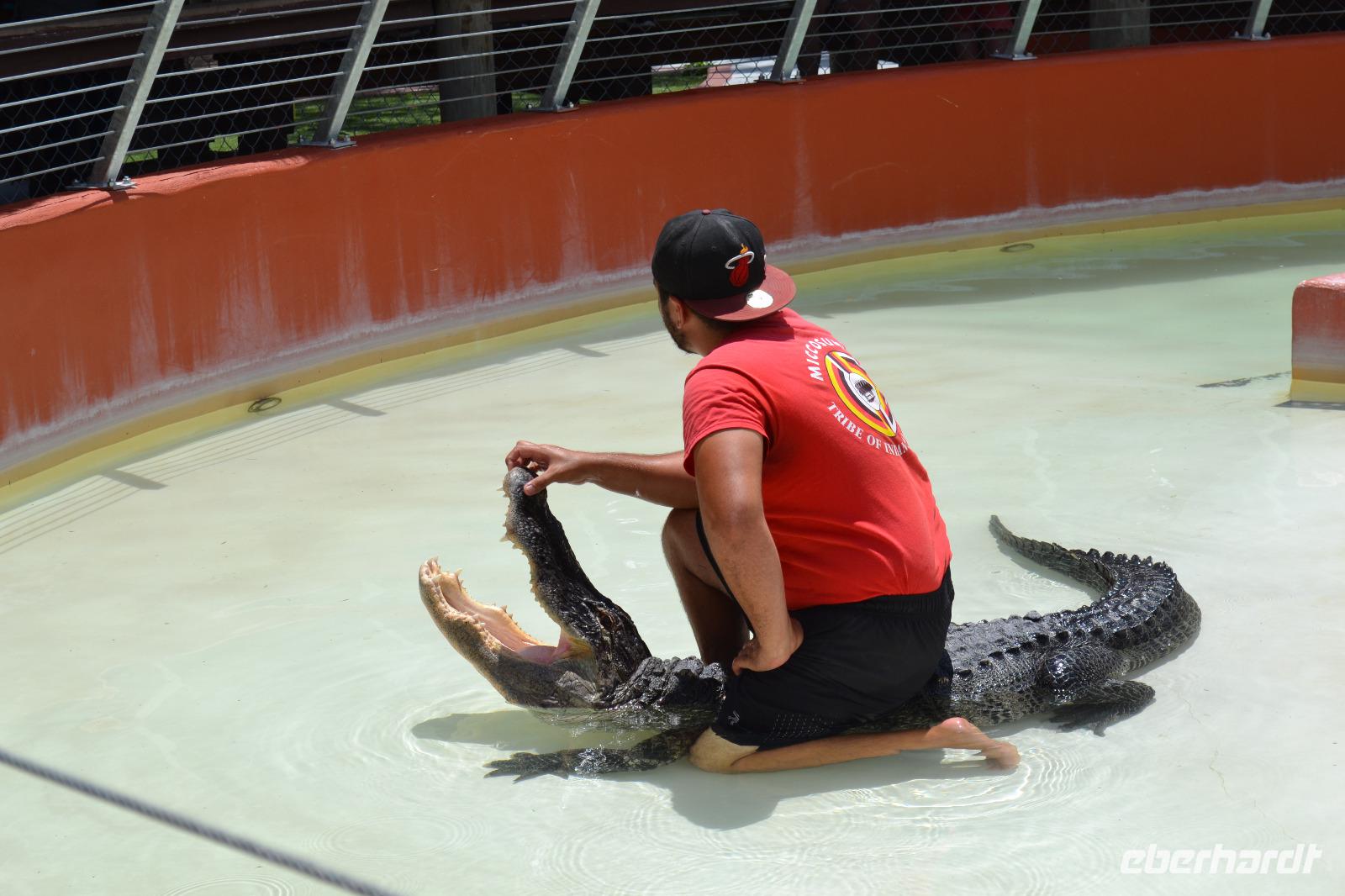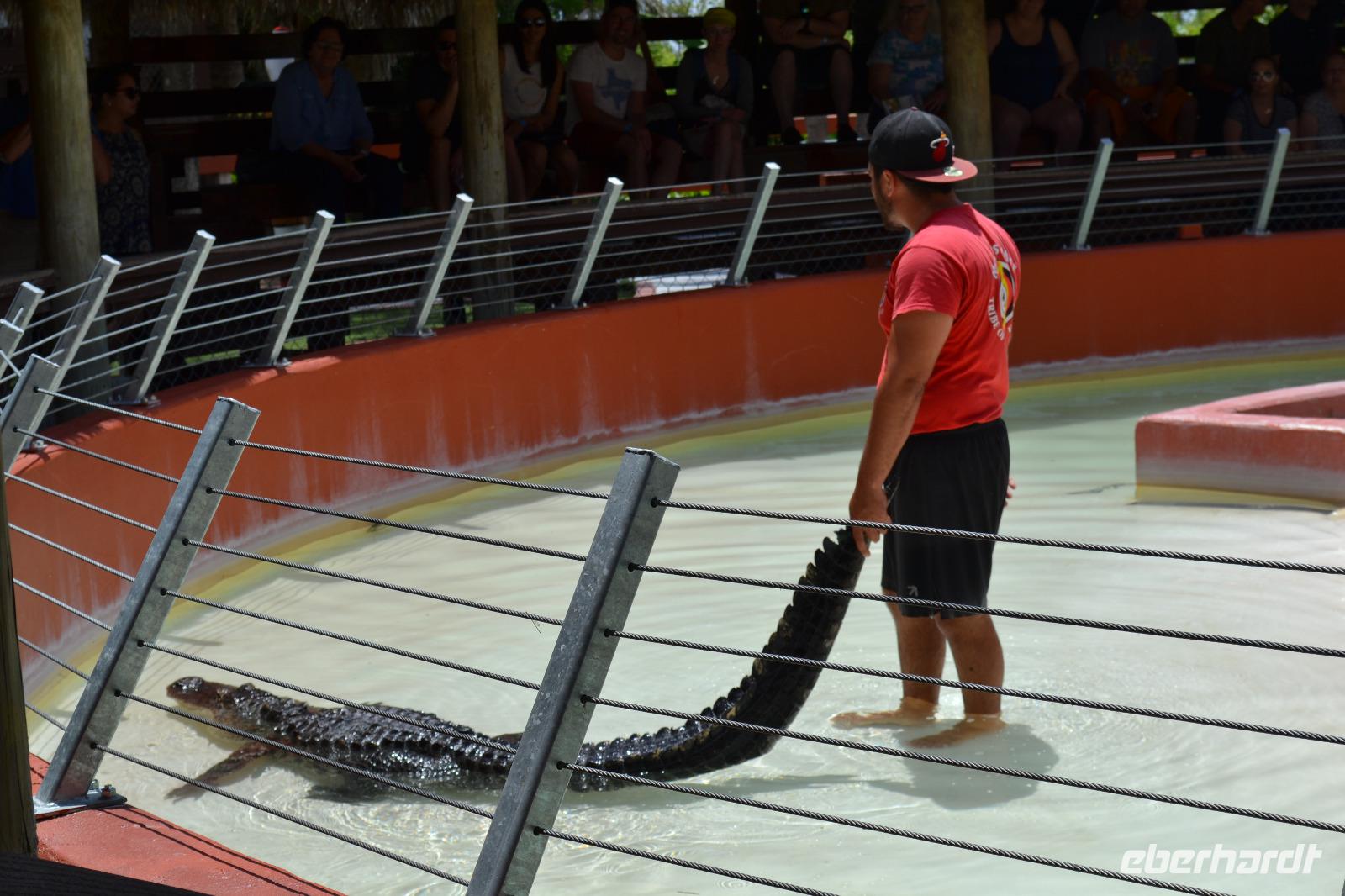 Am Morgen trafen wir uns alle auf Deck 7 im Stardust Theater um gemeinsam das Schiff zu verlassen. Bevor wir jedoch unsere Koffer im Hafenterminal entgegen nehmen konnten stellten wir uns auf eine lange Wartezeit ein. Wir nutzten die Internetverbindung um den daheim gebliebenen eine kurze Nachricht zu senden. Nachdem wir unser Gepäck wieder in Empfang nahmen begann für uns die zweite Etappe der Warteschlange. Alle Gäste kamen durch die Zollkontrollen und niemand musste am Hafen zurück gelassen werden. Außerhalb nahm uns die holländische Reiseleiterin Magarete in Empfang und wir fuhren zunächst in den Everglades Nationalpark. Dort erwartete uns eine abenteuerliche Airboot Fahrt durch das Sumpfgebiet. Wir beobachten viele Tiere, wie Alligatoren, Vogelarten und kleinere Insekten. Die Straße zurück in das Miccosukee Indian Dorf wurde durch eine Polizeistreife abgesperrt, sodass wir diese gefahrlos überqueren konnten. Zurück in der demonstrativen Anlage erzählte uns die örtliche Mitarbeiterin des Dorfes ein paar Geschichten aus dem Leben der Einwohner. Einige Indianer führten uns Ihre Arbeiten vor welcher Sie heute noch nachgehen. Als Highlight folgte eine Alligatoren Show mit Erzählungen über das Verhalten der Tiere. Dabei wurde der Unterschied zum Krokodil sehr deutlich gemacht. Bevor wir wieder in den Bus stiegen überraschte uns Laura noch mit einem kleinen Schnaps als Abschied für die tolle Reise. Für eine Mittagspause hielten wir an der Fußgängerzone Lincoln Road in Miami Beach. Dort konnte man gemütlich einen Kaffee trinken, bummeln oder einen kleinen Snack verzehren. Den Nachmittag nutzen viele Gäste im Hotel und ruhten sich für das bevorstehende Abendessen aus. Einige besuchten den berühmten Strand von Miami Beach mit den bunten Badehäusern oder erfrischten sich bei einem Sprung in den Pool auf der Dachterrasse des Hotels. Zum Abendessen fuhren wir mit dem Bus 20 Minuten nach Downtown. Am Hafen von Bayside speisten wir heute in einem lokalen Fischrestaurant. Nach unserem letzten 3-Gänge-Menü waren wir gesättigt und legten den Weg durch die aufregend beleuchtete Stadt zurück in unser Hotel.
