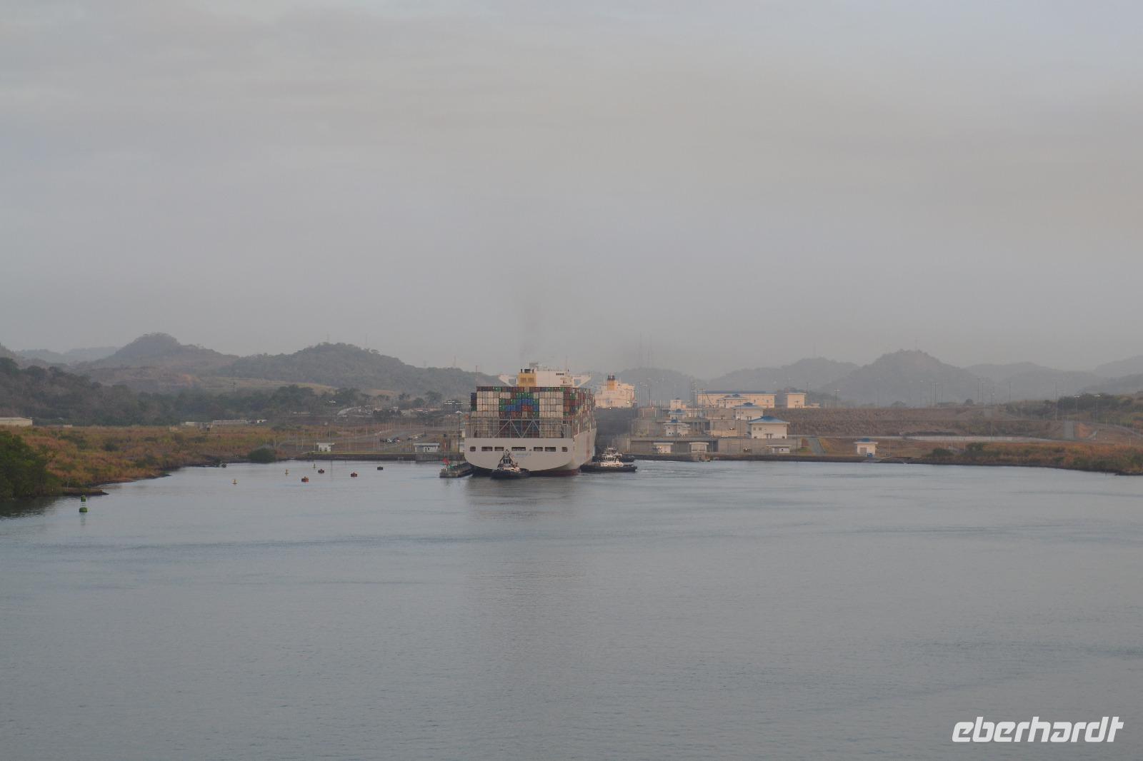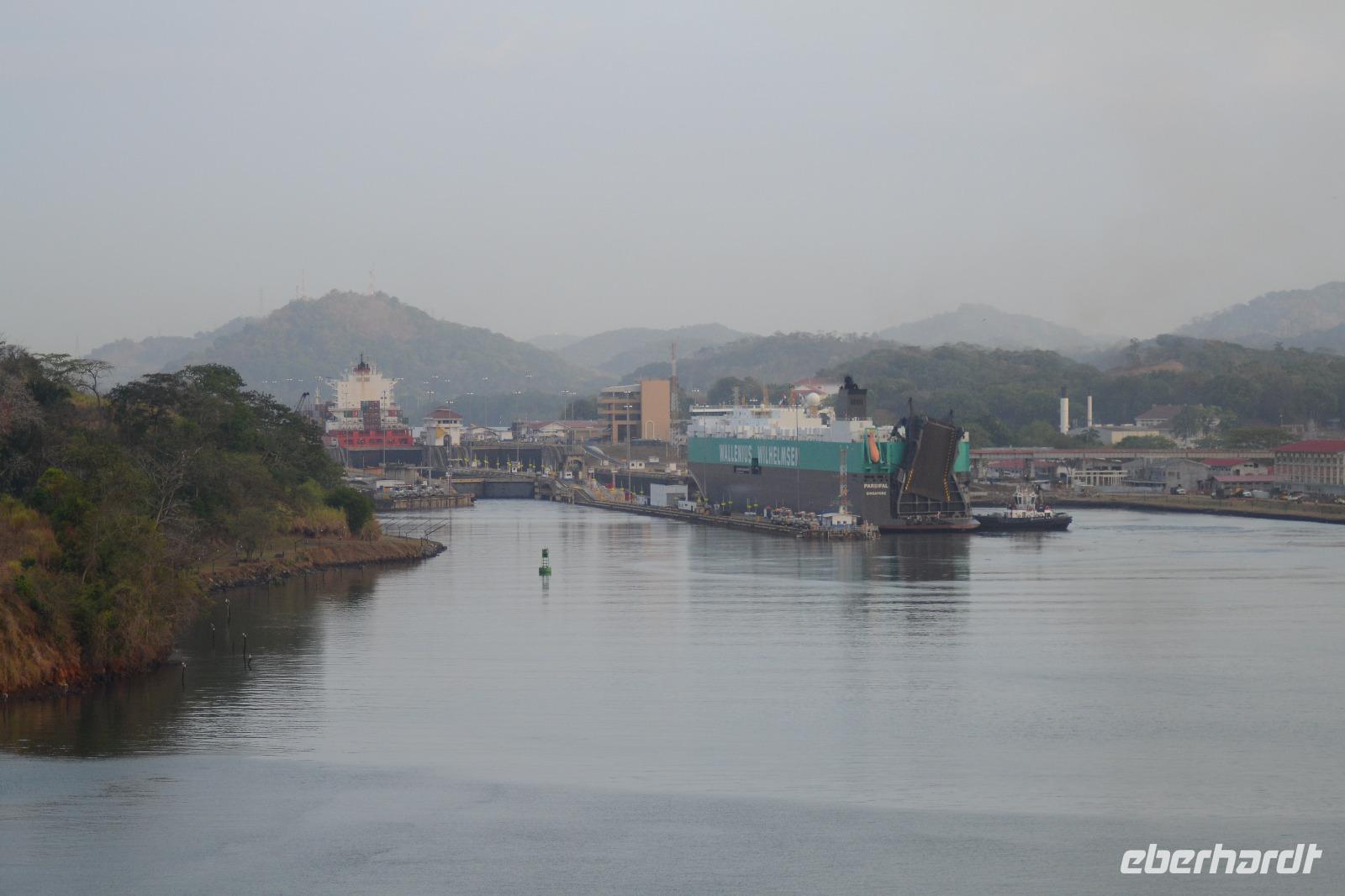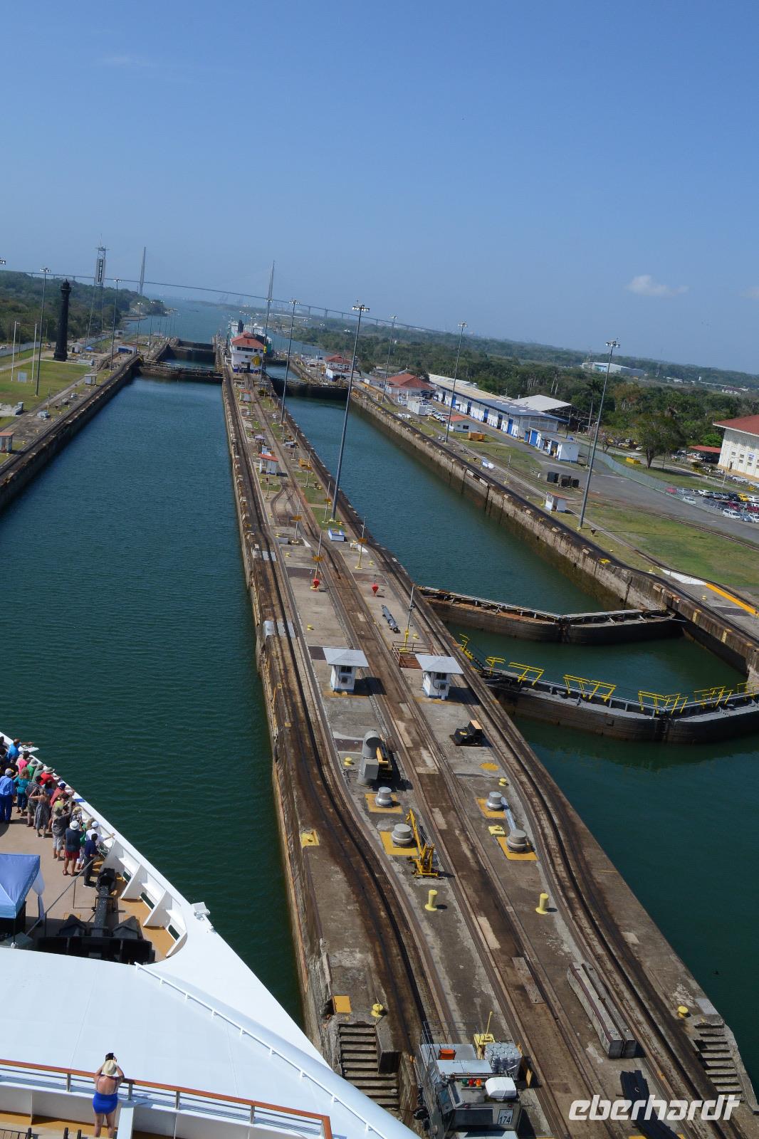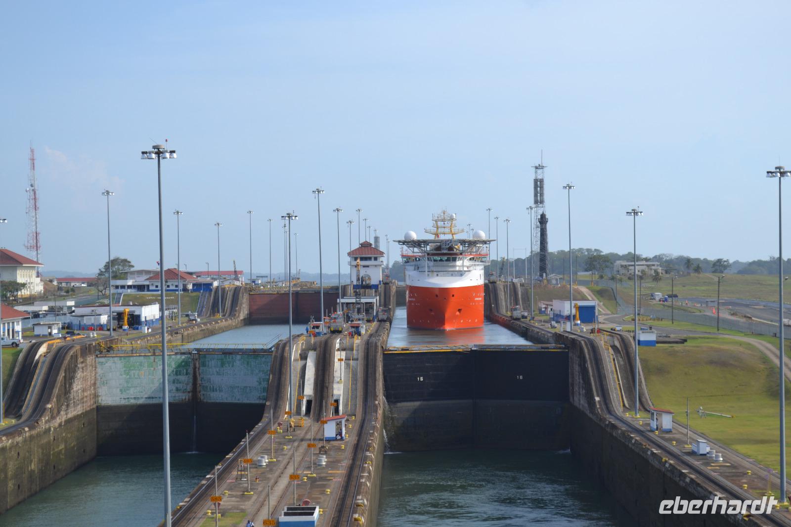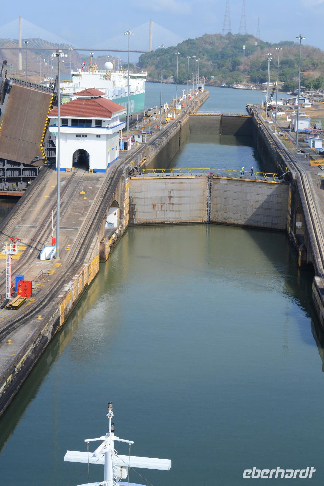 Endlich war der Tag gekommen auf welchen wir uns vor Reiseantritt freuten. In den frühen Morgenstunden gegen 5:45 Uhr lief unser Schiff bei Panama City in den Panamakanal ein. Ca. eine Stunde später stand die Durchquerung der Miraflores und Pedro Miguell Schleuse an. Es dauerte einige Zeit bis sich die Becken genug füllten, um mit dem großen Schiff in Millimeterarbeit entlang der Schleusenwände zu fahren. Bei der weiteren Fahrt genossen wir die facettenreiche Landschaft welche sich anfangs von einer kargen Hügel-und Terrassenlandschaft in eine grüne karibische Seenlandschaft verwandelte. Wir erhielten einige Erklärungen zum aktuellen Standort durch eine Englische Reiseleiterin über die öffentlichen Lautsprecher.