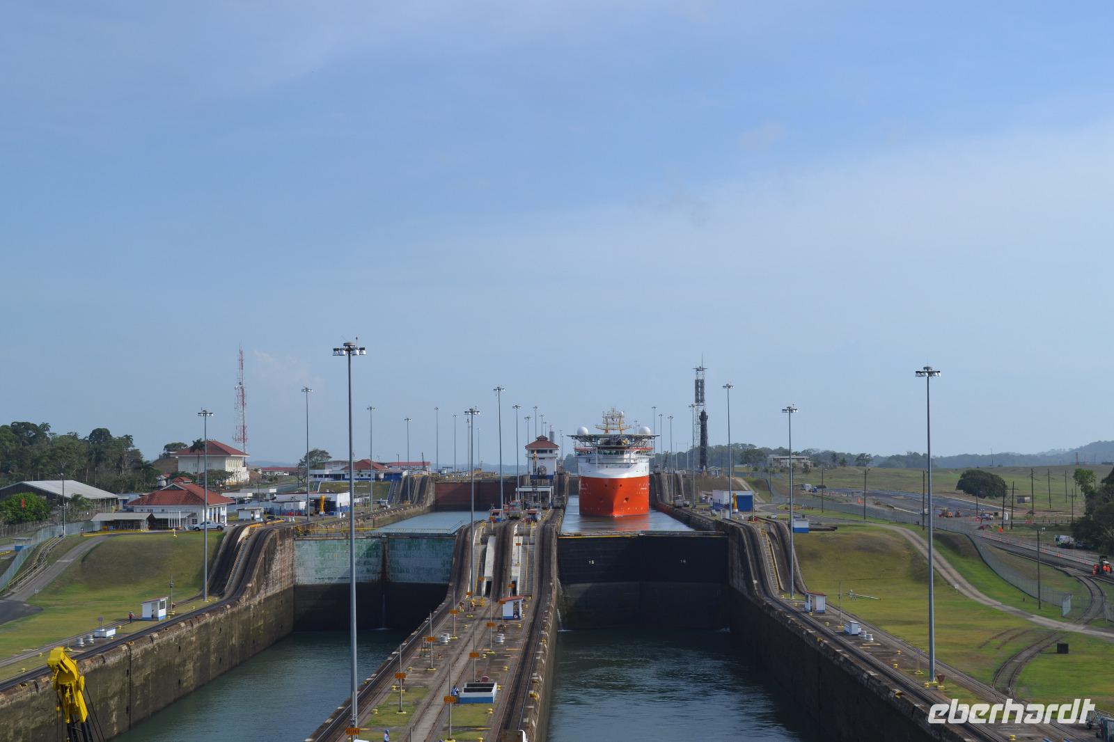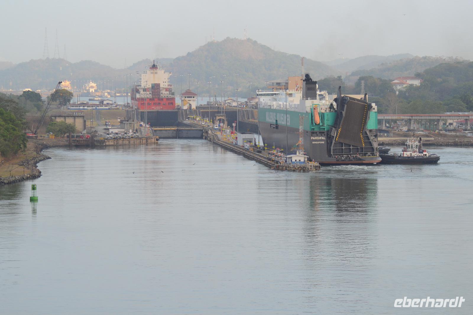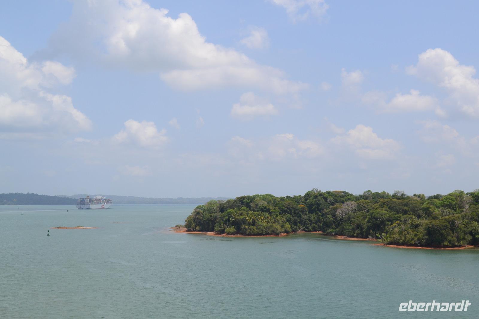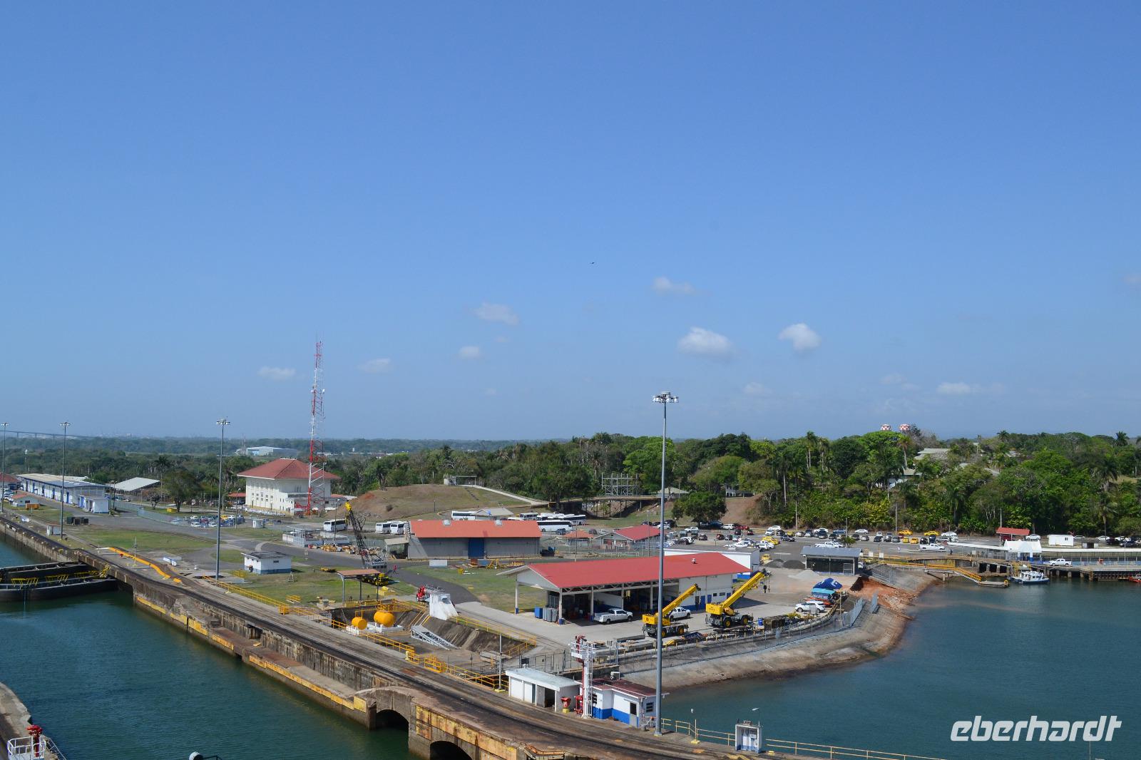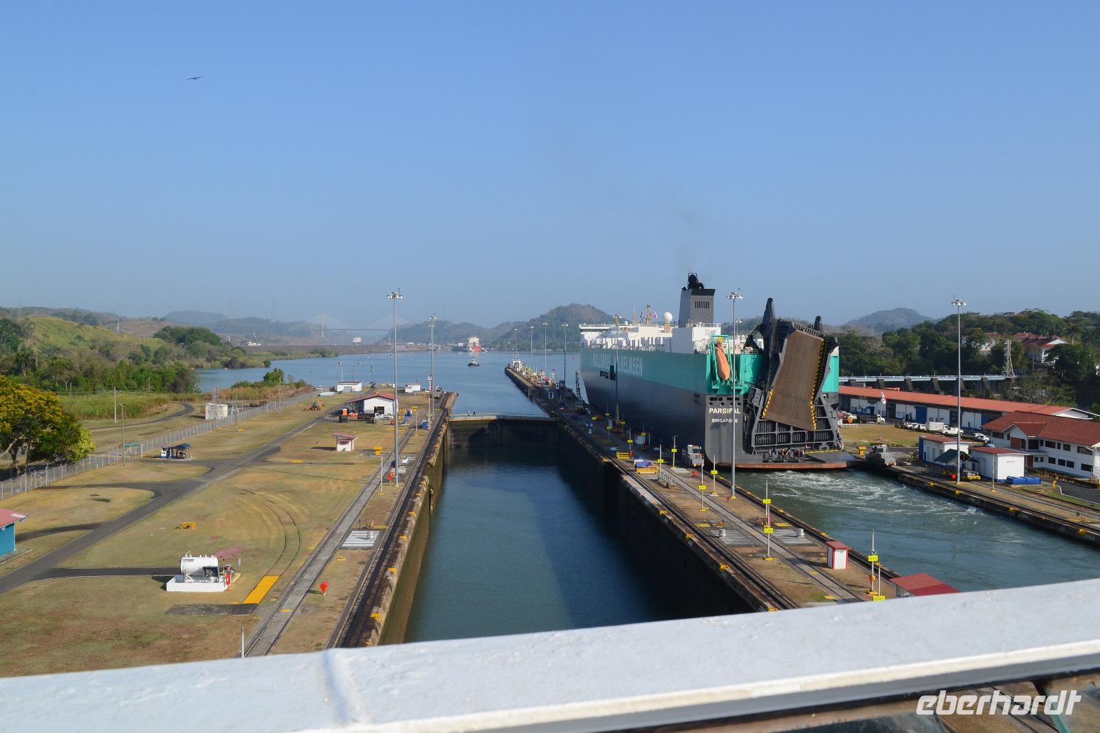 Endlich war der Tag gekommen auf welchen wir uns vor Reiseantritt freuten. In den frühen Morgenstunden gegen 5:45 Uhr lief unser Schiff bei Panama City in den Panamakanal ein. Ca. eine Stunde später stand die Durchquerung der Miraflores und Pedro Miguell Schleuse an. Es dauerte einige Zeit bis sich die Becken genug füllten, um mit dem großen Schiff in Millimeterarbeit entlang der Schleusenwände zu fahren. Bei der weiteren Fahrt genossen wir die facettenreiche Landschaft welche sich anfangs von einer kargen Hügel-und Terrassenlandschaft in eine grüne karibische Seenlandschaft verwandelte. Wir erhielten einige Erklärungen zum aktuellen Standort durch eine Englische Reiseleiterin über die öffentlichen Lautsprecher.