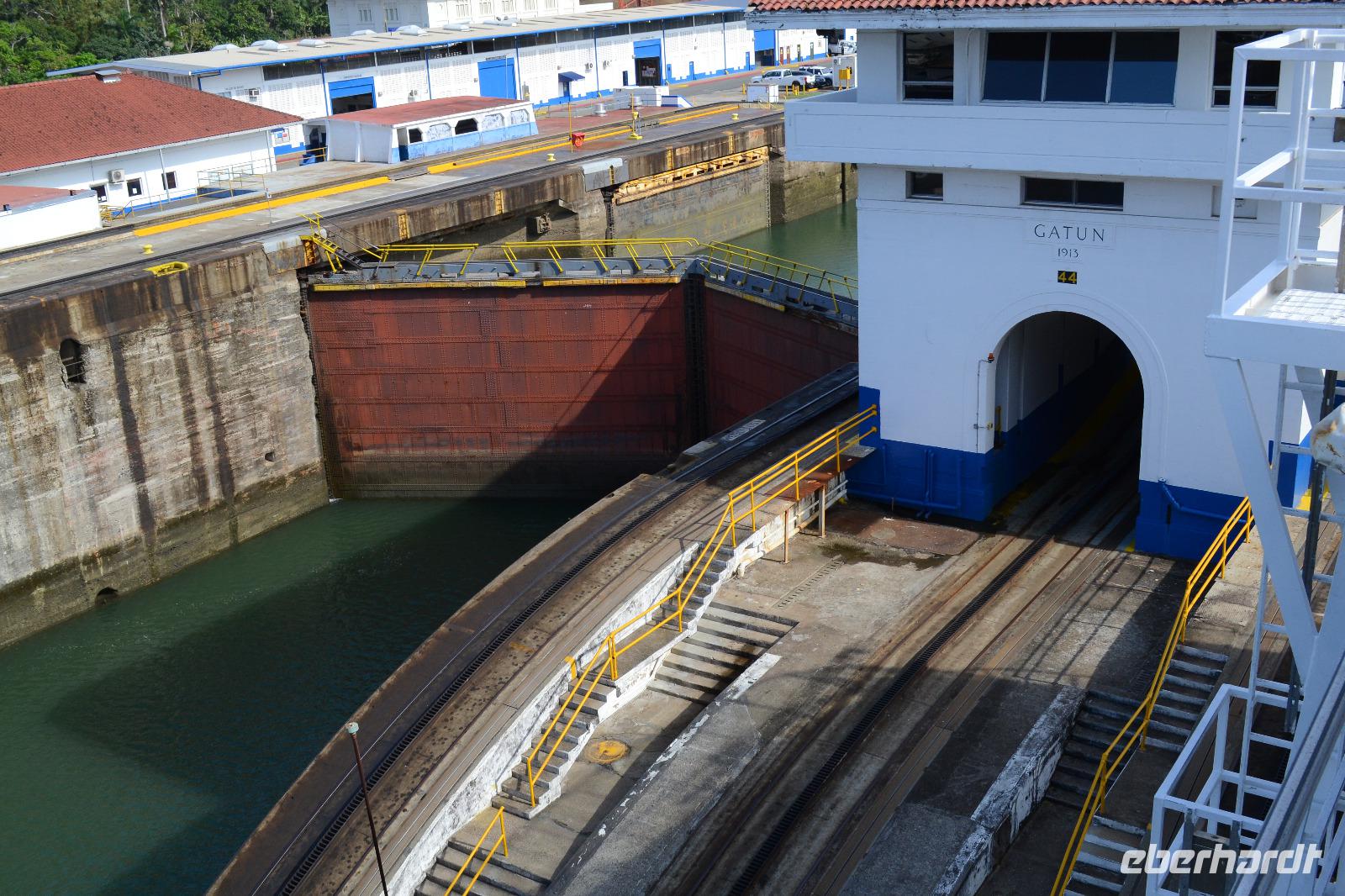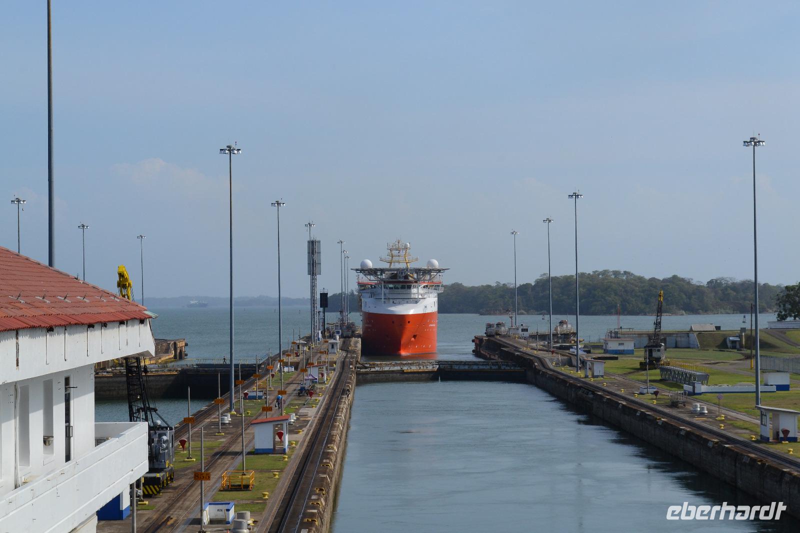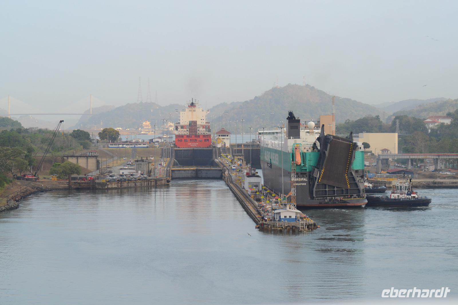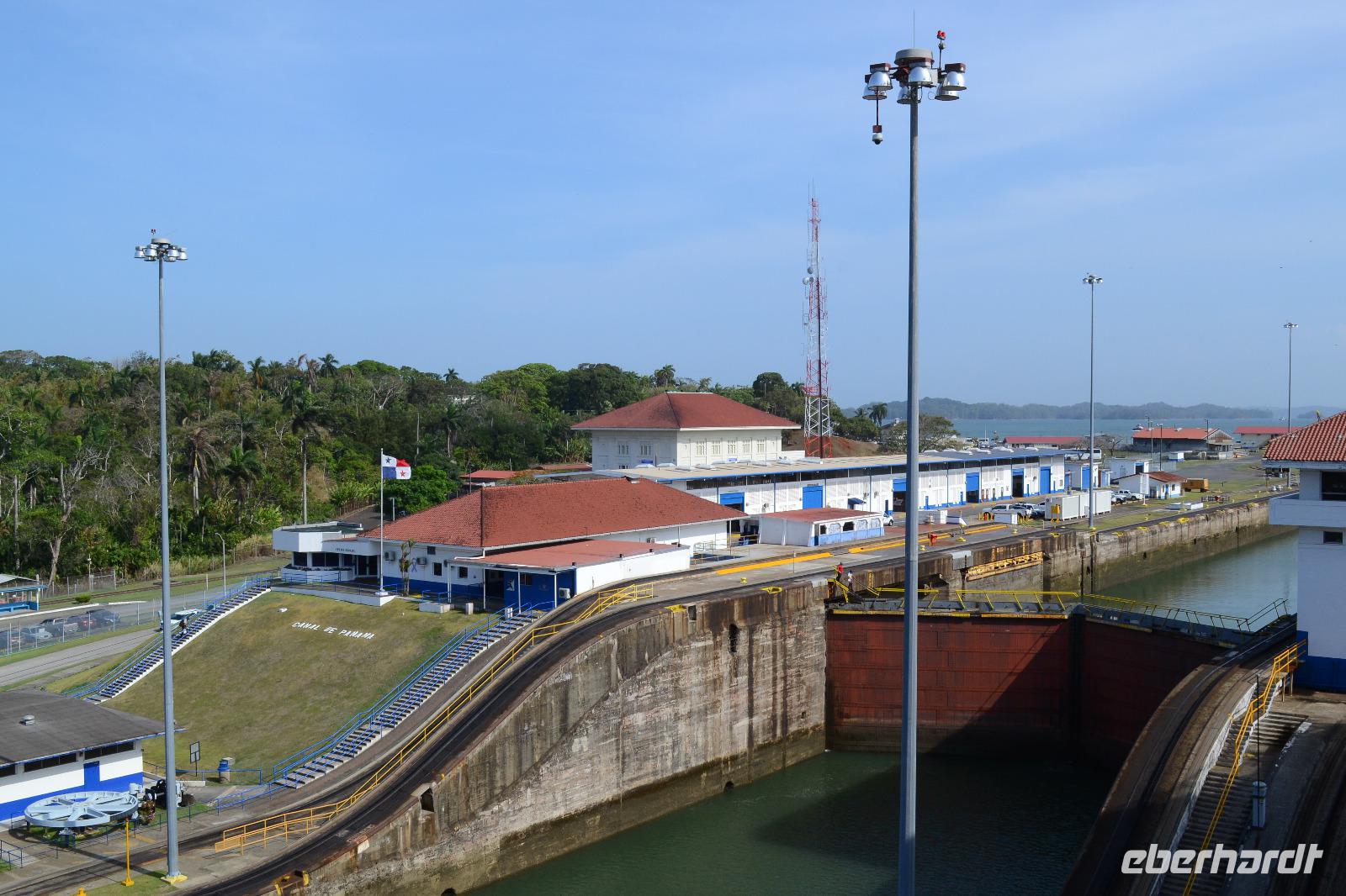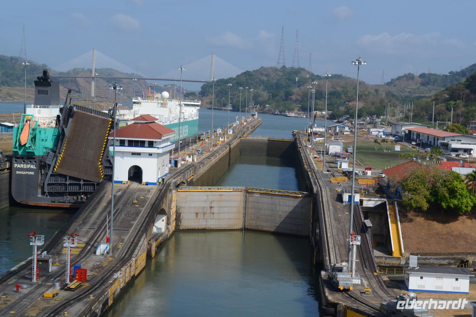Endlich war der Tag gekommen auf welchen wir uns vor Reiseantritt freuten. In den frühen Morgenstunden gegen 5:45 Uhr lief unser Schiff bei Panama City in den Panamakanal ein. Ca. eine Stunde später stand die Durchquerung der Miraflores und Pedro Miguell Schleuse an. Es dauerte einige Zeit bis sich die Becken genug füllten, um mit dem großen Schiff in Millimeterarbeit entlang der Schleusenwände zu fahren. Bei der weiteren Fahrt genossen wir die facettenreiche Landschaft welche sich anfangs von einer kargen Hügel-und Terrassenlandschaft in eine grüne karibische Seenlandschaft verwandelte. Wir erhielten einige Erklärungen zum aktuellen Standort durch eine Englische Reiseleiterin über die öffentlichen Lautsprecher.