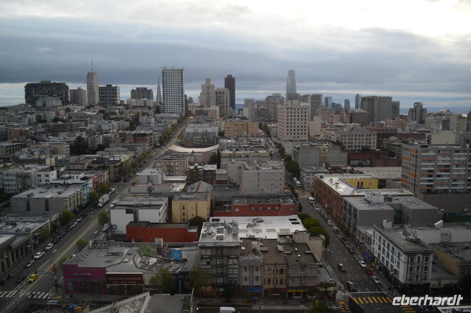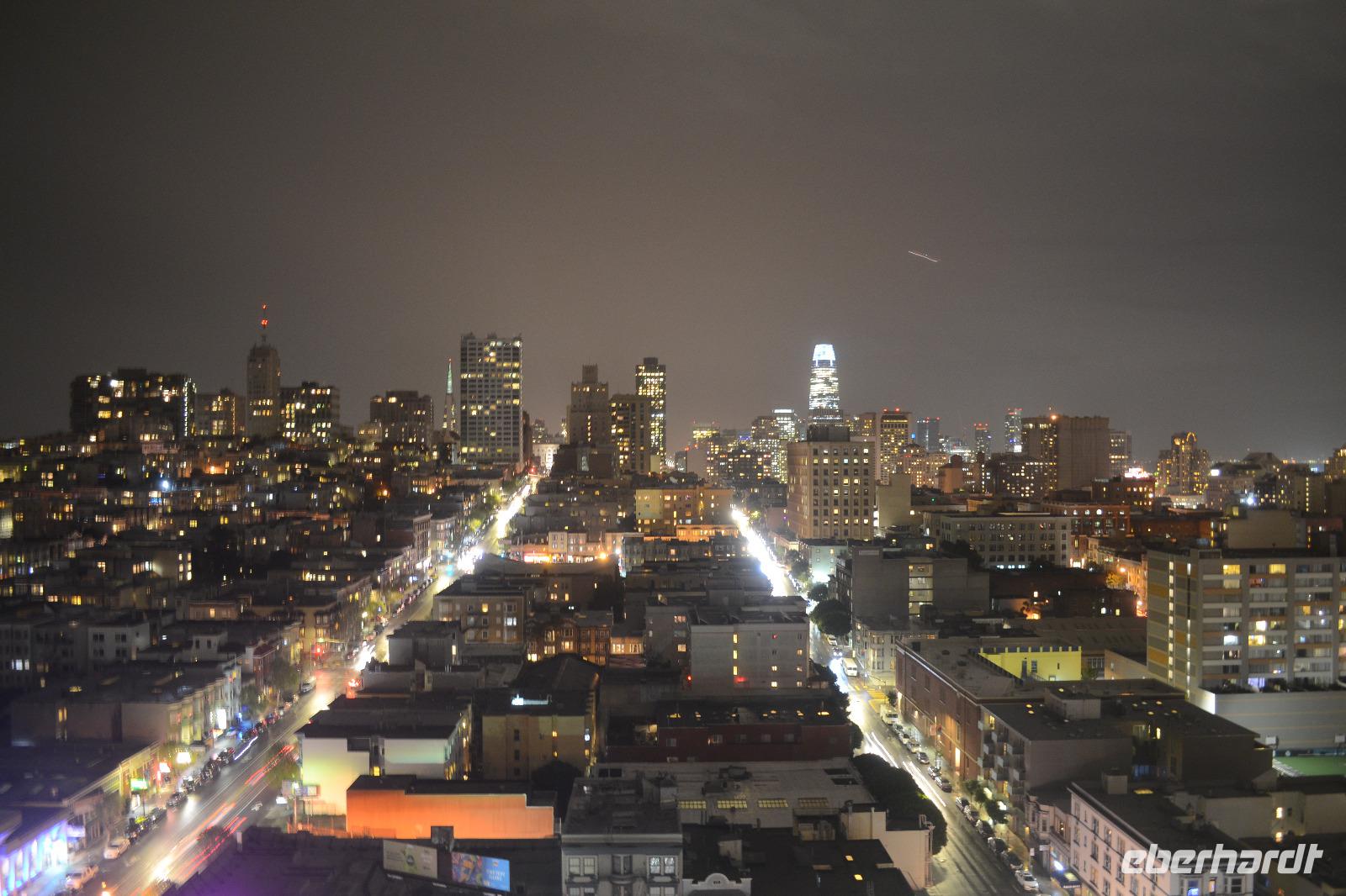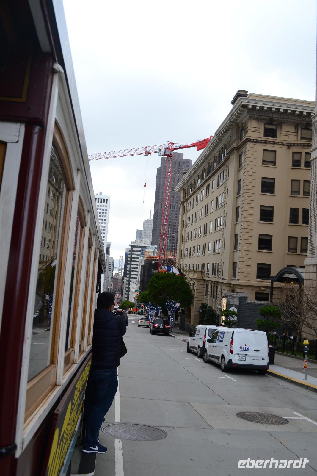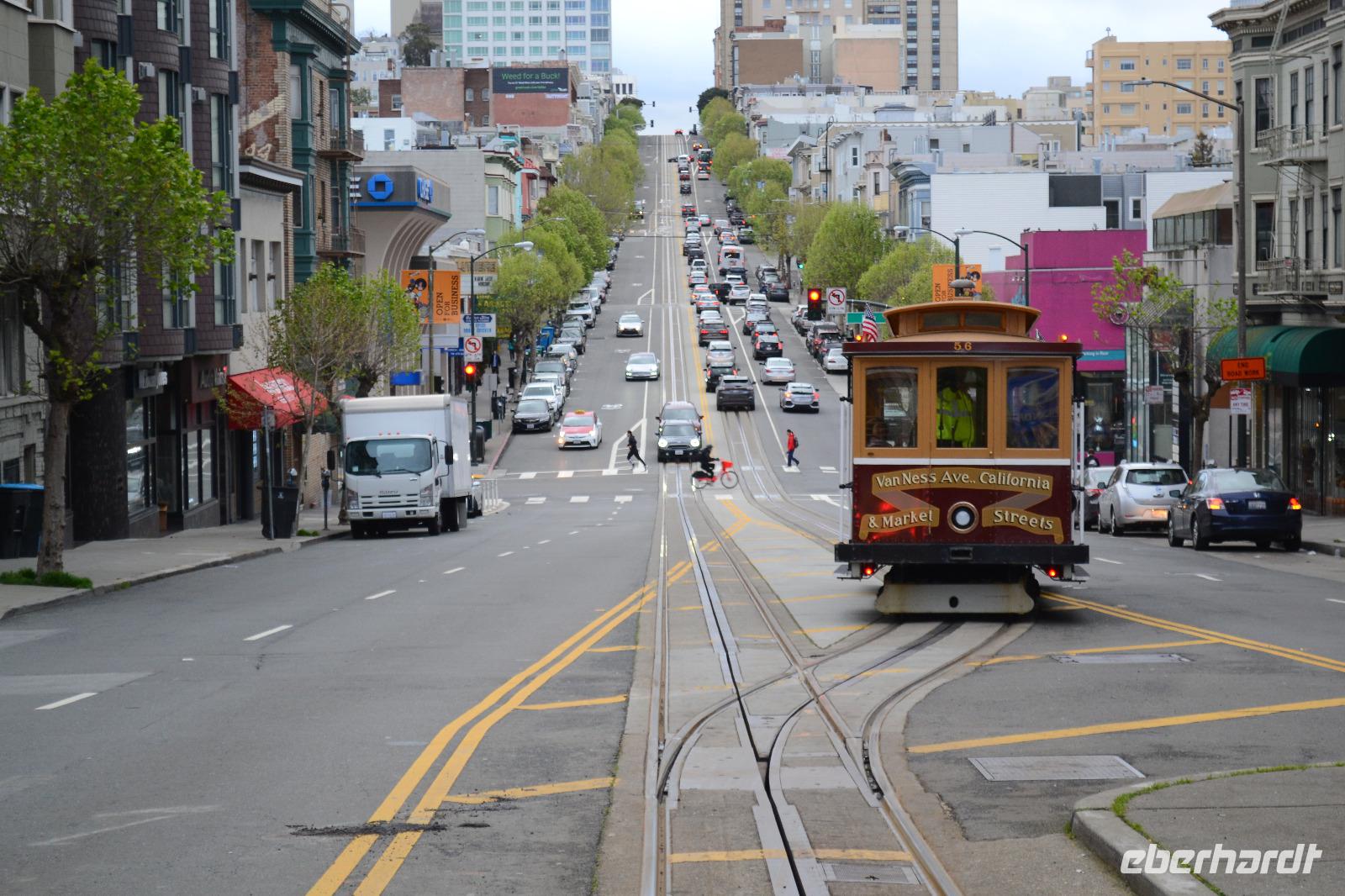 Mitten in der Nacht reiste der Großteil der Gäste nach Dresden um den ersten kurzen Flug nach Frankfurt zu nehmen. Nach einem kleinen Frühstück im Flughafen startet die Maschine pünktlich. In Frankfurt angekommen führte uns der Weg zum Anschlussgate durch die Internationalen Sicherheitskontrollen. Immer mehr Reiseteilnehmer trafen von verschiedenen Städten wie Brandenburg, Berlin, Köln und Bayern ein. Zum Abflug war die Gruppe bestehend aus 23 Gästen komplett. Nach 12 Stunden Flug landeten wir endlich in San Francisco. Reiseleiter Chris begrüßte uns dort für die nächsten 5 Tage. Wir verstauten unser Gepäck im Bus und fuhren zu unserem Hotel in Down Town. Unterwegs gab er uns schon einige Hinweise zur Stadt. Nach einer kurzen Ruhepause spazierten wir gemeinsam eine Straße weiter zu unserem Abendessen im Grubstake. Das Restaurant ähnelte von außen einer Cable Car, welche für die Stadt bekannt war. Müde und erschöpft fielen wir alle in unsere Betten. Doch der Jetlag ließ uns kaum schlafen.