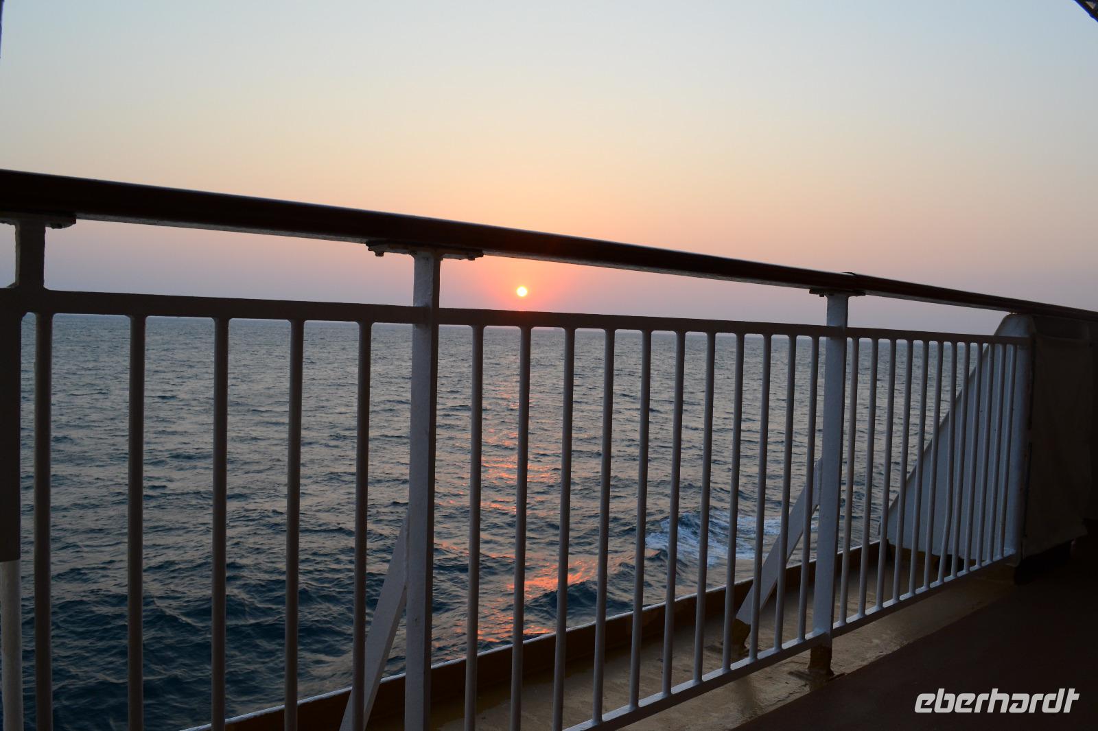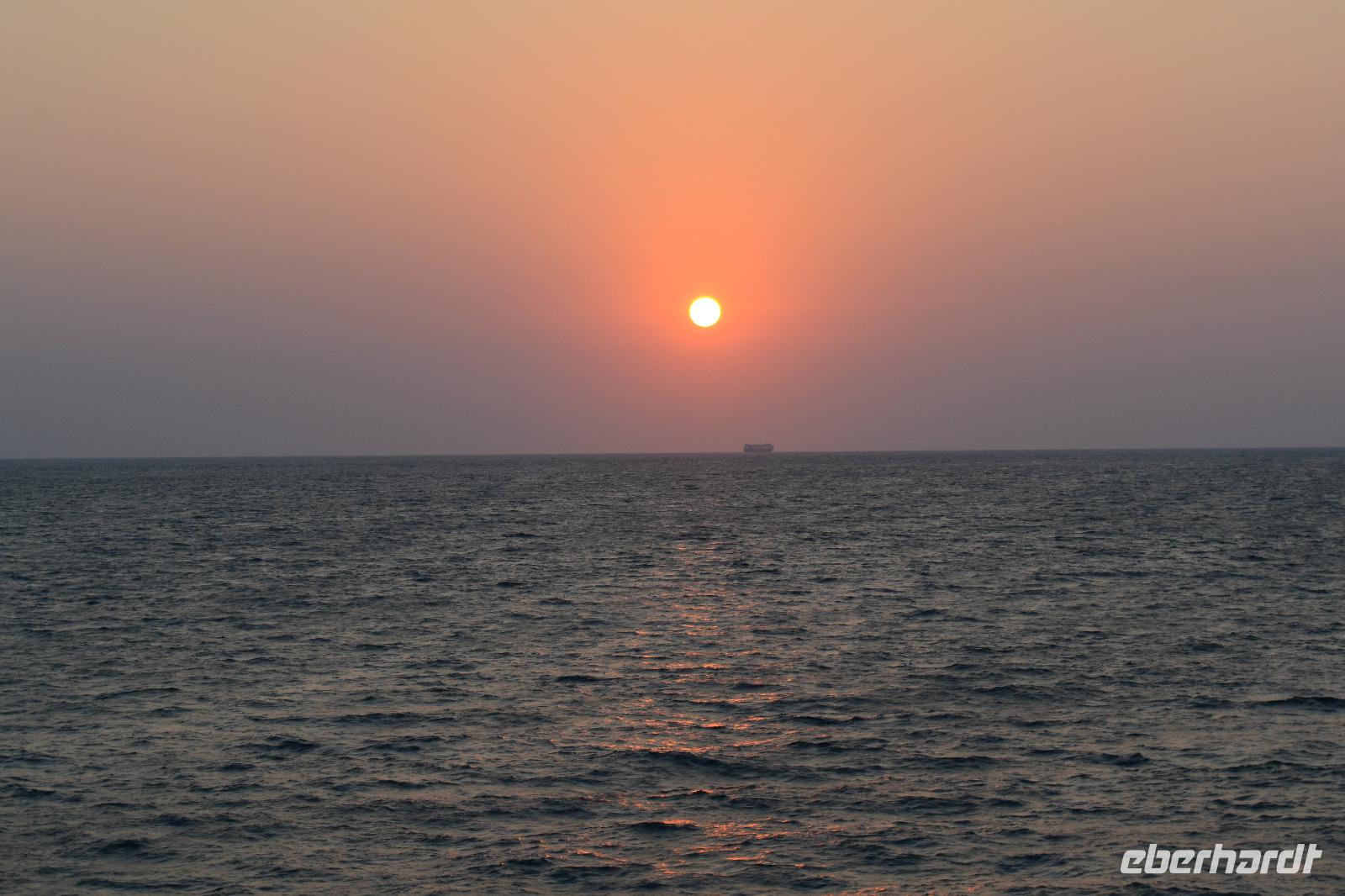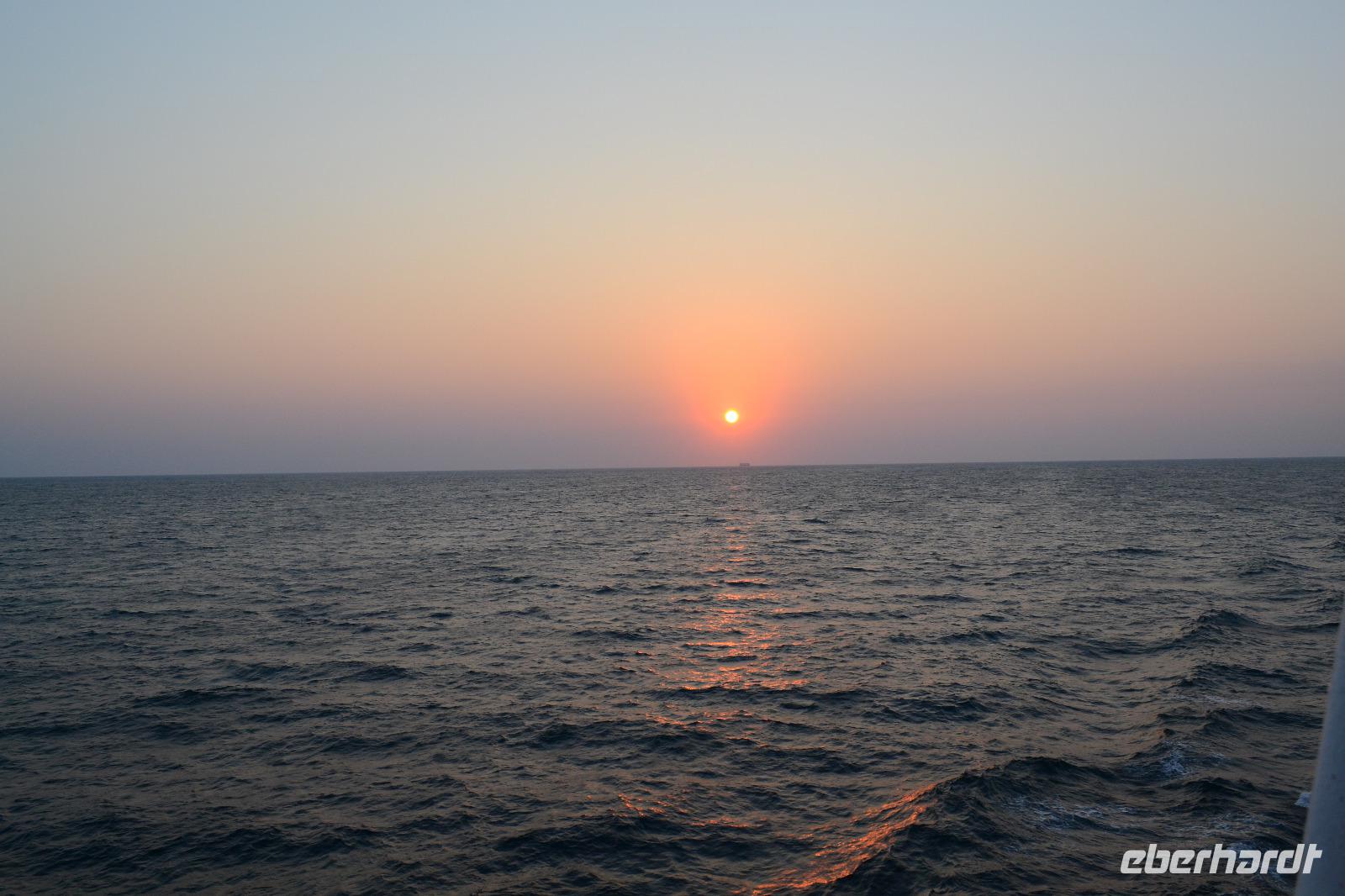 Der heutige Tag brachte sehr viel Wärme, jedoch wurde die Sicht auf das Meer durch einen leichten Nebelfilm bedeckt. Dennoch genossen wir die Annehmlichkeiten des Schiffes. Am Abend trafen wir uns gemeinsam zum Essen im Aqua Restaurant und tauschten uns über die vergangenen Tage aus.
