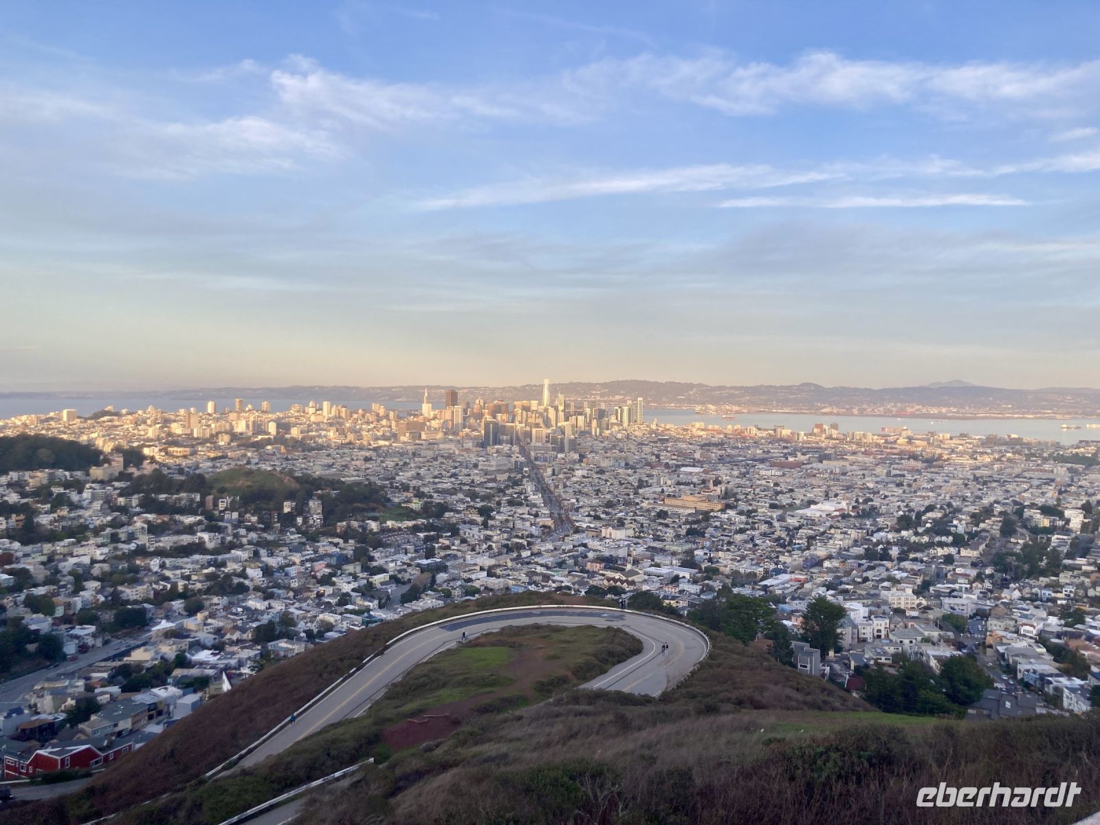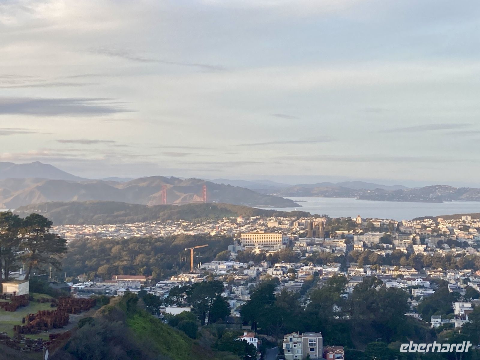 Nachdem wir uns im Hotel frisch gemacht und eingecheckt hatten, begannen wir unsere Erkundungstour durch San Francisco. Die Stadt, die auf 42 Hügeln erbaut ist, faszinierte uns mit ihrer Vielfalt und Geschichte. Die Bay Area umfasst 6,5 Millionen Einwohner. Auf unserer Orientierungsfahrt fuhren wir zu den Twin Peaks, wo einst die Spanier siedelten. Die majestätischen Twin Peaks, die mit 271 und 274 Metern in den Himmel ragen, boten einen atemberaubenden Ausblick über die Stadt, die von der malerischen San Francisco Bucht umgeben ist.