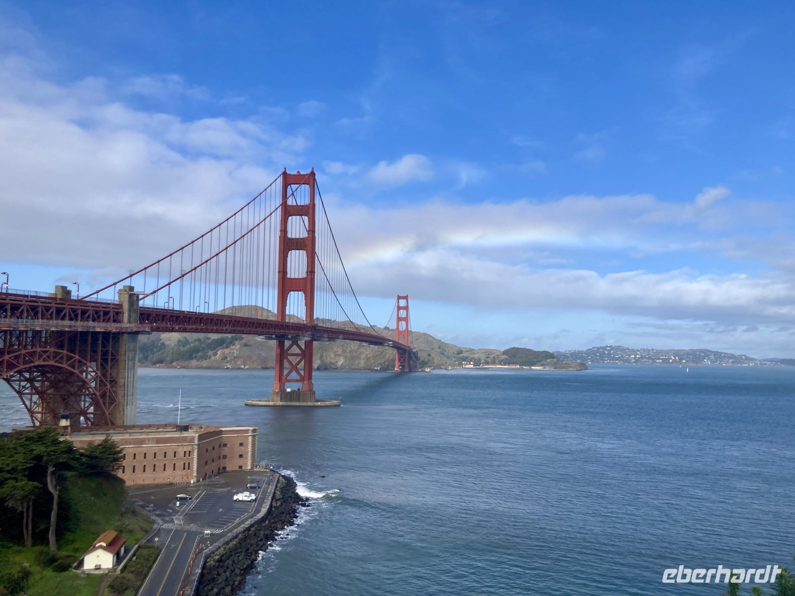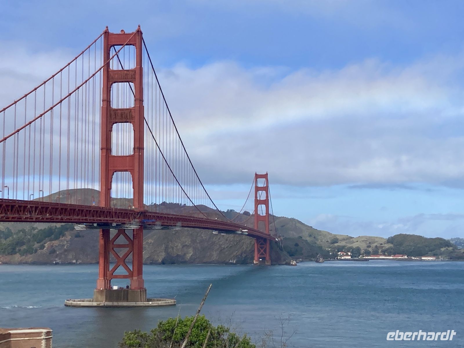 Unser nächster Halt war der malerische Alamo Square, berühmt für seine viktorianischen Häuser, liebevoll als "Painted Ladies" bekannt wegen ihrer bunten Fassaden. Von dort aus machten wir uns auf den Weg zur berühmten Golden Gate Bridge, deren Name von der Meeresenge stammt, die sie überspannt.