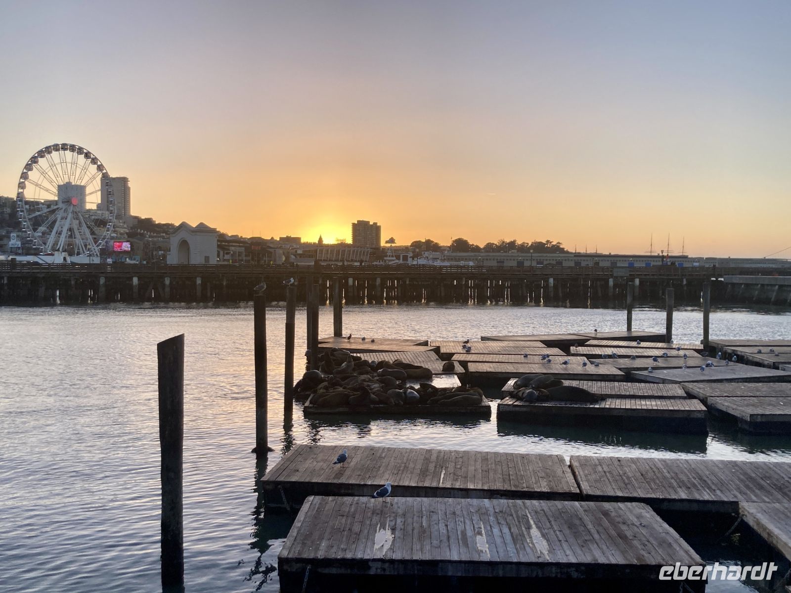 Am Pier 39 angekommen liefen wir weiter zur Cable Car Station. Wir genossen die Fahrt mit der legendären Cable Car und fuhren dann wieder zurück zum Pier 39 mit einer Straßenbahn. Wir besuchten das berühmte Bubba Gump Restaurant, das durch den Film Forrest Gump bekannt ist, und beobachteten die verspielten Seelöwen, die am Pier 39 leben.