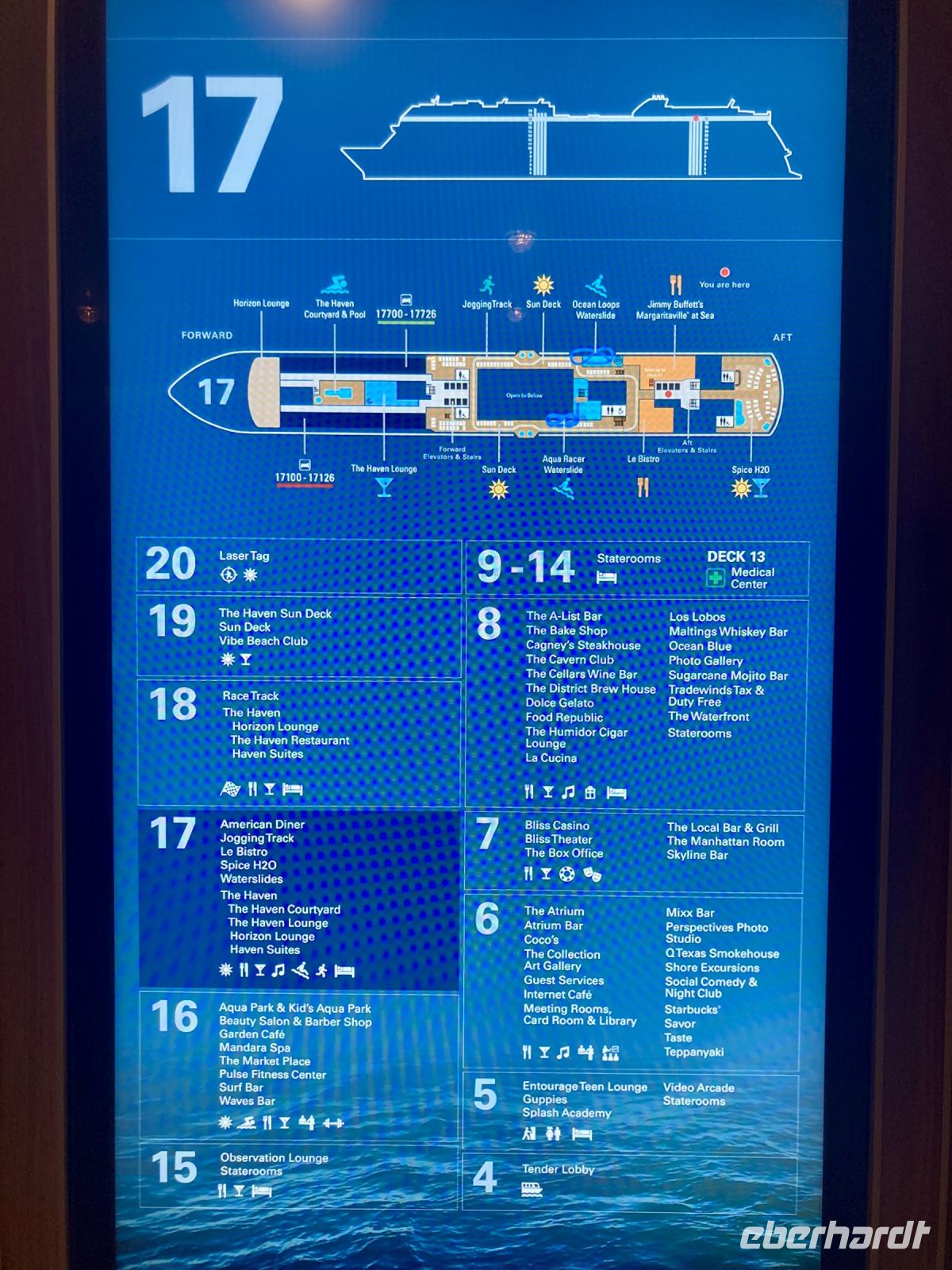 Heute war ein Seetag auf unserem Kreuzfahrtschiff, und das bedeutete, dass wir alle genügend Zeit hatten, um das Schiff zu erkunden. Nach dem Frühstück machten wir uns zunächst daran, das Schiff genauer zu erkunden, um einen Überblick über die verschiedenen Einrichtungen und Angebote zu bekommen.