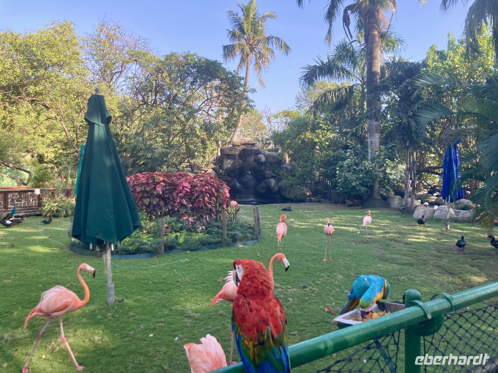 Zur Mittagszeit genossen wir ein köstliches landestypisches Mittagessen und machten uns dann auf den Weg zurück zum Schiff. Bevor wir jedoch an Bord gingen, hatten wir noch Gelegenheit, einheimische Tiere wie Papageien, Schildkröten, Flamingos und Affen in unmittelbarer Nähe des Schiffes zu beobachten.