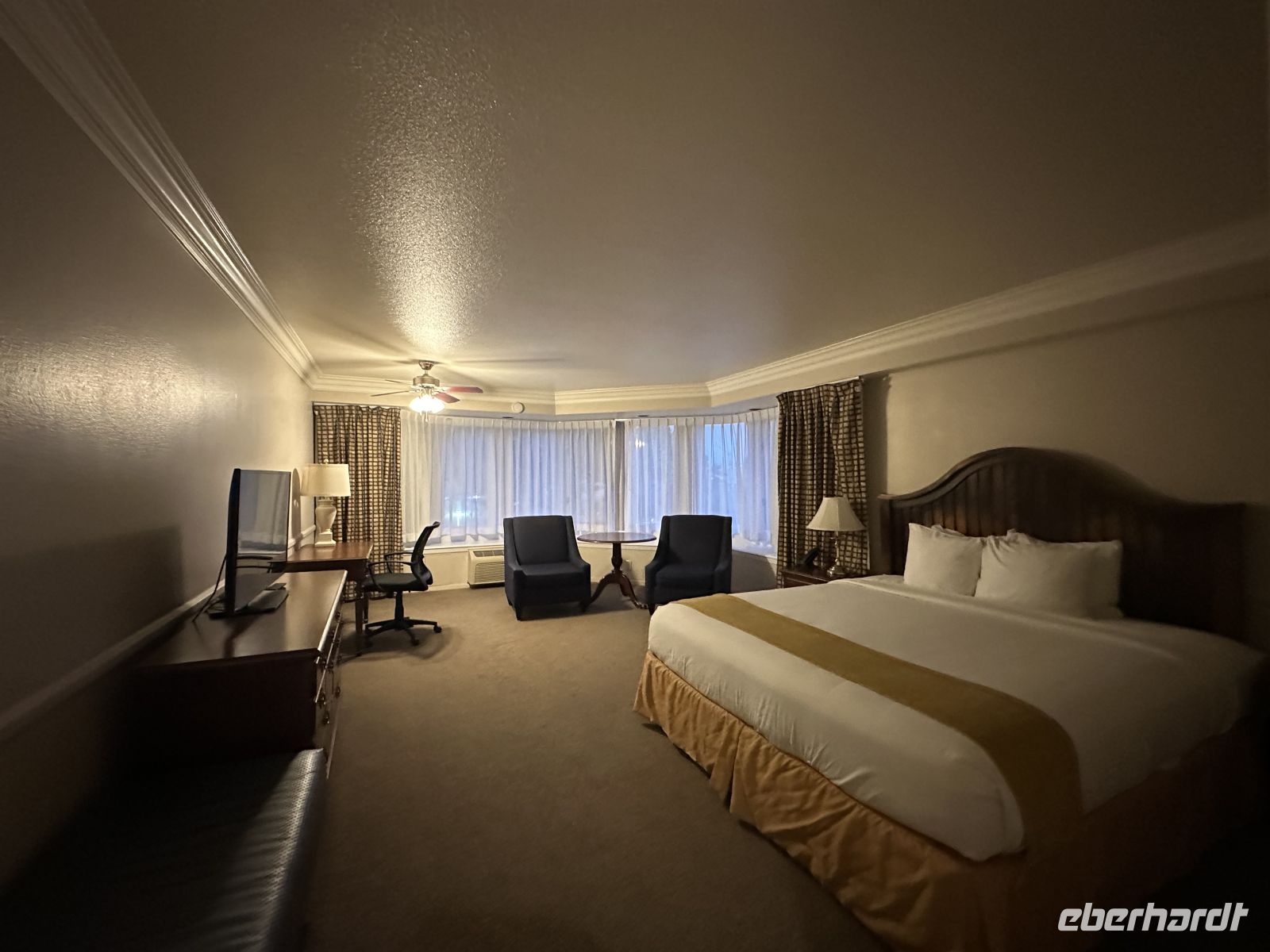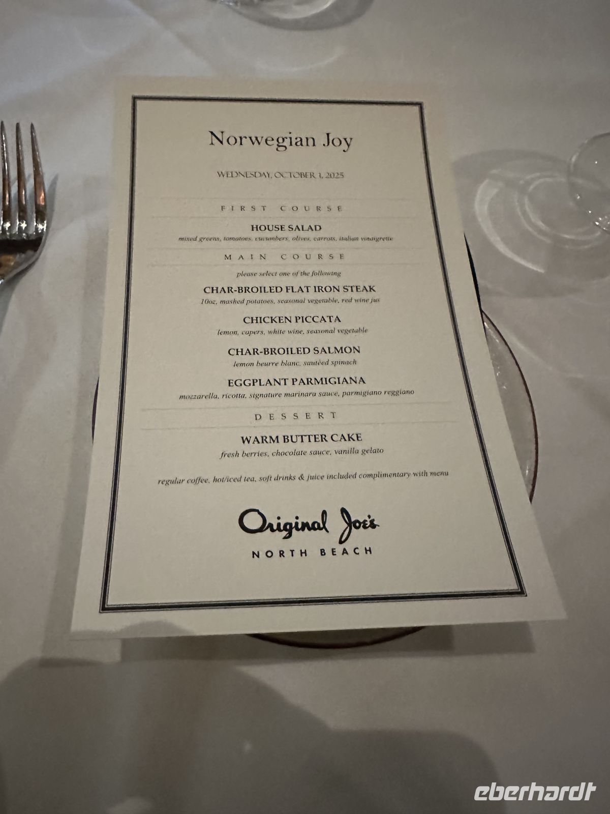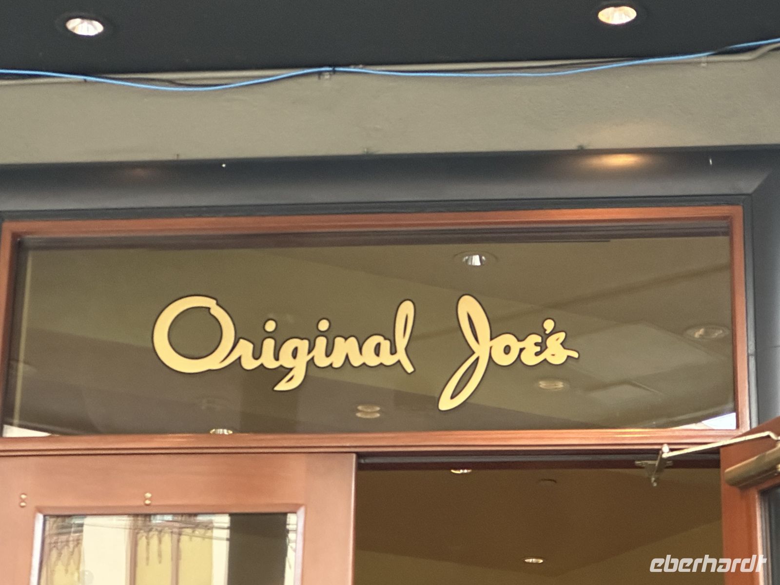 Am Ausgang erwartet uns Veronika, unsere örtliche Reiseleiterin für das Vorprogramm. Wir fahren zum Hotel, die Koffer werden in die Zimmer gebracht (selbstverständlich gegen Tipp - 1$ pro Koffer aus der Gruppenkasse) und wir haben ein Stündchen Zeit zum Ausruhen. Anschließend fahren wir zum Abendessen in das Restaurant Original Joes. Hier wurde speziell für unsere Gruppe ein Menü vorbereitet und eine individuelle Menükarte erstellt. Die Kellner sind überaus freundlich und das Essen ausgezeichnet. Wir wählen zwischen Steak und Lachs sowie einem vegetarischen Gericht. Vorher gibt es einen leckeren Salat und zum Nachtisch Kuchen mit Eis und Obst.
