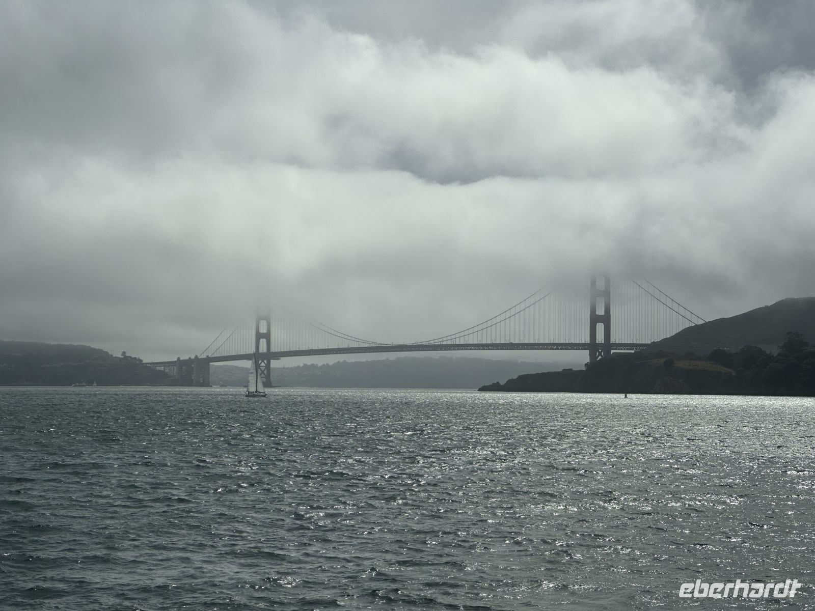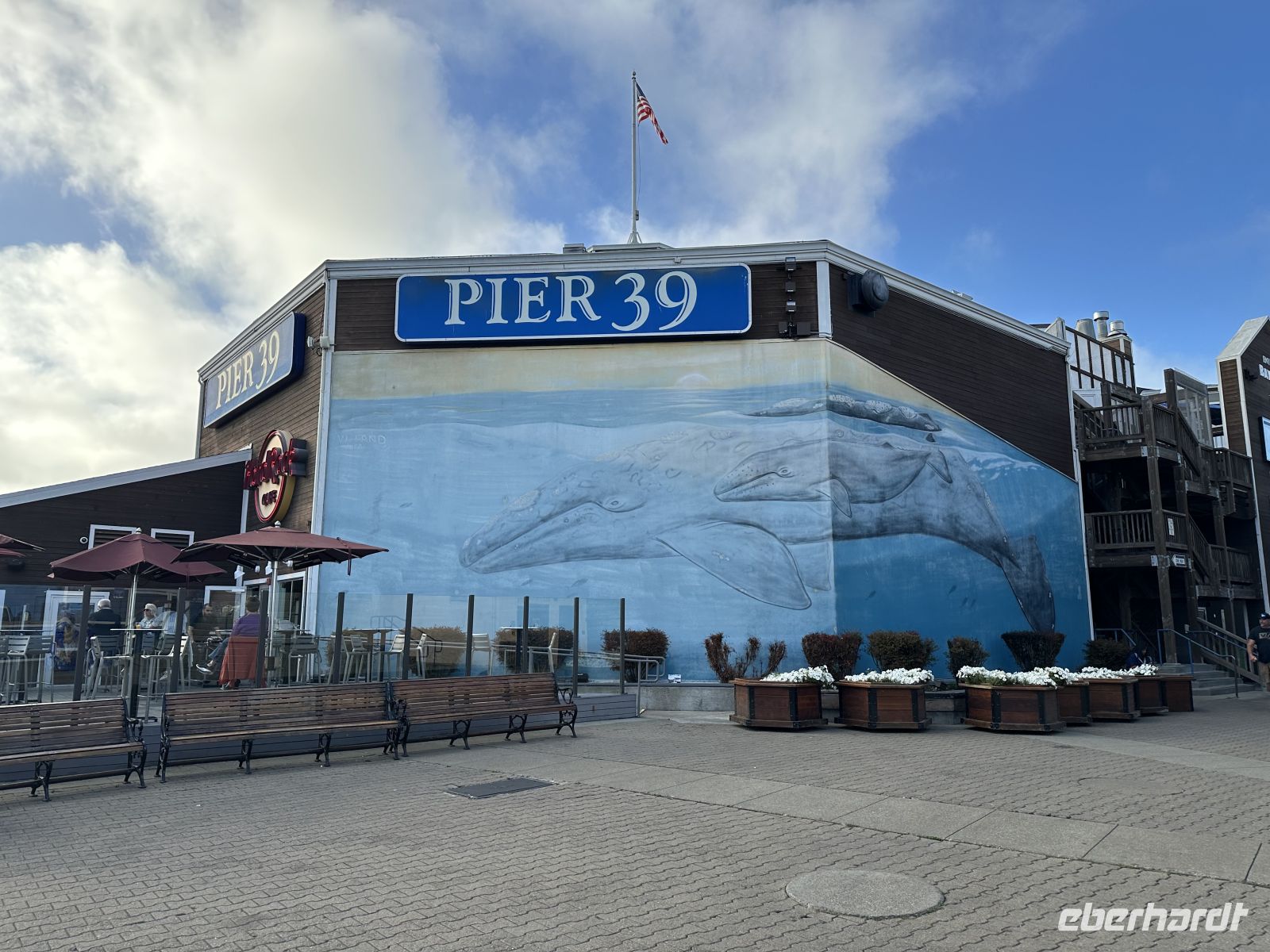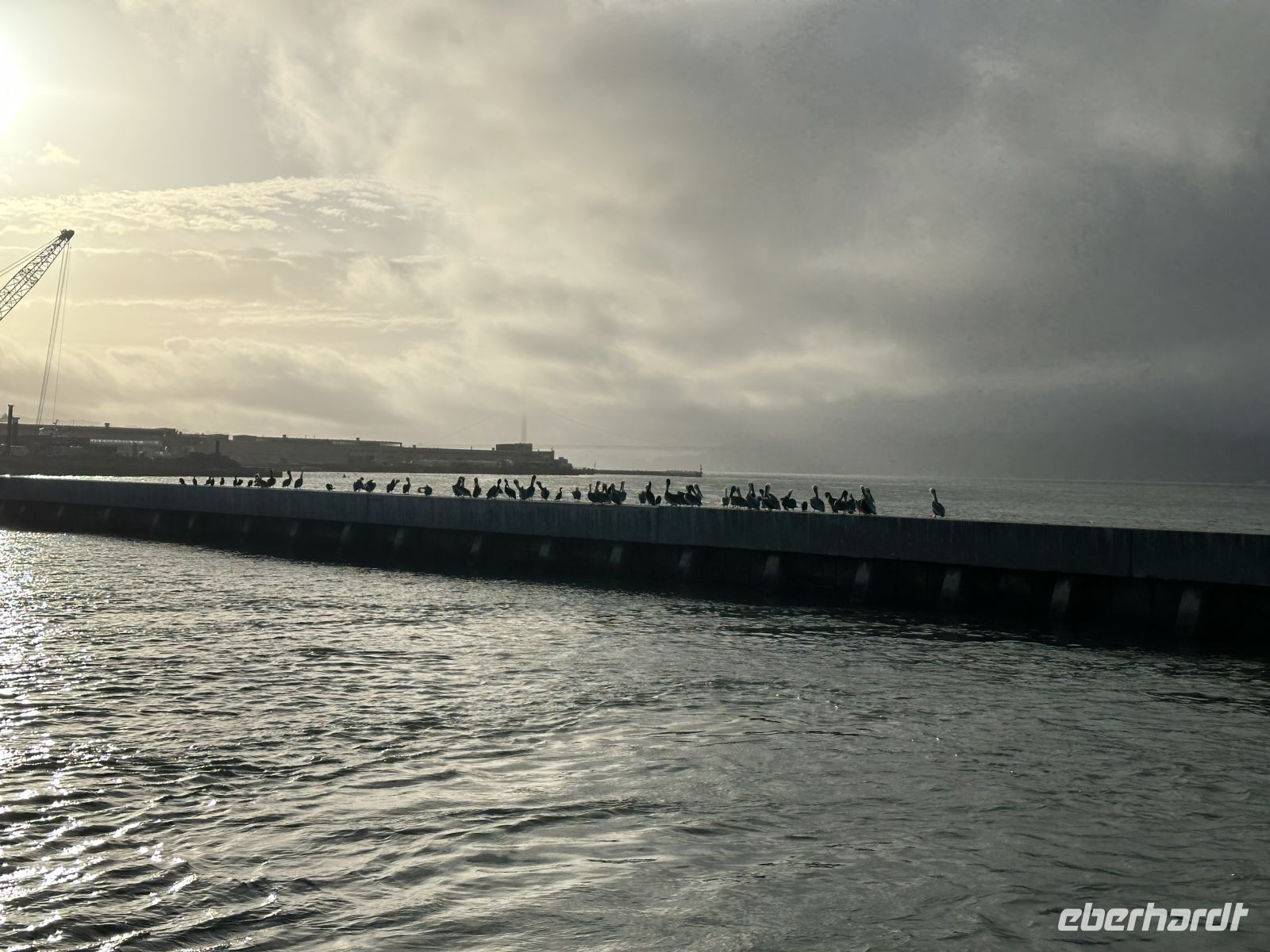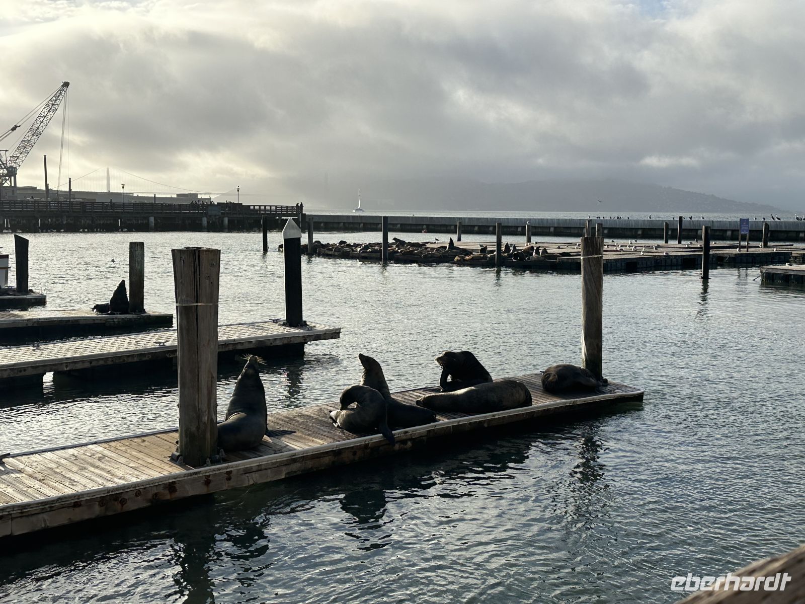 Unser nächstes Ziel sind die Painted Ladies am Alamo Square Park. Der Begriff Painted Ladies (bemalte Damen) bezeichnet ursprünglich eine Reihe von viktorianischen und edwardianischen Holzhäusern, die mit leuchtenden Farben gestrichen sind, um ihre aufwendigen architektonischen Details hervorzuheben. Diese sieben Häuser werden auch oft als die "Seven Sisters" (Sieben Schwestern) oder "Postcard Row" (Postkartenreihe) bezeichnet, da ihr Anblick mit der Skyline von San Francisco im Hintergrund ein beliebtes Postkartenmotiv ist. Die meisten dieser Häuser sind im prächtigen Queen Anne-Stil gehalten. Typische Merkmale der viktorianischen Architektur sind asymmetrische Fassaden, steil abfallende Giebeldächer, Erkerfenster und Veranden und aufwändige Verzierungen, oft als "Lebkuchenstil" (Gingerbread) bezeichnet werden. Vom Twin Peak Aussichtspunkt wollen wir den Blick auf San Francisco und die Golden Gate Bridge genießen. Doch: Pech gehabt - dicker Nebel zieht auf. Unser Busfahrer meint, wir sollten abwarten, in fünf Minuten kann es ganz anders aussehen. Und so ist es auch, der Nebel verzieht sich und gibt die Sicht frei. Wir sind voller Vorfreude während wir Richtung Golden Gate Bridge fahren. Wir wollen diese zu Fuß überqueren. Aber hier haben wir nicht so viel Glück. Eine ganze Stunde laufen wir durch dichten Nebel. Die berühmte Brücke verhüllt sich vor unseren Blicken. Dennoch lieben wir es hier entlang zu laufen. Glücklich erreichen wir das andere Ufer. Geschäftstüchtige Händler wissen längst, dass hier erschöpfte und hungrige Touristen ankommen. Die Hotdogs riechen köstlich und schmecken auch gut. Alternativ werden gesunde Obstvarianten angeboten und verputzt. Die Golden Gate Bridge ist eines der berühmtesten Wahrzeichen der Vereinigten Staaten und der Stadt San Francisco in Kalifornien und wir haben sie zu Fuß überquert. Die Golden Gate Bridge galt bei ihrer Eröffnung im Jahr 1937 siebenundzwanzig Jahre lang als die längste Hängebrücke der Welt. Sie überspannt das Golden Gate, die Meerenge am Eingang zur Bucht von San Francisco, und verbindet San Francisco im Süden mit Marin County im Norden. Ihre unverwechselbare Farbe ist ein leuchtendes, rost-oranges Rot, das offiziell „International Orange“genannt wird. Diese Farbe wurde gewählt, weil sie im häufig auftretenden Nebel von San Francisco besonders gut sichtbar ist. Die Brücke ist etwa 2.737 Meter lang, die Pylone ragen 227 Meter über das Wasser. Die Brücke verfügt über sechs Fahrspuren, es ist der US-Highway 101 und die California State Route 1 und neben uns herrscht reger Verkehr. Die Brücke ist nicht nur eine wichtige Verkehrsader, die täglich von etwa 112.000 bis 120.000 Fahrzeugen überquert wird, sondern auch eine weltberühmte Touristenattraktion und ein Symbol für technologischen Pioniergeist und die Schönheit der Bay Area. Sie ist bekannt dafür, dass sie oft in dichten Nebel gehüllt ist, was ihr eine geheimnisvolle und malerische Atmosphäre verleiht, wovon wir uns heute überzeugen konnten. Von Sausalito setzen wir mit der Fähre zum Fishermans Wharf über. In der Nähe befindet sich die Zustiegstelle für die Cable Car. Die Wartezeit für uns soll vierzig Minuten betragen. Währenddessen beobachten wir, wie die ankommenden Bahnen von stämmigen Männern per Hand gedreht werden, um aus der richtigen Position wieder weiter zu fahren. Irgendwann sind wir endlich dran und können in eine Bahn einsteigen. Einige von uns haben die Chance, Außen zu stehen. Diese Plätze sind sehr beliebt, weil sie einen Hauch von Abenteuer und Nostalgie versprühen. Unsere Bahn rauscht die steilen Straßen rauf und runter. Der Bahnführer ruft die jeweilige Haltestelle laut aus und weist auf Sehenswertes hin. Am Union Square ruft Evelyn laut: „Aussteigen!“ - den Ruf übernimmt unser Bahnführer mit Vergnügen und wiederholt mehrmals laut und amüsiert „Aussteigen! Aussteigen!“. Er hat die Lacher auf seiner Seite. Die Cable Cars sind das älteste und bekannteste historische Verkehrsmittel der Stadt. Insgesamt wurden über 23 Linien und mehr als 80 Kilometer Schienen verlegt. Die Cable Cars überstanden sowohl das verheerende Erdbeben von 1906 als auch den Aufstieg der effizienteren elektrischen Straßenbahnen, da sie für die steilen Hügel San Franciscos unverzichtbar blieben. Seit 1964 sind die Cable Cars in ihrer heutigen Form ein Nationaldenkmal der Vereinigten Staaten. Nachdem wir ausgestiegen sind, erreichen wir nach ein paar Häuserblocks zu Fuß unser Hotel, wo uns ein paar Minuten zum Frisch machen bleiben. Und schon geht es weiter zum Pier 39. Vor dem Abendessen bleibt noch etwas Zeit, um durch die Läden zu bummeln und Souvenirs einzukaufen. Alternativ können wir die Seelöwen beobachten, die sich hier niedergelassen haben.