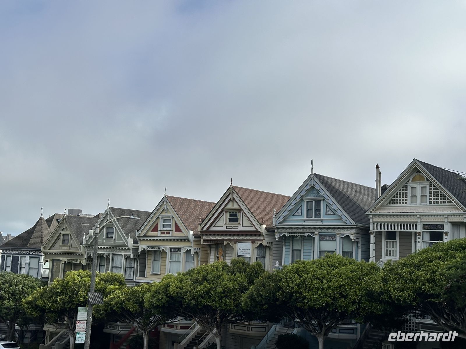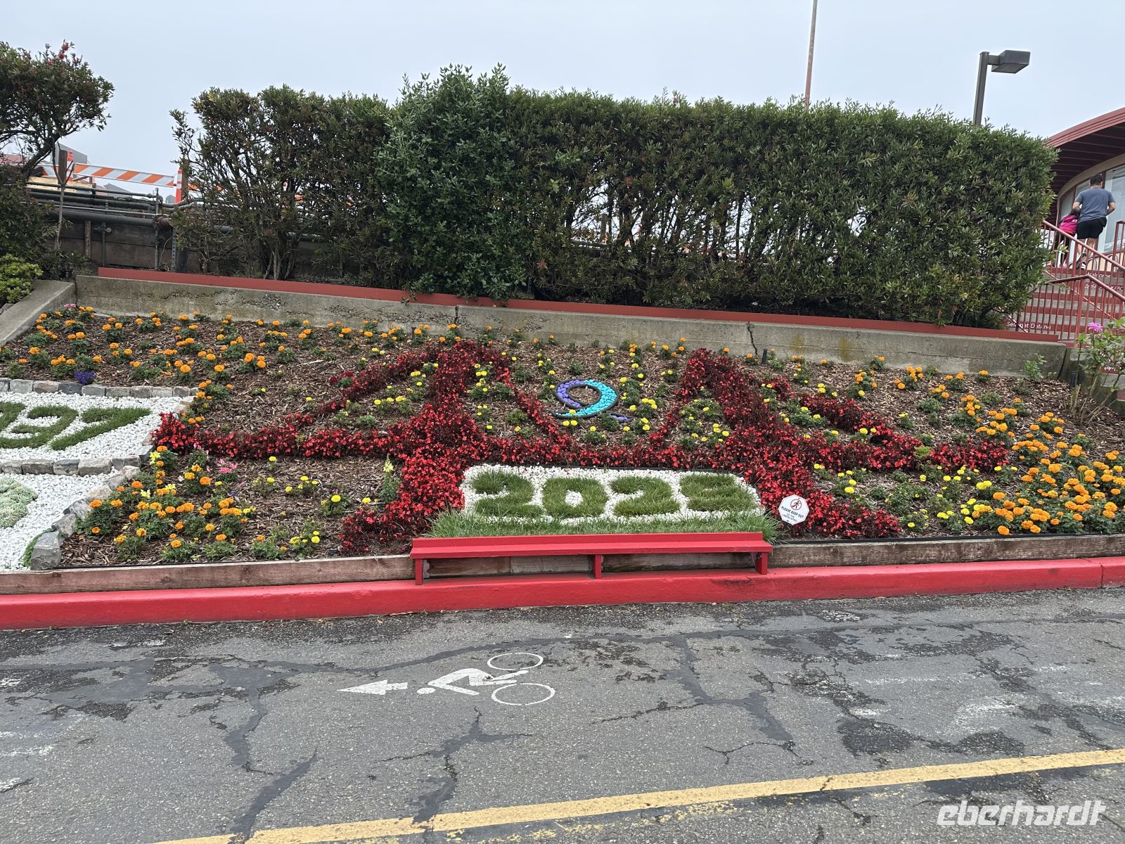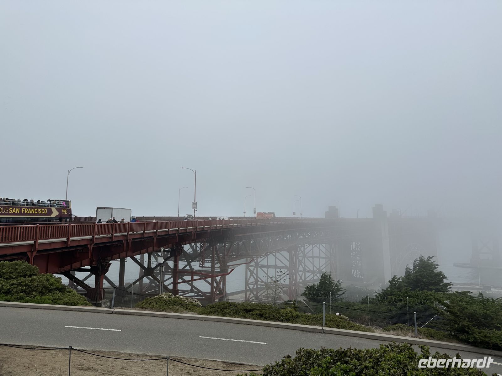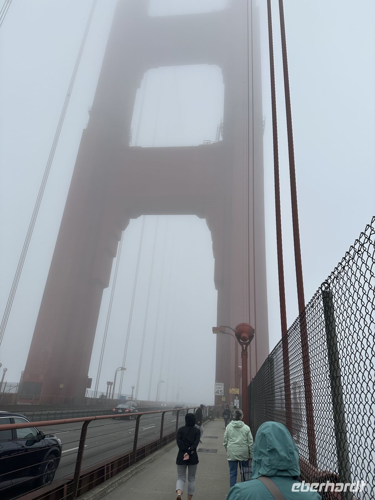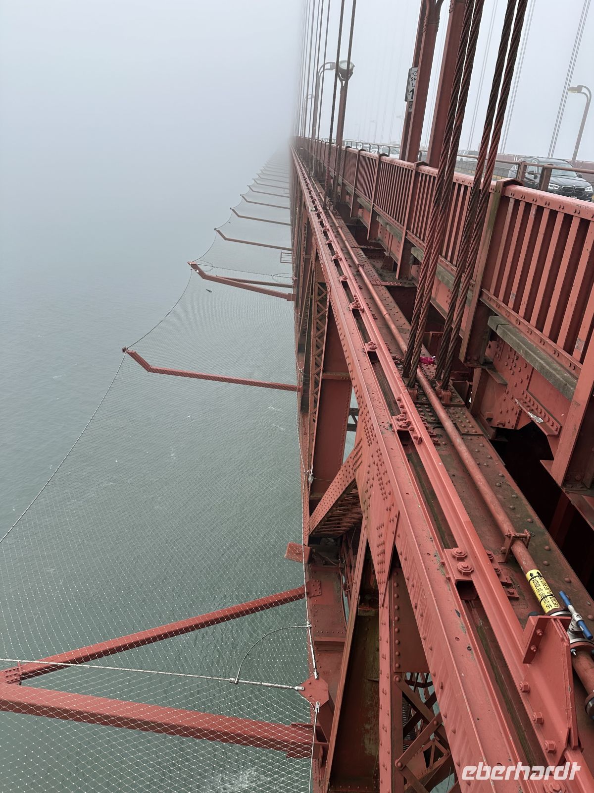 Unser nächstes Ziel sind die Painted Ladies am Alamo Square Park. Der Begriff Painted Ladies (bemalte Damen) bezeichnet ursprünglich eine Reihe von viktorianischen und edwardianischen Holzhäusern, die mit leuchtenden Farben gestrichen sind, um ihre aufwendigen architektonischen Details hervorzuheben. Diese sieben Häuser werden auch oft als die "Seven Sisters" (Sieben Schwestern) oder "Postcard Row" (Postkartenreihe) bezeichnet, da ihr Anblick mit der Skyline von San Francisco im Hintergrund ein beliebtes Postkartenmotiv ist. Die meisten dieser Häuser sind im prächtigen Queen Anne-Stil gehalten. Typische Merkmale der viktorianischen Architektur sind asymmetrische Fassaden, steil abfallende Giebeldächer, Erkerfenster und Veranden und aufwändige Verzierungen, oft als "Lebkuchenstil" (Gingerbread) bezeichnet werden. Vom Twin Peak Aussichtspunkt wollen wir den Blick auf San Francisco und die Golden Gate Bridge genießen. Doch: Pech gehabt - dicker Nebel zieht auf. Unser Busfahrer meint, wir sollten abwarten, in fünf Minuten kann es ganz anders aussehen. Und so ist es auch, der Nebel verzieht sich und gibt die Sicht frei. Wir sind voller Vorfreude während wir Richtung Golden Gate Bridge fahren. Wir wollen diese zu Fuß überqueren. Aber hier haben wir nicht so viel Glück. Eine ganze Stunde laufen wir durch dichten Nebel. Die berühmte Brücke verhüllt sich vor unseren Blicken. Dennoch lieben wir es hier entlang zu laufen. Glücklich erreichen wir das andere Ufer. Geschäftstüchtige Händler wissen längst, dass hier erschöpfte und hungrige Touristen ankommen. Die Hotdogs riechen köstlich und schmecken auch gut. Alternativ werden gesunde Obstvarianten angeboten und verputzt. Die Golden Gate Bridge ist eines der berühmtesten Wahrzeichen der Vereinigten Staaten und der Stadt San Francisco in Kalifornien und wir haben sie zu Fuß überquert. Die Golden Gate Bridge galt bei ihrer Eröffnung im Jahr 1937 siebenundzwanzig Jahre lang als die längste Hängebrücke der Welt. Sie überspannt das Golden Gate, die Meerenge am Eingang zur Bucht von San Francisco, und verbindet San Francisco im Süden mit Marin County im Norden. Ihre unverwechselbare Farbe ist ein leuchtendes, rost-oranges Rot, das offiziell „International Orange“genannt wird. Diese Farbe wurde gewählt, weil sie im häufig auftretenden Nebel von San Francisco besonders gut sichtbar ist. Die Brücke ist etwa 2.737 Meter lang, die Pylone ragen 227 Meter über das Wasser. Die Brücke verfügt über sechs Fahrspuren, es ist der US-Highway 101 und die California State Route 1 und neben uns herrscht reger Verkehr. Die Brücke ist nicht nur eine wichtige Verkehrsader, die täglich von etwa 112.000 bis 120.000 Fahrzeugen überquert wird, sondern auch eine weltberühmte Touristenattraktion und ein Symbol für technologischen Pioniergeist und die Schönheit der Bay Area. Sie ist bekannt dafür, dass sie oft in dichten Nebel gehüllt ist, was ihr eine geheimnisvolle und malerische Atmosphäre verleiht, wovon wir uns heute überzeugen konnten. Von Sausalito setzen wir mit der Fähre zum Fishermans Wharf über. In der Nähe befindet sich die Zustiegstelle für die Cable Car. Die Wartezeit für uns soll vierzig Minuten betragen. Währenddessen beobachten wir, wie die ankommenden Bahnen von stämmigen Männern per Hand gedreht werden, um aus der richtigen Position wieder weiter zu fahren. Irgendwann sind wir endlich dran und können in eine Bahn einsteigen. Einige von uns haben die Chance, Außen zu stehen. Diese Plätze sind sehr beliebt, weil sie einen Hauch von Abenteuer und Nostalgie versprühen. Unsere Bahn rauscht die steilen Straßen rauf und runter. Der Bahnführer ruft die jeweilige Haltestelle laut aus und weist auf Sehenswertes hin. Am Union Square ruft Evelyn laut: „Aussteigen!“ - den Ruf übernimmt unser Bahnführer mit Vergnügen und wiederholt mehrmals laut und amüsiert „Aussteigen! Aussteigen!“. Er hat die Lacher auf seiner Seite. Die Cable Cars sind das älteste und bekannteste historische Verkehrsmittel der Stadt. Insgesamt wurden über 23 Linien und mehr als 80 Kilometer Schienen verlegt. Die Cable Cars überstanden sowohl das verheerende Erdbeben von 1906 als auch den Aufstieg der effizienteren elektrischen Straßenbahnen, da sie für die steilen Hügel San Franciscos unverzichtbar blieben. Seit 1964 sind die Cable Cars in ihrer heutigen Form ein Nationaldenkmal der Vereinigten Staaten. Nachdem wir ausgestiegen sind, erreichen wir nach ein paar Häuserblocks zu Fuß unser Hotel, wo uns ein paar Minuten zum Frisch machen bleiben. Und schon geht es weiter zum Pier 39. Vor dem Abendessen bleibt noch etwas Zeit, um durch die Läden zu bummeln und Souvenirs einzukaufen. Alternativ können wir die Seelöwen beobachten, die sich hier niedergelassen haben.