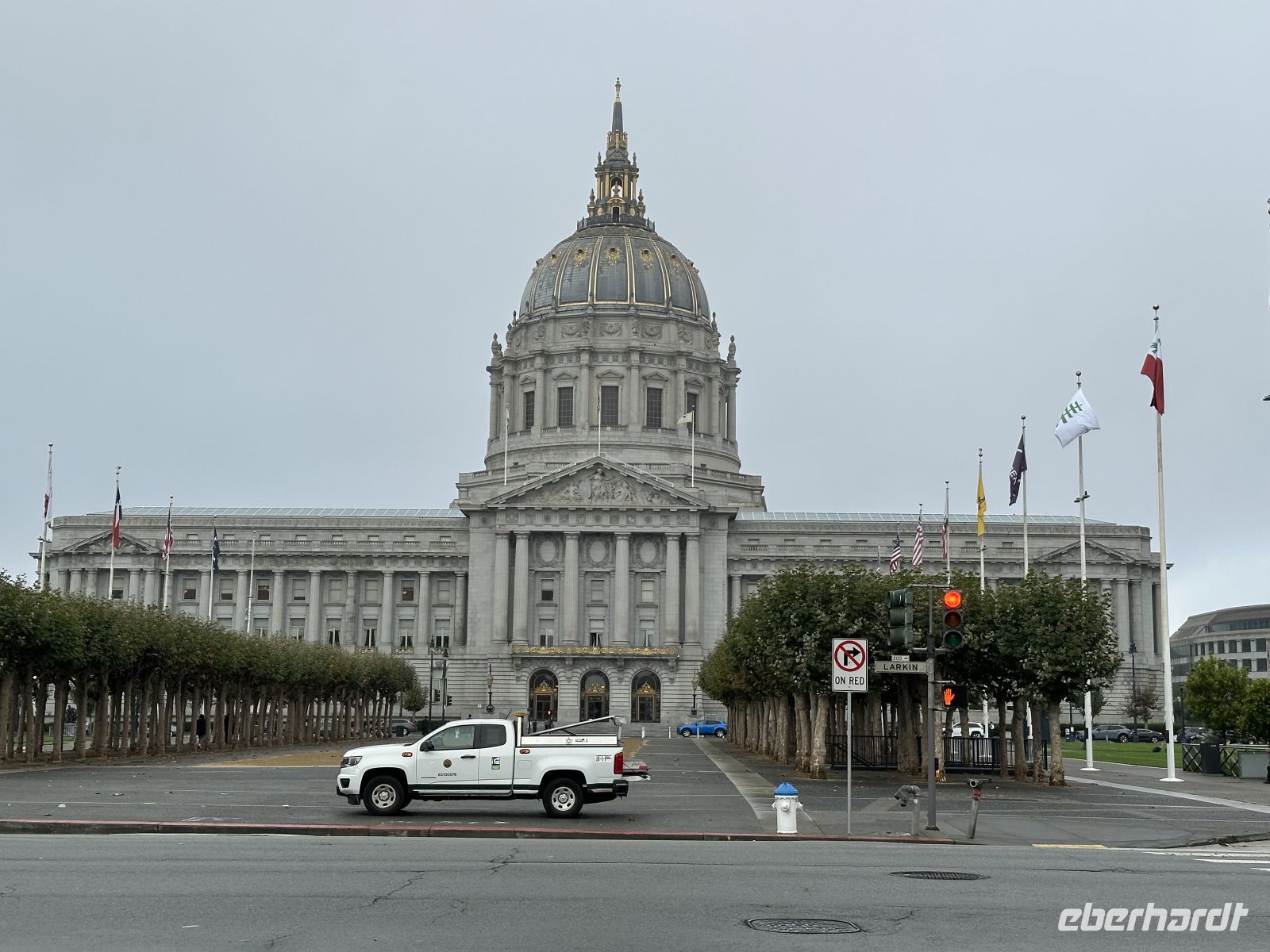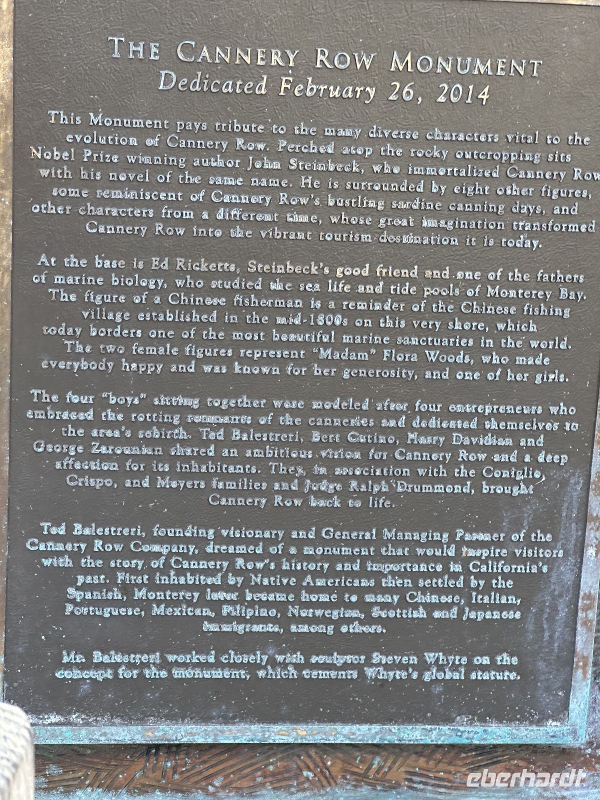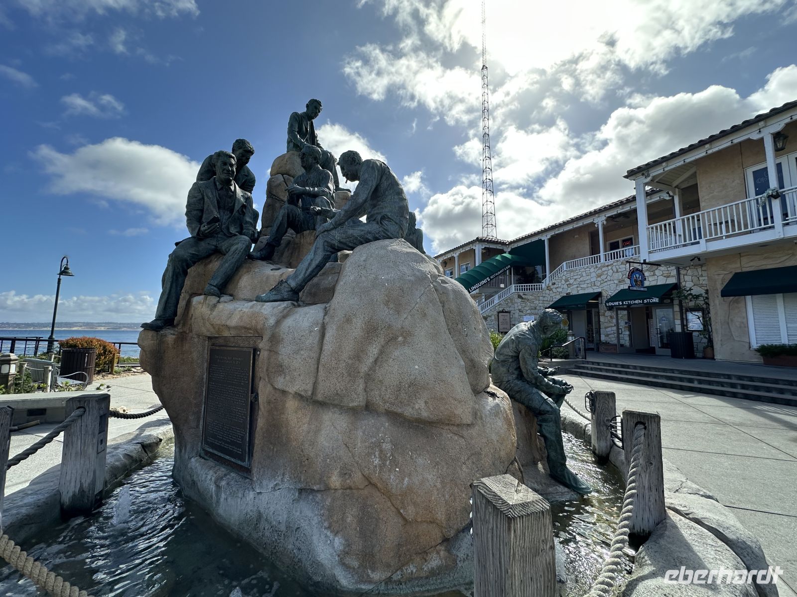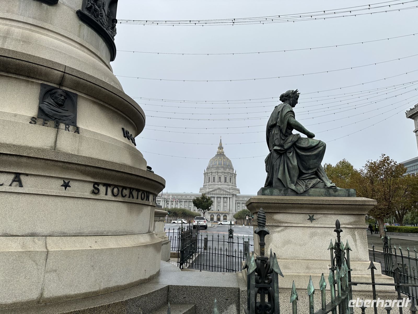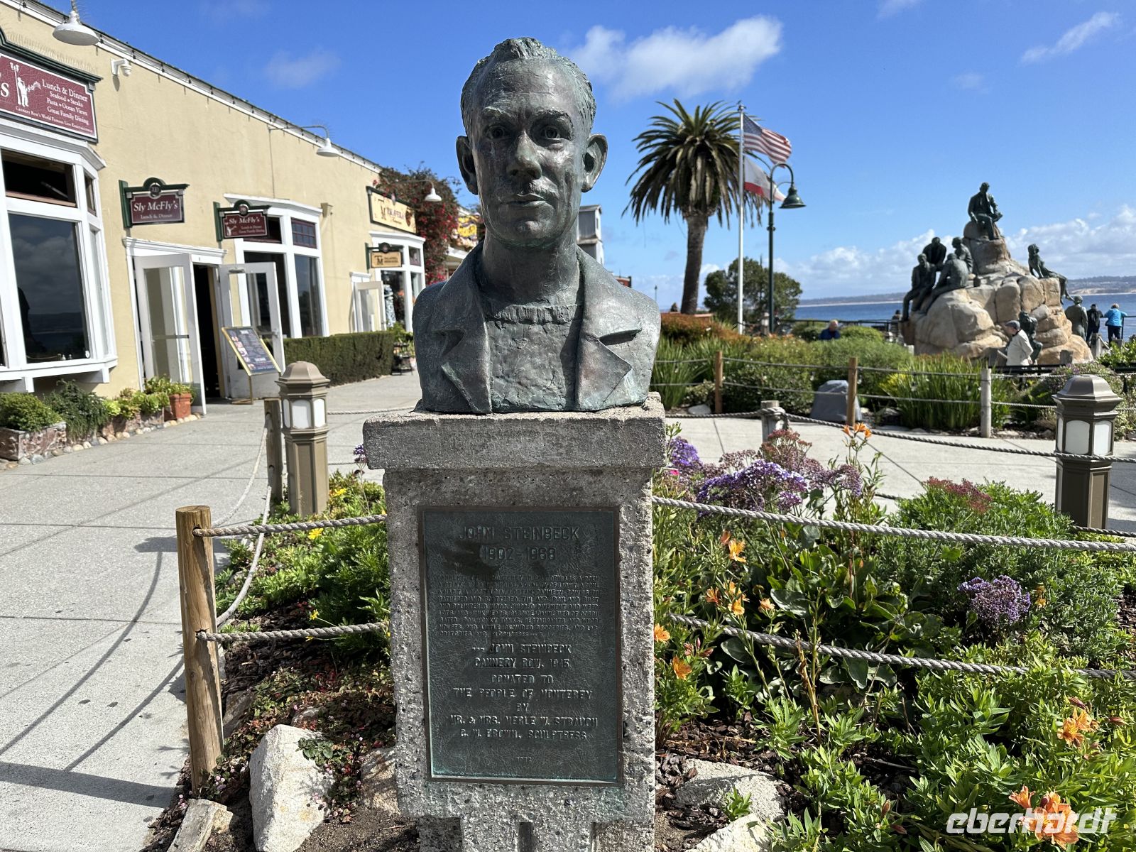 Den ersten Fotostopp unserer Stadtrundfahrt legen wir am Rathaus ein. Dieses Gebäude erinnert an europäische Prachtbauten. Sein unbestrittenes Highlight ist die gigantische goldene Kuppel. Sie ist von so beeindruckender Größe und Höhe, dass sie sogar das Kapitol in Washington D.C. überragt. Der goldglänzende Bau thront majestätisch über dem Civic Center Plaza und ist ein tolles Fotomotiv. Ganz in der Nähe befindet sich auch das Cannery Row Monument, was wir uns zuerst anschauen. Das Monument zeigt neun Bronzefiguren, die wichtige historische und fiktive Charaktere darstellen. Außerdem gibt es Figuren, die einen chinesischen Fischer und Konservenfabrikarbeiter darstellen. Sie würdigen die vielen Menschen aus verschiedenen Kulturen, die in der Sardinenindustrie arbeiteten, bevor diese zusammenbrach. Eine Gruppe von vier Bronzefiguren, die wie Kartenspieler oder Herumtreiber dargestellt sind eine Anspielung auf die "freundlichen Faulenzer" aus Steinbecks Roman. Zusätzlich zu den neun Hauptfiguren sind 13 bronzene Frösche im Sockel versteckt, eine weitere Anspielung auf eine Anekdote aus Steinbecks Roman. Wir kehren zurück zum Bus und setzen unsere Stadtbesichtigung fort.