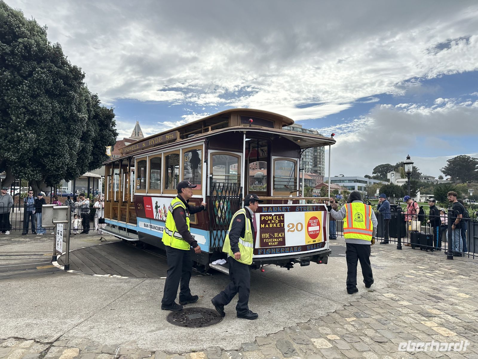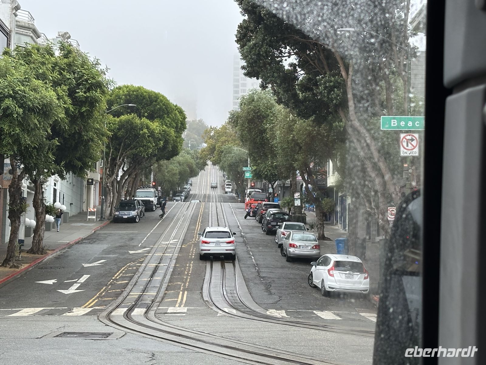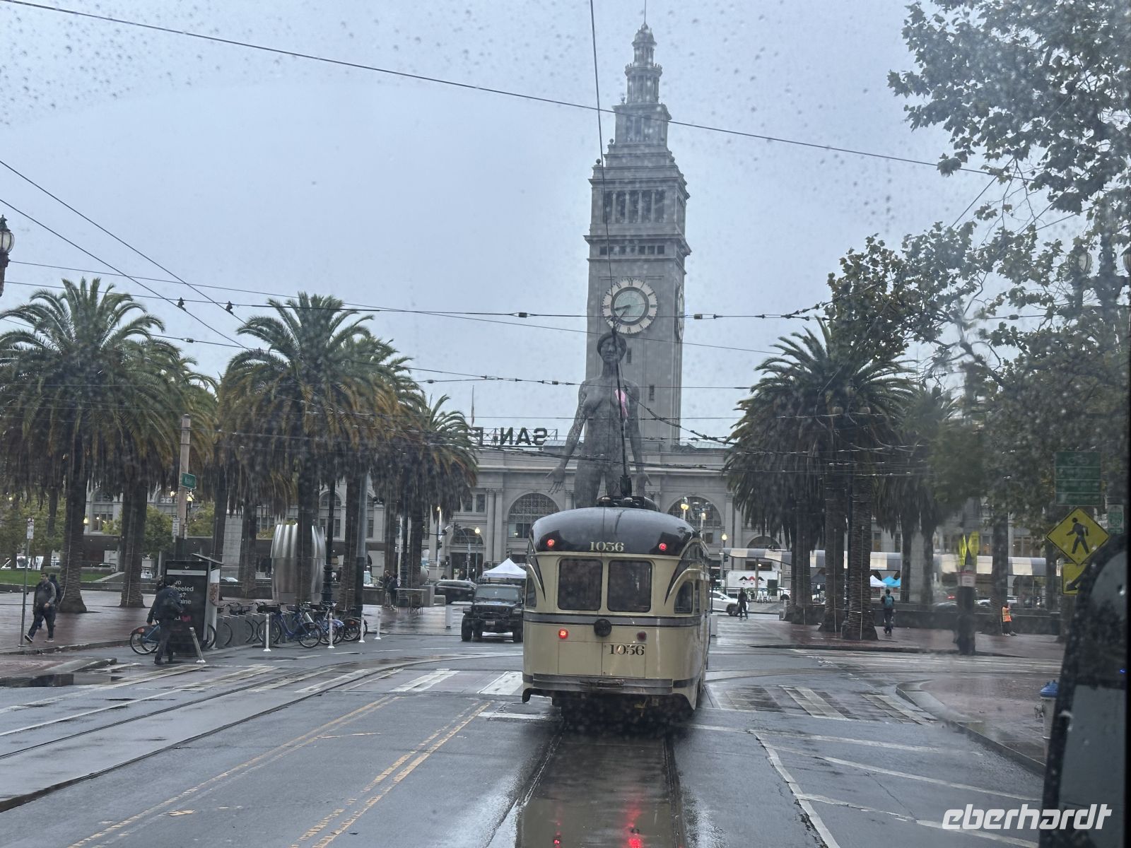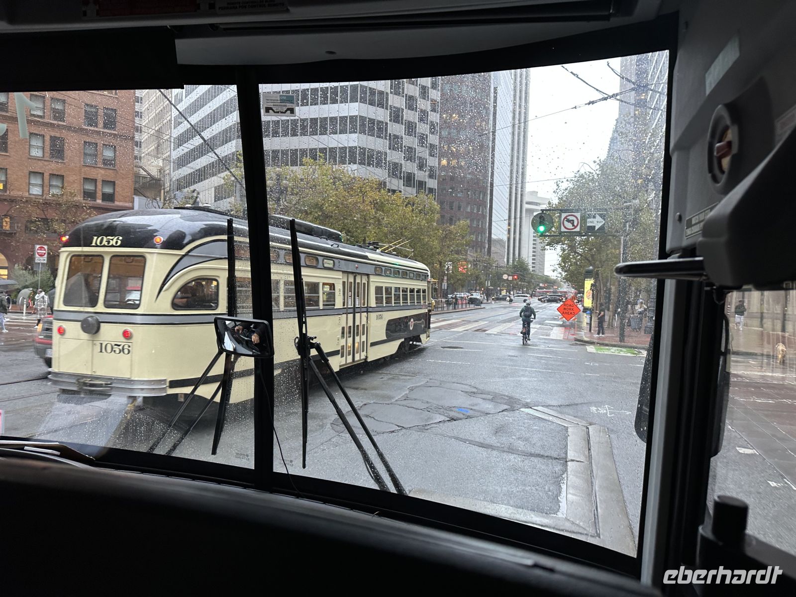 Heute sind wir den ganzen Tag in San Francisco unterwegs. Direkt neben unserem Bus fährt eine historische Straßenbahn, warum das so ist, erzählt uns Evelyn. Der Plan für eine historische Straßenbahnlinie auf der Market Street wurde bereits in den 1970er Jahren diskutiert. Die Idee wurde durch die „Trolley Festivals“ (Straßenbahn-Festivals) zum Leben erweckt, die von 1983 bis 1987 auf der Market Street stattfanden, um während der Sanierung des Cable Car Systems eine historische Nahverkehrsalternative zu bieten. Zu diesem Zweck wurden historische Straßenbahnen aus San Francisco, anderen US-Städten und dem Ausland (z. B. aus Hamburg oder Mailand) eingesetzt. Der Erfolg dieser Festivals führte zum Beschluss, einen permanenten historischen Straßenbahnbetrieb einzurichten. Die F-Linie wurde am 1. September 1995 als ganzjähriger Dienst eröffnet. Die F Market & Wharves Linie ist einzigartig, da sie fast ausschließlich historische Triebwagen aus der Zeit vor 1960 verwendet. Die Flotte besteht hauptsächlich aus Straßenbahnen, die in den Farben von Städten bemalt sind, in denen dieser Wagentyp einst fuhr, sowie aus historischen Straßenbahnen aus aller Welt (z. B. Mailänder Triebwagen von 1928). Sie dient somit als ein „Fahrendes Museum“.