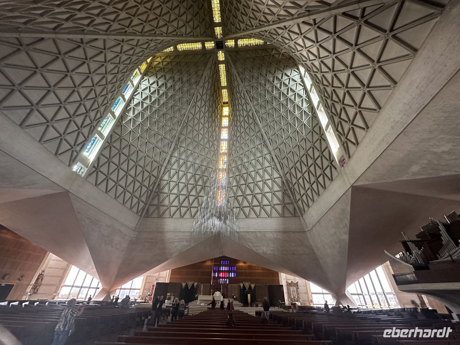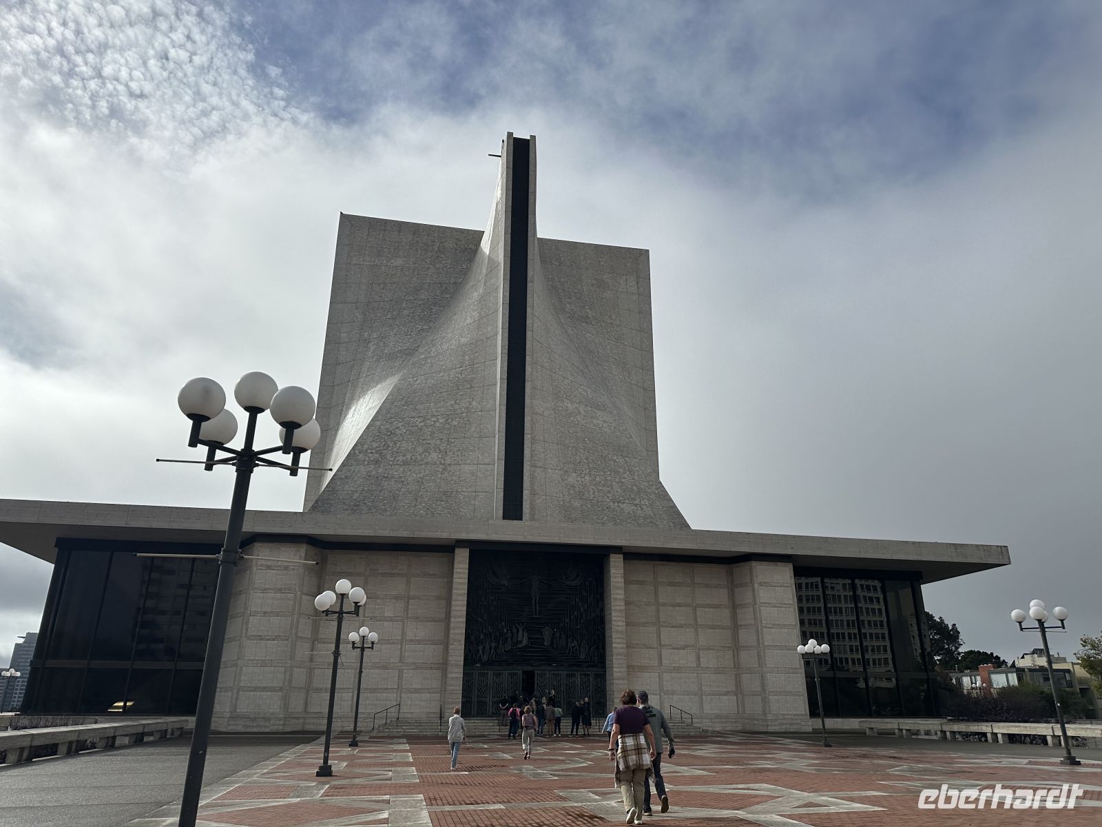 Als nächstes besuchen wir die Kathedrale Maria Himmelfahrt. Die Cathedral of St. Mary of the Assumption ist ein architektonisches Highlight in San Francisco. Sie ist eine moderne Kirche, die aussieht, als würde sie dem Himmel entgegenstreben. Das Dach besteht aus geschwungenen Betonflächen, die sich oben kreuzförmig treffen – ein Kunstwerk der Ingenieurskunst. Innen ist die Kirche lichtdurchflutet und beeindruckend groß. Die riesigen Fenster an den Ecken bieten dabei einen tollen Blick auf die Stadt. Sie ist definitiv ein ungewöhnlicher und unvergesslicher Anblick.