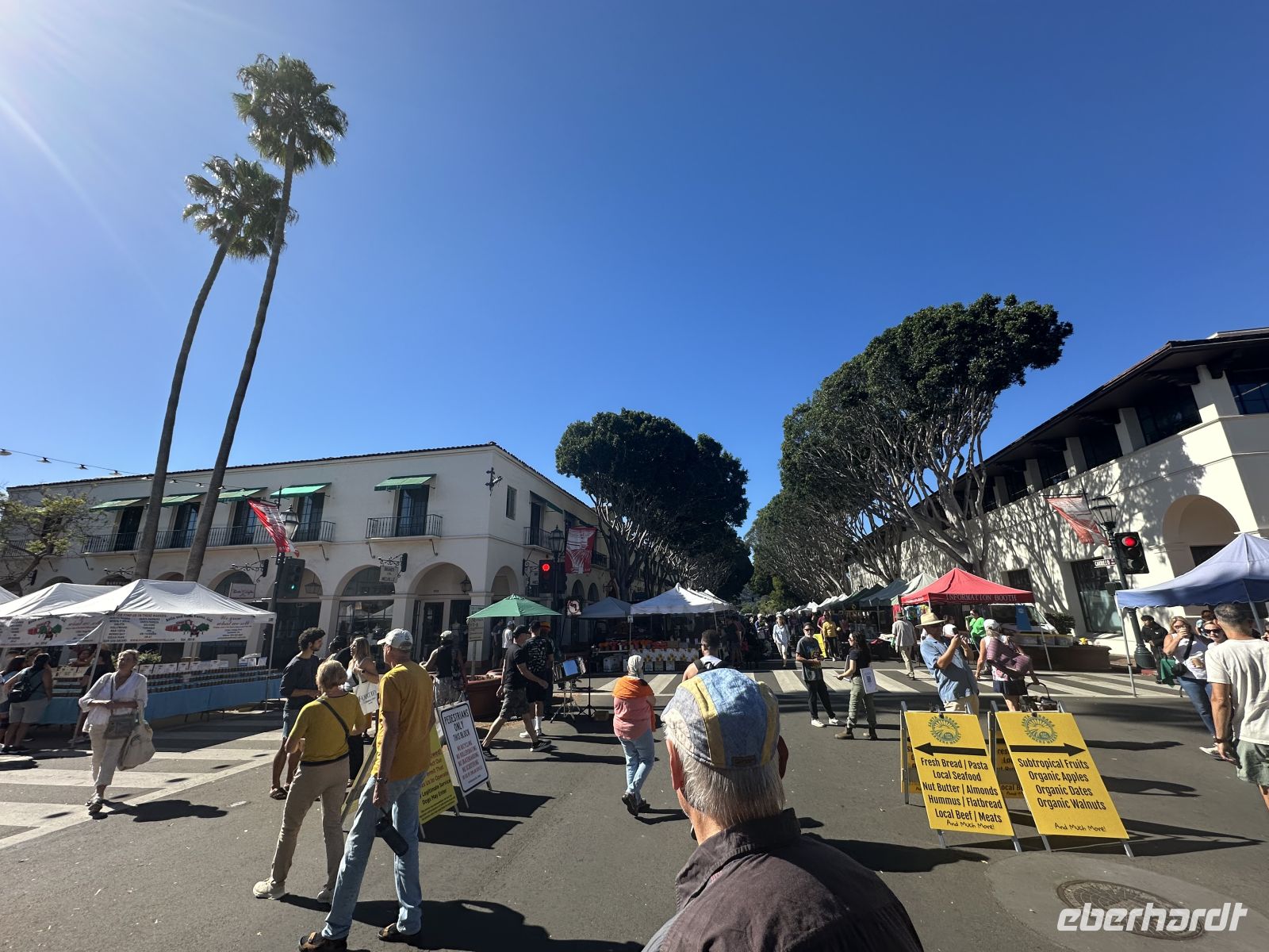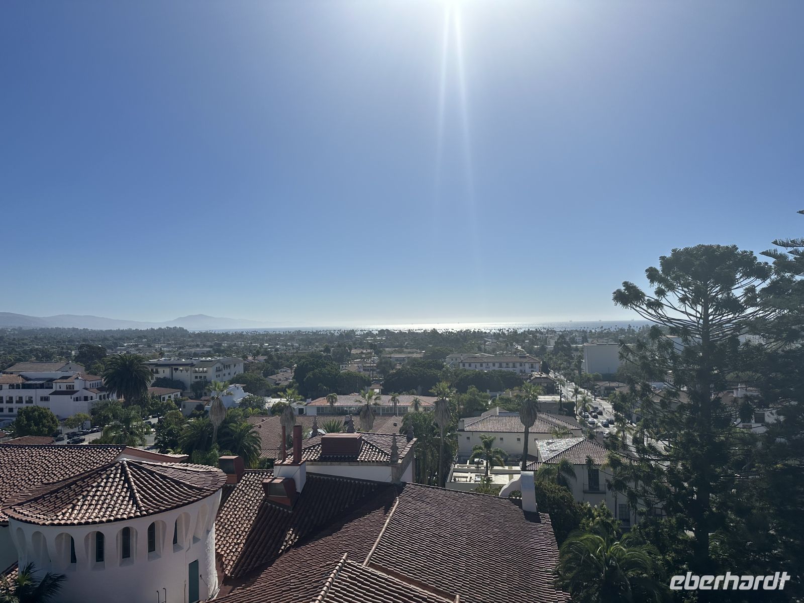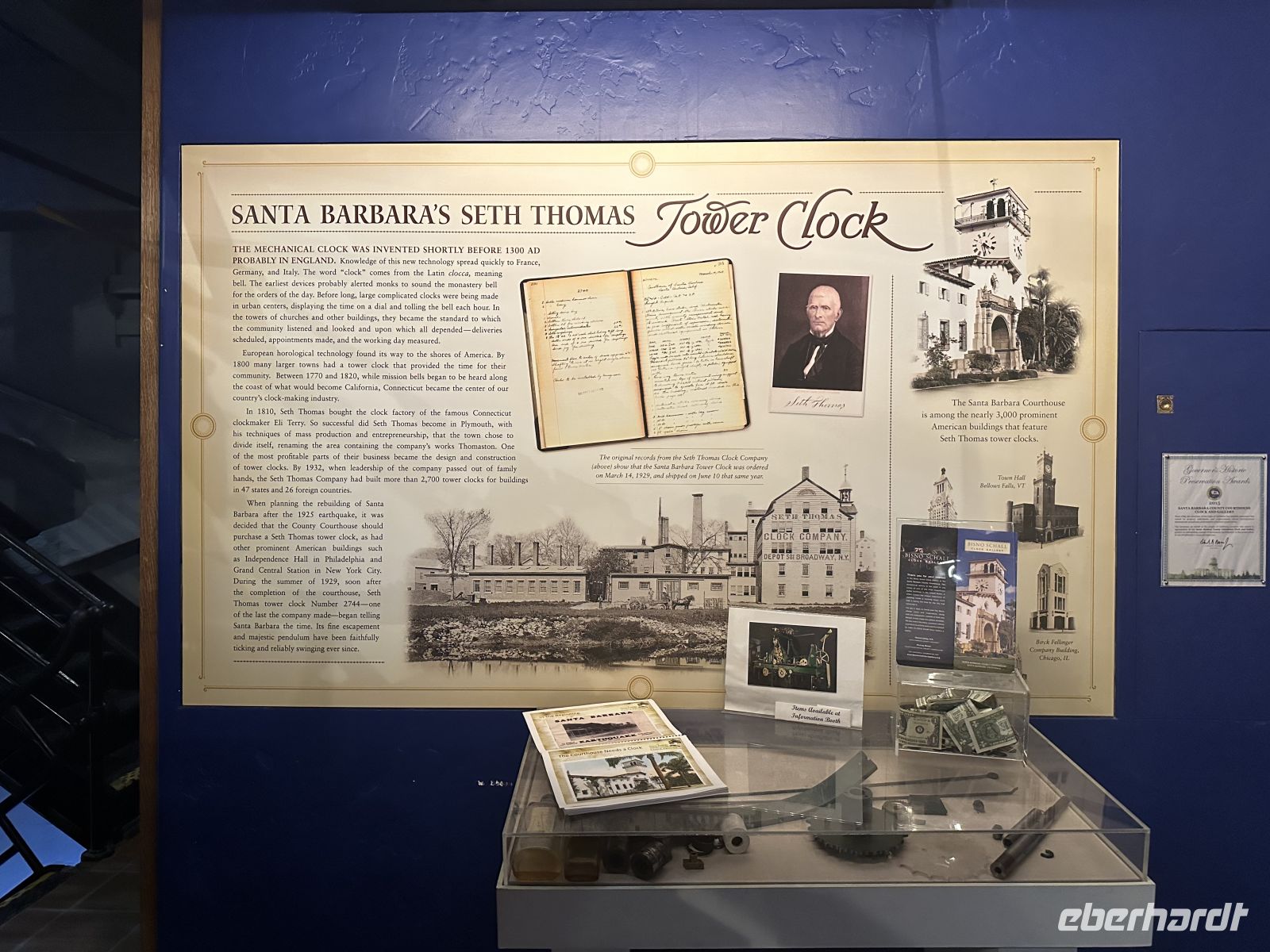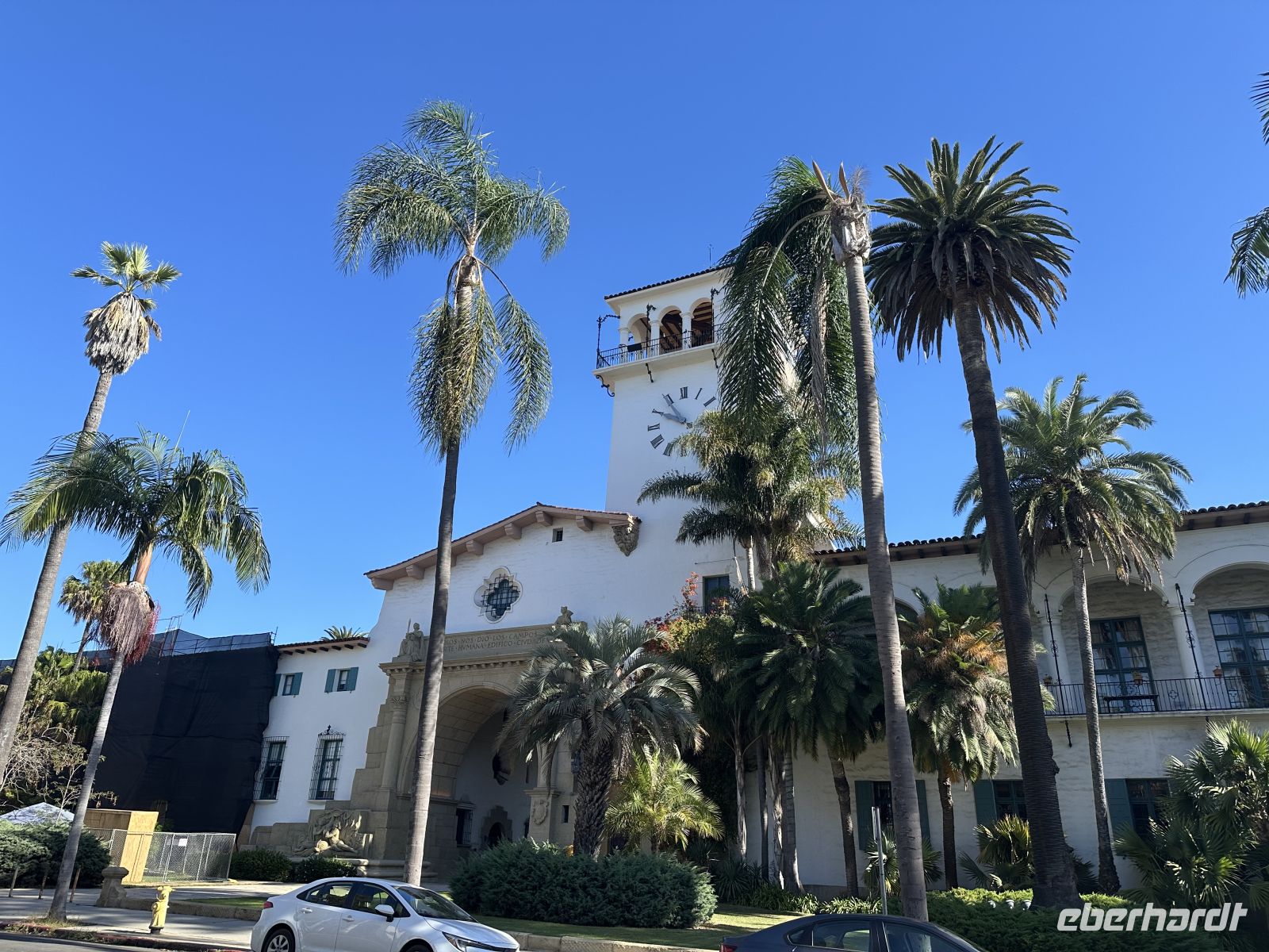 Unser nächstes Ziel ist das Gerichtsgebäude des Santa Barbara County. Das Gerichtsgebäude ist ein Wahrzeichen der Stadt und gilt als eines der schönsten öffentlichen Gebäude der USA. Es wurde nach dem Erdbeben von 1925 fertiggestellt. Der Turm ist etwa 26 Meter hoch und wird als "El Mirador" bezeichnet, was so viel wie "Aussichtspunkt" bedeutet. Von hier aus haben wir eine unglaubliche 360-Grad-Panoramaaussicht auf Santa Barbara, die Küste und die umliegenden Santa Ynez Gebirge sowie die Kanalinseln. Im Turm befindet sich eine historische Turmuhr, ein seltenes Model 18 der Seth Thomas Company, die seit 1929 in Betrieb ist. Hier erwartet uns ein freundlicher Herr, der uns die Besonderheiten dieser historischen Turmuhr erläutert. Er erklärt uns die Mechanismen des riesigen Uhrwerks, welches wir aus nächster Nähe besichtigen können. Die Galerie zeigt auch ein großes Wandgemälde, das die Geschichte der Zeitmessung darstellt. Nun haben wir Zeit, Santa Barbara auf eigene Faust zu erkunden. Wir schlendern über den Markt, der sich über mehrere Straßen erstreckt und finden das eine oder andere Mitbringsel. Wir setzen unsere Fahrt fort und erreichen Malibu. Noch immer erinnern stumme Zeugen an den großen Brand. In Santa Monica verweilen wir etwas länger, haben Zeit zum Bummeln, Einkehren oder Souvenire kaufen. Später flanieren wir entlang des Venice Beach, wo Arnold Schwarzenegger seine Muckibuden betrieb. Auch für einen Spaziergang entlang der Kanäle nehmen wir uns Zeit.