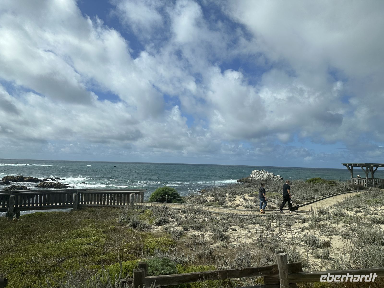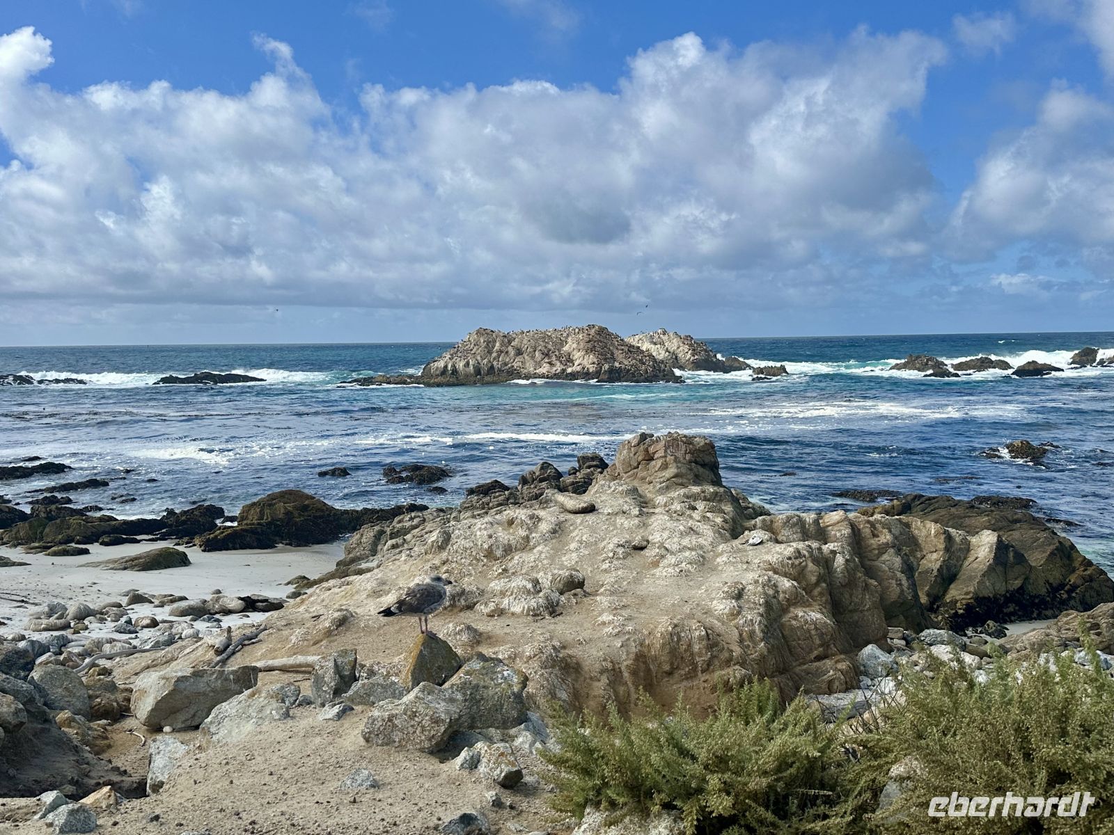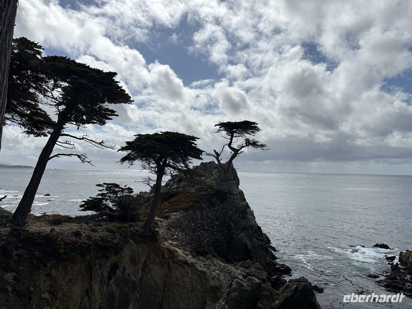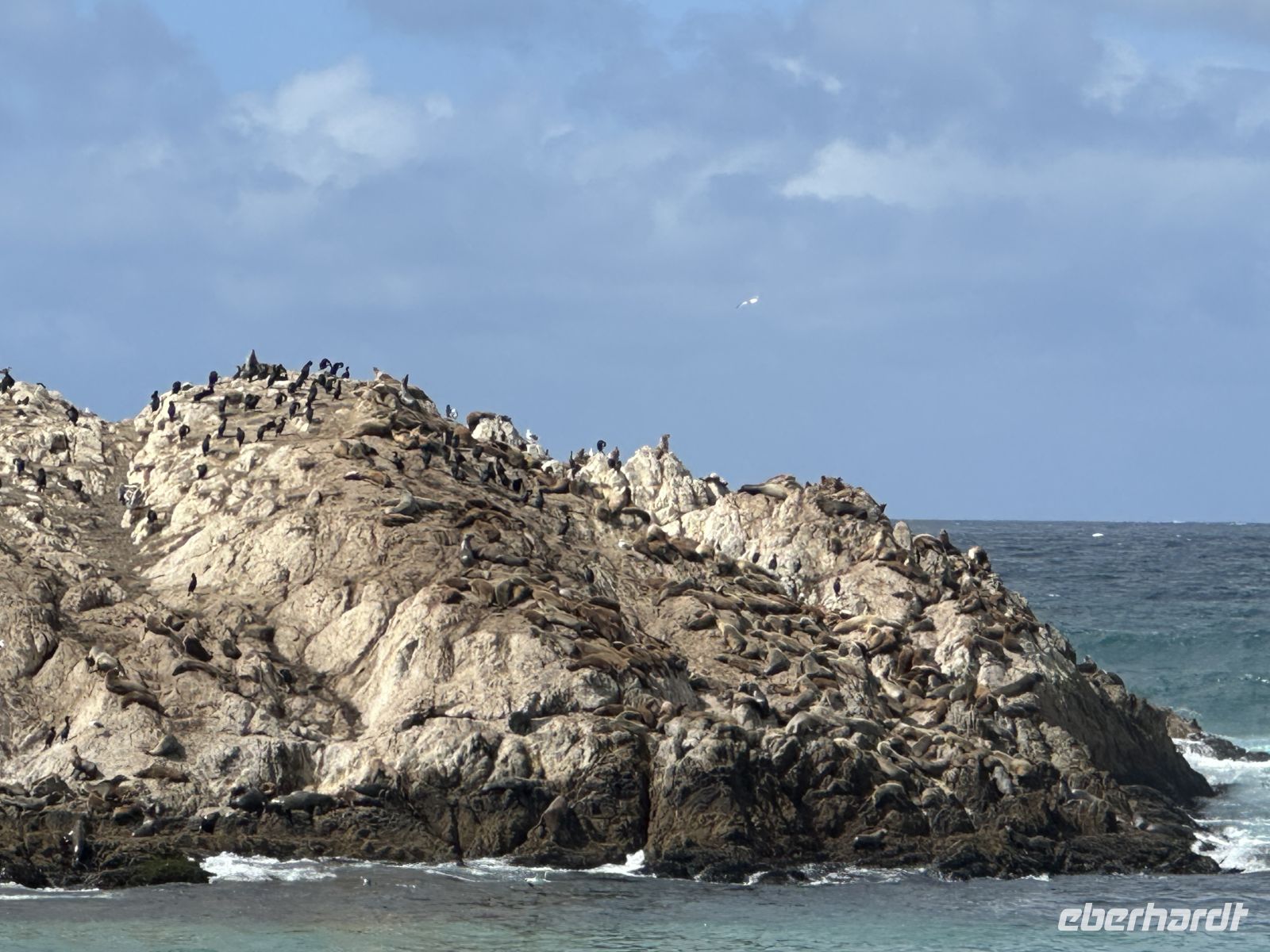 Wir starten nach dem Frühstück mit gepackten Koffern. Ein langer Reisetag liegt vor uns. Unser Fahrer muss tanken und so legen wir einen ungeplanten Fotostopp am Pazifik ein. In den rollenden Wellen tummeln sich mutige Wellenreiter. Wir haben ein paar Minuten Zeit, ihnen zuzusehen. Zwei Stunden später legen wir eine Rast in Davenport ein. Mittags erreichen wir Monterey und haben Zeit zum Mittagessen und Bummeln. Einige von uns folgen der Empfehlung von Evelyn und probieren Clam Showder, eine köstliche Muschelsuppe. Vor dem Restaurant Bubba Gump steht die berühmte Bank mit der ebenso berühmten Pralinenschachtel und wartet geduldig darauf, fotografiert zu werden. Denn: Das Leben ist wie eine Pralinenschachtel, man weiß nie, was man bekommt. Am Pebblebeach legen wir wieder einen Fotostopp ein, lauschen dem Gebrüll der Seelöwen und amüsieren uns über die zutraulichen Erdhörnchen.