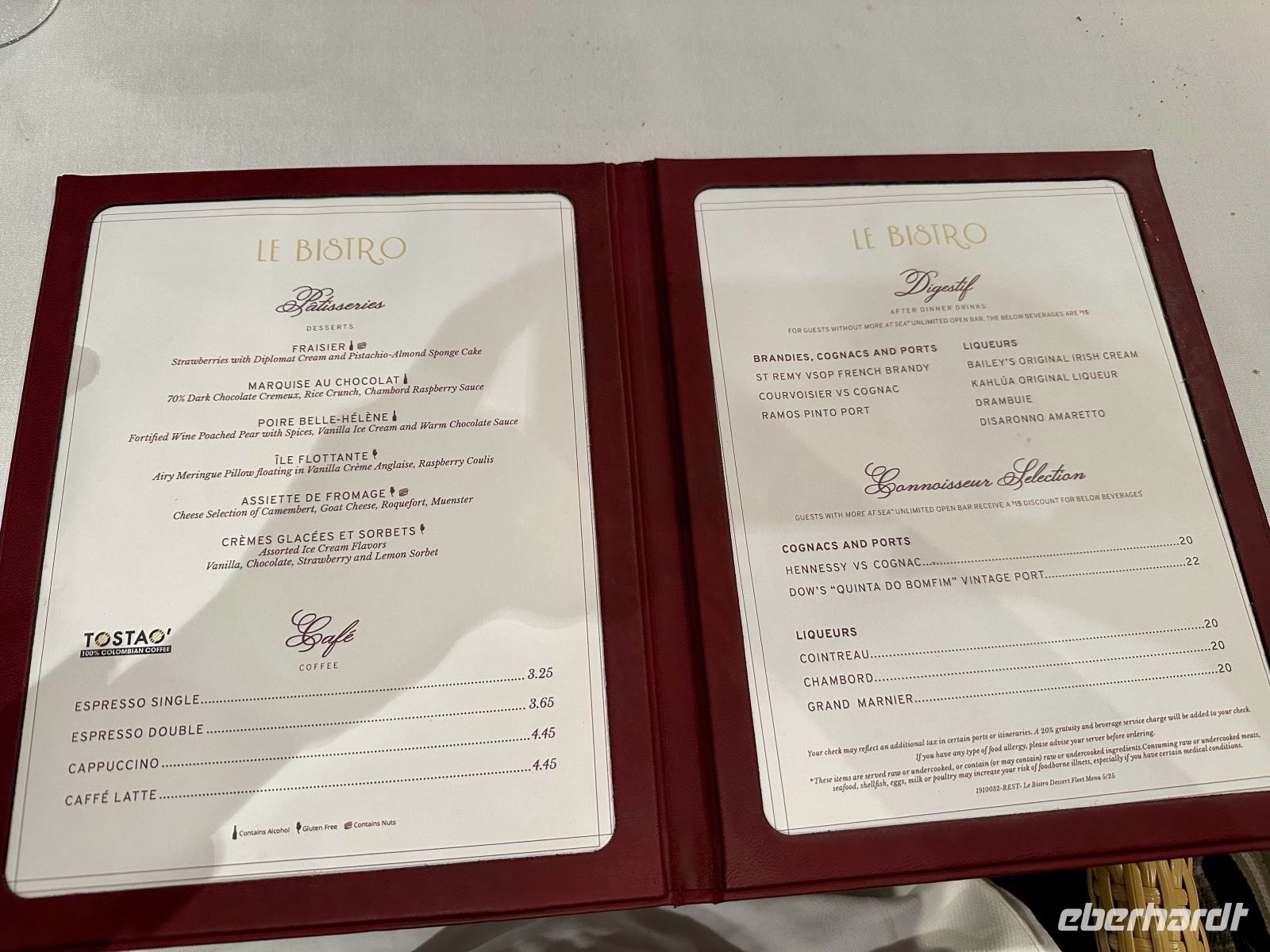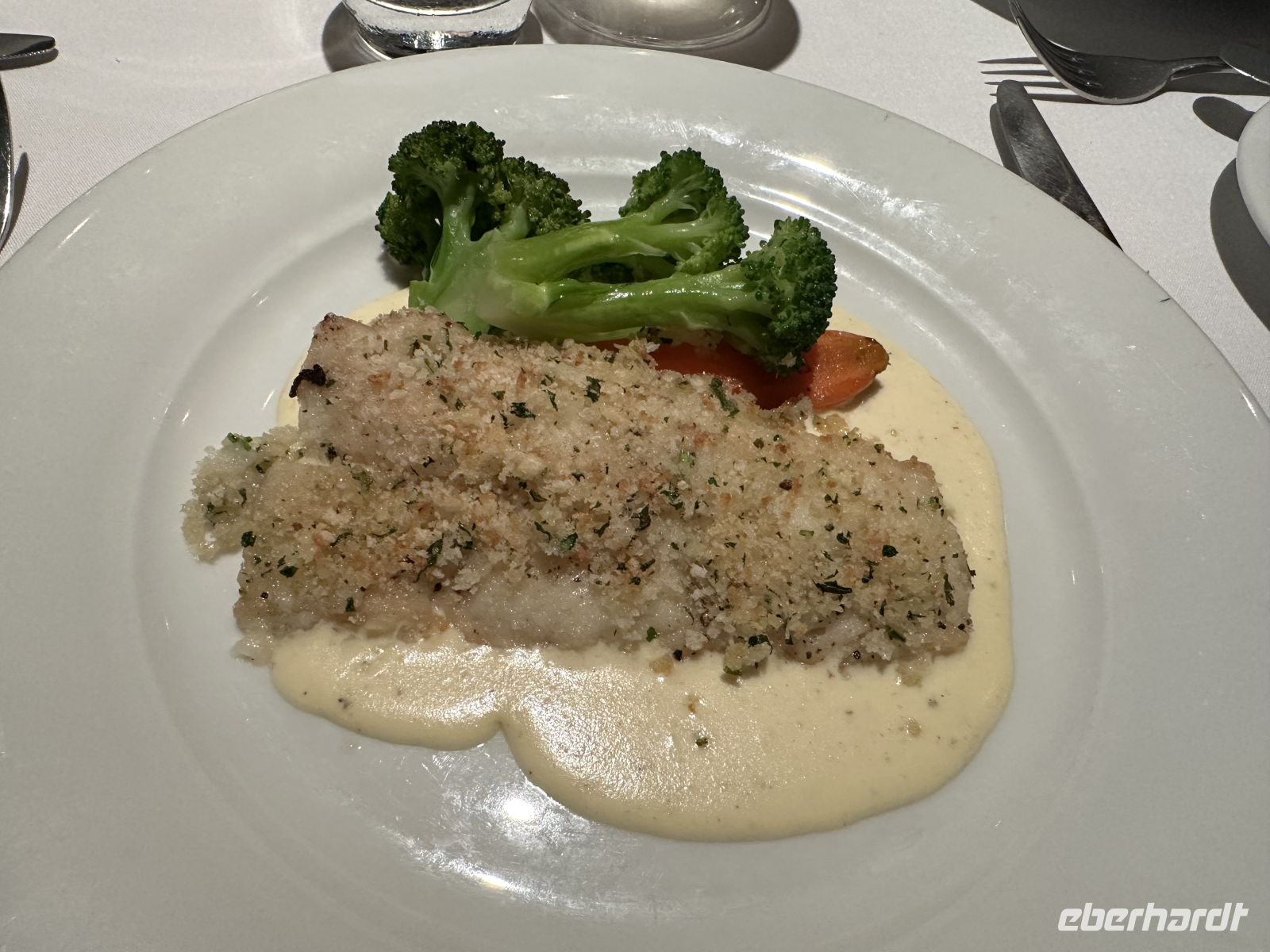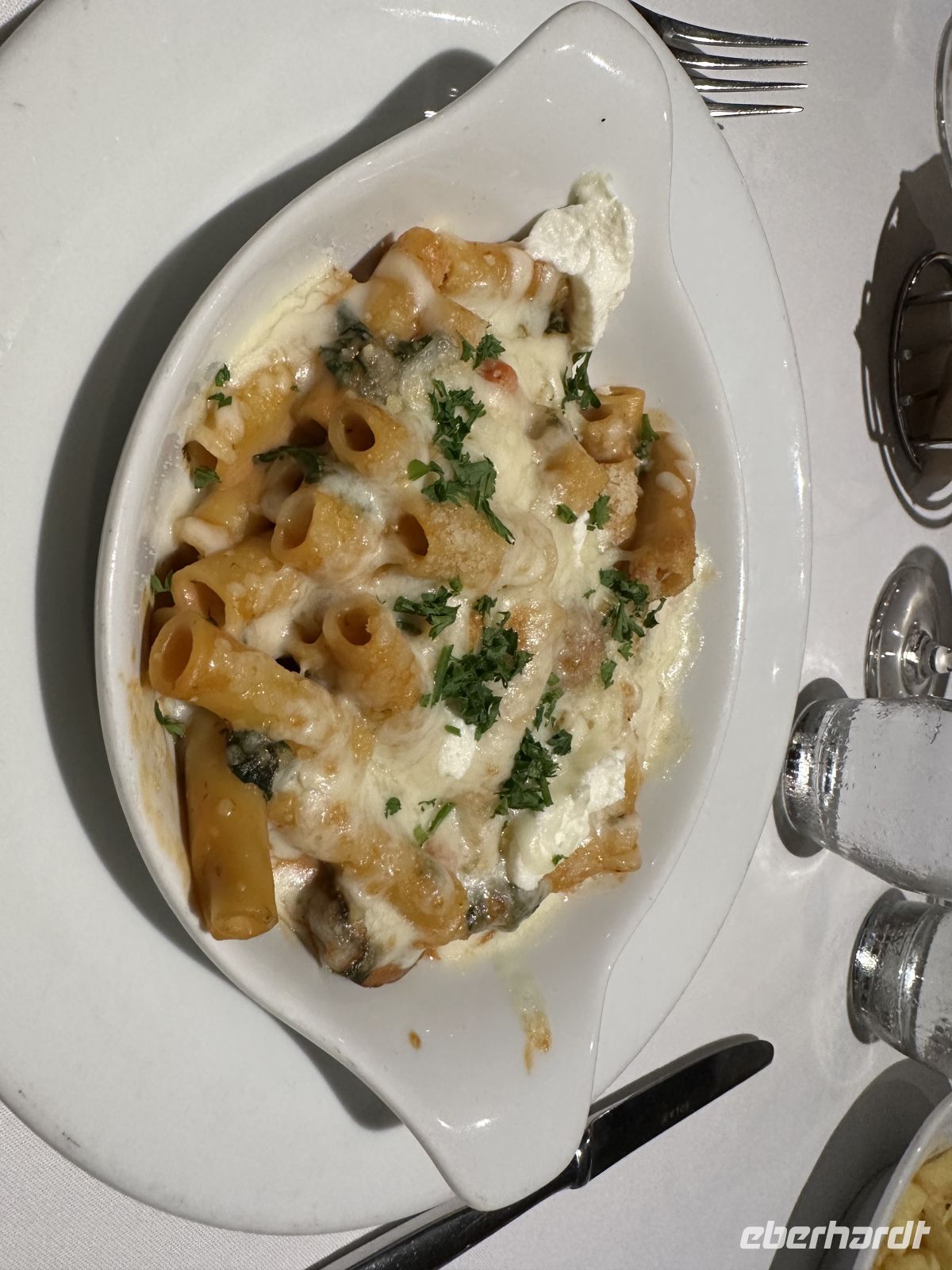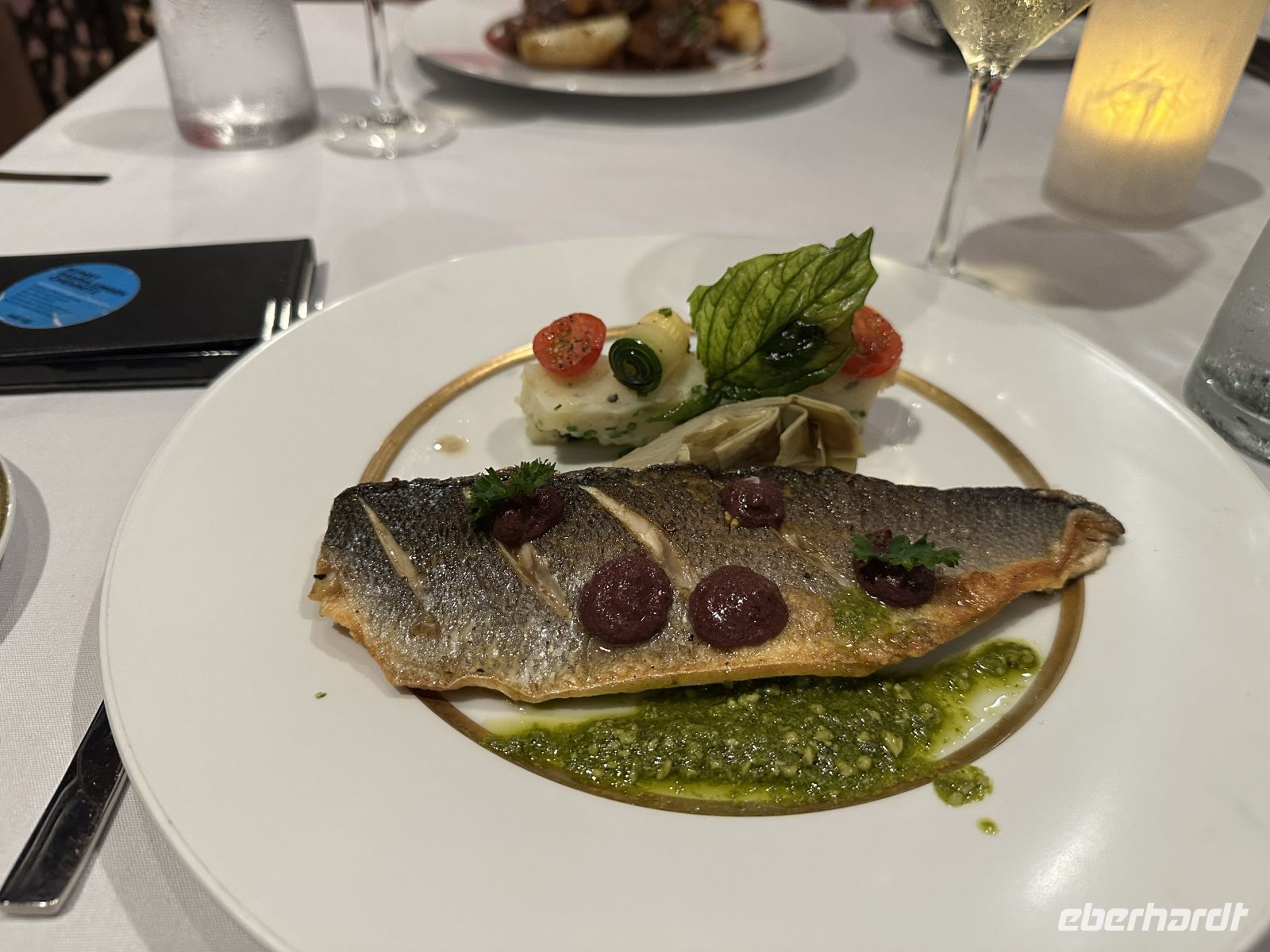 Alles Vorspeisen! Die Hauptgänge zeichnen sich durch reichhaltige, geschmorte Gerichte und perfekt zubereitetes Fleisch aus: Osso Buco Alla Milanese: Eine der am meisten gelobten Speisen – geschmorte Lammschulter, die so zart ist, dass sie vom Knochen fällt, serviert mit Safran-Risotto (göttlich). Oder wie wäre es mit Controfiletto Di Manzo Al Pepe Verde, ein New York Strip Steak, in einer grünen Pfefferkornsauce serviert und kombiniert mit Blauschimmelkäse-Ravioli. Oder Gamberi Fra Diavolo, gebratene Garnelen in einer pikanten Tomatensauce, serviert mit Linguine. Und noch besser: Pollo Cacciatore, Hühnchen, geschmort in einer aromatischen Rosmarin-Knoblauch-Sauce mit frischen Tomaten und Gemüse. Hier trifft eindeutig zu: wer die Wahl hat, hat die Qual. Wofür soll man sich nur entscheiden? Und nach dem Hauptgang geht es weiter mit Dolci, den Desserts: cremiges Tiramisu, Panna Cotta und Cannoli mit süßer Ricotta-Füllung. Bitte, wer rollt mich in die Kabine?