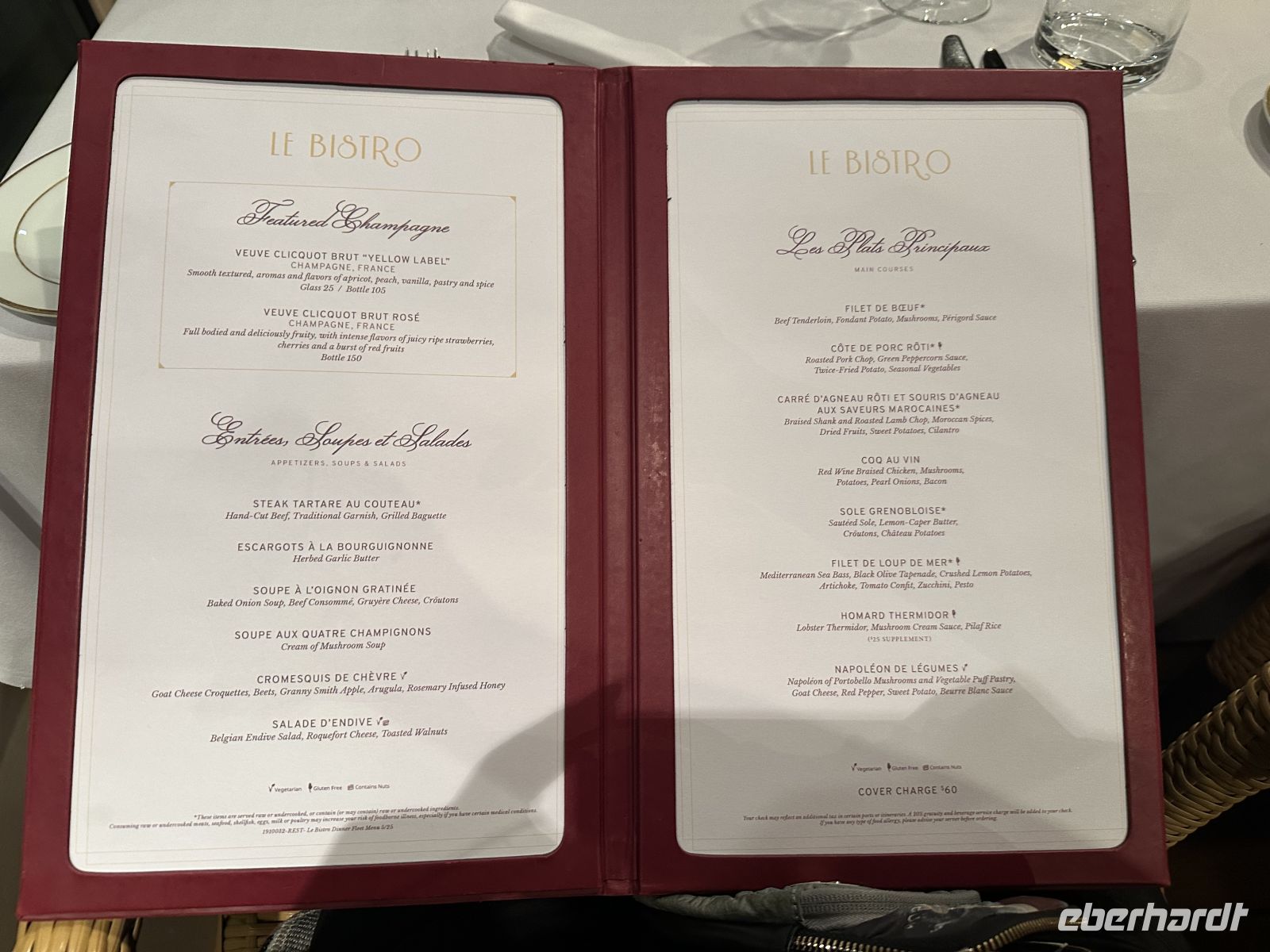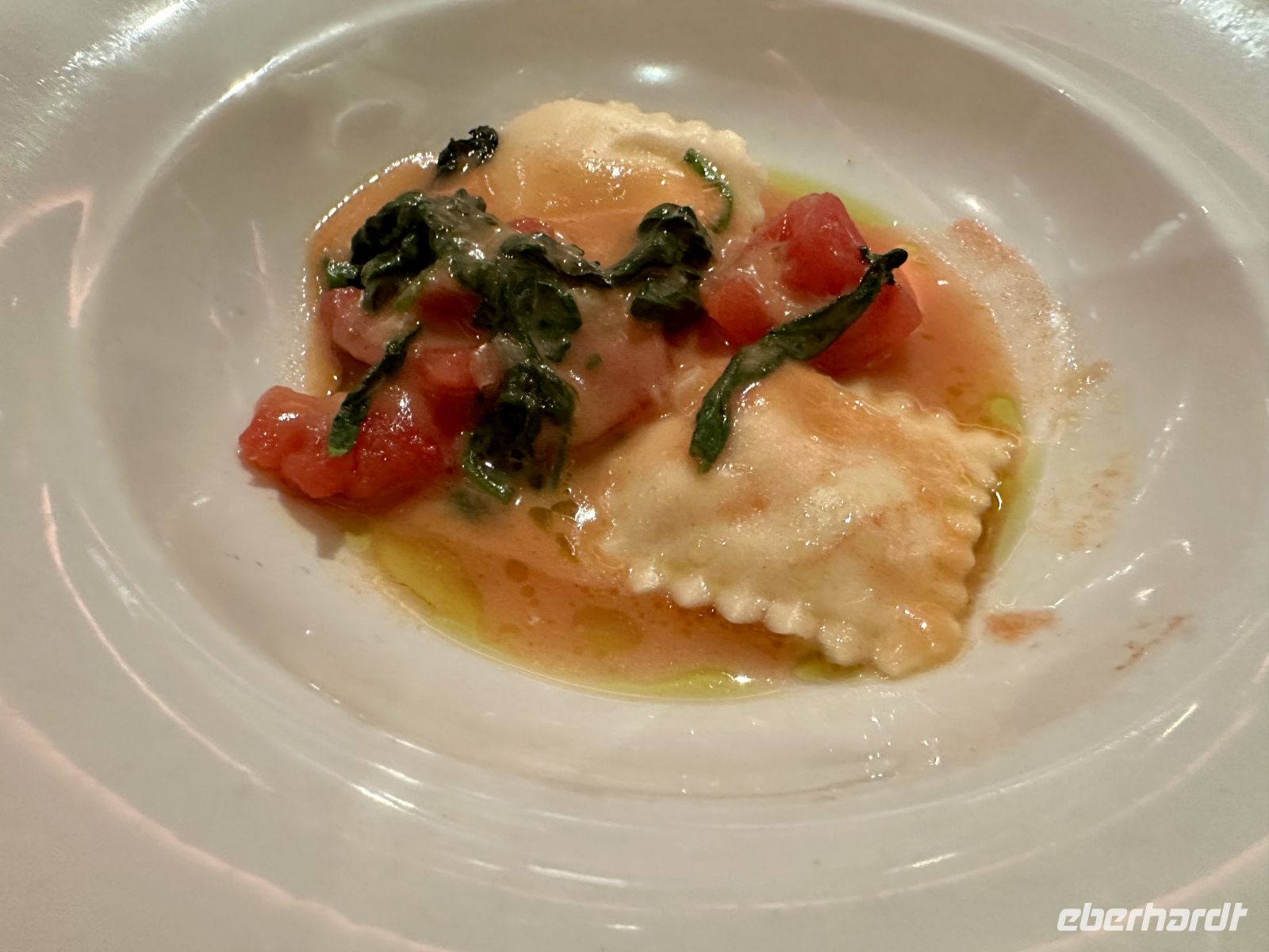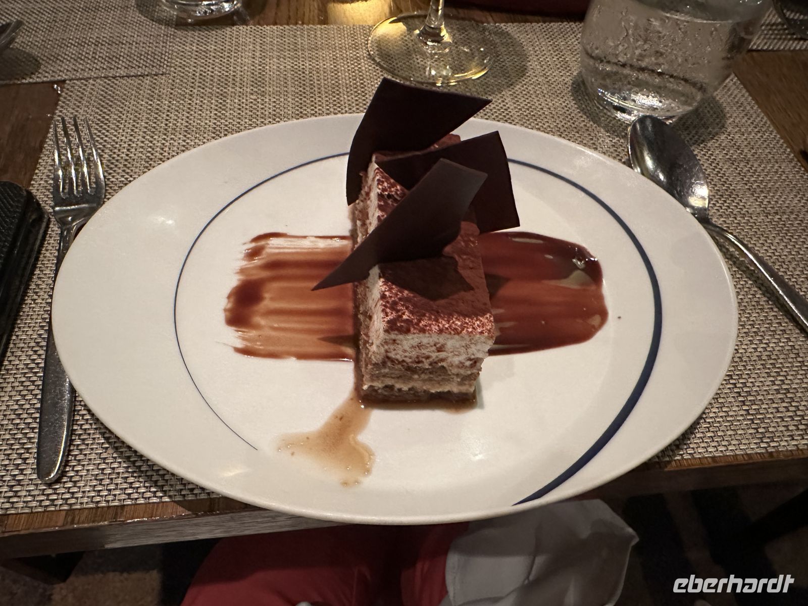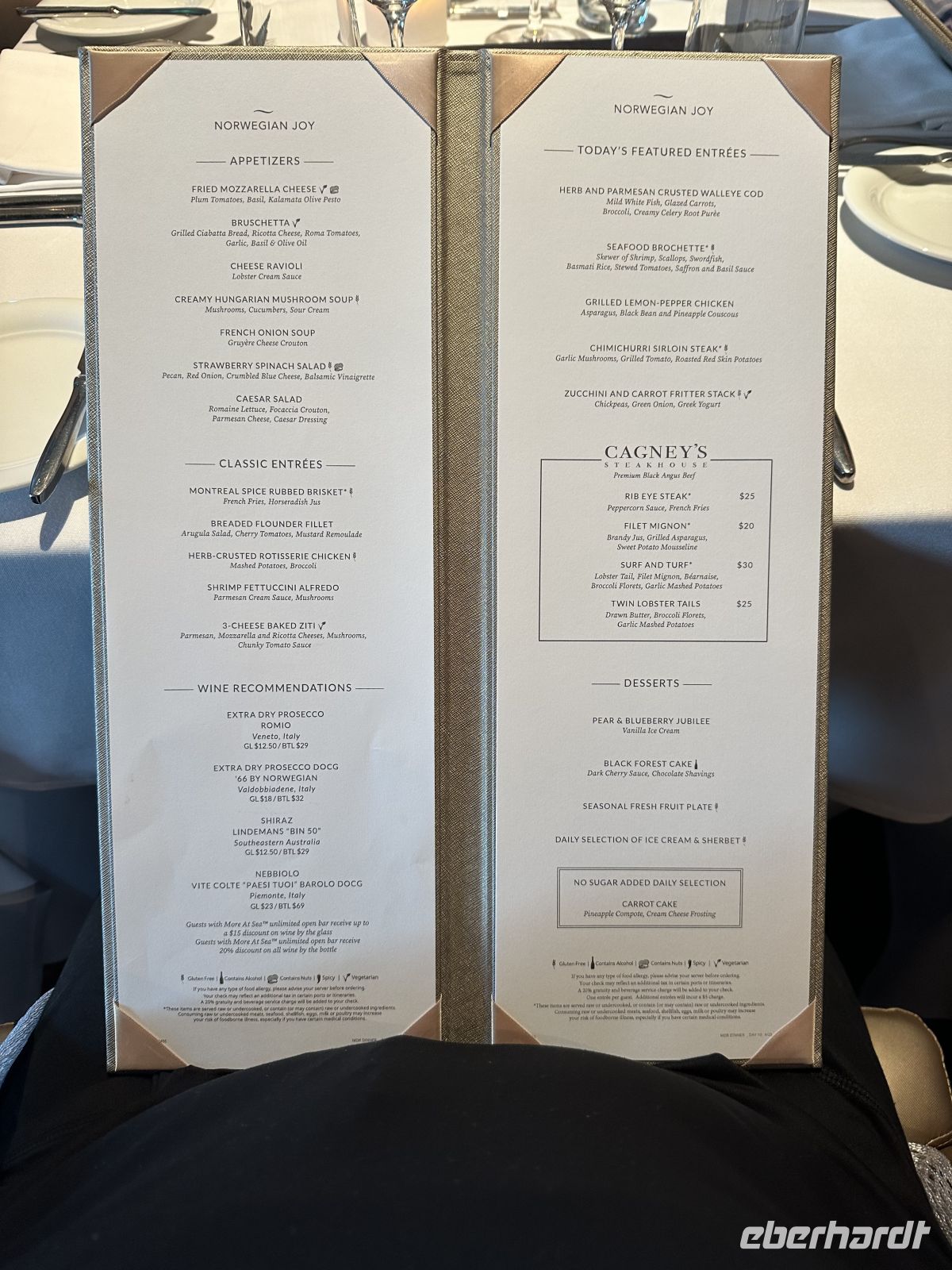 Alles Vorspeisen! Die Hauptgänge zeichnen sich durch reichhaltige, geschmorte Gerichte und perfekt zubereitetes Fleisch aus: Osso Buco Alla Milanese: Eine der am meisten gelobten Speisen – geschmorte Lammschulter, die so zart ist, dass sie vom Knochen fällt, serviert mit Safran-Risotto (göttlich). Oder wie wäre es mit Controfiletto Di Manzo Al Pepe Verde, ein New York Strip Steak, in einer grünen Pfefferkornsauce serviert und kombiniert mit Blauschimmelkäse-Ravioli. Oder Gamberi Fra Diavolo, gebratene Garnelen in einer pikanten Tomatensauce, serviert mit Linguine. Und noch besser: Pollo Cacciatore, Hühnchen, geschmort in einer aromatischen Rosmarin-Knoblauch-Sauce mit frischen Tomaten und Gemüse. Hier trifft eindeutig zu: wer die Wahl hat, hat die Qual. Wofür soll man sich nur entscheiden? Und nach dem Hauptgang geht es weiter mit Dolci, den Desserts: cremiges Tiramisu, Panna Cotta und Cannoli mit süßer Ricotta-Füllung. Bitte, wer rollt mich in die Kabine?