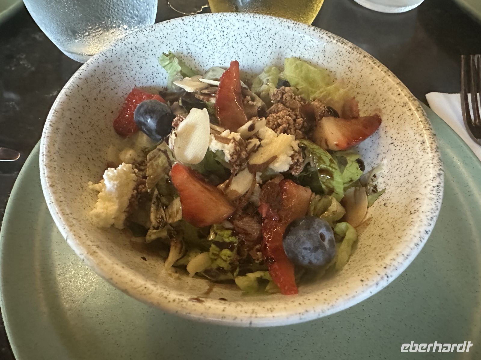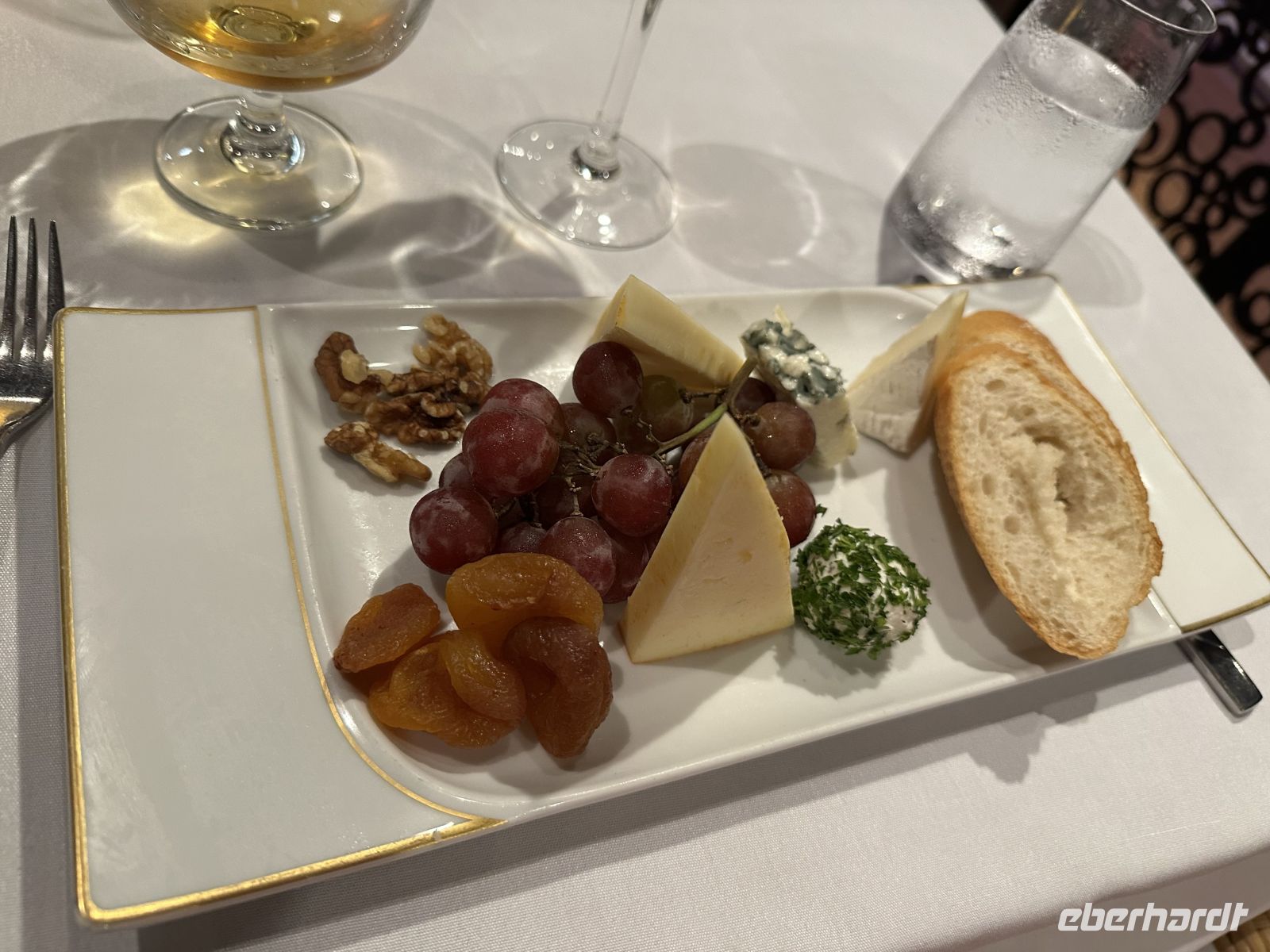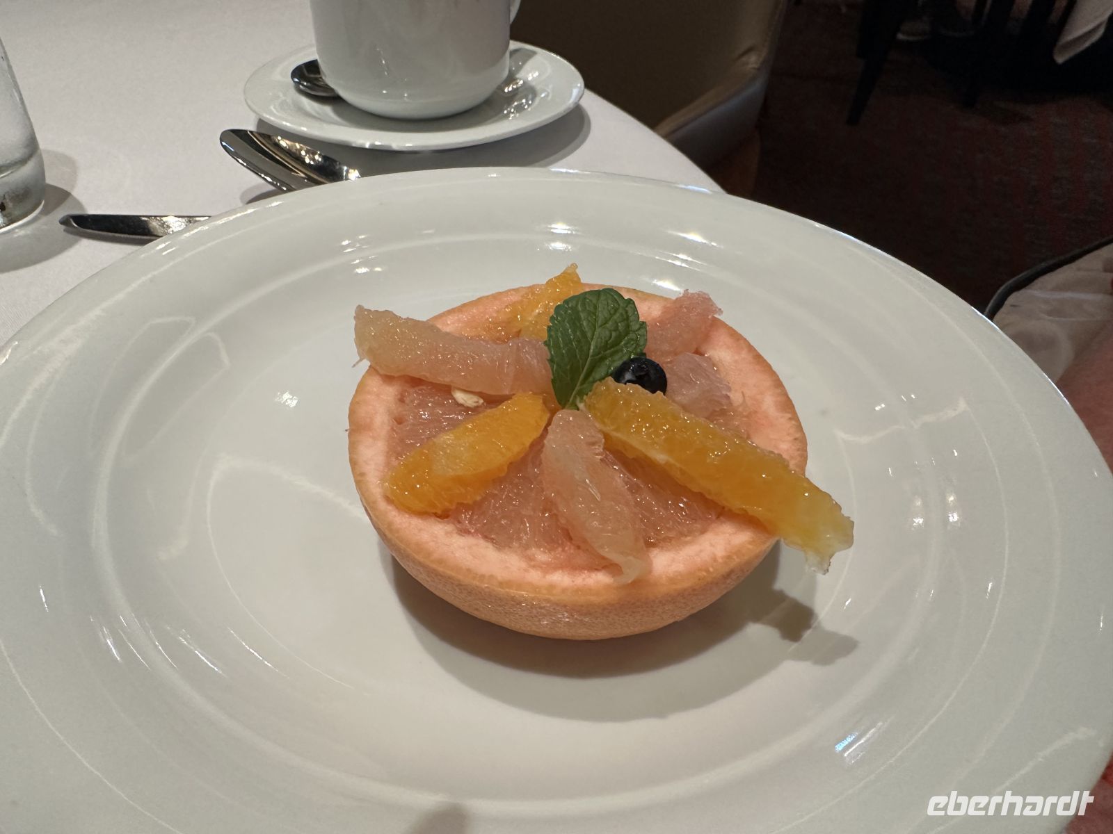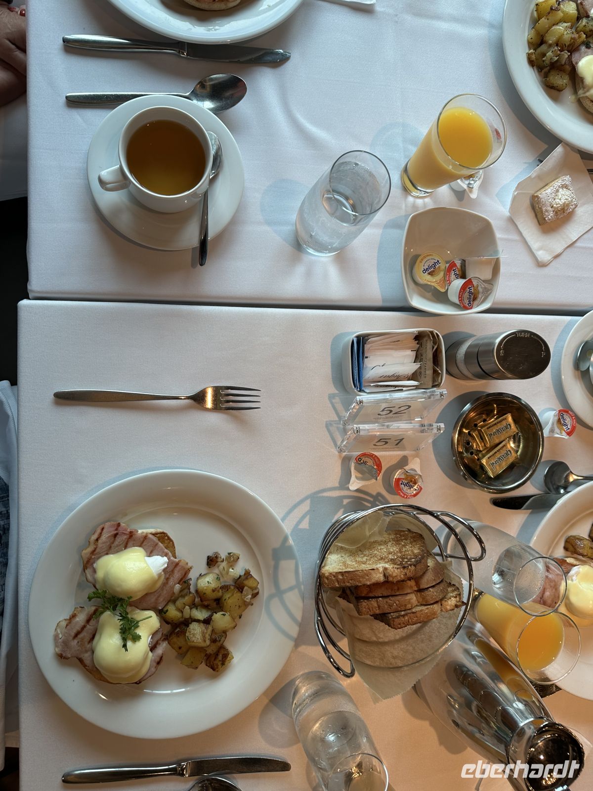 Das Frühstück wird serviert. Wir wählen zwischen einem Teller mit gemischtem Gebäck, Butter und Marmelade und einer Obstschale. Wer möchte, darf auch beides bestellen. Aber Vorsicht, dies ist eine Vorspeise, es folgt noch ein Tellergericht. Zum Beispiel ein Bagel mit Räucherlachs garniert mit Kapern und frischem Gemüse. Also, hungrig steht hier keiner auf.