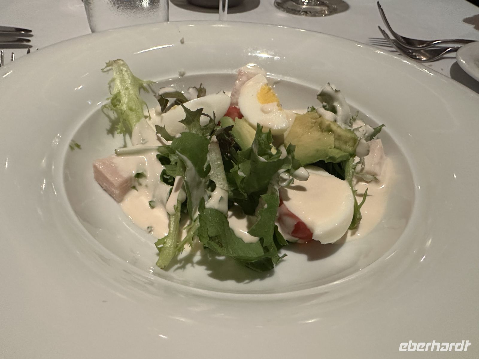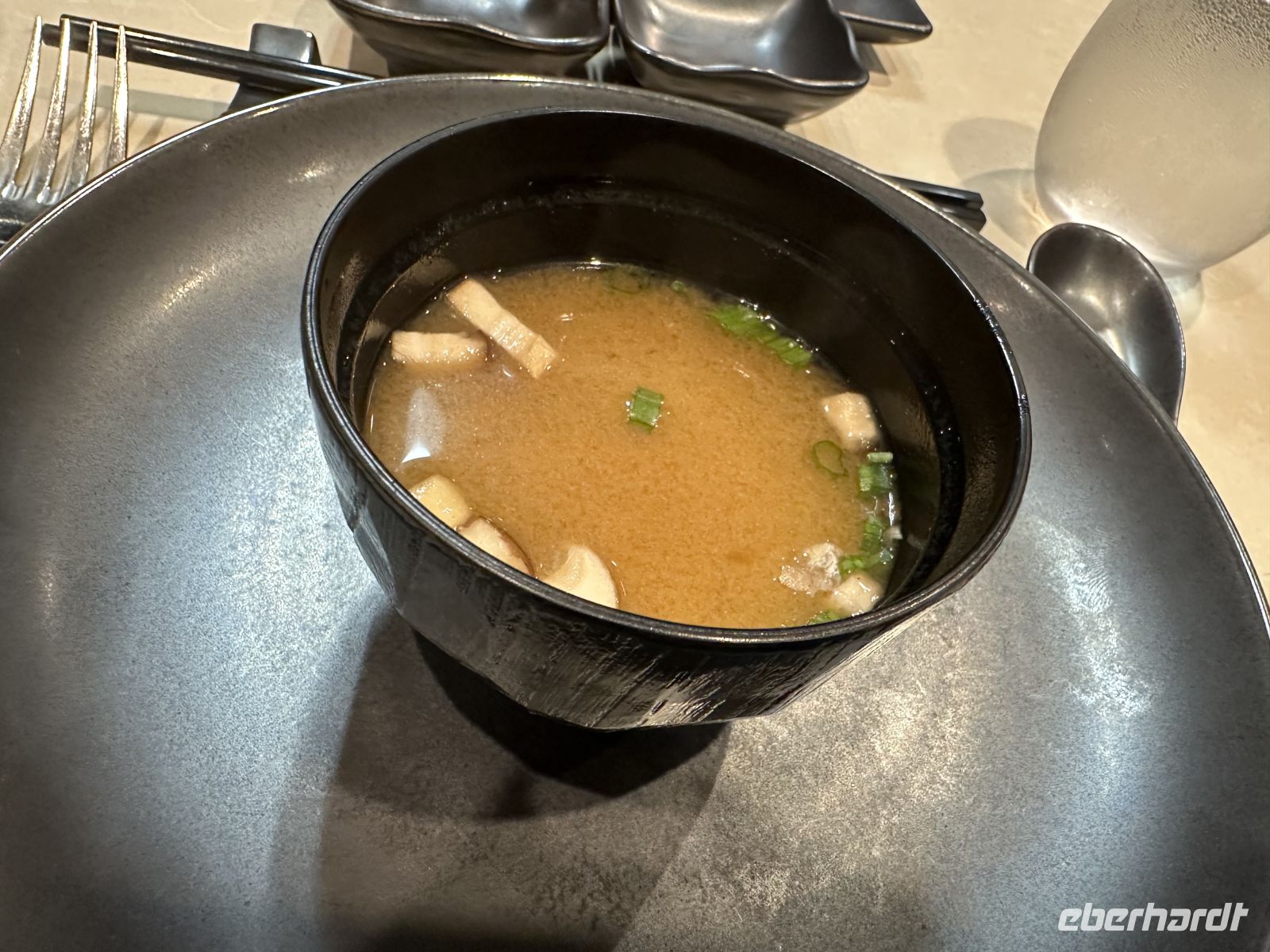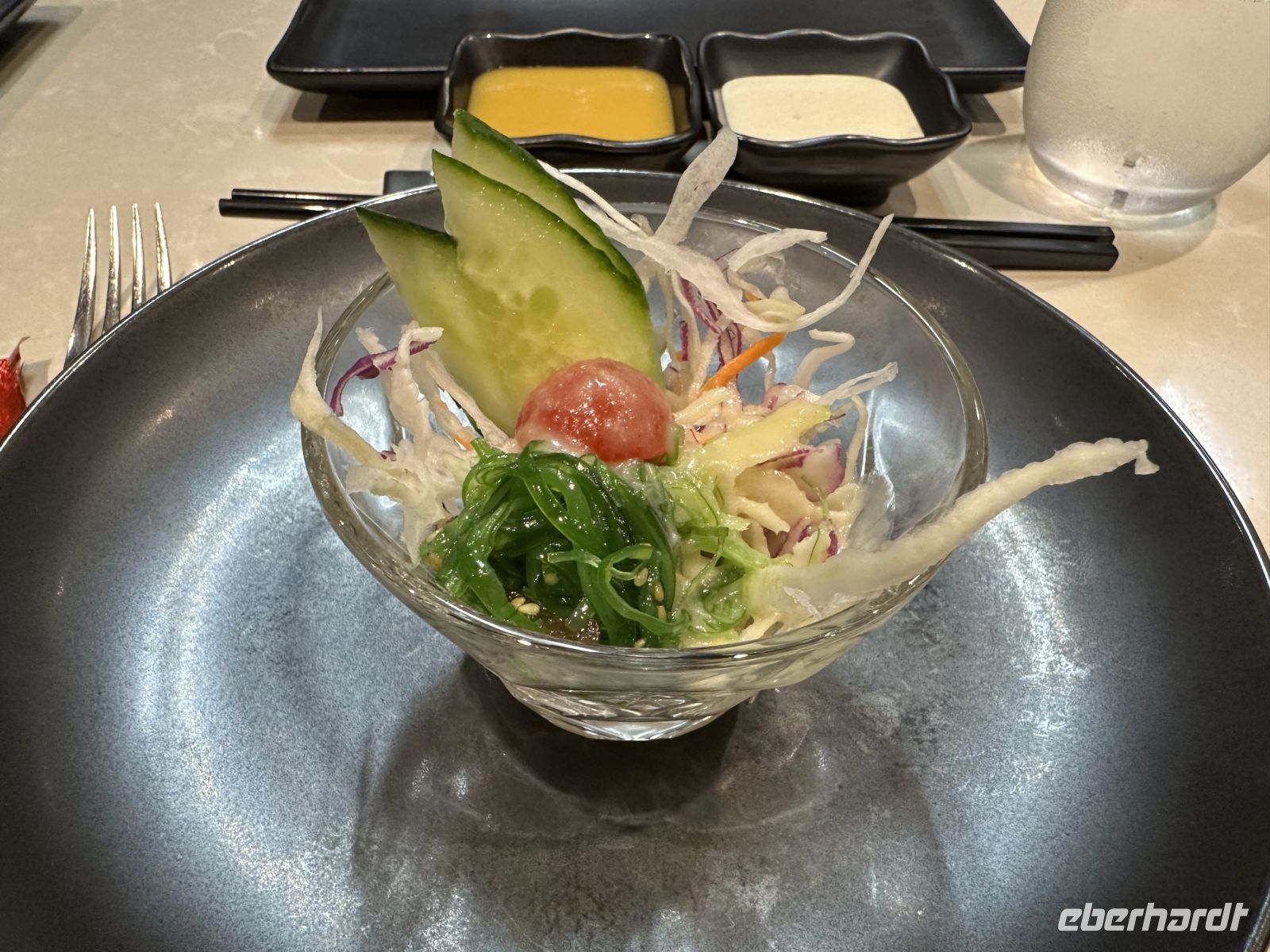 Der Abend startet mit einer Miso-Suppe und einem leichten Seetang-Salat mit Ingwer-Dressing.