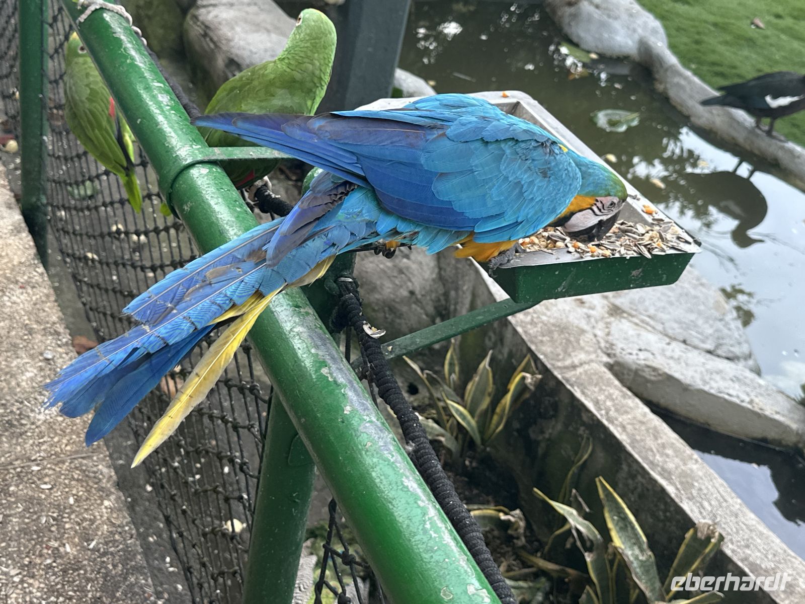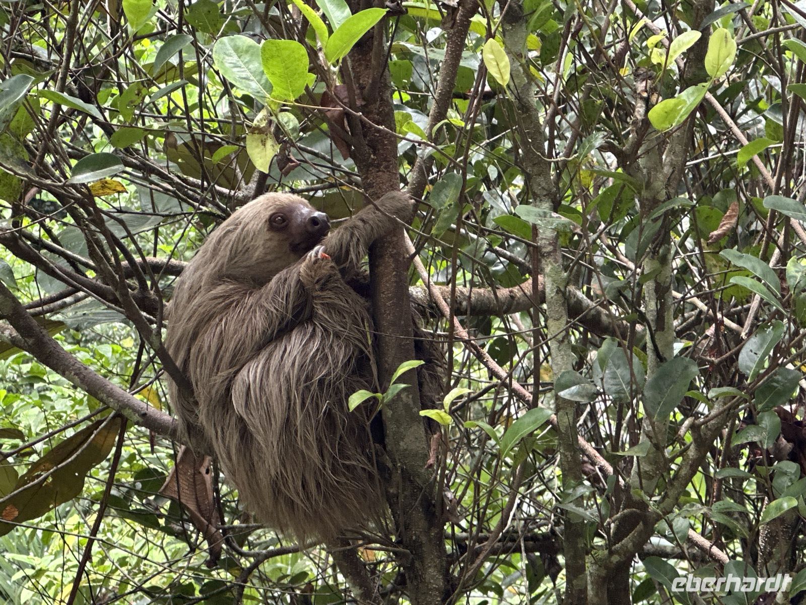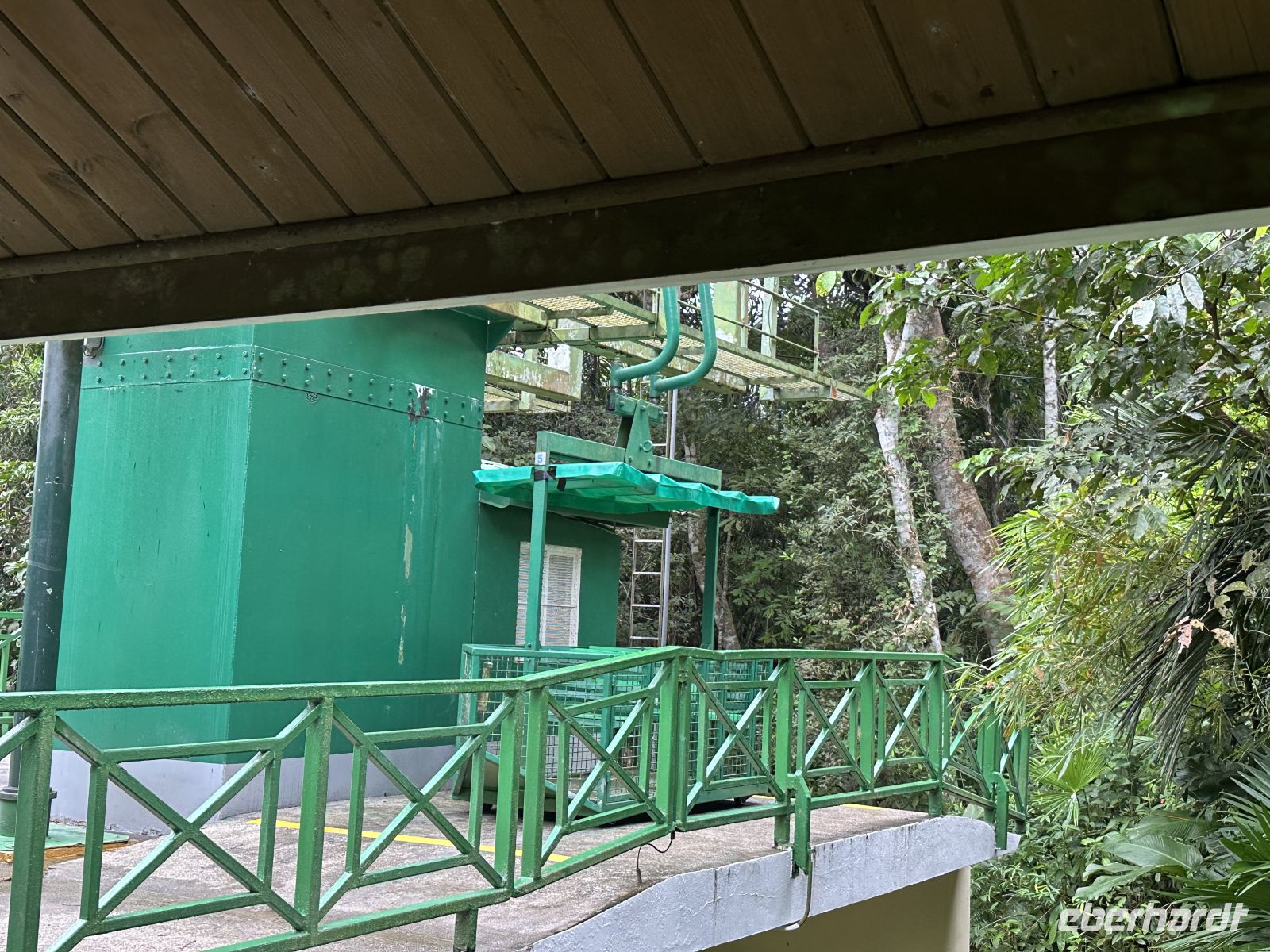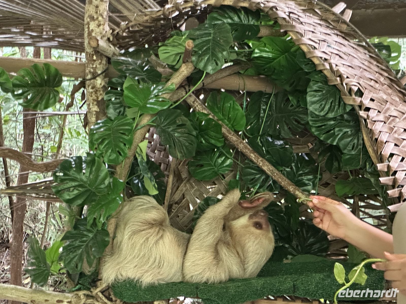 Unser Schiff hat in Panama eine Overnight eingelegt, was bedeutet, wir haben den Hafen nicht verlassen. So sind wir heute wieder im regulären Programm. Wir haben verschiedene Ausflüge gebucht. Einige Gäste nehmen an einer Stadtbesichtigung teil, andere lernen intensiv den Kanal und das Schleusensystem kennen und eine weitere kleine Gruppe fährt in den Dschungel, den Gamboa Rainforst Reserve. Auf dem Weg dorthin wird in einem Hotel eine Getränke und WC Pause eingelegt. Im Garten des Hotels erfreuen wir uns an einem Kapuziner Äffchen und einem uns unbekannten Tier. Gegen 09.30 Uhr erreichen wir die Seilbahn, die Gamboa Aerial Tram. Bei einer Fahrt in offenen Gondeln gleiten wir sanft über das Blätterdach des Regenwaldes. So haben wir eine einzigartige Sicht auf die verschiedenen Vegetationsschichten – vom schattigen Waldboden bis hin zur sonnendurchfluteten Baumkrone. Unsere Hoffnung, verschiedene Tiere in ihrem natürlichen Lebensraum zu beobachten, erfüllt sich nur bedingt, lediglich ein paar kleine Vögel geben uns die Ehre. Am Ende der Seilbahnfahrt gibt es einen Ausstieg, von der aus wir über einen kurzen Weg den 30 Meter hohen Aussichtsturm erreichen. Von der Spitze des Turms genießen wir den atemberaubenden 360-Grad-Blick auf den gesamten Soberania Nationalpark. Die Rückfahrt mit der Seilbahn dauert genauso lange wie die Hinfahrt, 40 Minuten. Das liegt vor allem daran, dass die Bahn bei jedem Ein- und Ausstieg angehalten wird. Der zweite Teil des Ausflugs wird dann interessanter, weil wir in verschiedenen Schutzzentren einheimische Tiere betrachten können. Den Anfang macht die Frosch-Ausstellung. In einem Rondell wohnen. grüngefleckte, braune, rote und andersfarbige Fröschlein. Sie scheinen zunächst erstarrt zu sein, aber dann beobachten wir doch einige Aktivitäten. Im darauf folgenden Orchideengarten gibt es nicht allzu viel überraschendes zu sehen. Anders sieht es im Schmetterlingshaus aus, hier umflattern uns viele farbenprächtige Schmetterlinge, vor allem die zahlreichen berühmten Blauen Morpho-Falter begeistern uns. Und zum Schluss kommt der unerwartete Höhepunkt: wir besuchen ein Faultier-Schutzzentrum: Hier sehen wir gerettete und rehabilitierte Faultiere und erfreuen uns daran, wie zwei von ihnen von einer Pflegerin gefüttert werden. Glücklich und zufrieden und mit vielen Faultierfotos im Gepäck kehren wir zurück zum Schiff. Unterwegs beobachten wir am Wegesrand in einem kleinen Tümpel einen Kaiman, der in friedlicher Gemeinschaft mit drei Schildkröten auf der Suche nach Futter ist.