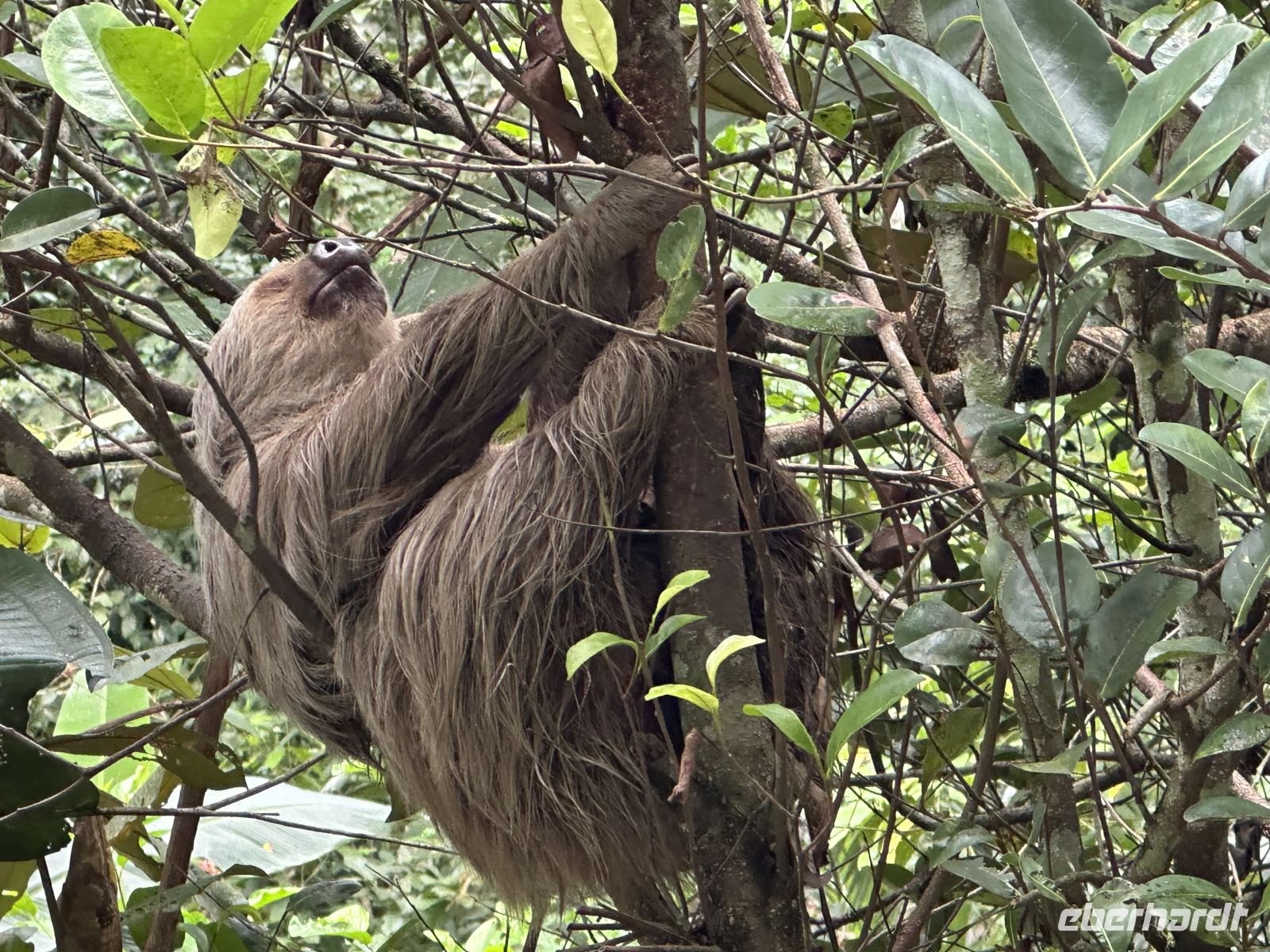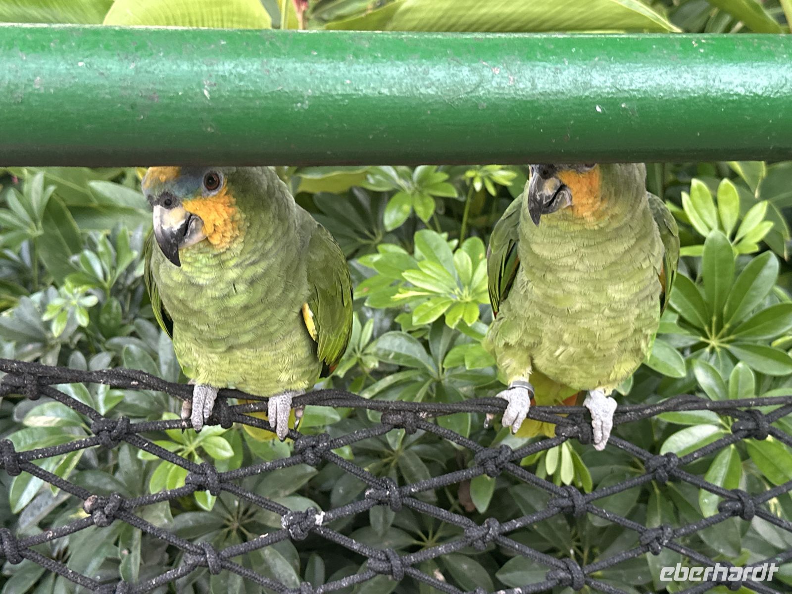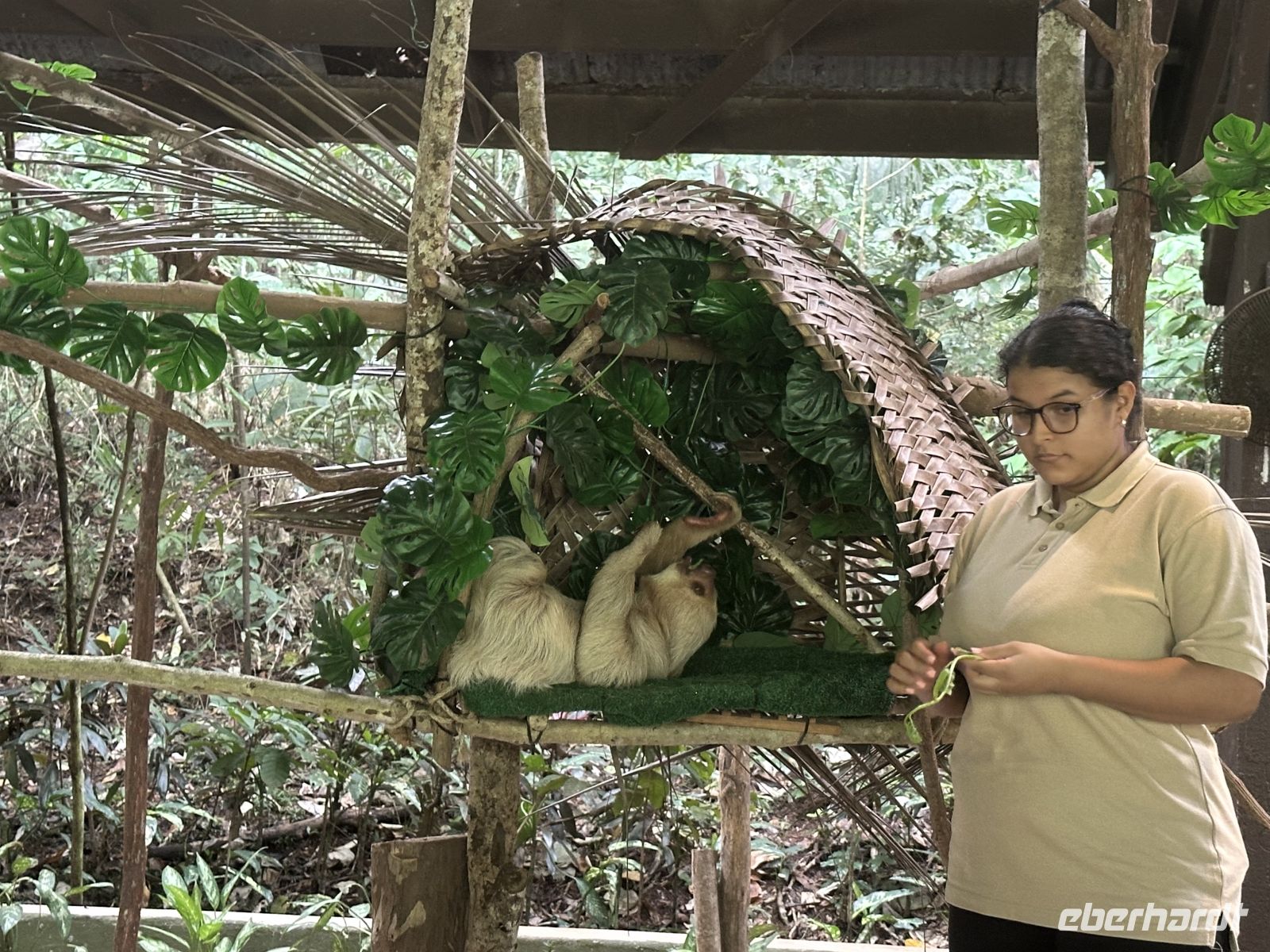 Unser Schiff hat in Panama eine Overnight eingelegt, was bedeutet, wir haben den Hafen nicht verlassen. So sind wir heute wieder im regulären Programm. Wir haben verschiedene Ausflüge gebucht. Einige Gäste nehmen an einer Stadtbesichtigung teil, andere lernen intensiv den Kanal und das Schleusensystem kennen und eine weitere kleine Gruppe fährt in den Dschungel, den Gamboa Rainforst Reserve. Auf dem Weg dorthin wird in einem Hotel eine Getränke und WC Pause eingelegt. Im Garten des Hotels erfreuen wir uns an einem Kapuziner Äffchen und einem uns unbekannten Tier. Gegen 09.30 Uhr erreichen wir die Seilbahn, die Gamboa Aerial Tram. Bei einer Fahrt in offenen Gondeln gleiten wir sanft über das Blätterdach des Regenwaldes. So haben wir eine einzigartige Sicht auf die verschiedenen Vegetationsschichten – vom schattigen Waldboden bis hin zur sonnendurchfluteten Baumkrone. Unsere Hoffnung, verschiedene Tiere in ihrem natürlichen Lebensraum zu beobachten, erfüllt sich nur bedingt, lediglich ein paar kleine Vögel geben uns die Ehre. Am Ende der Seilbahnfahrt gibt es einen Ausstieg, von der aus wir über einen kurzen Weg den 30 Meter hohen Aussichtsturm erreichen. Von der Spitze des Turms genießen wir den atemberaubenden 360-Grad-Blick auf den gesamten Soberania Nationalpark. Die Rückfahrt mit der Seilbahn dauert genauso lange wie die Hinfahrt, 40 Minuten. Das liegt vor allem daran, dass die Bahn bei jedem Ein- und Ausstieg angehalten wird. Der zweite Teil des Ausflugs wird dann interessanter, weil wir in verschiedenen Schutzzentren einheimische Tiere betrachten können. Den Anfang macht die Frosch-Ausstellung. In einem Rondell wohnen. grüngefleckte, braune, rote und andersfarbige Fröschlein. Sie scheinen zunächst erstarrt zu sein, aber dann beobachten wir doch einige Aktivitäten. Im darauf folgenden Orchideengarten gibt es nicht allzu viel überraschendes zu sehen. Anders sieht es im Schmetterlingshaus aus, hier umflattern uns viele farbenprächtige Schmetterlinge, vor allem die zahlreichen berühmten Blauen Morpho-Falter begeistern uns. Und zum Schluss kommt der unerwartete Höhepunkt: wir besuchen ein Faultier-Schutzzentrum: Hier sehen wir gerettete und rehabilitierte Faultiere und erfreuen uns daran, wie zwei von ihnen von einer Pflegerin gefüttert werden. Glücklich und zufrieden und mit vielen Faultierfotos im Gepäck kehren wir zurück zum Schiff. Unterwegs beobachten wir am Wegesrand in einem kleinen Tümpel einen Kaiman, der in friedlicher Gemeinschaft mit drei Schildkröten auf der Suche nach Futter ist.
