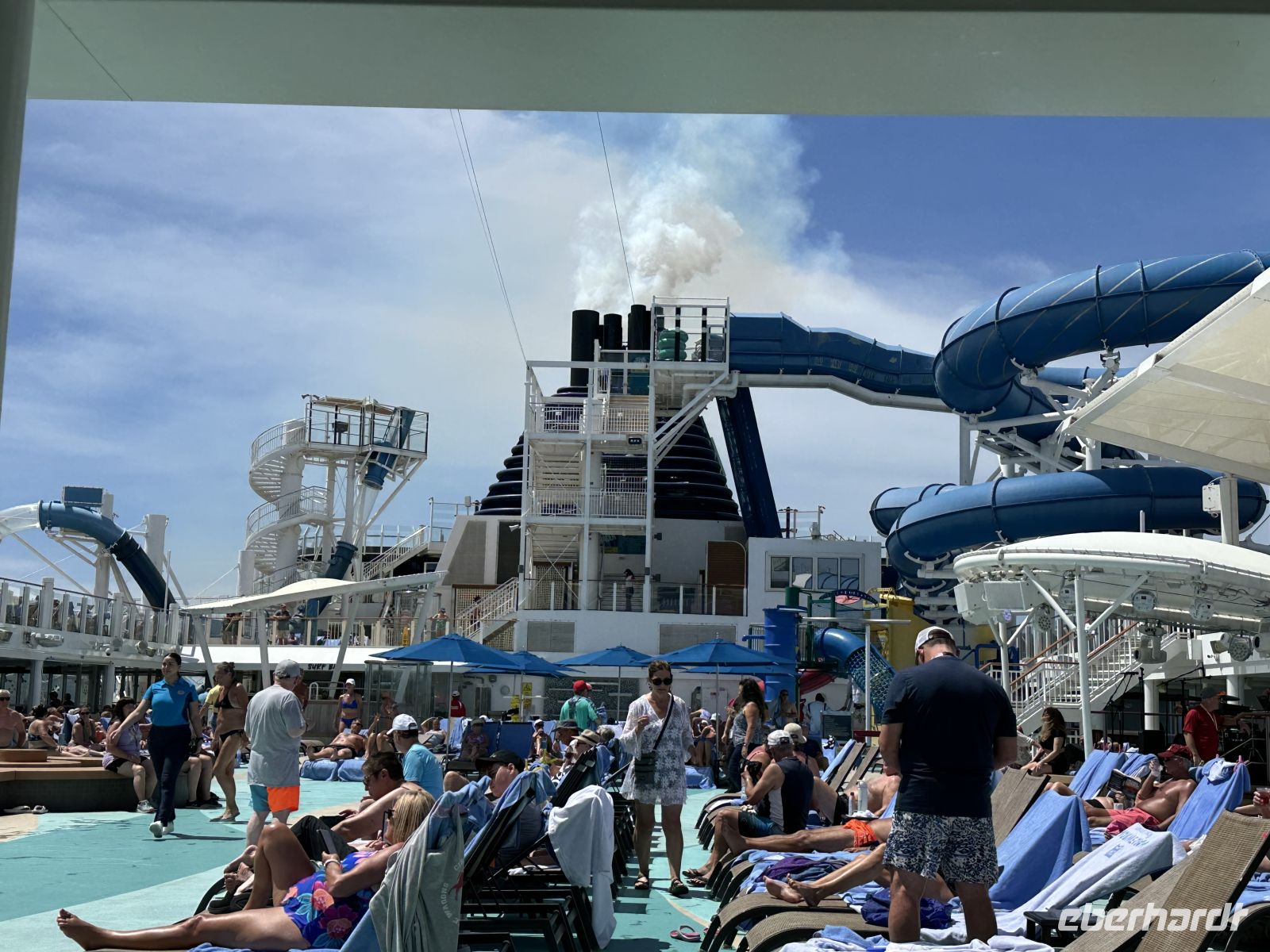 Am Vormittag bietet das Kreuzfahrtteam ein vielfältiges Beschäftigungsprogramm. Wir können sportlichen Aktivitäten nachgehen, an Quizzrunden teilnehmen, einkaufen oder uns am Pool in der Sonne aalen. Zum Mittagessen wiederholt sich das Angebot vom Morgen - Selbstbedienung oder Service - ganz nach eigenem Gutdünken. In diversen Bars gibt es den ganzen Tag alkoholfreie Getränke, Cocktails oder was das Herz begehrt. Gegen eine zusätzliche Gebühr werden am Nachmittag Verkostungen angeboten: Bier, Mojito und Wein kombiniert mit Schokolade stehen heute auf dem Programm. Im Atrium spielt man Bingo und Deal oder No Deal, auf dem Pooldeck wird heute Miss Bizeps gewählt. So vergeht der Tag. Jeder kann seinen Wünschen folgen, sich unterhalten lassen, gut oder schnell speisen, ein Buch lesen oder aufs Meer schauen.