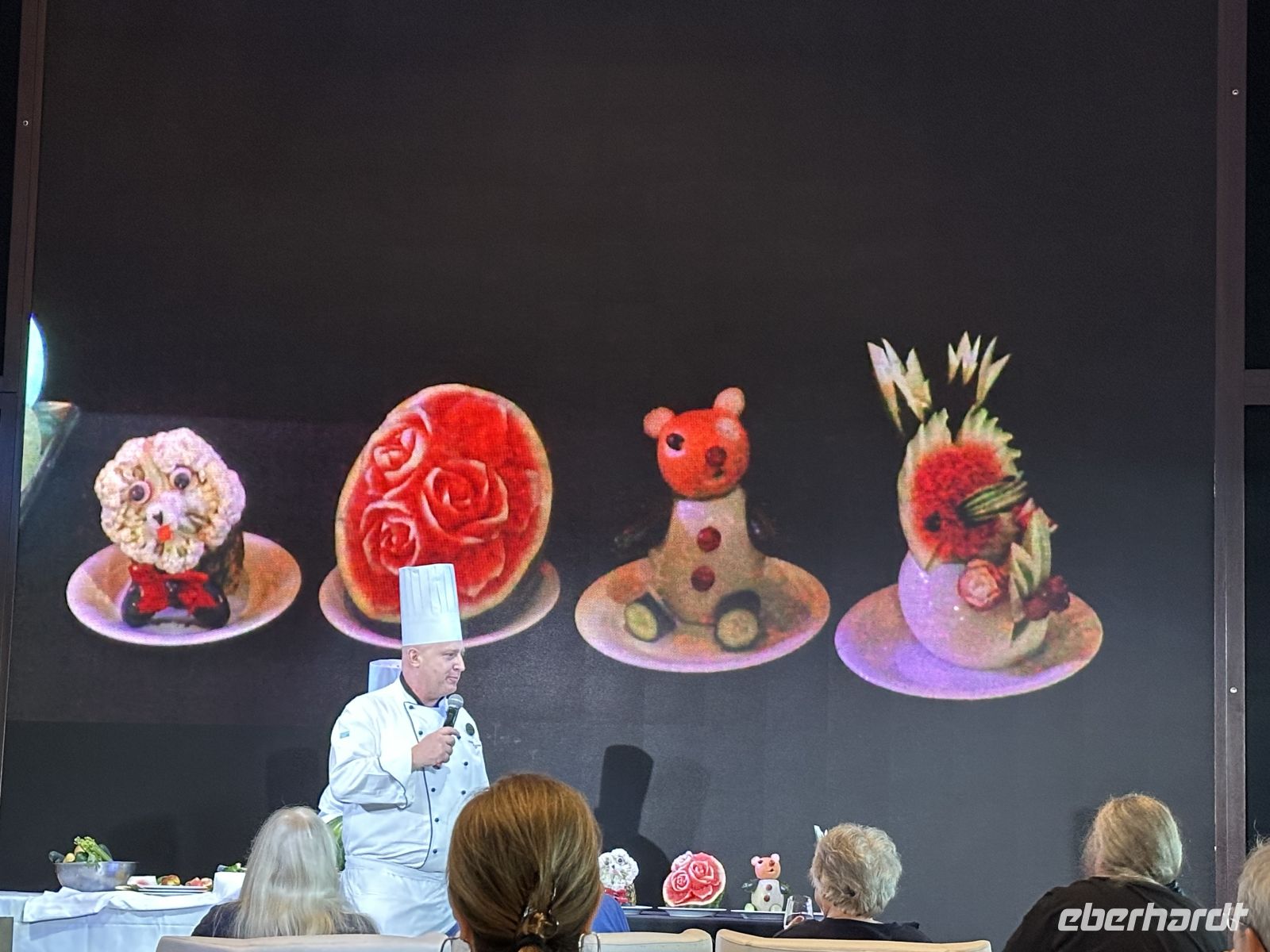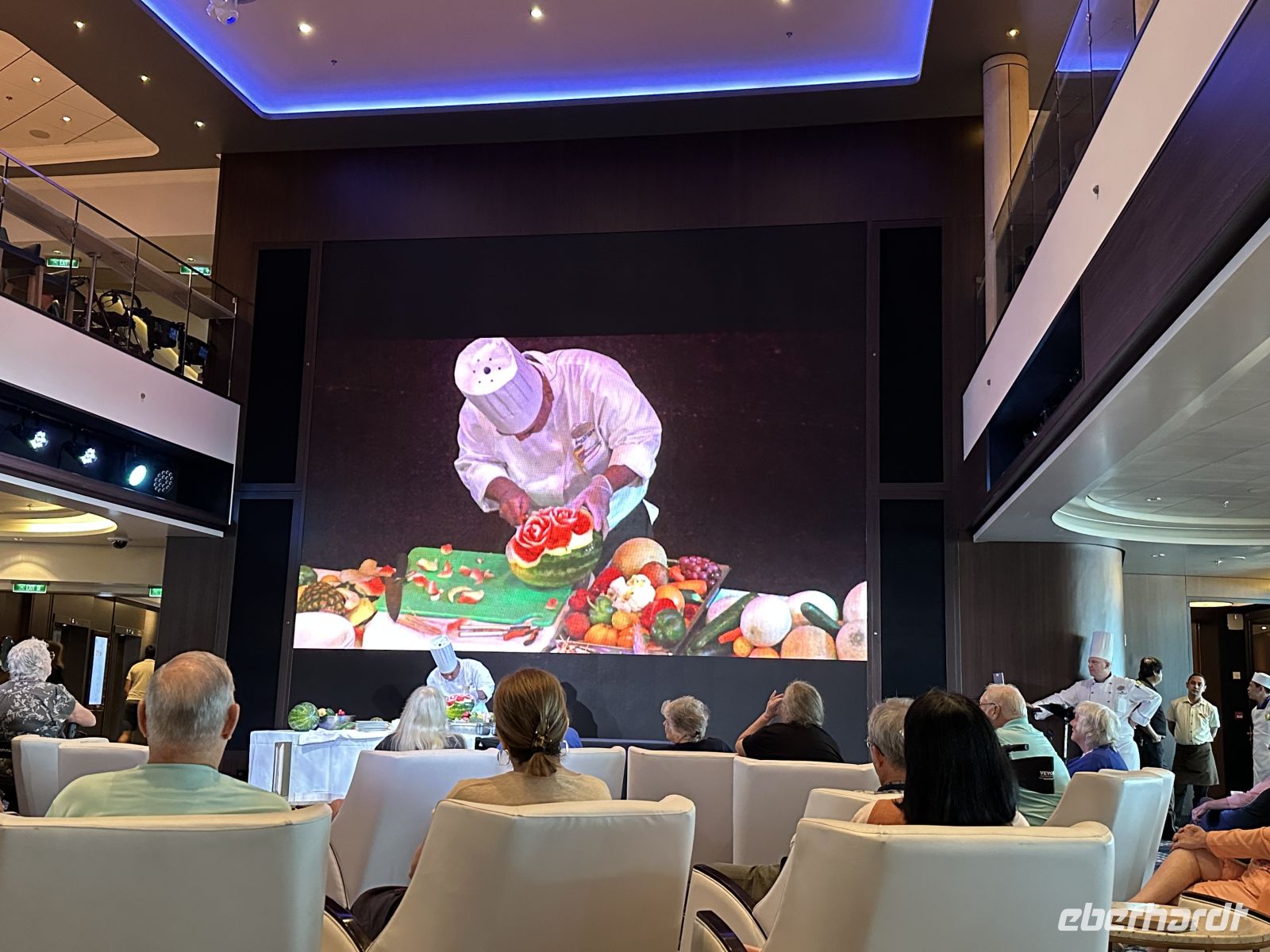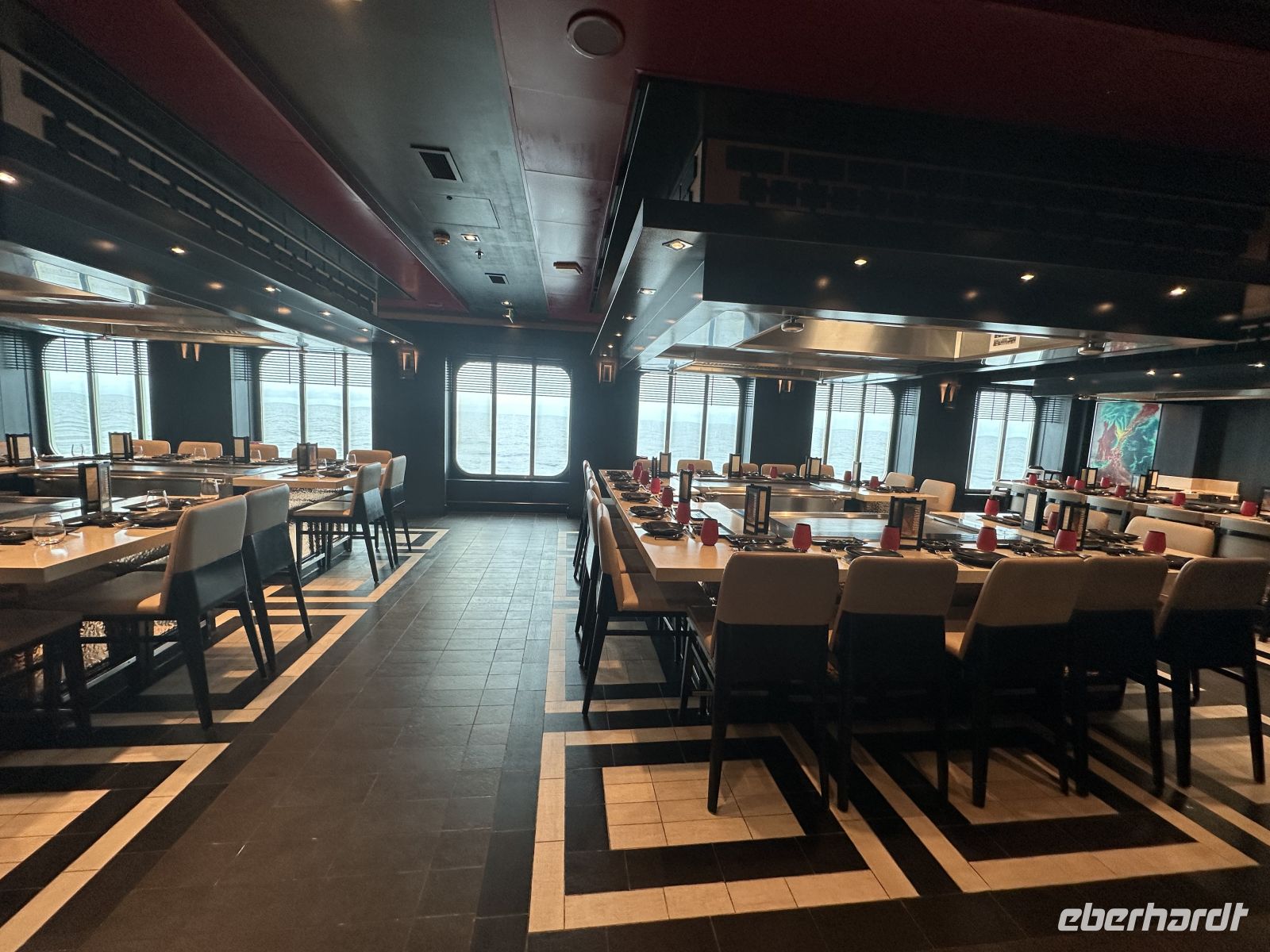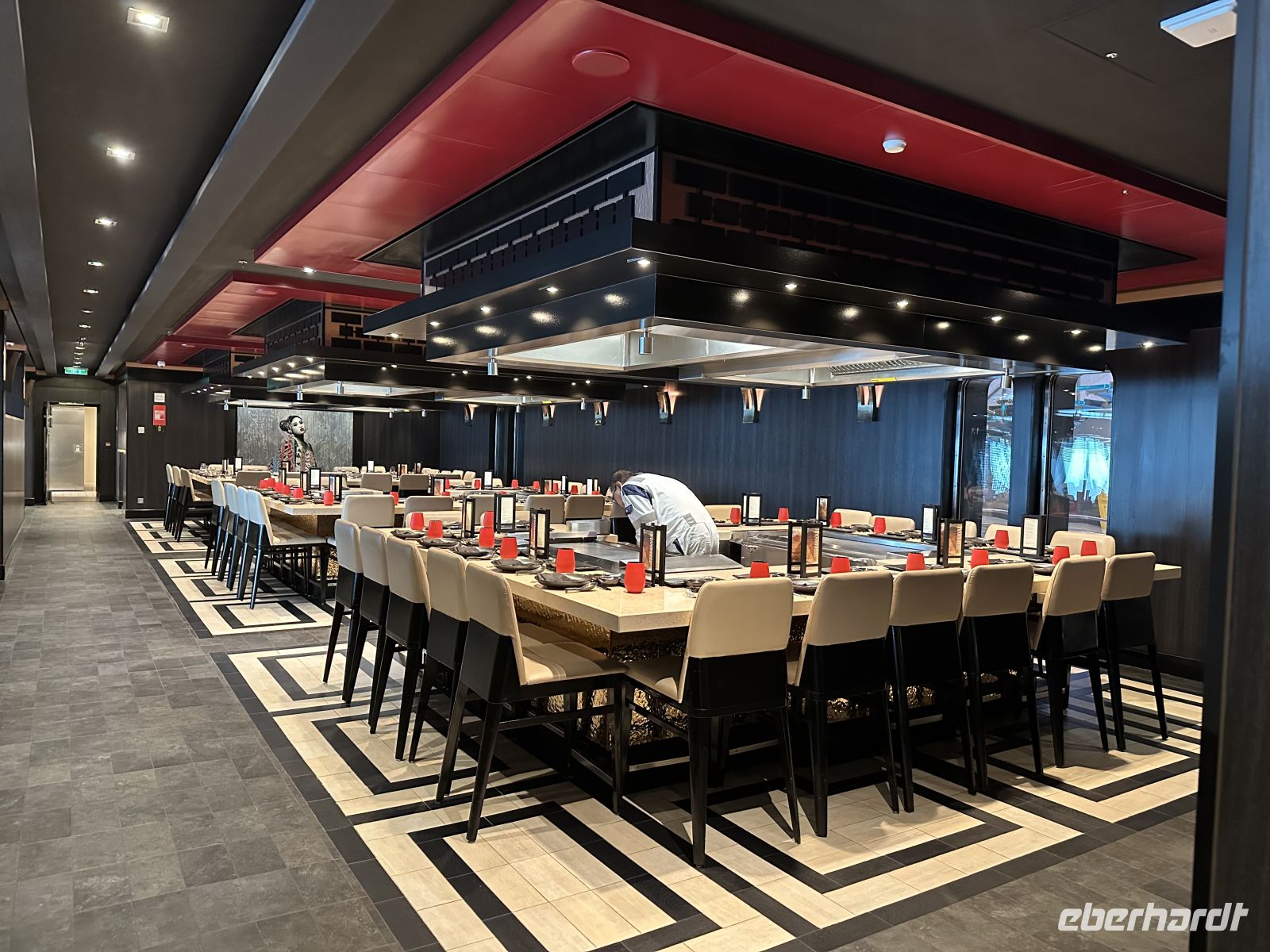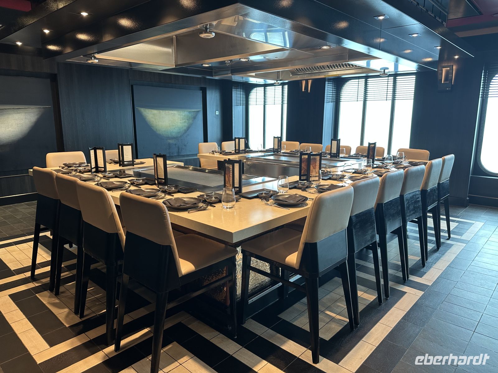 Ein Besuch im Teppanyaki-Restaurant ist eine unterhaltsame und lebendige Show. Es ist eines der beliebtesten Spezialitätenrestaurants an Bord, da es eine einzigartige, interaktive Atmosphäre bietet. Das Herzstück von Teppanyaki ist die gemeinschaftliche Teppan-Platte, um die alle Gäste in U-Form sitzen. Die Köche sind wahre Entertainer. Sie jonglieren mit Messern und Gewürzen, werfen mit Eiern und lassen Küken erscheinen. Die Stimmung ist sehr gesellig. Der Duft von Knoblauch-Butter, Sojasauce und brutzelndem Fleisch füllt die Luft, begleitet vom lauten Zischen des Grills und dem rhythmischen Schlagen der Spatel, die einen Höllenlärm erzeugen. Das Menü umfasst traditionelle japanische Gerichte, die direkt vor unseren Augen zubereitet werden.
