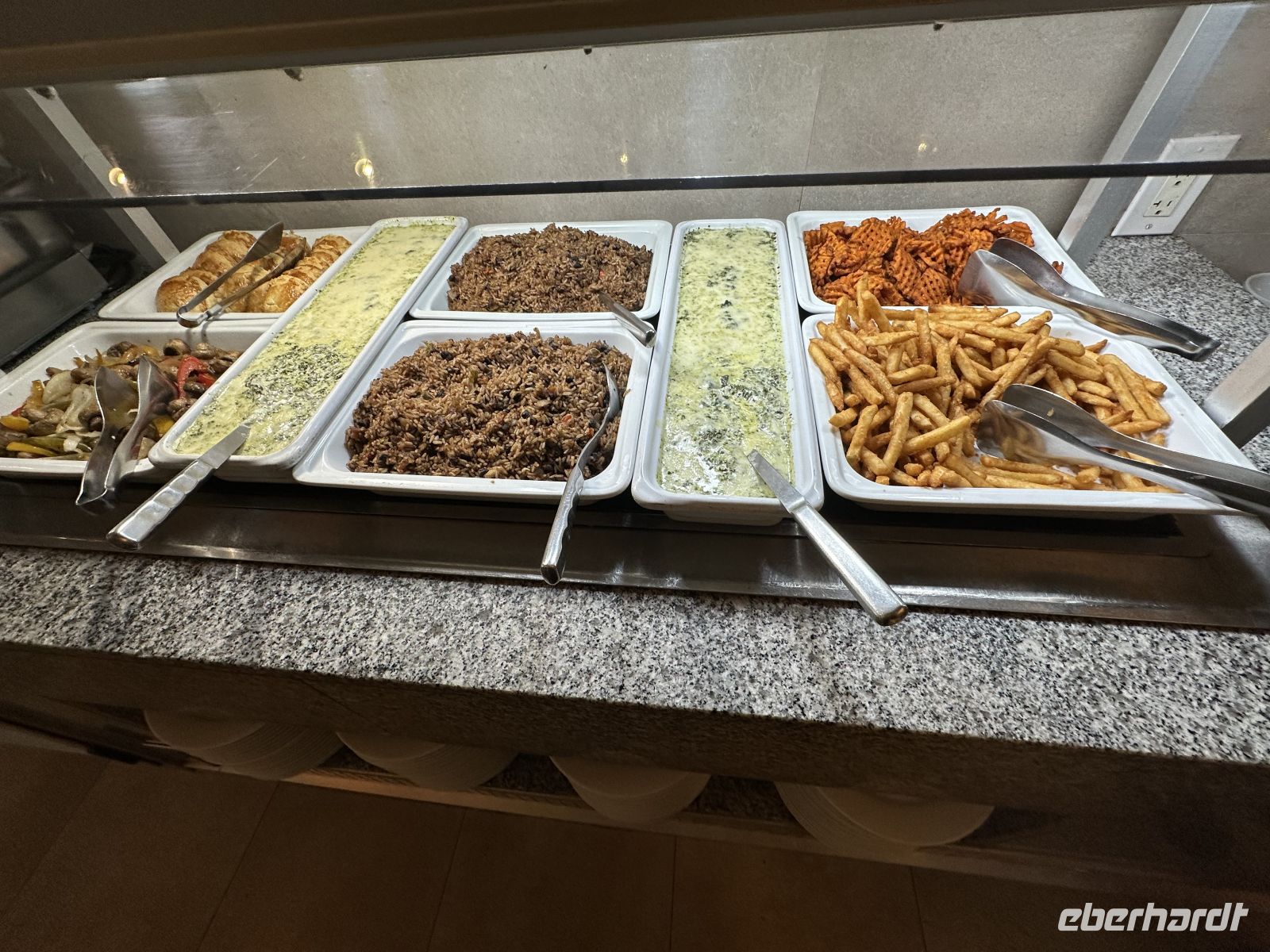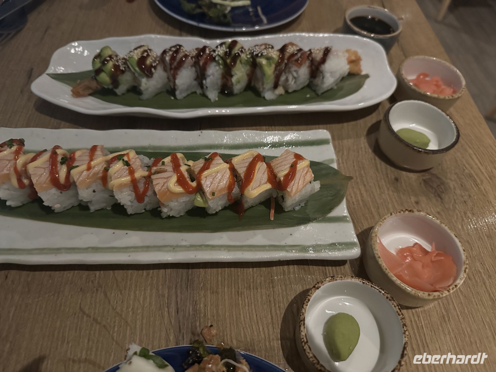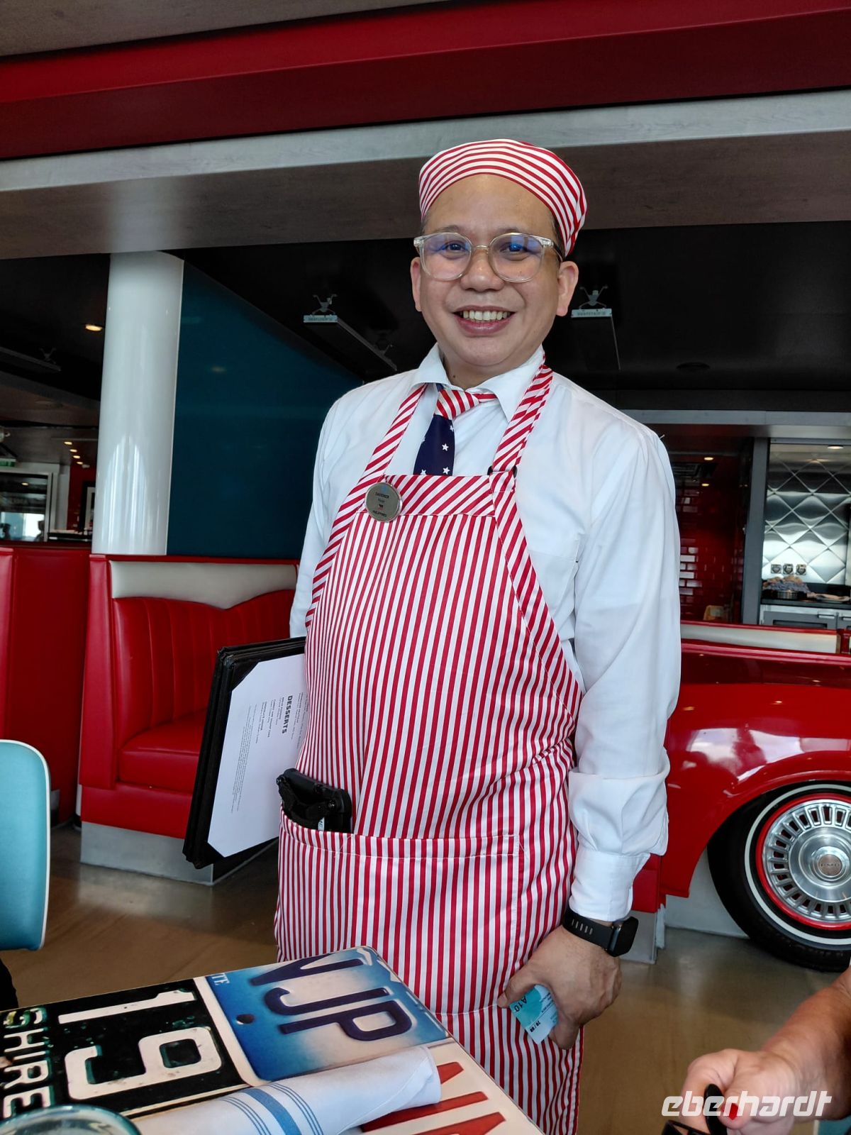 Außer den drei Hauptrestaurants und dem Gardenrestaurant gibt es an Bord einige Spezialitätenrestaurants. In der Foodrepublik werden kulinarische Genüsse aus verschiedenen Teilen der Welt angeboten. Hier können wir 4 aus 5 Rubriken wählen. Sharing is caring, Hand helts, Sushi Bar, Noodles - Rice - Soups und Sugar Pump. Hinter letzterem verbirgt sich das außergewöhnliche Dessert. Unter Sharing is caring sind Vorspeisen zu verstehen, wie zum Beispiel gegrillte Peperoni, scharfes koreanisches gebratenes Hähnchen oder Miso Chicken. Alle Portionen sind so angerichtet, dass man sie zu zweit gut teilen kann. Hand helts ist sogenanntes Fingerfood wie Tacos oder Wraps. Außer diesen Angeboten zum Essen gibt es nichtalkoholische Getränke, Kaffee, Bier und Sake, Cocktails und Wein. Für dieses Restaurant werden 50$ zusätzlich berechnet plus Trinkgeld. Es sei denn, man hat den Besuch der Spezialitätenrestaurants inklusive so wie wir. Je nach Kabinenkategorie zwei bis drei Mal.