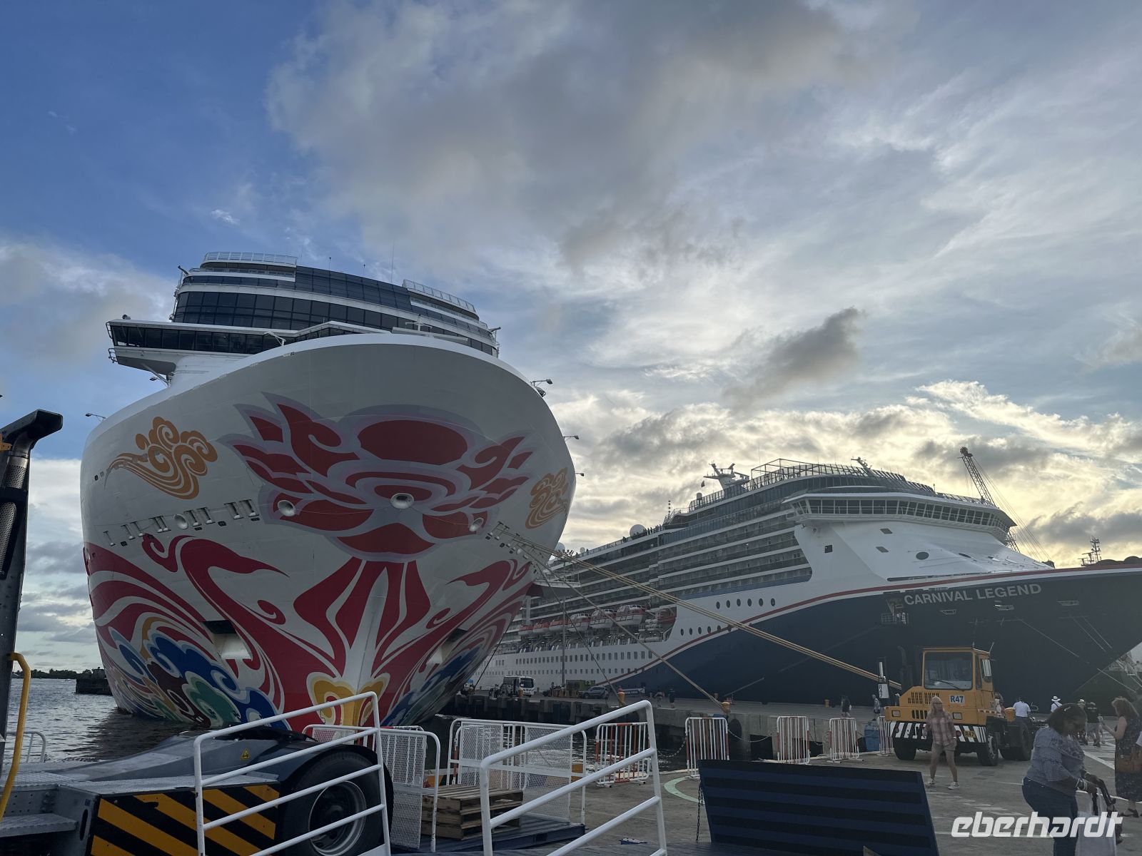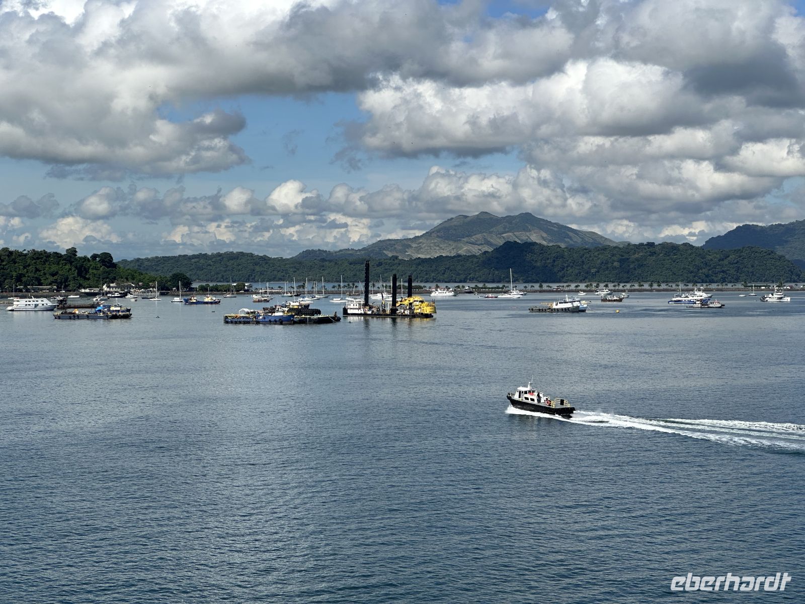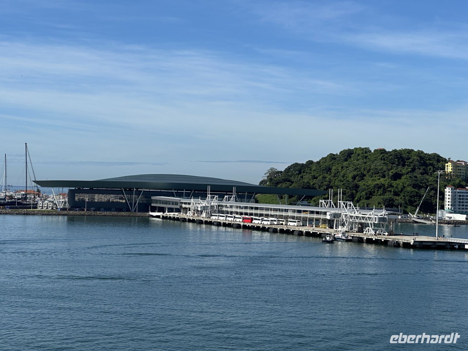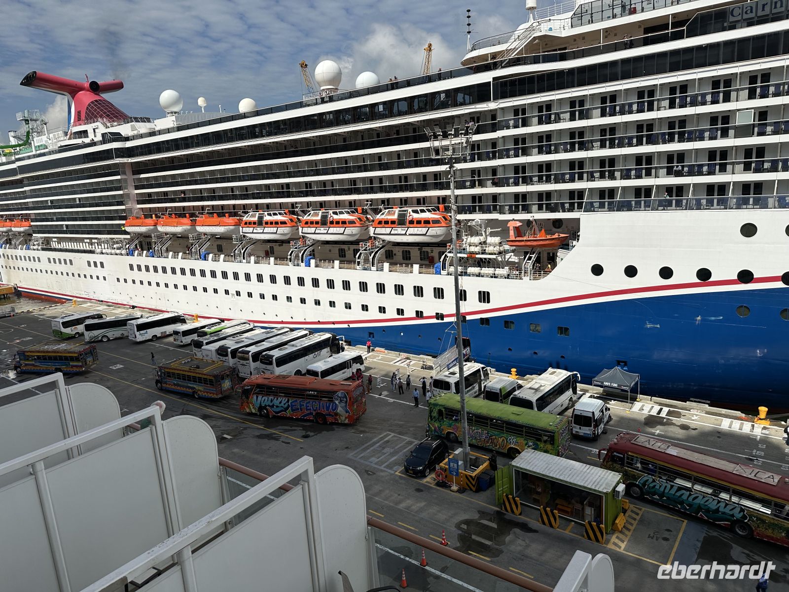 Die Koffer werden von fleißigen Händen aus dem Bus geladen und landen später tatsächlich in unseren Kabinen. Wir begeben uns zum Terminal, zeigen Bordkarte, Pass und Kreditkarte vor und bekommen im Gegenzug unsere Kabinenkarten.