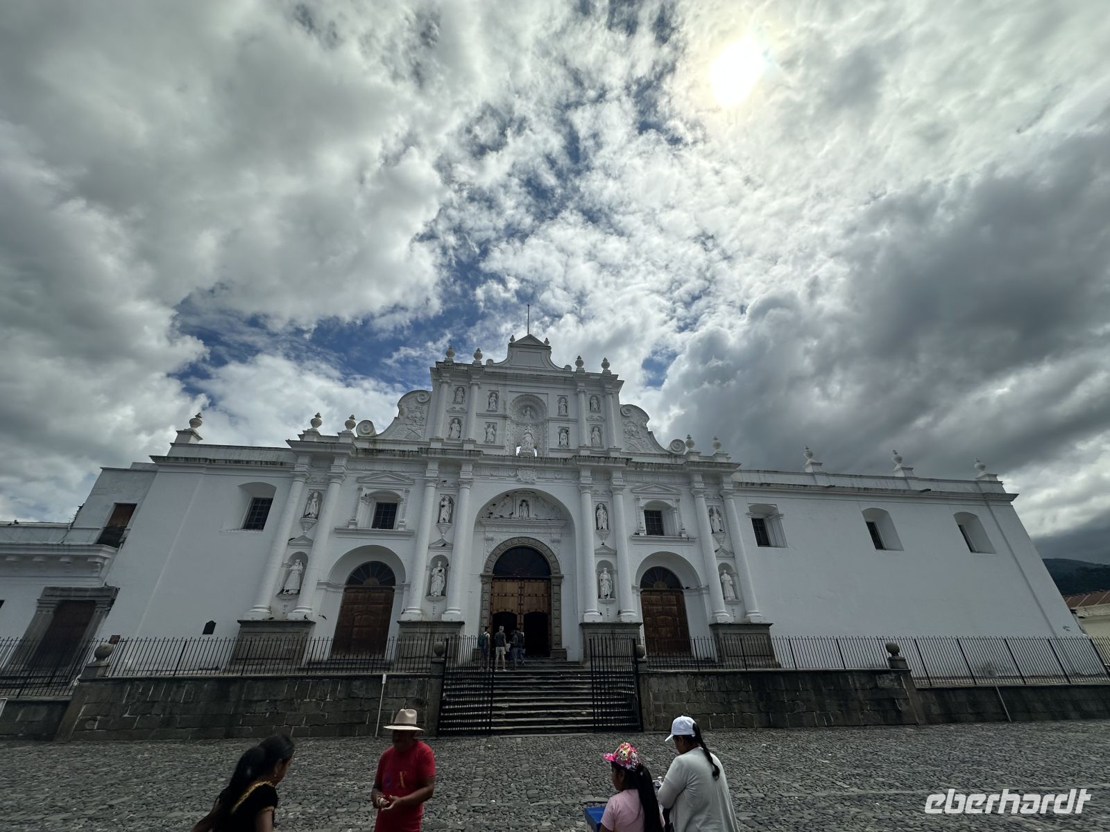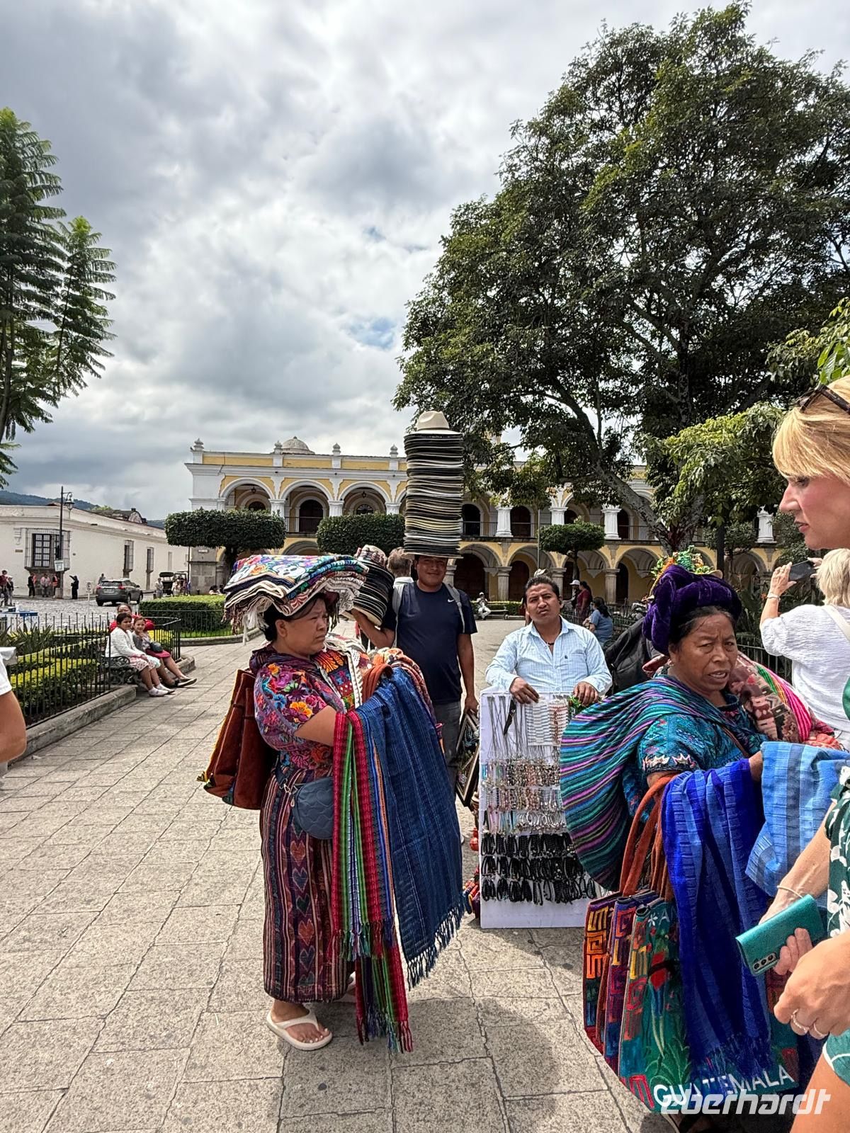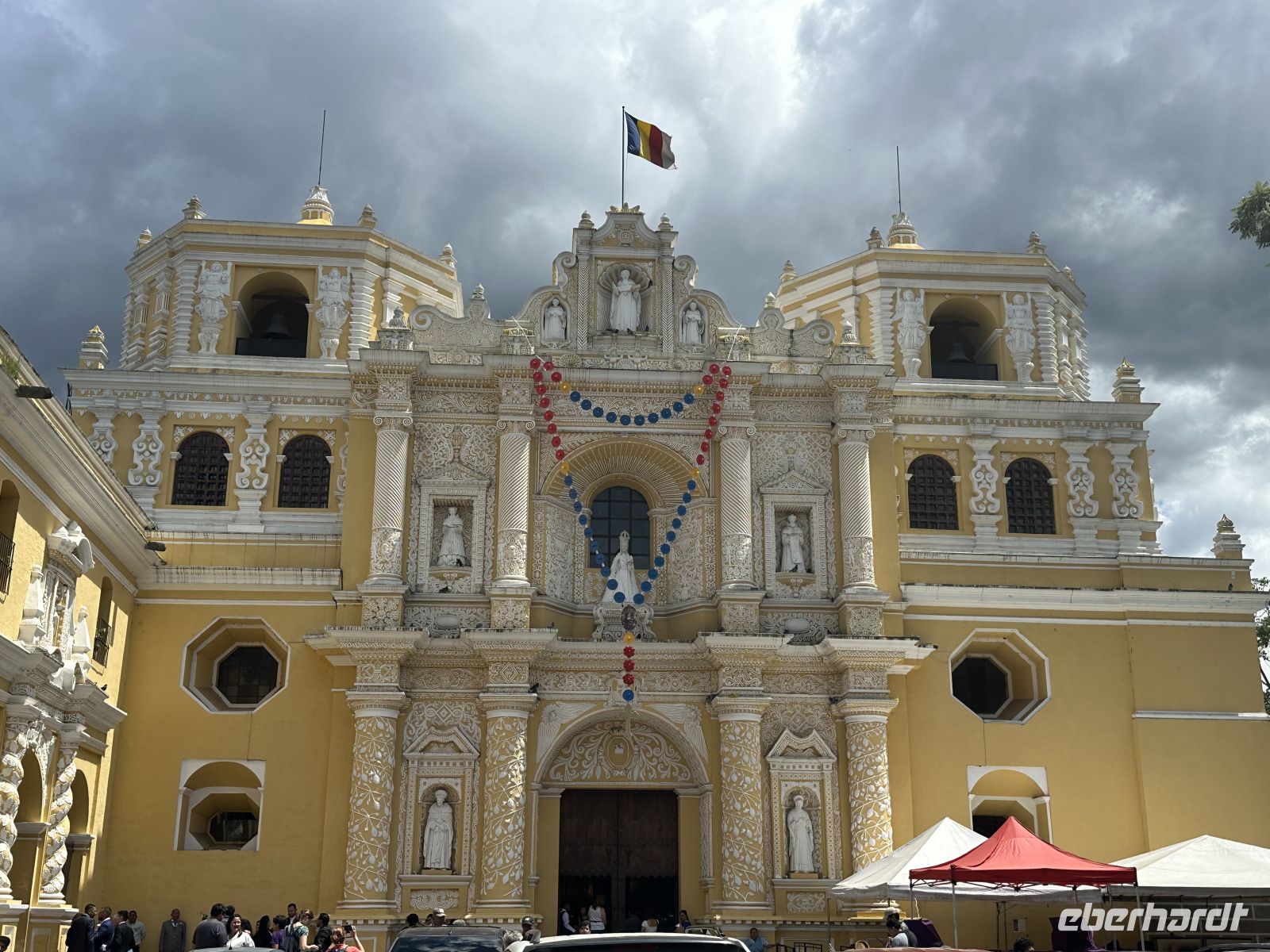 bekannt. Über mehr als 200 Jahre war Antigua das wichtigste religiöse, kulturelle und wirtschaftliche Zentrum der Region. Sie war die drittgrößte spanische Kolonialstadt in Lateinamerika und soll zeitweise über 50 Kirchen, Kapellen, Klöster, eine Universität und Krankenhäuser besessen haben. Die Stadt wurde nach einem strengen, am italienischen Renaissance-Ideal orientierten, Gitternetzmuster angelegt. Ihre Architektur ist ein herausragendes Beispiel für den Barroco Antigüeño (Barock von Antigua), einer regionalen Variante des Barockstils, die an die häufigen Erdbeben angepasst wurde. Typisch sind oft einstöckige Gebäude, dicke Mauern und reiche Stuckverzierungen. Antigua liegt in einem Tal, umgeben von den Vulkanen Agua, Acatenango und dem aktiven Fuego. Zahlreiche Erdbeben prägten ihre Geschichte. Das verheerendste war das Santa-Marta-Erdbebenim Jahr 1773, das die Stadt größtenteils zerstörte. Nach dem Erdbeben von 1773 beschloss die spanische Krone die Verlegung der Hauptstadt in ein sichereres Gebiet, das heutige Guatemala-Stadt. Antigua wurde verlassen und verlor ihren politischen Status. Obwohl die Stadt aufgegeben wurde, blieben viele der beschädigten Gebäude als eindrucksvolle Ruinen erhalten. Aufgrund ihres einzigartigen Charmes und des gut erhaltenen kolonialen Stadtbildes wurde Antigua Guatemala 1979 von der UNESCO zum Weltkulturerbe erklärt. Zu den bekanntesten Bauwerken zählen der Santa Catalina-Bogen (Arco de Santa Catalina), der einst zwei Teile eines Klosters verband, die Ruinen der Kathedrale San José, das Kloster La Merced mit seiner prächtigen Fassade und die Ruinen des Convento de Las Capuchinas. Unser Stadtrundgang endet nach dem Besuch des Jademuseums in einem Restaurant, wo wir das Mittagessen einnehmen. Serviert wird ein schmackhafter Schwazbohnenmus mit Hühnchen , Reis, Kochbananen und Tortillas begleitet von einer einheimischen Musikband. Anschließend fahren wir zurück zum Schiff. Ein Tropenregen hat eingesetzt, der aber als wir ankommen wieder aufgehört hat. So können wir noch über den Markt schlendern und Einkäufe tätigen.