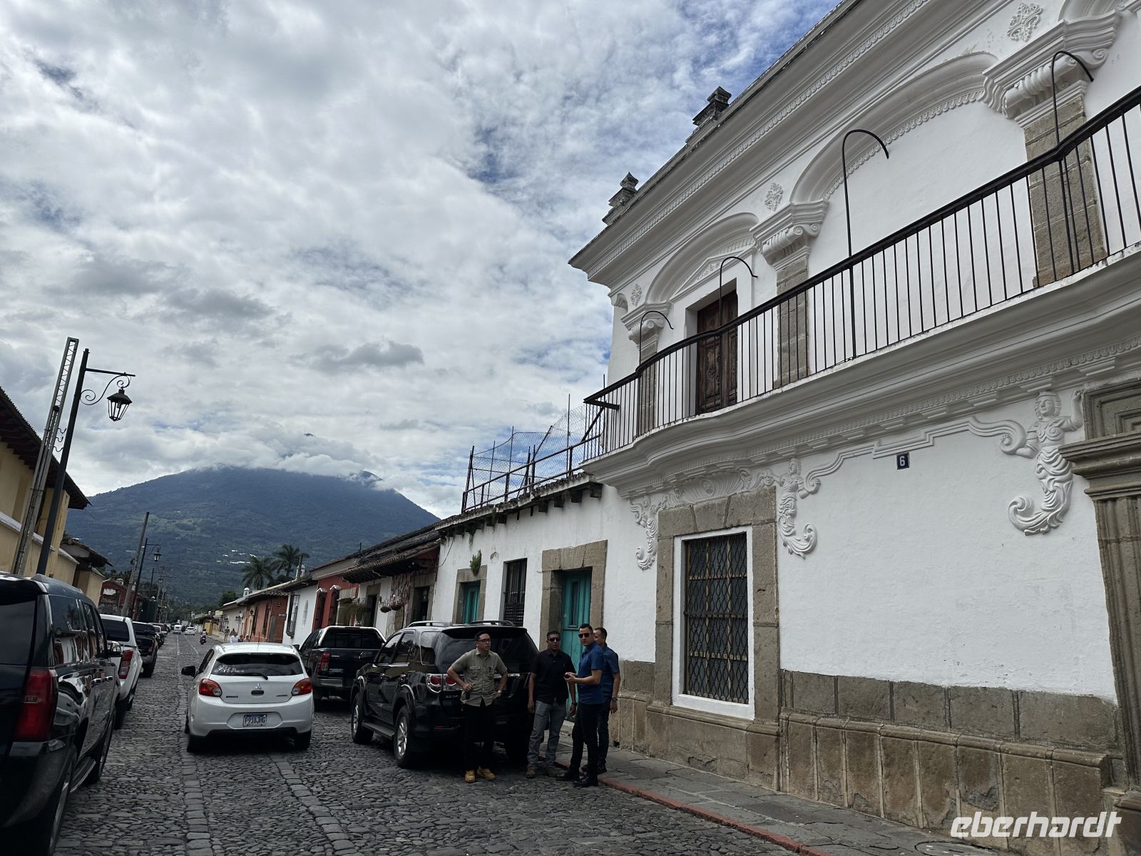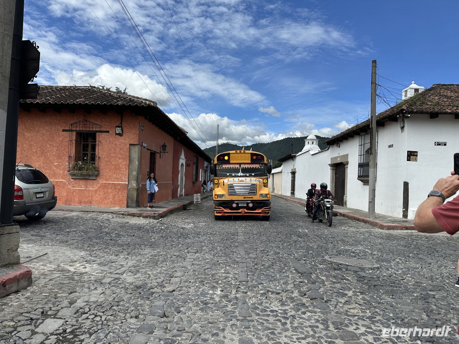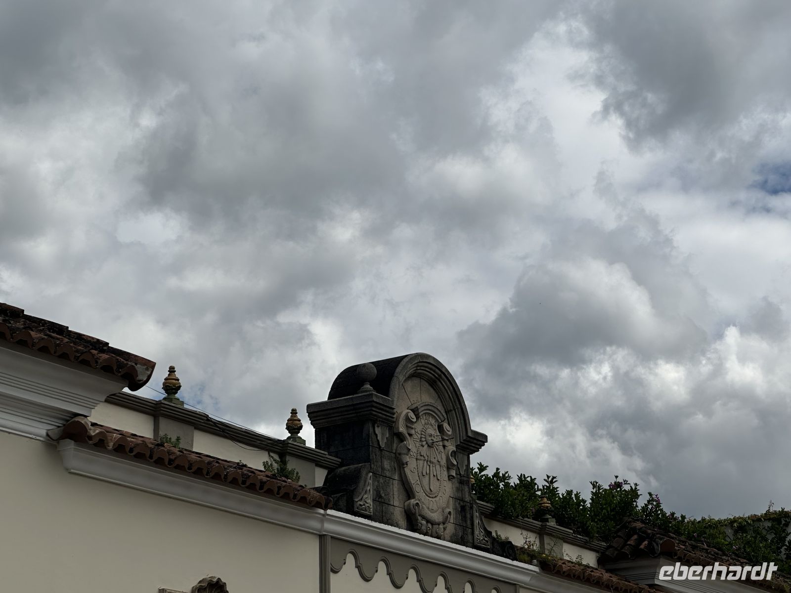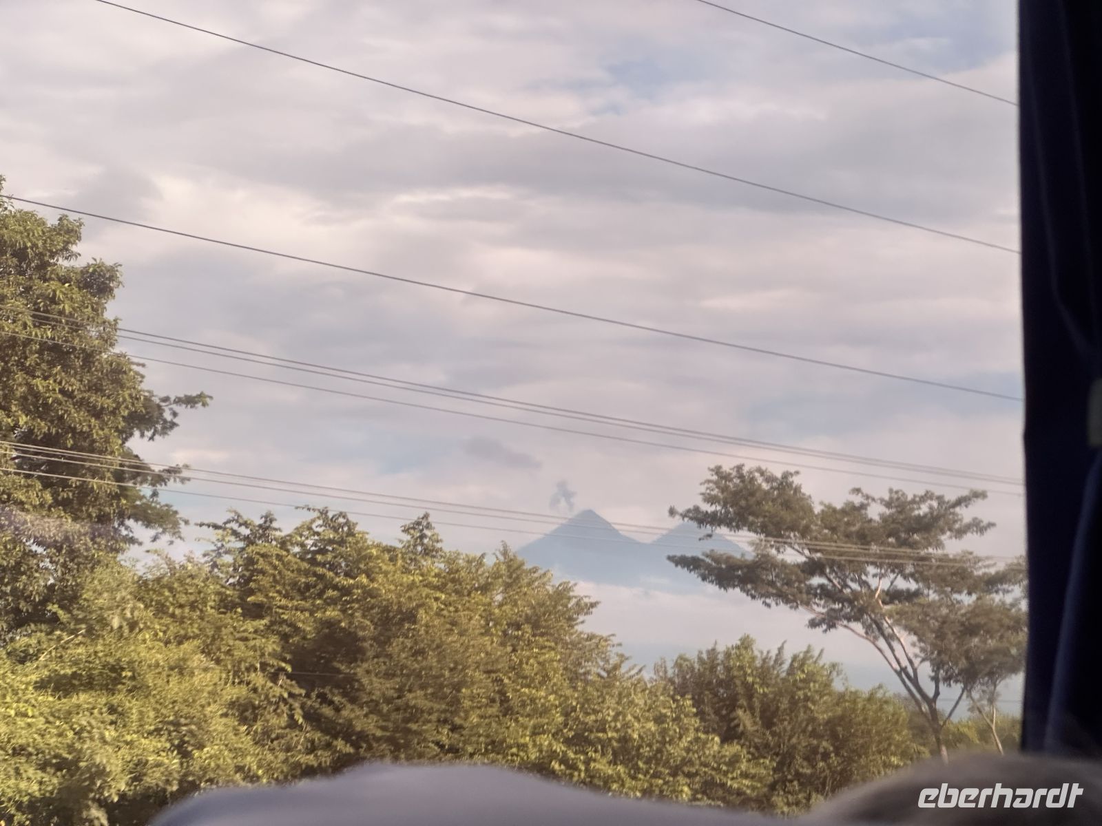 Bereits um 7.15 Uhr treffen sich die Ausflügler im Theater. Von hier aus werden wir Gruppenweise aufgerufen und zu den Bussen geschickt. Wir haben den Deutschsprachigen Ausflug Koloniales Antigua gebucht. Unser Bus hat die Nummer 18. Die örtliche Reiseleiterin heißt Laura, spricht sehr gut Deutsch und begleitet uns durch den Tag. Zwei Stunden dauert die Fahrt bis nach Antigua. In der Ferne sind auf beiden Seiten Vulkane zu sehen. Einer ist aktiv und spuckt regelmäßig dunkle Rauchwolken aus. In Antigua wechseln sich geführter Rundgang mit Freizeit angenehm ab. So bekommen wir viele Informationen, haben aber auch Zeit zum Souvenire kaufen oder individuell zu bummeln. Antigua Guatemala ist ein Ort von großer historischer und kultureller Bedeutung und war von 1543 bis 1773 die Hauptstadt des spanischen Generalkapitanats Guatemala, das einen Großteil Zentralamerikas umfasste. Die Stadt wurde 1543 gegründet, nachdem zwei frühere Hauptstädte aufgrund von indigenen Aufständen und Naturkatastrophen aufgegeben werden mussten. Sie erhielt den Namen Santiago de los Caballeros de Guatemala. Heute ist sie als Antigua Guatemala