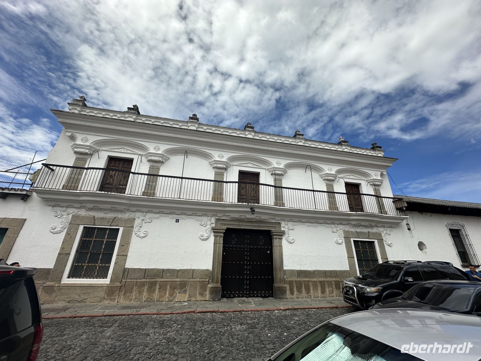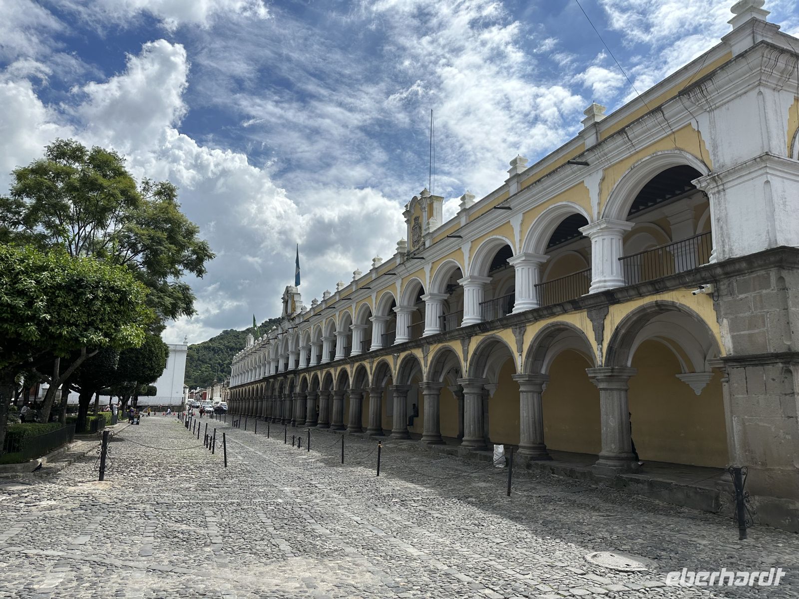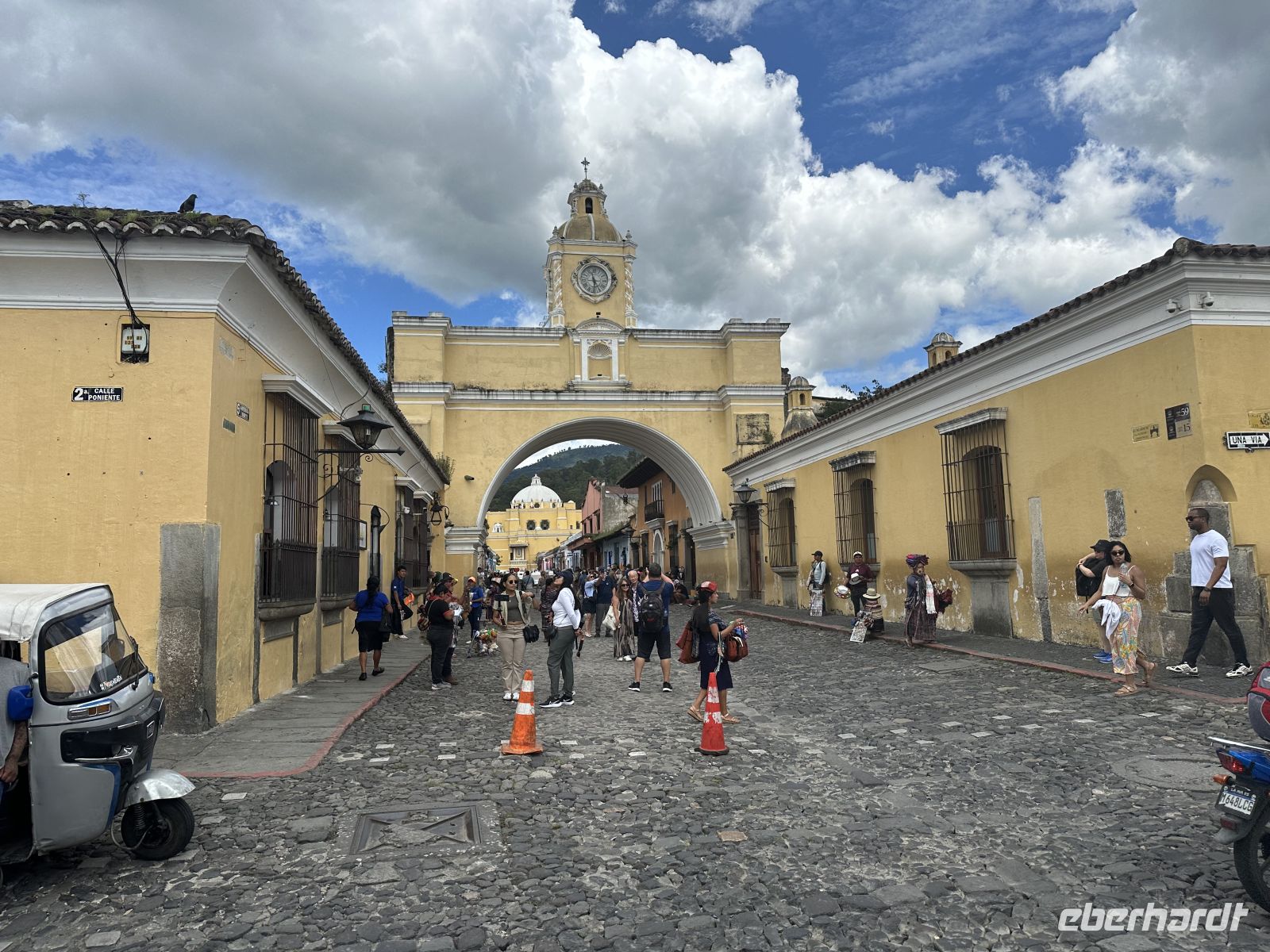 Bereits um 7.15 Uhr treffen sich die Ausflügler im Theater. Von hier aus werden wir Gruppenweise aufgerufen und zu den Bussen geschickt. Wir haben den Deutschsprachigen Ausflug Koloniales Antigua gebucht. Unser Bus hat die Nummer 18. Die örtliche Reiseleiterin heißt Laura, spricht sehr gut Deutsch und begleitet uns durch den Tag. Zwei Stunden dauert die Fahrt bis nach Antigua. In der Ferne sind auf beiden Seiten Vulkane zu sehen. Einer ist aktiv und spuckt regelmäßig dunkle Rauchwolken aus. In Antigua wechseln sich geführter Rundgang mit Freizeit angenehm ab. So bekommen wir viele Informationen, haben aber auch Zeit zum Souvenire kaufen oder individuell zu bummeln. Antigua Guatemala ist ein Ort von großer historischer und kultureller Bedeutung und war von 1543 bis 1773 die Hauptstadt des spanischen Generalkapitanats Guatemala, das einen Großteil Zentralamerikas umfasste. Die Stadt wurde 1543 gegründet, nachdem zwei frühere Hauptstädte aufgrund von indigenen Aufständen und Naturkatastrophen aufgegeben werden mussten. Sie erhielt den Namen Santiago de los Caballeros de Guatemala. Heute ist sie als Antigua Guatemala