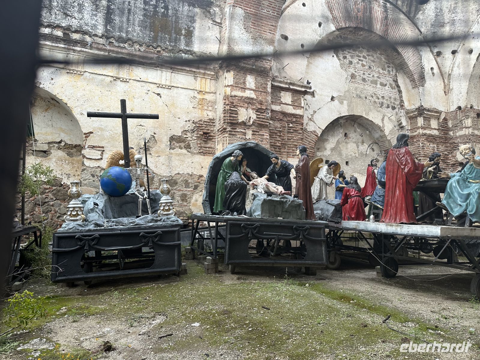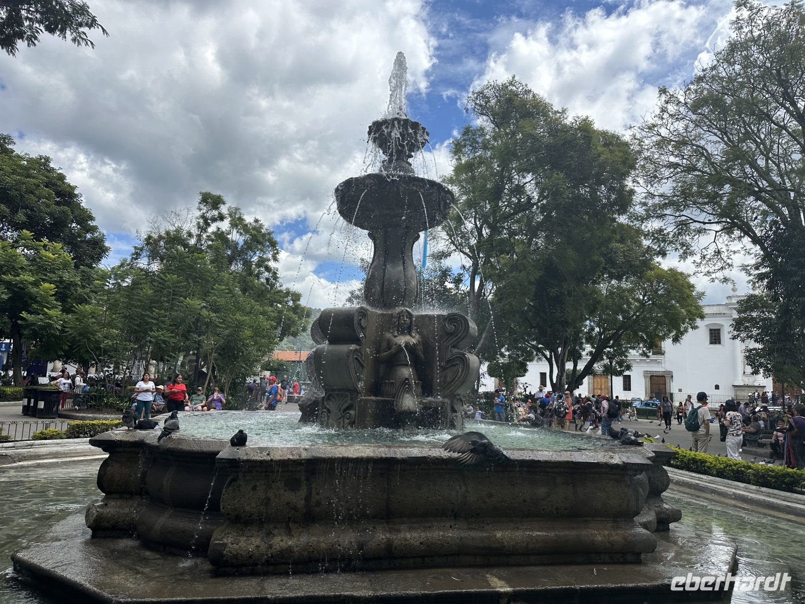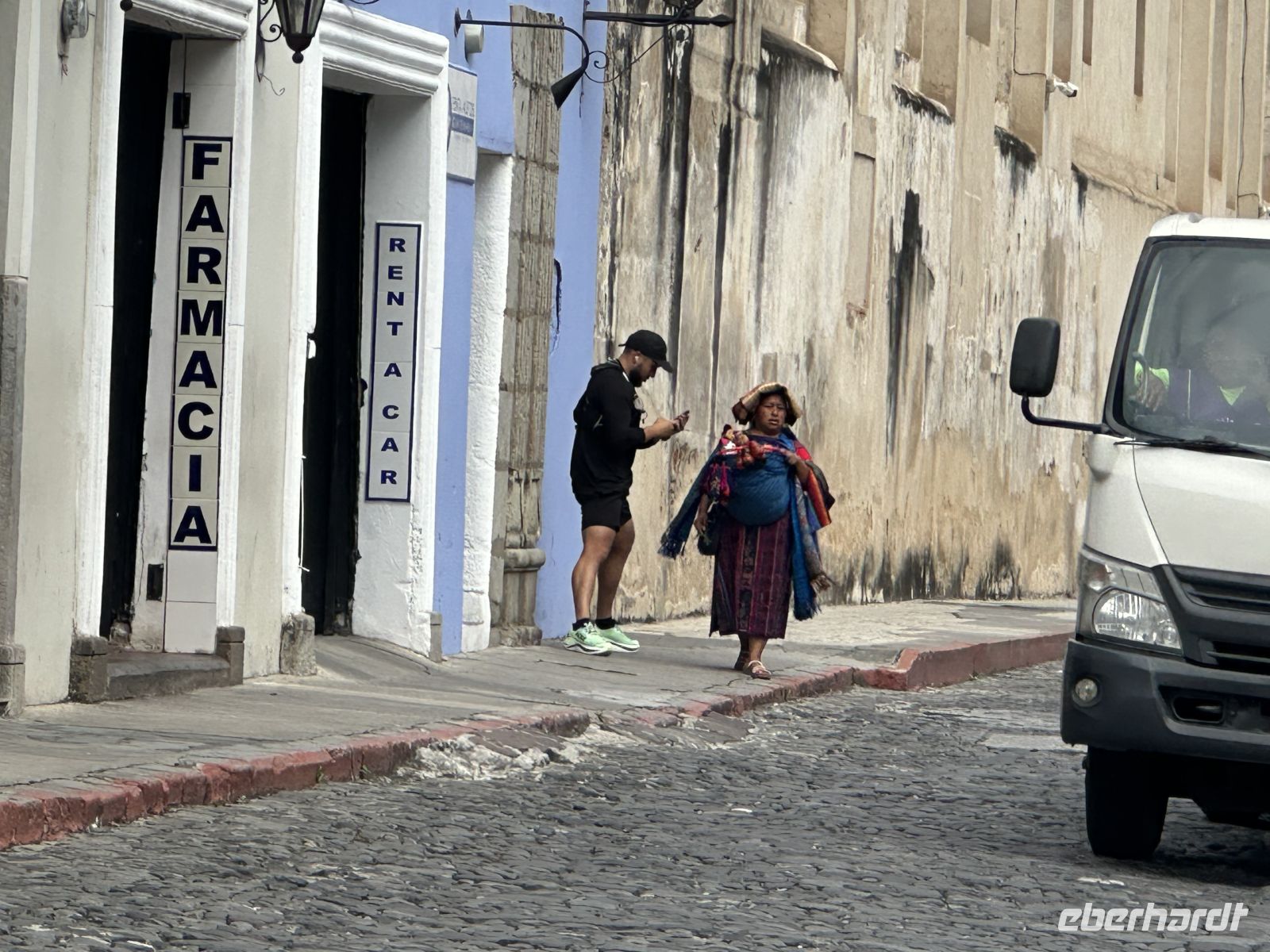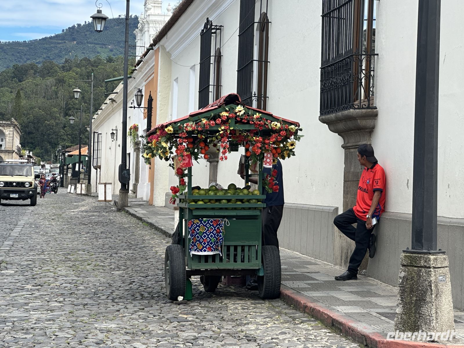 Bereits um 7.15 Uhr treffen sich die Ausflügler im Theater. Von hier aus werden wir Gruppenweise aufgerufen und zu den Bussen geschickt. Wir haben den Deutschsprachigen Ausflug Koloniales Antigua gebucht. Unser Bus hat die Nummer 18. Die örtliche Reiseleiterin heißt Laura, spricht sehr gut Deutsch und begleitet uns durch den Tag. Zwei Stunden dauert die Fahrt bis nach Antigua. In der Ferne sind auf beiden Seiten Vulkane zu sehen. Einer ist aktiv und spuckt regelmäßig dunkle Rauchwolken aus. In Antigua wechseln sich geführter Rundgang mit Freizeit angenehm ab. So bekommen wir viele Informationen, haben aber auch Zeit zum Souvenire kaufen oder individuell zu bummeln. Antigua Guatemala ist ein Ort von großer historischer und kultureller Bedeutung und war von 1543 bis 1773 die Hauptstadt des spanischen Generalkapitanats Guatemala, das einen Großteil Zentralamerikas umfasste. Die Stadt wurde 1543 gegründet, nachdem zwei frühere Hauptstädte aufgrund von indigenen Aufständen und Naturkatastrophen aufgegeben werden mussten. Sie erhielt den Namen Santiago de los Caballeros de Guatemala. Heute ist sie als Antigua Guatemala