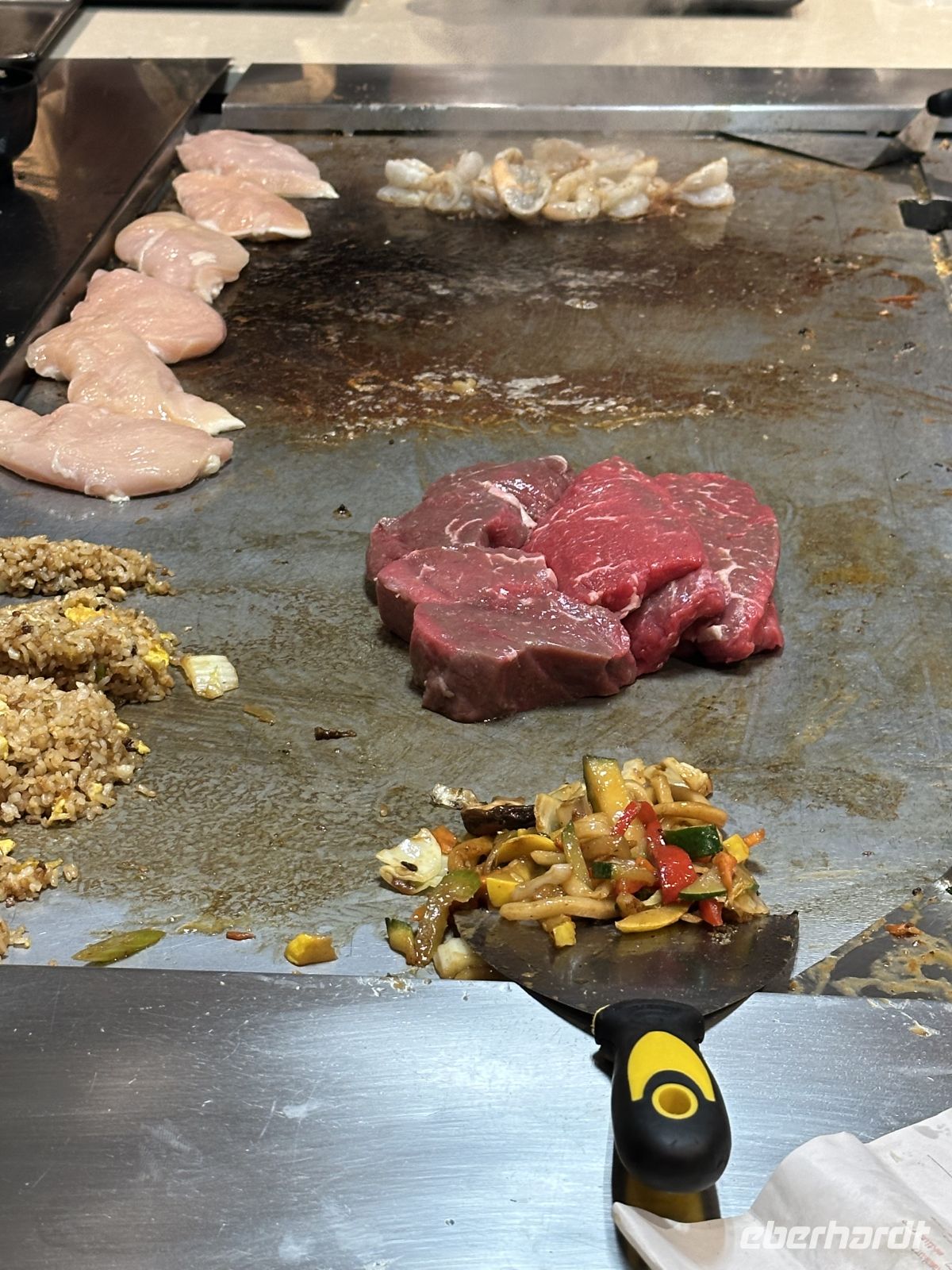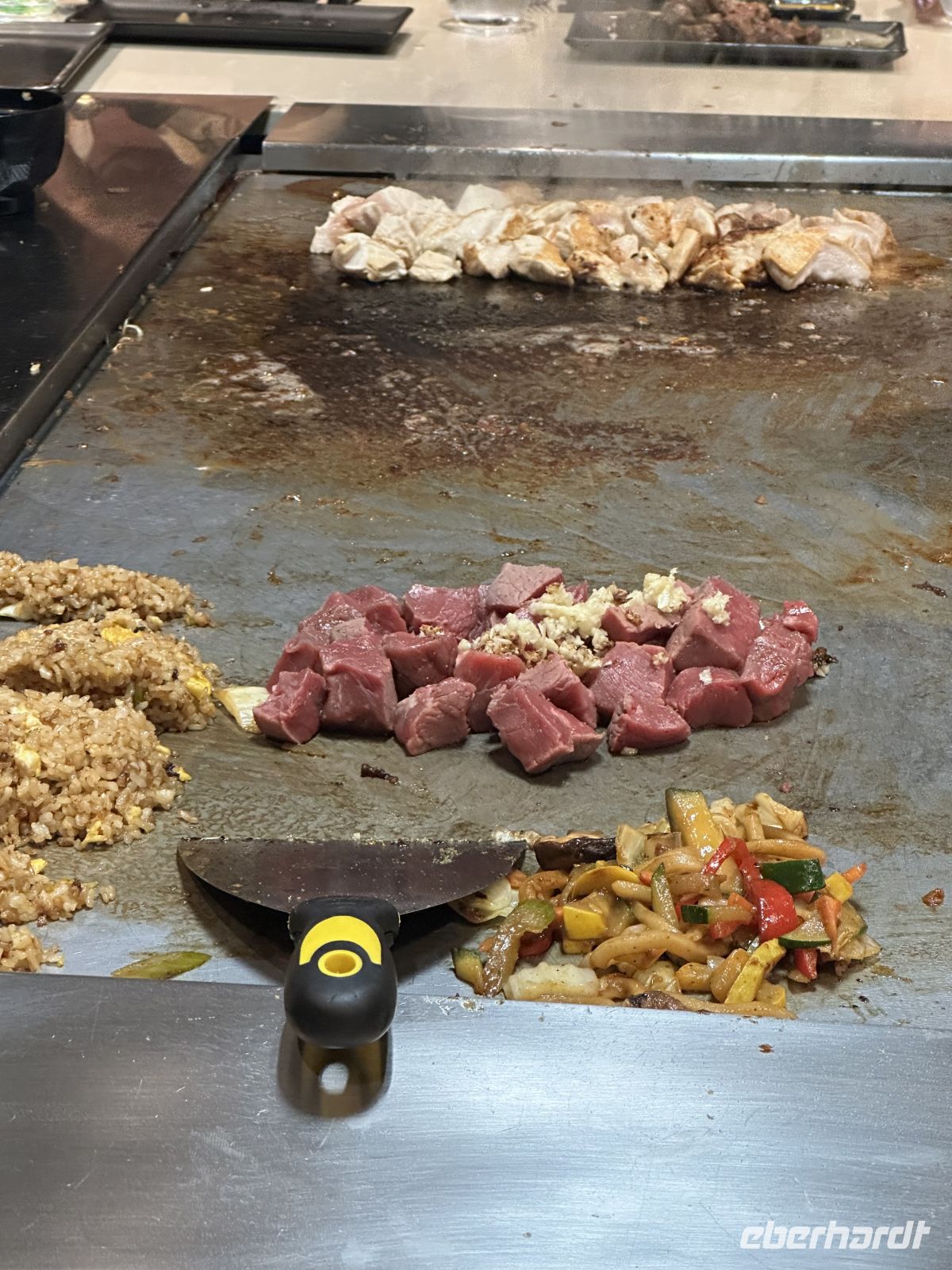 Sehr beliebt ist auch das Tepanyaki, ein japanisches Restaurant, in dem das Essen mit viel Lärm und Humor direkt vor unseren Augen zubereitet wird.