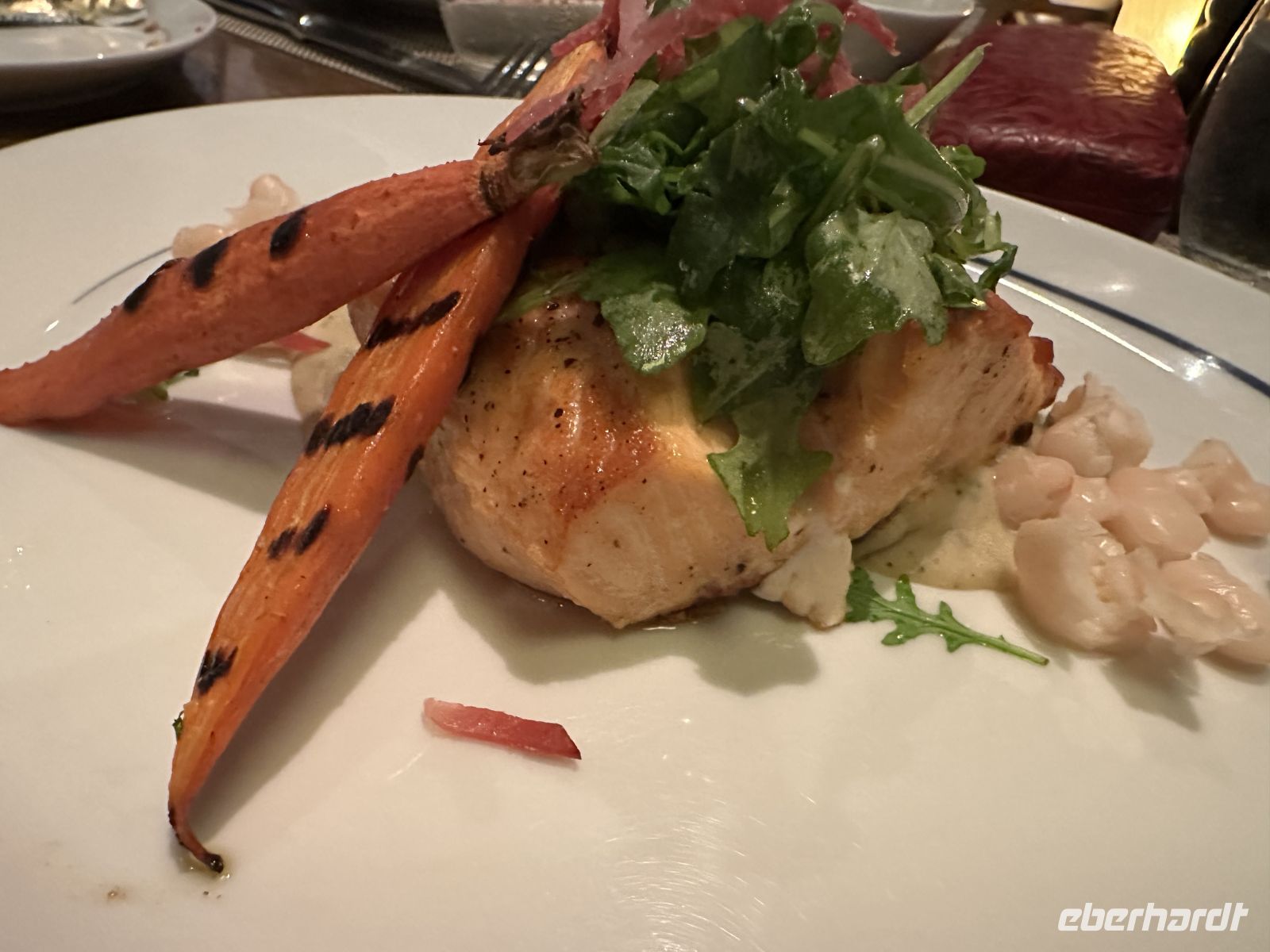 Das La Cucina befindet sich auf Deck 8 im vorderen Bereich des Schiffes und bietet eine warme und einladende Atmosphäre. Die Einrichtung ist elegant und rustikal gehalten, mit Holzelementen und italienischen Akzenten, die an eine traditionelle Trattoria erinnern. Es ist ein idealer Ort für ein entspanntes Abendessen zu zweit oder in kleiner Gesellschaft. Es gibt auch Sitzplätze im Freien, was ein romantisches Essen mit Meerblick ermöglicht. Die Speisekarte von La Cucina umfasst eine breite Palette an italienischen Klassikern, von Pasta und Risotto bis hin zu herzhaften Fleisch- und Fischgerichten. Der Abend beginnt mit einer Auswahl an Antipasti und Suppen. Eine beliebte Vorspeise ist die Mozzarella Caprese – äußerst lecker, gefolgt von der Möglichkeit, Pasta-Gerichte in Vorspeisen- oder Hauptgerichtgröße zu bestellen, um mehr probieren zu können. Es gibt zum Beispiel Beef Lasagne Al Forno, eine reichhaltige Lasagne mit Rindfleisch-Bolognese und einer cremigen Mozzarella-Sauce. Risotto Ai Funghi Di Bosco, ein cremiges Wildpilz-Risotto. Und selbstverständlich Spaghetti Carbonara: Eine herzhafte Version des italienischen Klassikers.