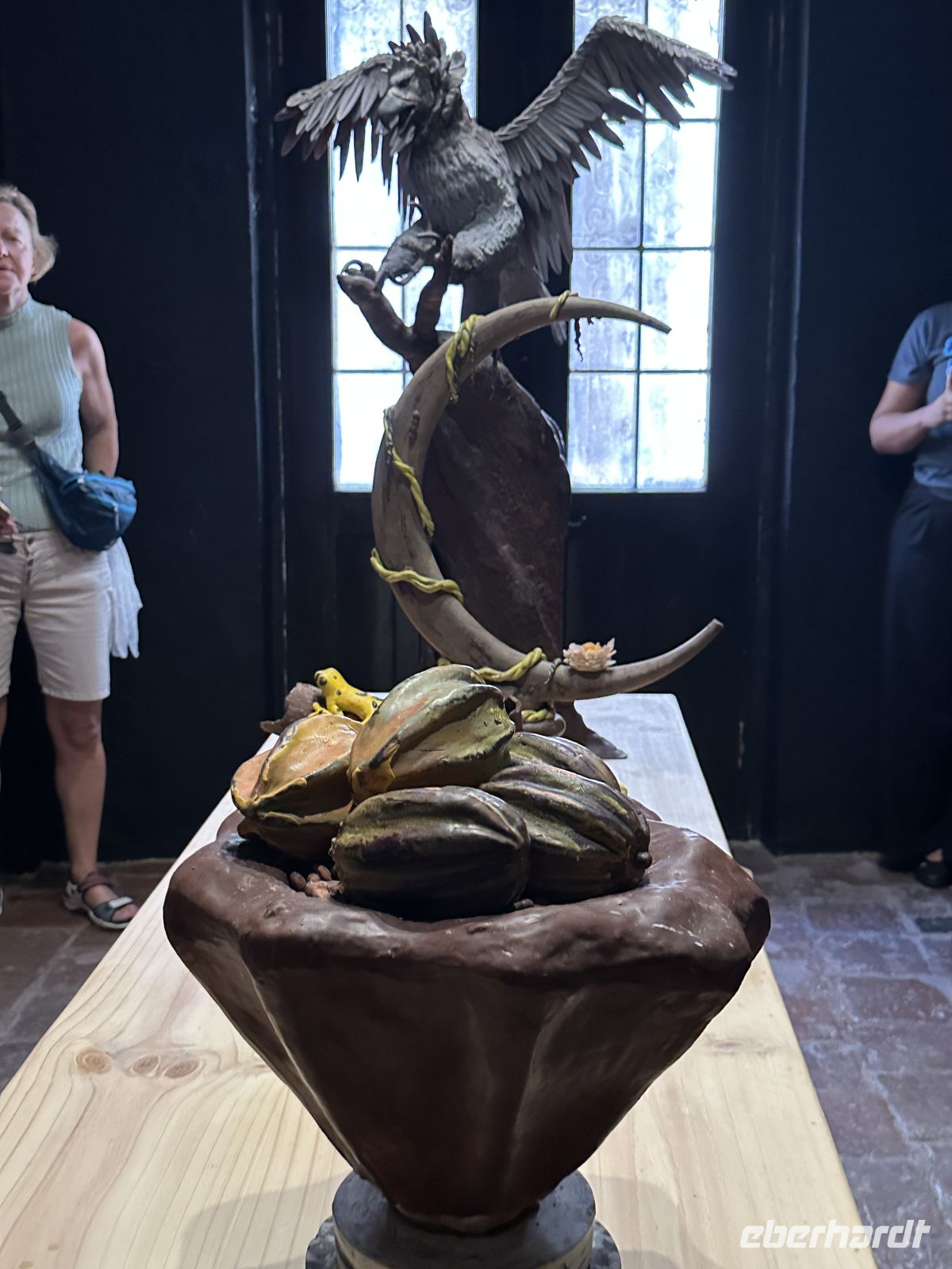 Wir setzen unseren Weg zu Fuß fort und besuchen ein Schokoladengeschäft. Hier sehen wir drei Kunstwerke, die aus Schokolade hergestellt wurden. Außerdem können wir verschiedene Schokolade kosten und kaufen. Wir spazieren durch die Stadt und schauen uns koloniale Gebäude an und freuen uns über neu erworbene Souvenire. Mittags kehren wir in ein lokales Restaurant ein. Als Vorspeise gibt es Römersalat mit Fetakäse, Erdbeeren und Blaubeeren. Zum Hauptgang wählen wir zwischen Reisbrühe mit Meeresfrüchten, Rindfleisch in Tamarindensauce und Hühnchen Rolle gefüllt mit Schinken und Käse. Alles schmeckt ausgezeichnet. Zum Nachtisch gibt es noch leckeren Casablanca Panna Cotta. Satt und zufrieden erreichen wir unser nächstes Ziel - die Rooftopbar Tantalo. Cocktail schlürfend genießen wir den Ausblick auf die Stadt.